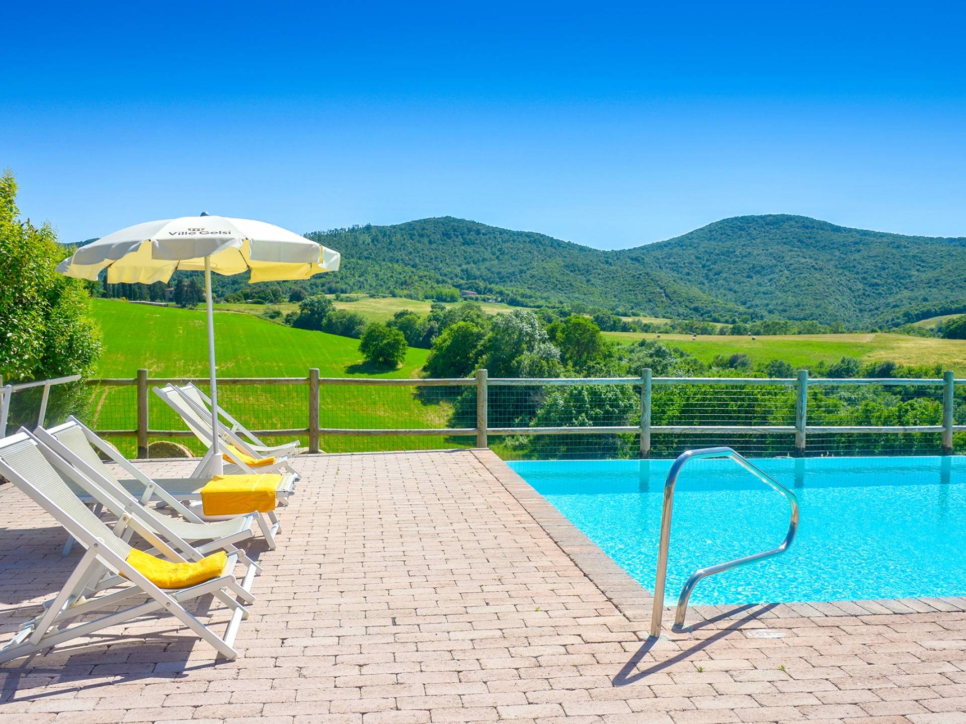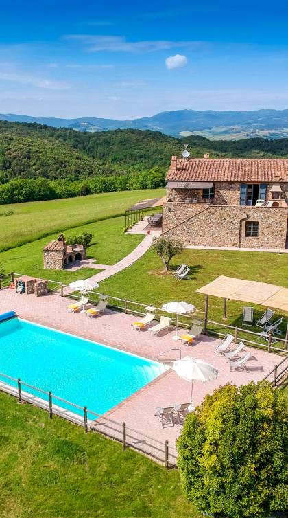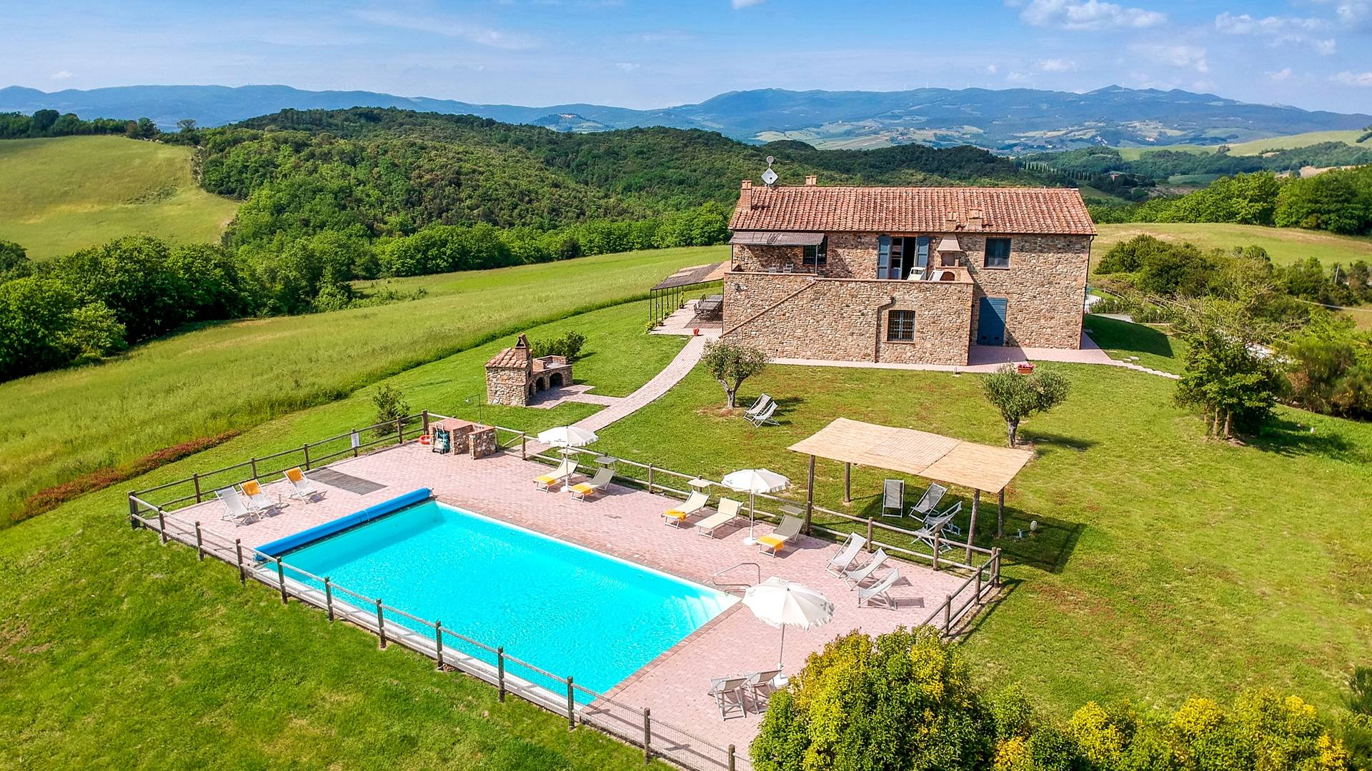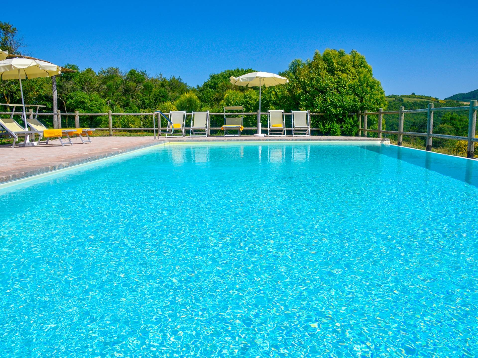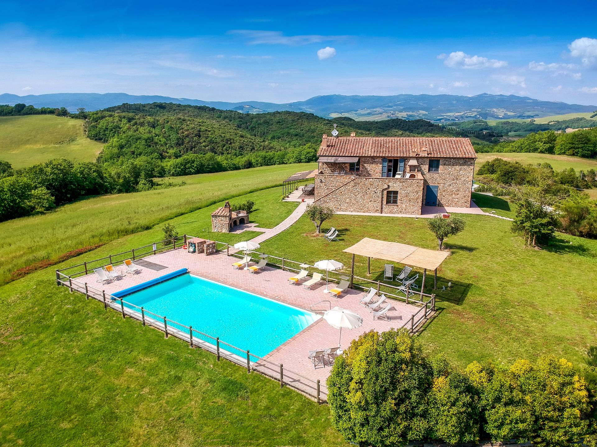 Частный бассейн с подогревом и захватывающим видом на окружающие холмы с зонтиками и шезлонгами. Есть панорамная терраса с мангалом. Доступен бесплатный Интернет. Бассейн 6х12 м, глубина 1,50 см. Солярий оборудован 8 лежаками и 8 лежаками. Он имеет панорамную террасу, выходящую на юг, и лестницу, ведущую прямо в сад. На террасе есть барбекю, шезлонги, зонтики, стол и стулья. Снаружи есть еще одно барбекю с духовкой.