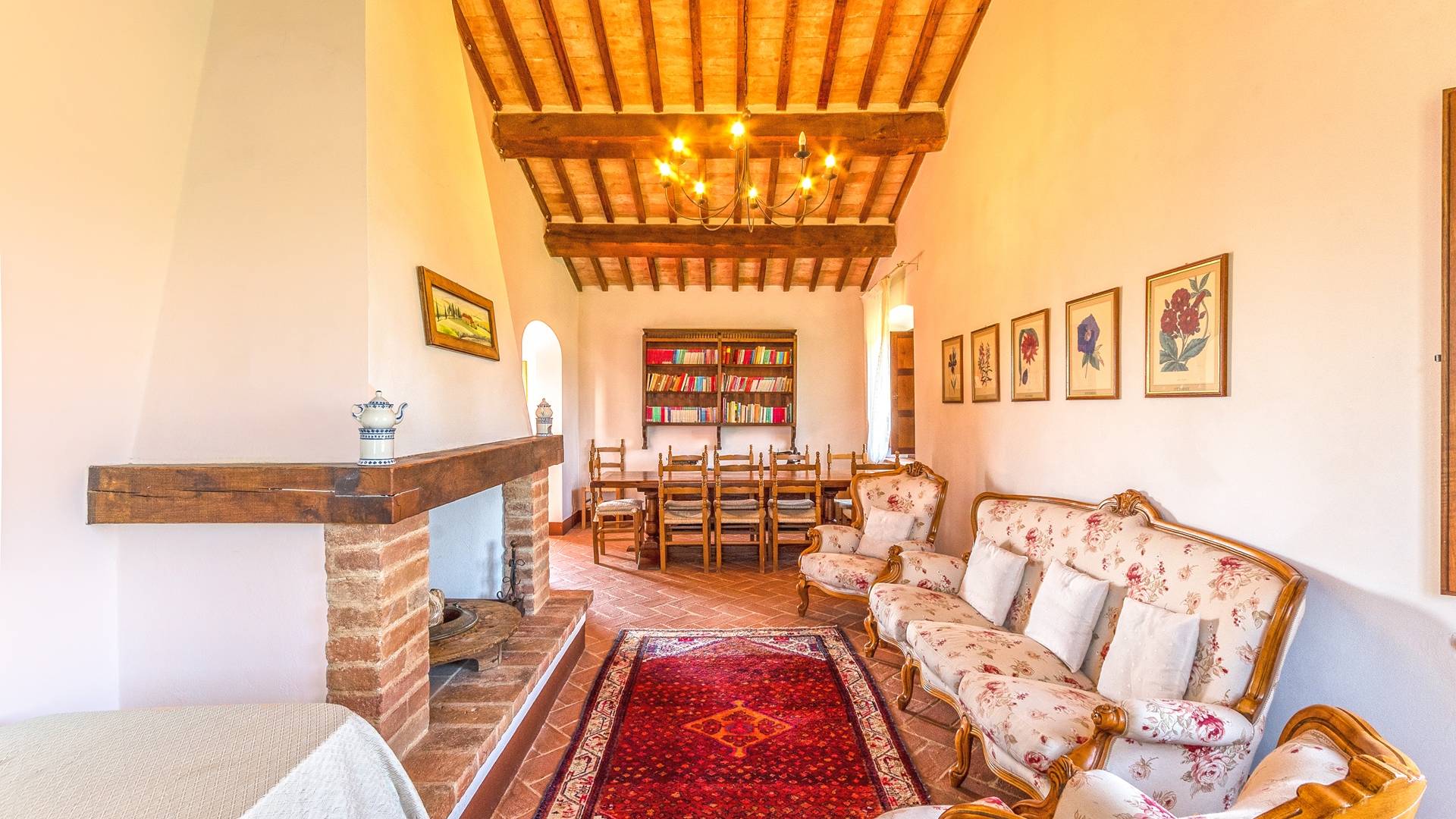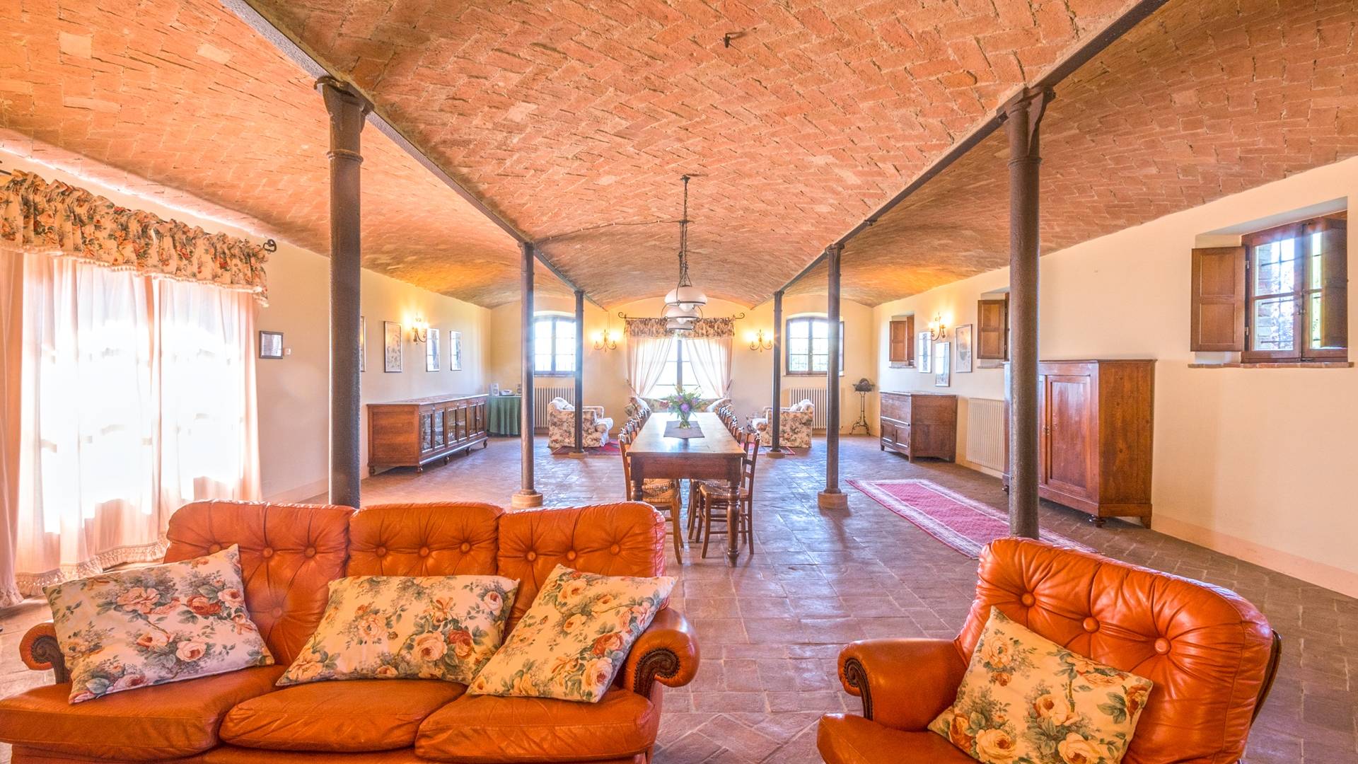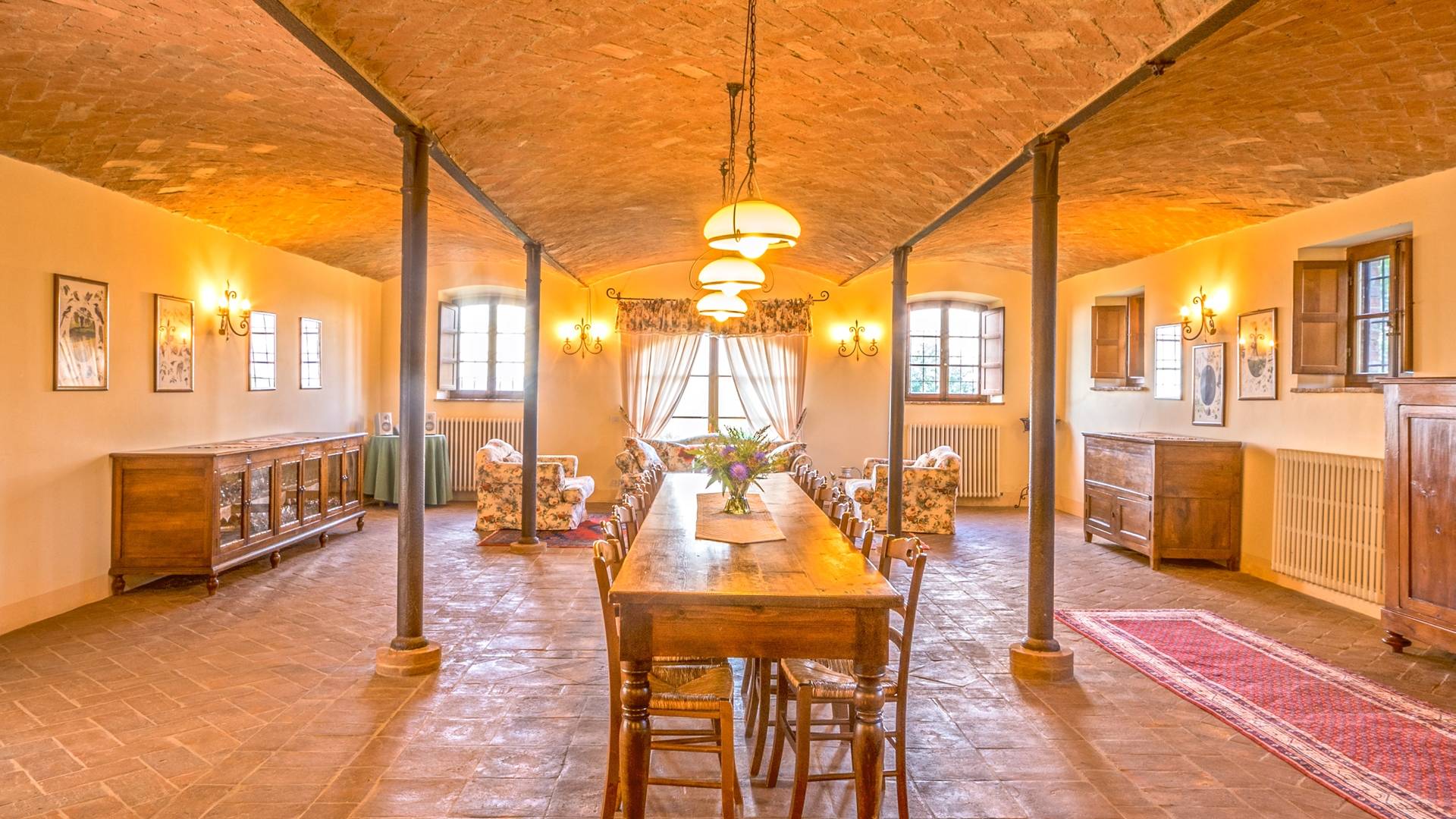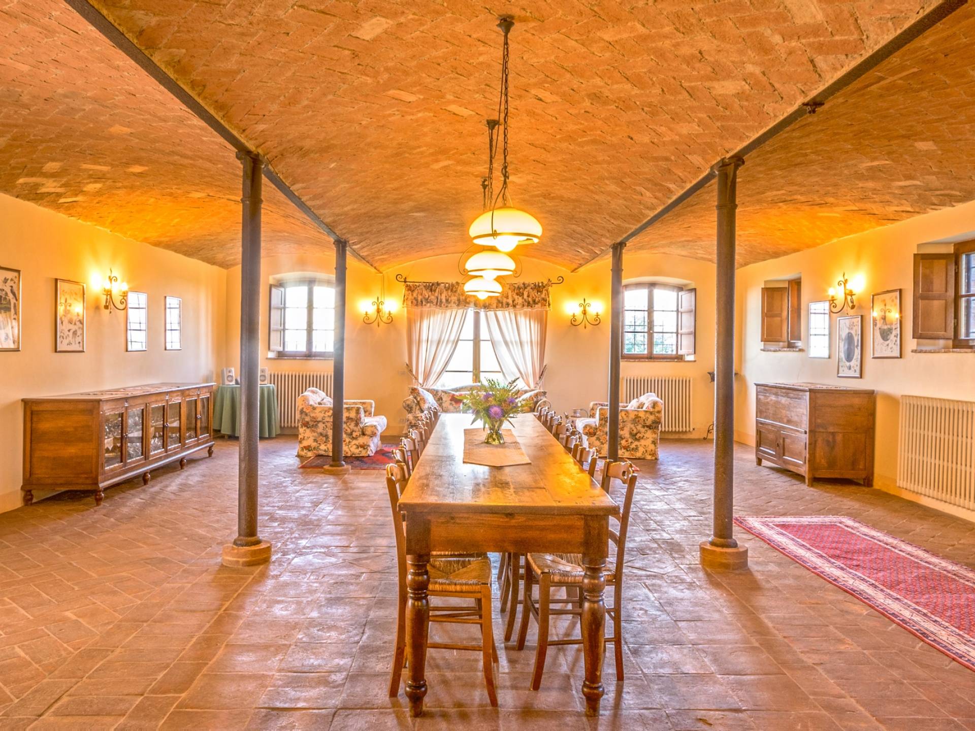 Однако внутренние помещения сохраняют традиционный деревенский стиль с терракотовыми полами и открытыми балками. Антикварная мебель была восстановлена и отреставрирована, чтобы создать аутентичный и верный традиционный интерьер. На первом этаже коттеджа, ранее предназначавшемся под конюшню, теперь находится большой зал, идеально подходящий для обедов, банкетов или фуршетов. Он способен вместить до ста человек. Также на первом этаже находится хорошо оборудованная кухня общего пользования с плитой, холодильником, духовкой, кофеваркой и посудомоечной машиной.