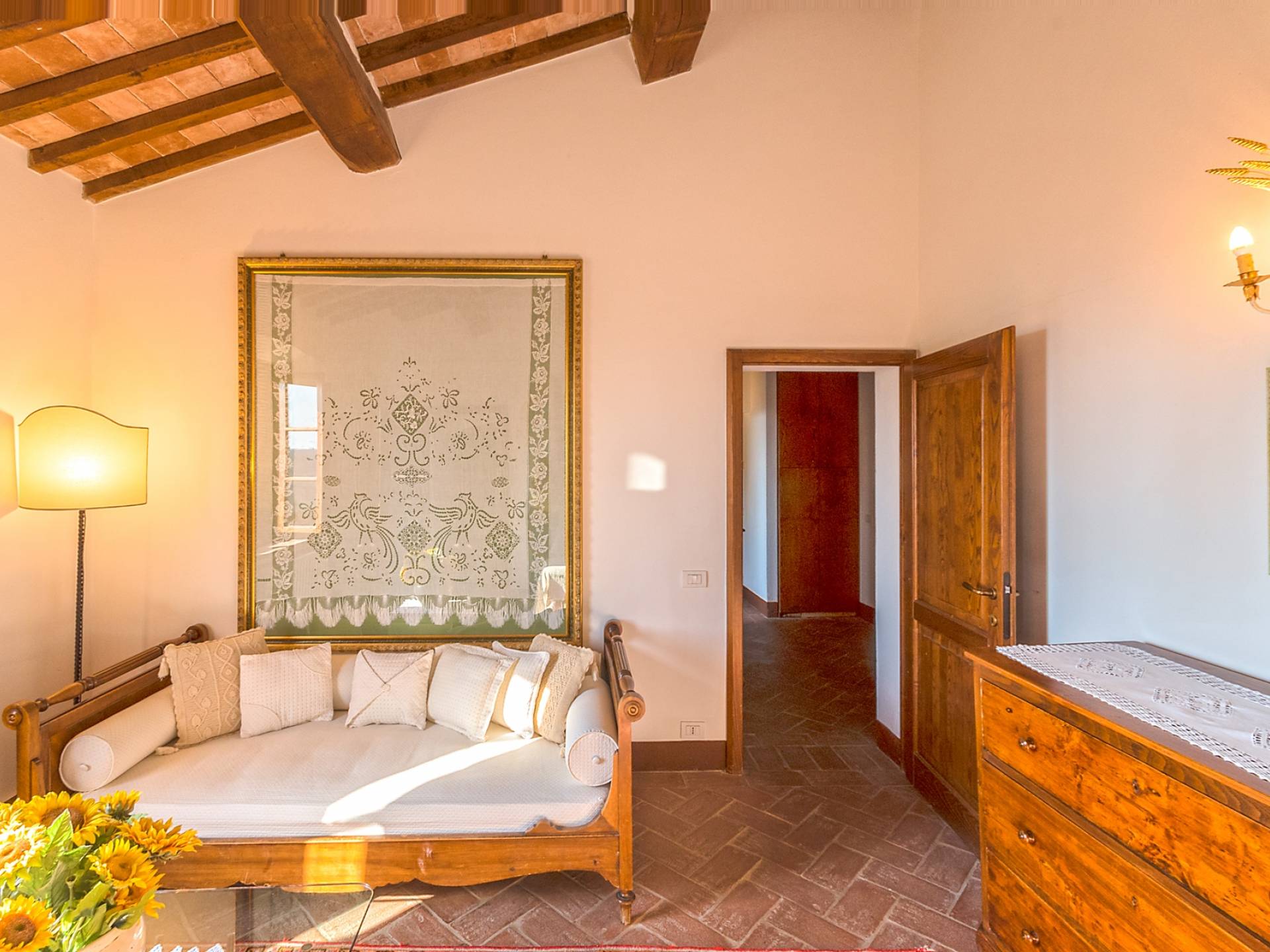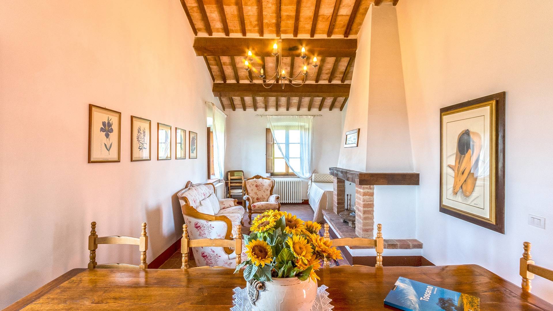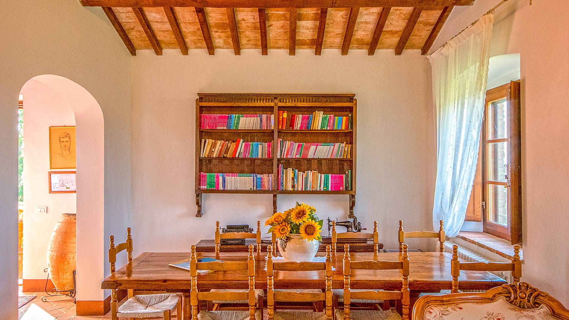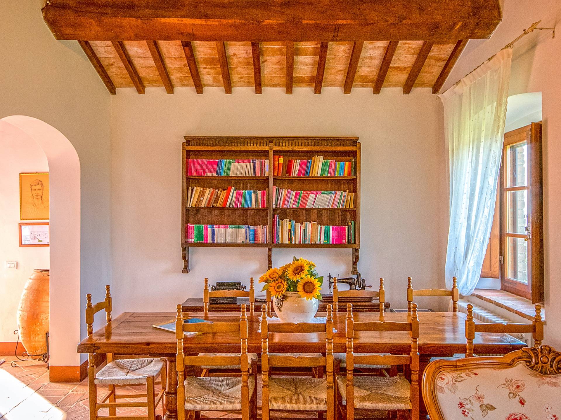 Однако внутренние помещения сохраняют традиционный деревенский стиль с терракотовыми полами и открытыми балками. Антикварная мебель была восстановлена и отреставрирована, чтобы создать аутентичный и верный традиционный интерьер. На первом этаже коттеджа, ранее предназначавшемся под конюшню, теперь находится большой зал, идеально подходящий для обедов, банкетов или фуршетов. Он способен вместить до ста человек. Также на первом этаже находится хорошо оборудованная кухня общего пользования с плитой, холодильником, духовкой, кофеваркой и посудомоечной машиной.