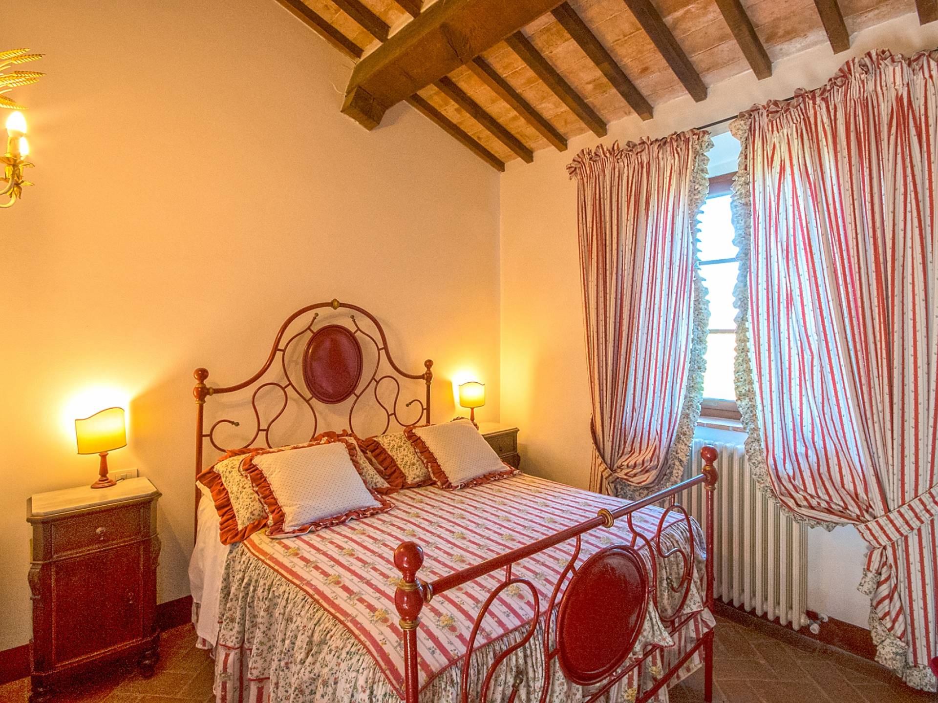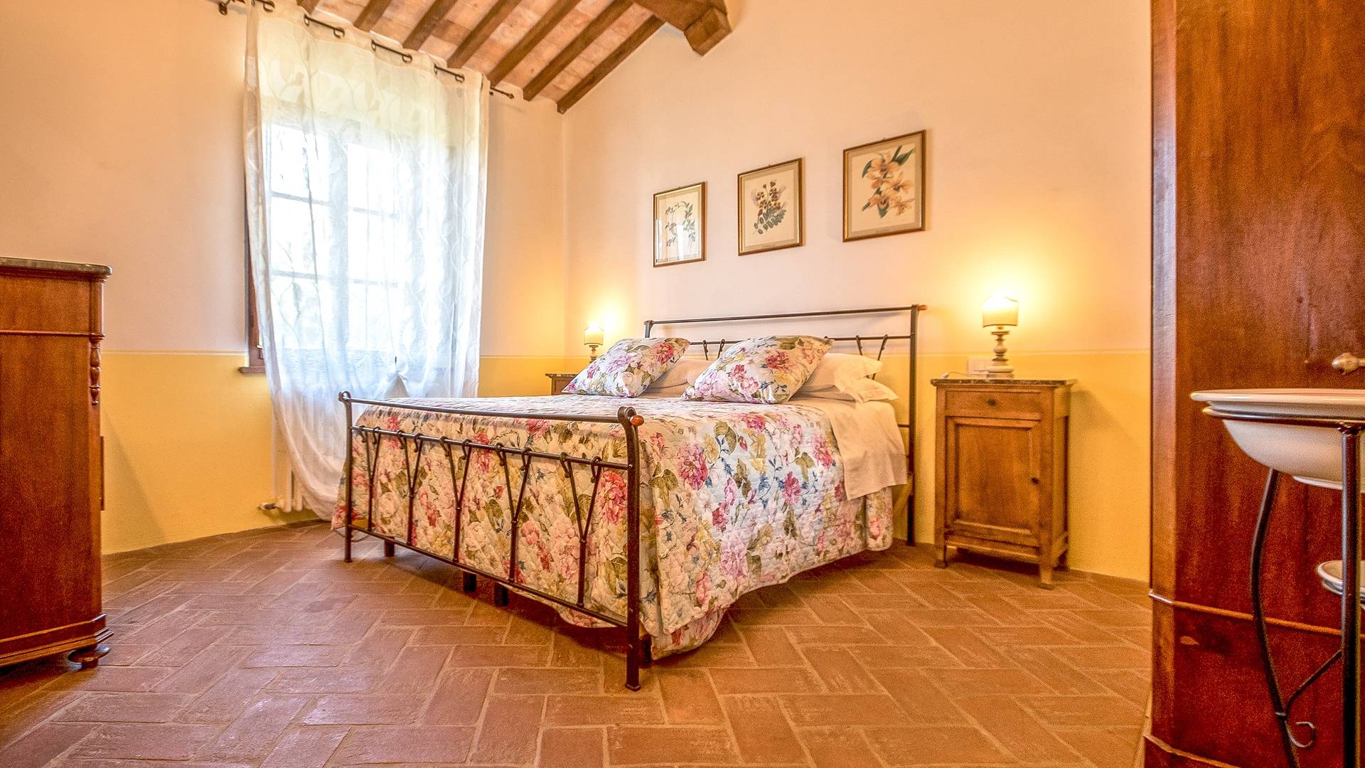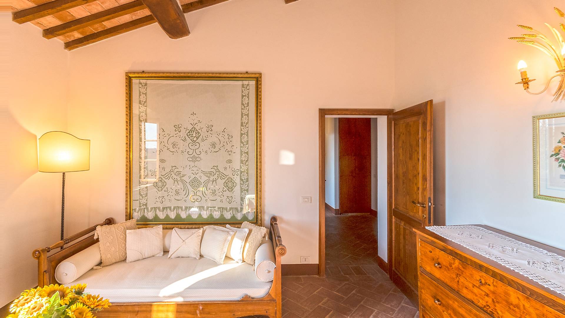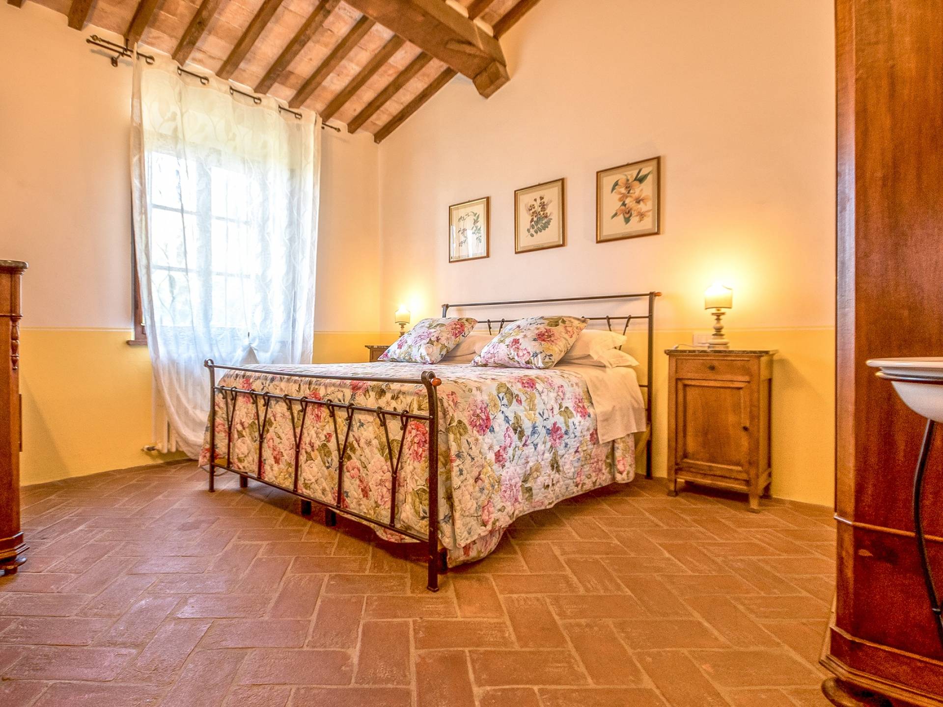 Однако внутренние помещения сохраняют традиционный деревенский стиль с терракотовыми полами и открытыми балками. Антикварная мебель была восстановлена и отреставрирована, чтобы создать аутентичный и верный традиционный интерьер. На первом этаже коттеджа, ранее предназначавшемся под конюшню, теперь находится большой зал, идеально подходящий для обедов, банкетов или фуршетов. Он способен вместить до ста человек. Также на первом этаже находится хорошо оборудованная кухня общего пользования с плитой, холодильником, духовкой, кофеваркой и посудомоечной машиной.