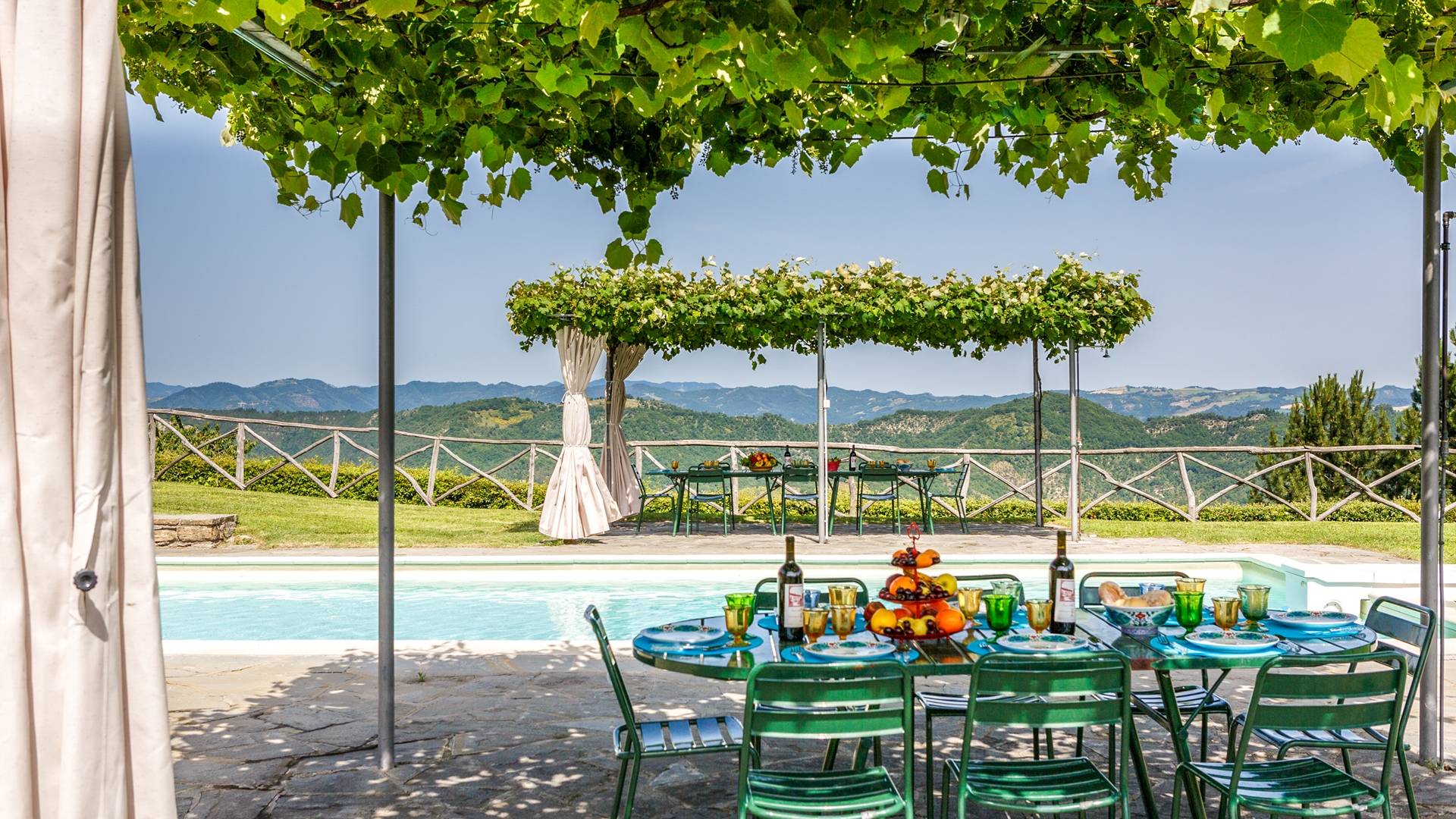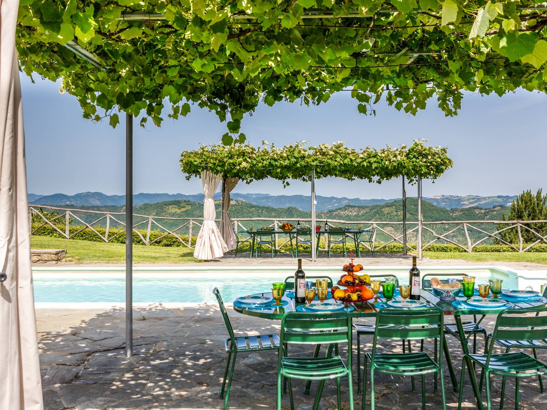На первом этаже также находится настоящая независимая квартира на 10 человек с большой гостиной с камином, столовой, полностью оборудованной кухней и второй кухней для приготовления еды на открытом воздухе, пятью спальнями и пятью ванными комнатами. Вы можете посидеть на удобной террасе, чтобы насладиться панорамным видом на окрестности. В большом саду с одной стороны дома у вас будет бассейн длиной 10 метров, шириной 5 метров и глубиной от 1,20 до 1,40 метра. Возле бассейна вилла оборудована шезлонгами и двумя зелеными беседками со столами и стульями, где вы можете весело провести время, а также посвятить себя работе или любимым хобби. Также имеется площадка для барбекю.