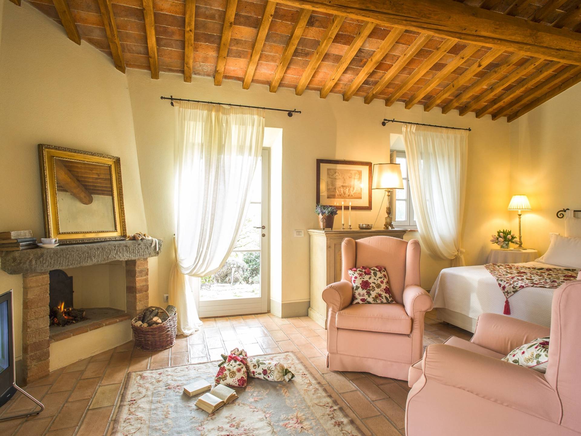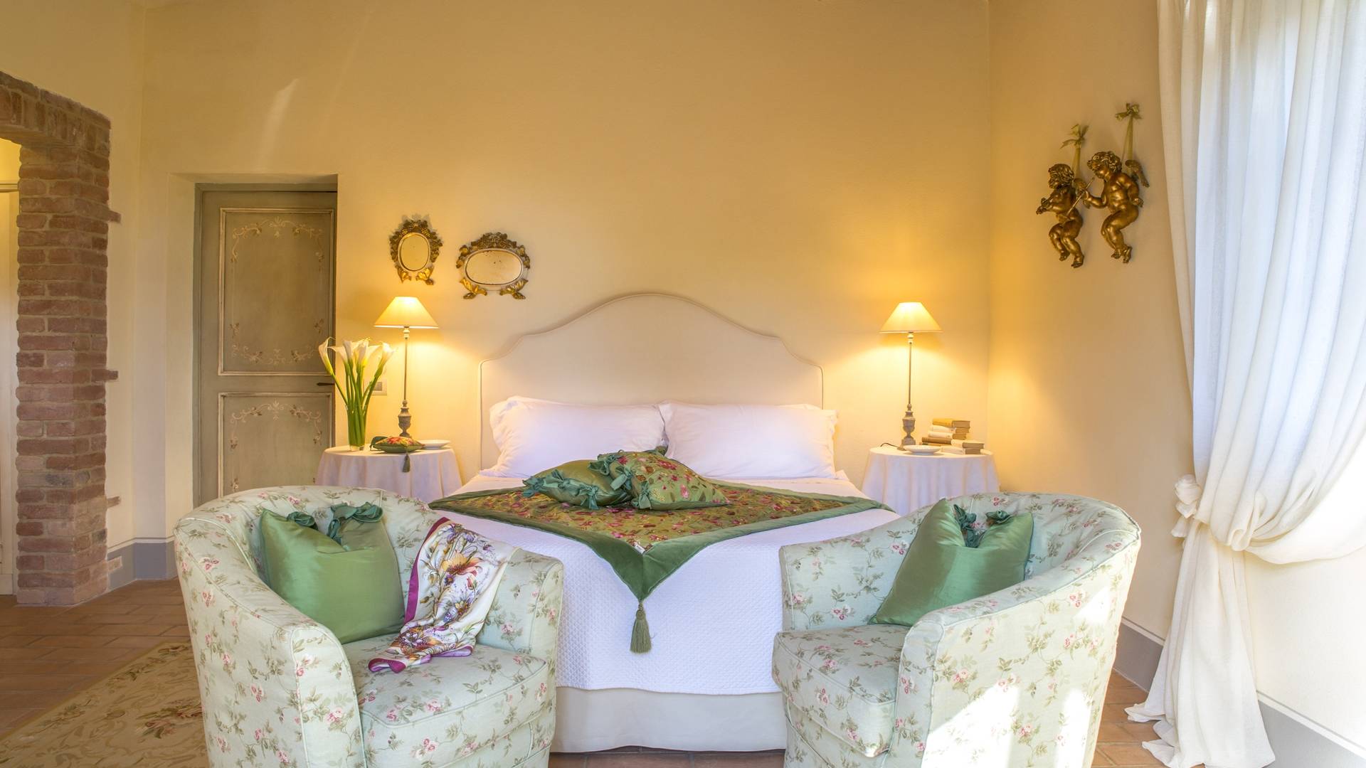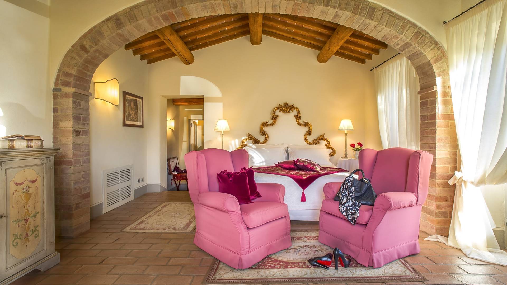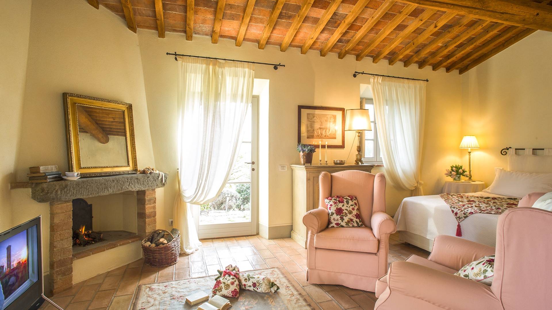 Люкс La Ghiandaia с простым и элегантным декором, антикварной мебелью и небесно-голубыми оттенками создает расслабляющую атмосферу. Ванная комната очень уютная и предлагает гостям большой душ из хрусталя и камня, джакузи с хромотерапией. И последнее, но не менее важное: люкс Le Tortore выполнен в нежном розовом цвете, который характеризует этот люкс, а антикварная мебель делает его романтичным и интимным. Из окон открывается вид на долину и холмы. В ванной комнате есть душевая кабина из хрусталя, гидромассажная ванна с хромотерапией.