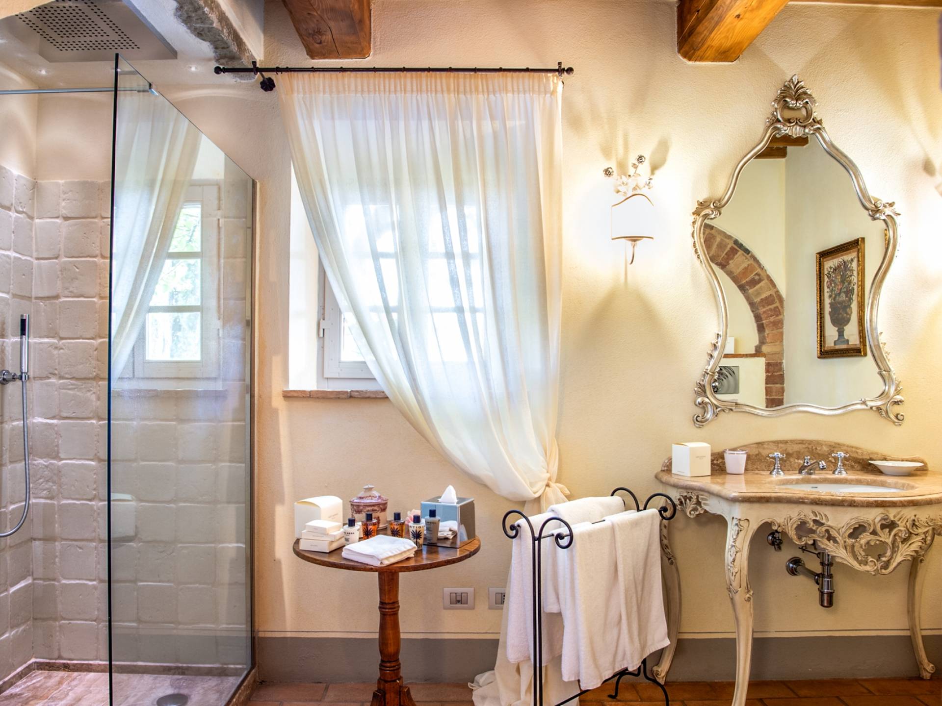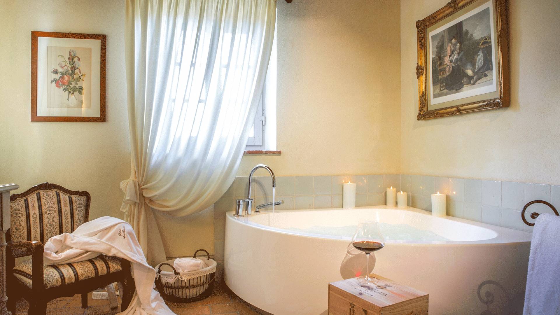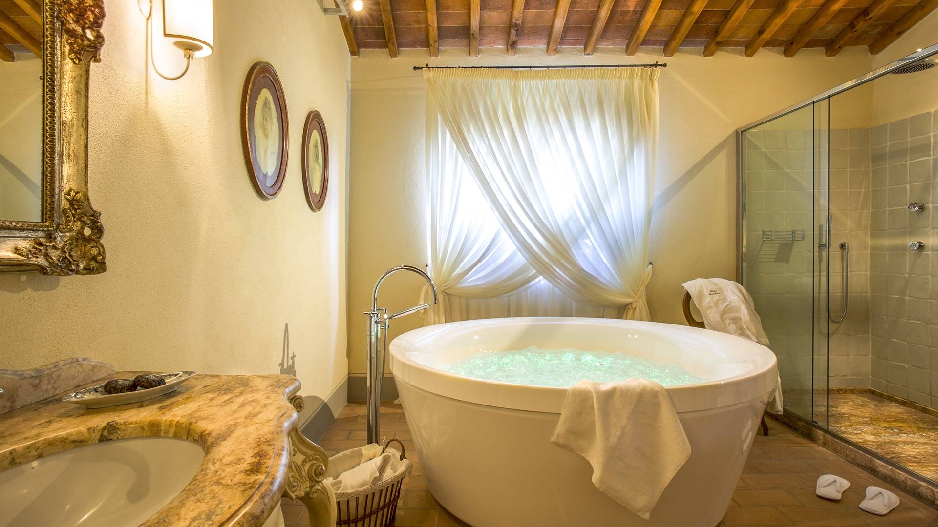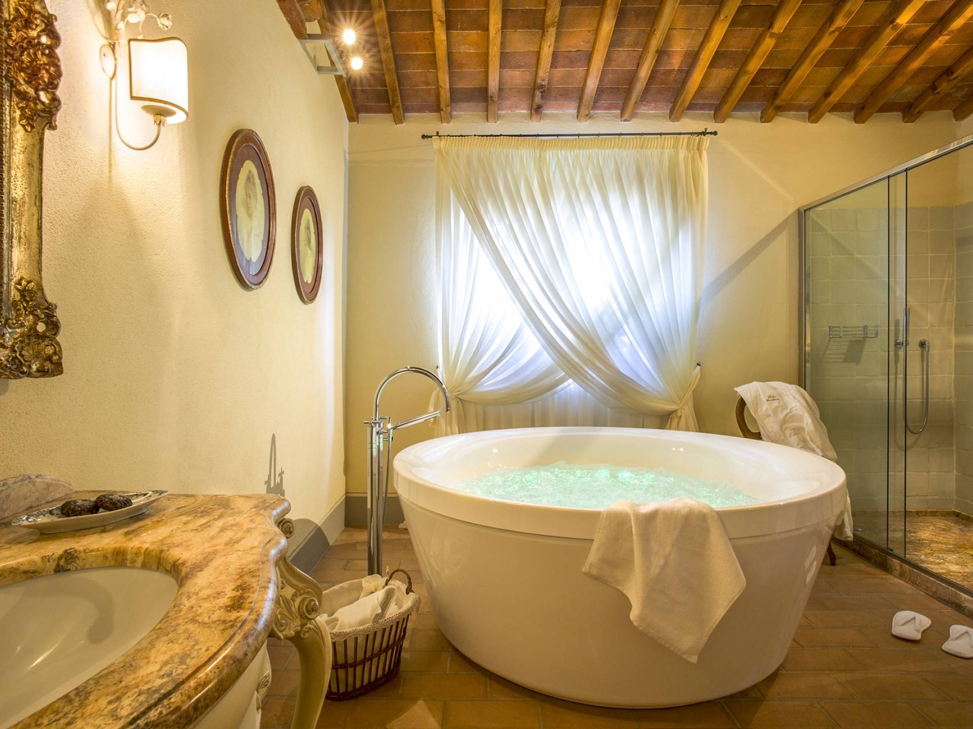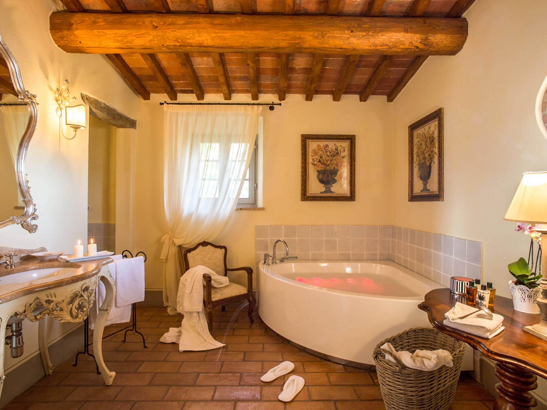 В люксах Il Falco старинная мебель и камни темно-красного цвета создают теплую и дружелюбную атмосферу. На двух уровнях расположена большая ванная комната с камином, тропическим душем из травертина и хрусталя, большой гидромассажной ванной с хромотерапией, из которой открывается вид на виноградники и пшеничные поля. Отличительными чертами люкса Le Civette являются пастельно-зеленый цвет и старинный письменный стол, создающие уютную и дружелюбную атмосферу. Особенно очаровательна ванная комната с чашеобразной гидромассажной ванной с хромотерапией, которая напоминает образ древних родников; большая душевая кабина изготовлена из травертина и хрусталя.