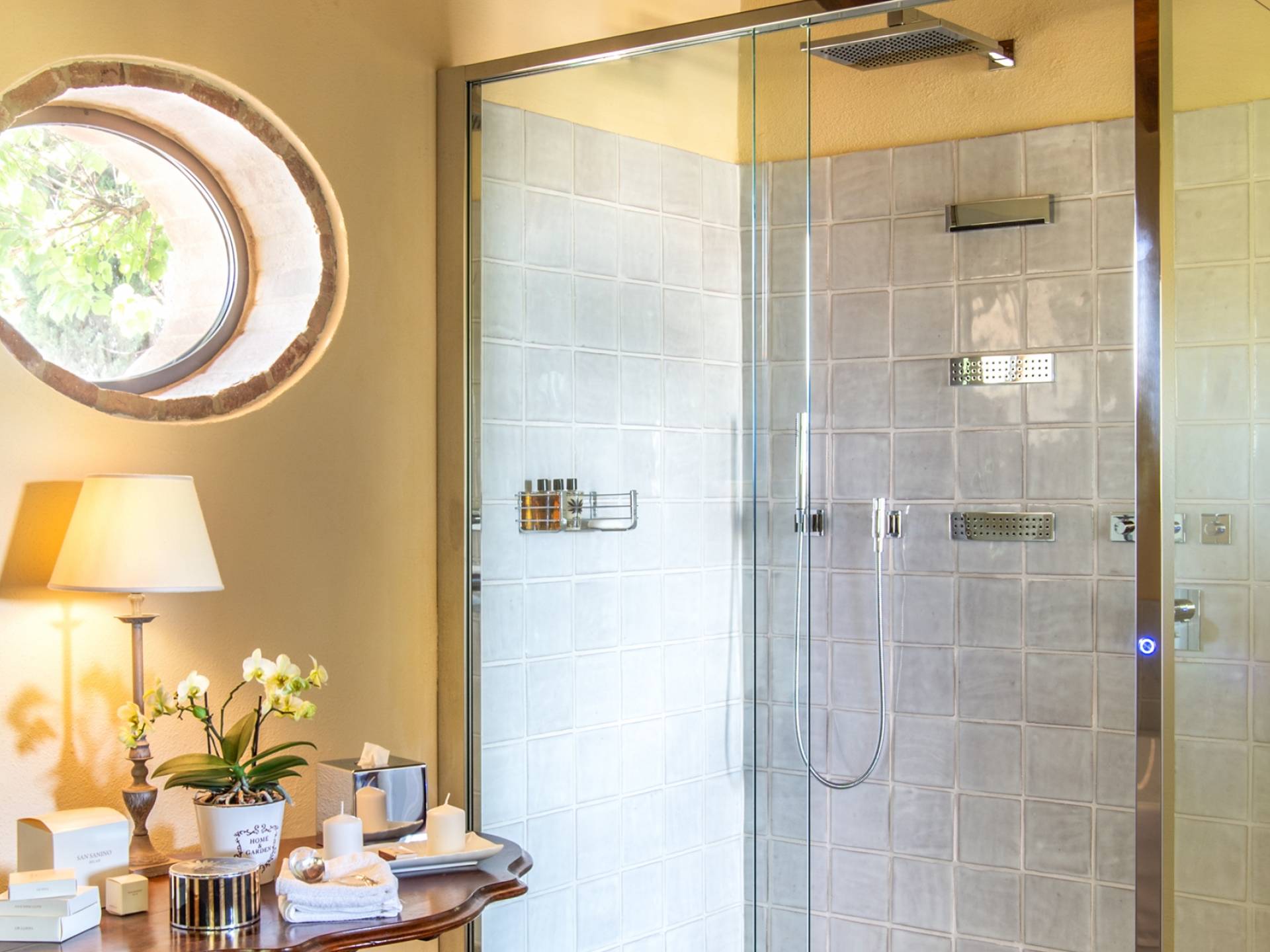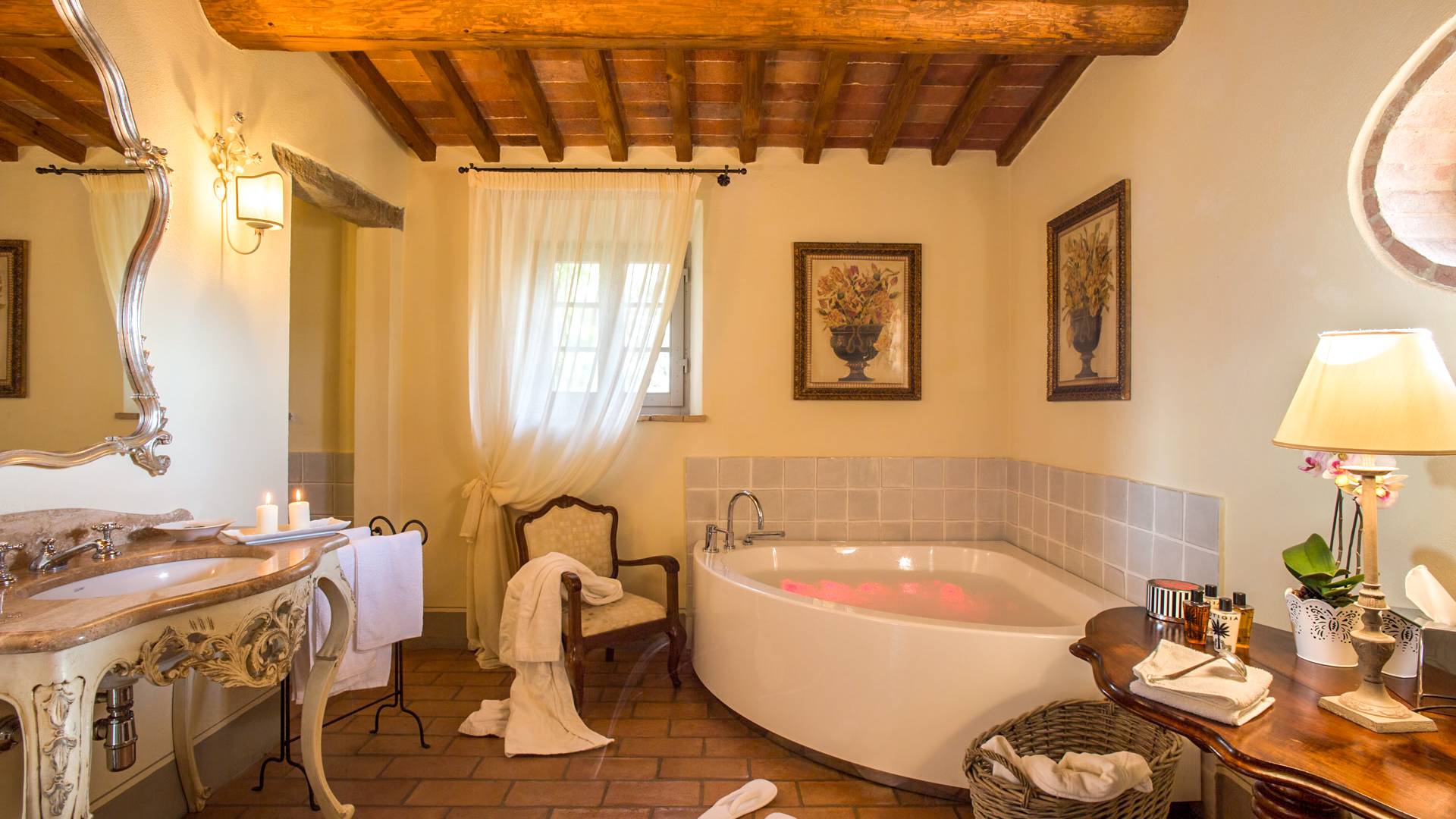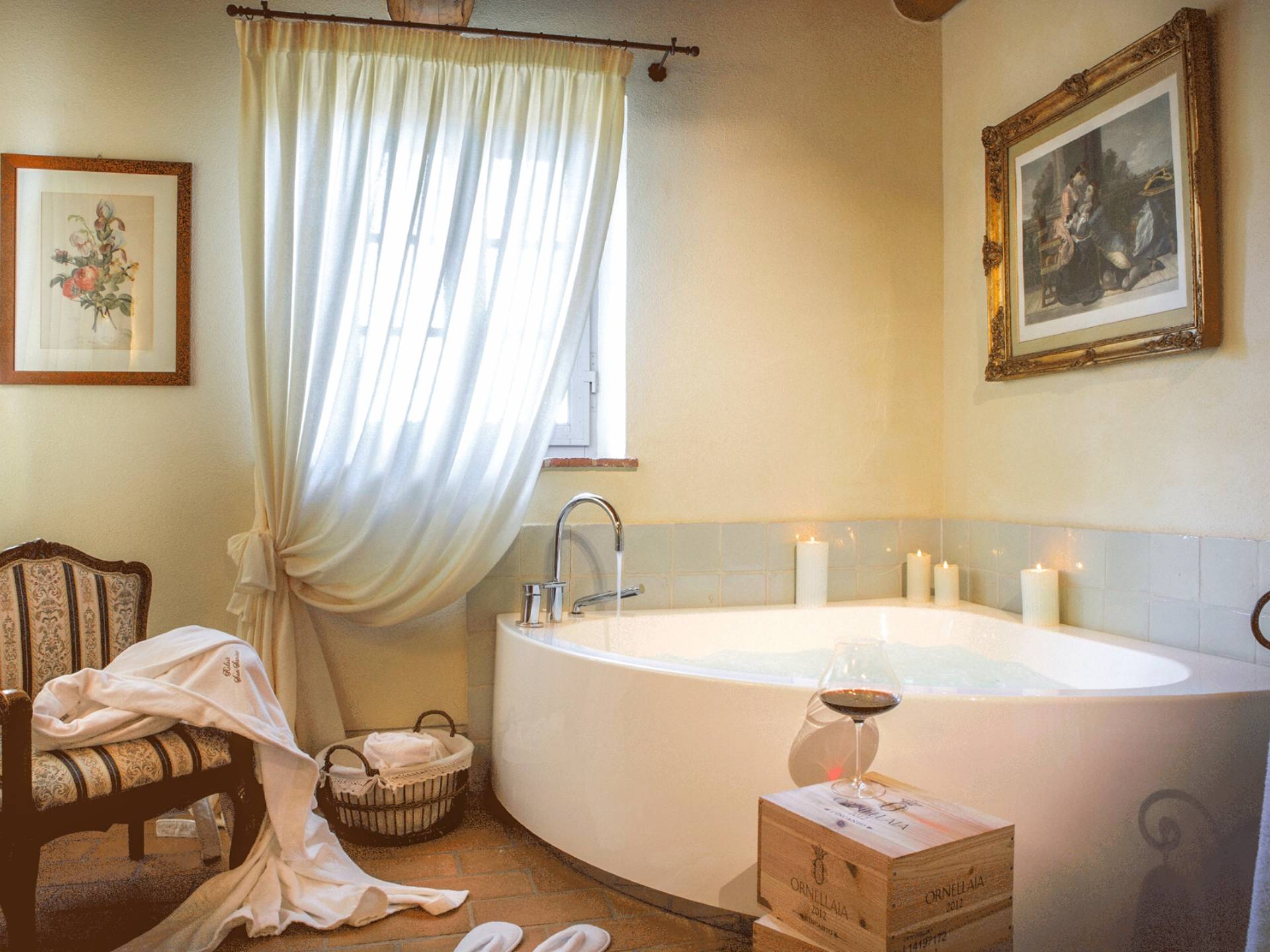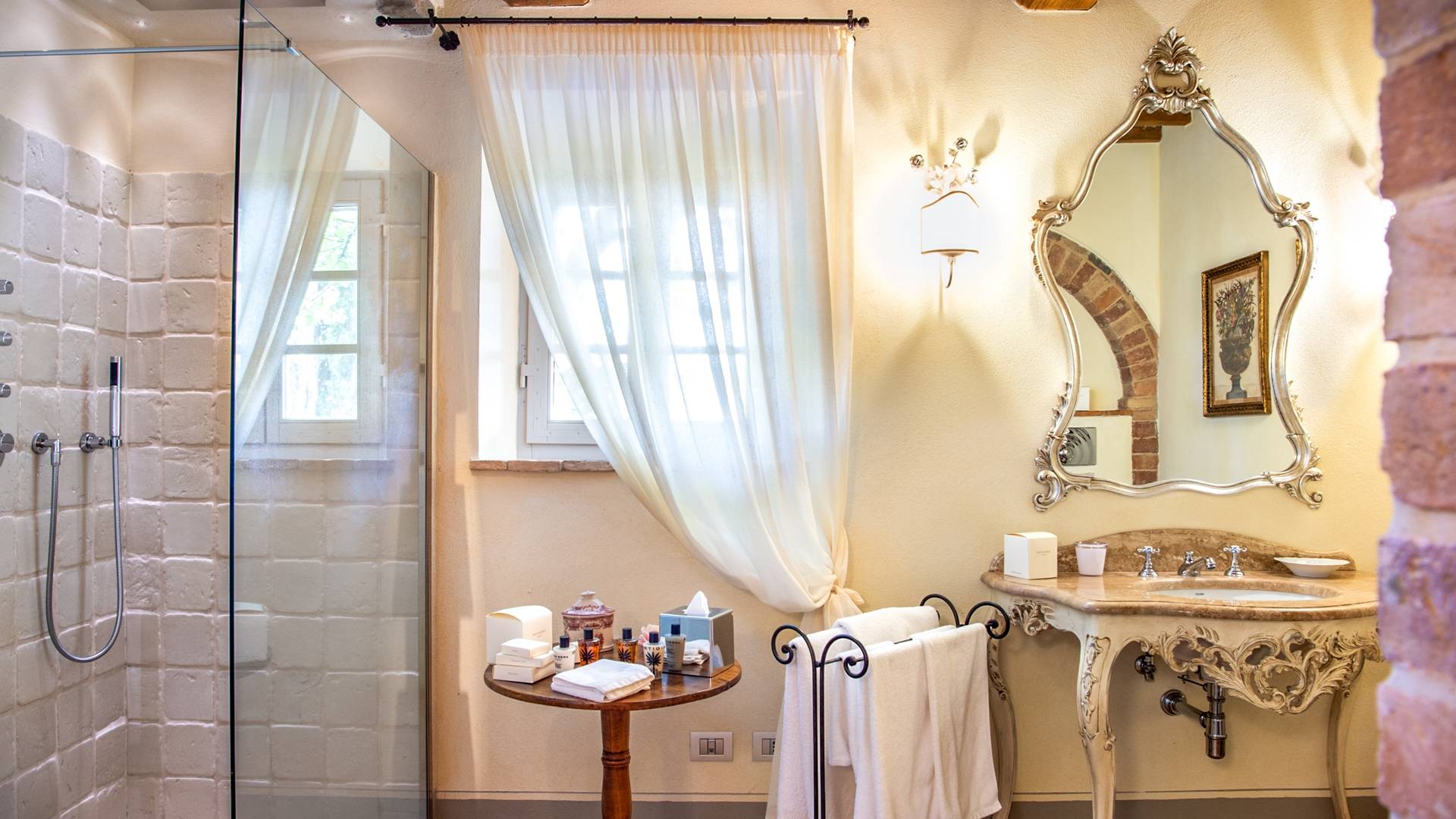 В люксах Il Falco старинная мебель и камни темно-красного цвета создают теплую и дружелюбную атмосферу. На двух уровнях расположена большая ванная комната с камином, тропическим душем из травертина и хрусталя, большой гидромассажной ванной с хромотерапией, из которой открывается вид на виноградники и пшеничные поля. Отличительными чертами люкса Le Civette являются пастельно-зеленый цвет и старинный письменный стол, создающие уютную и дружелюбную атмосферу. Особенно очаровательна ванная комната с чашеобразной гидромассажной ванной с хромотерапией, которая напоминает образ древних родников; большая душевая кабина изготовлена из травертина и хрусталя.