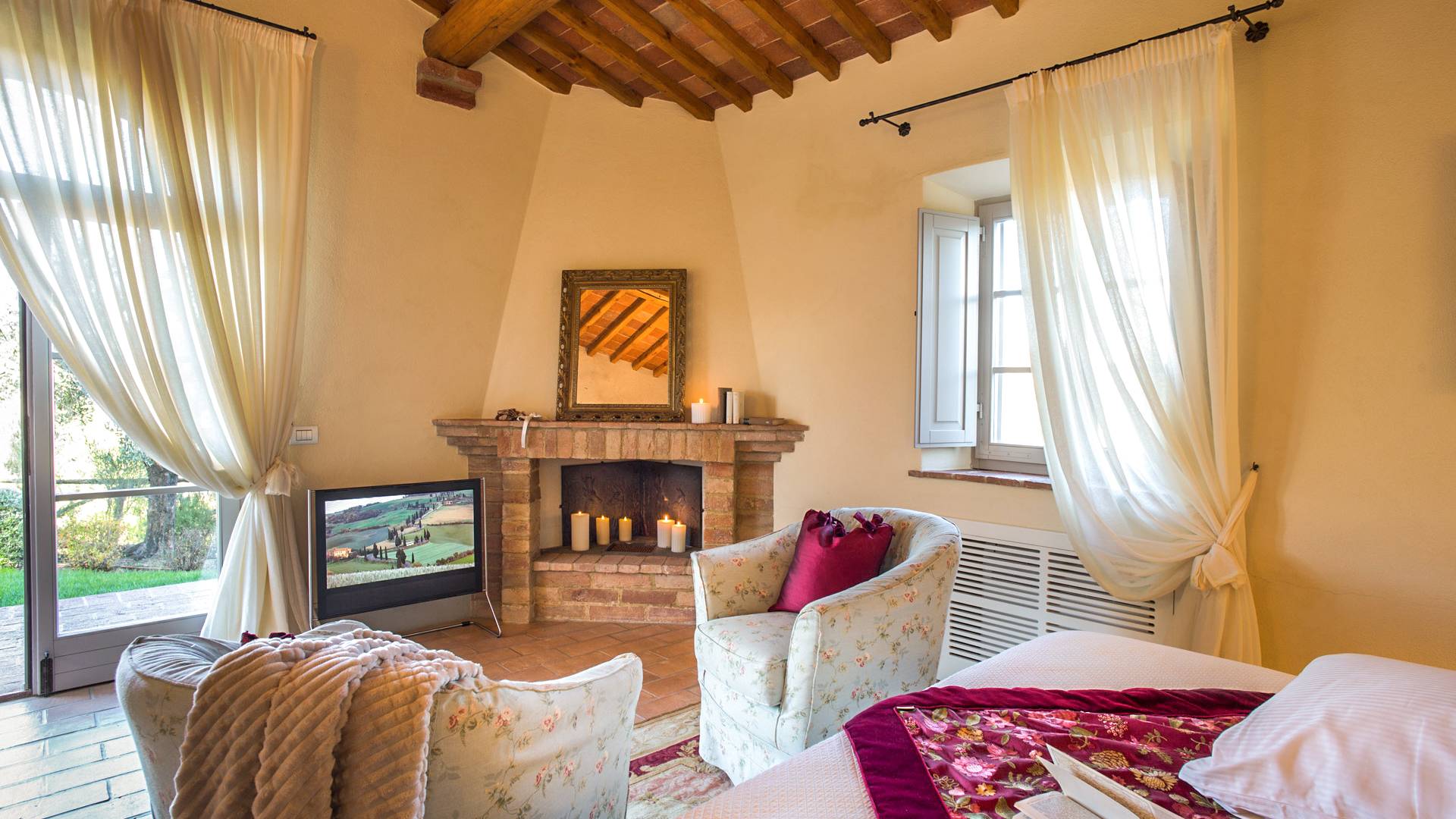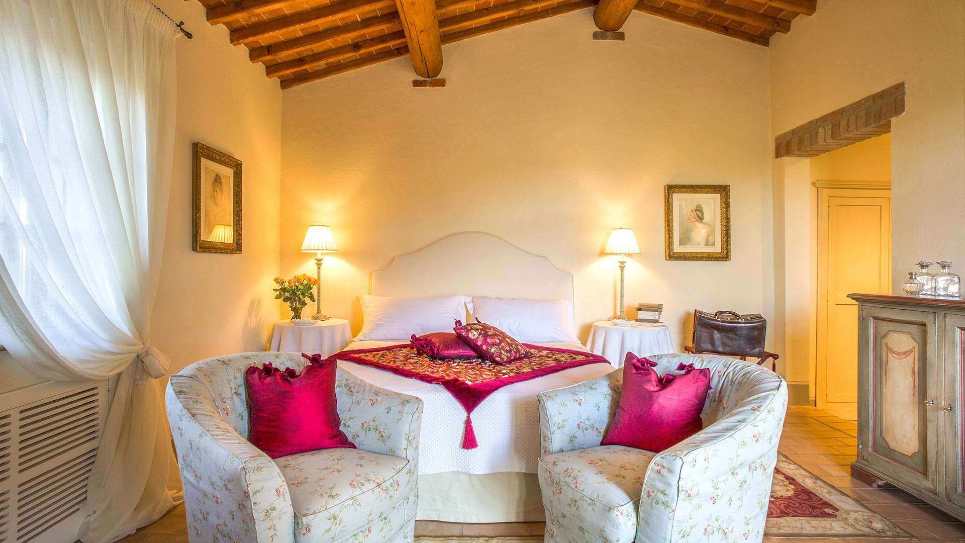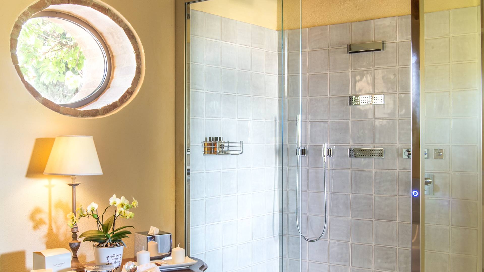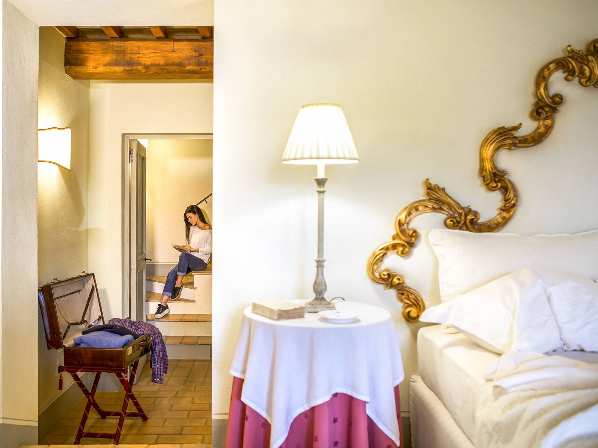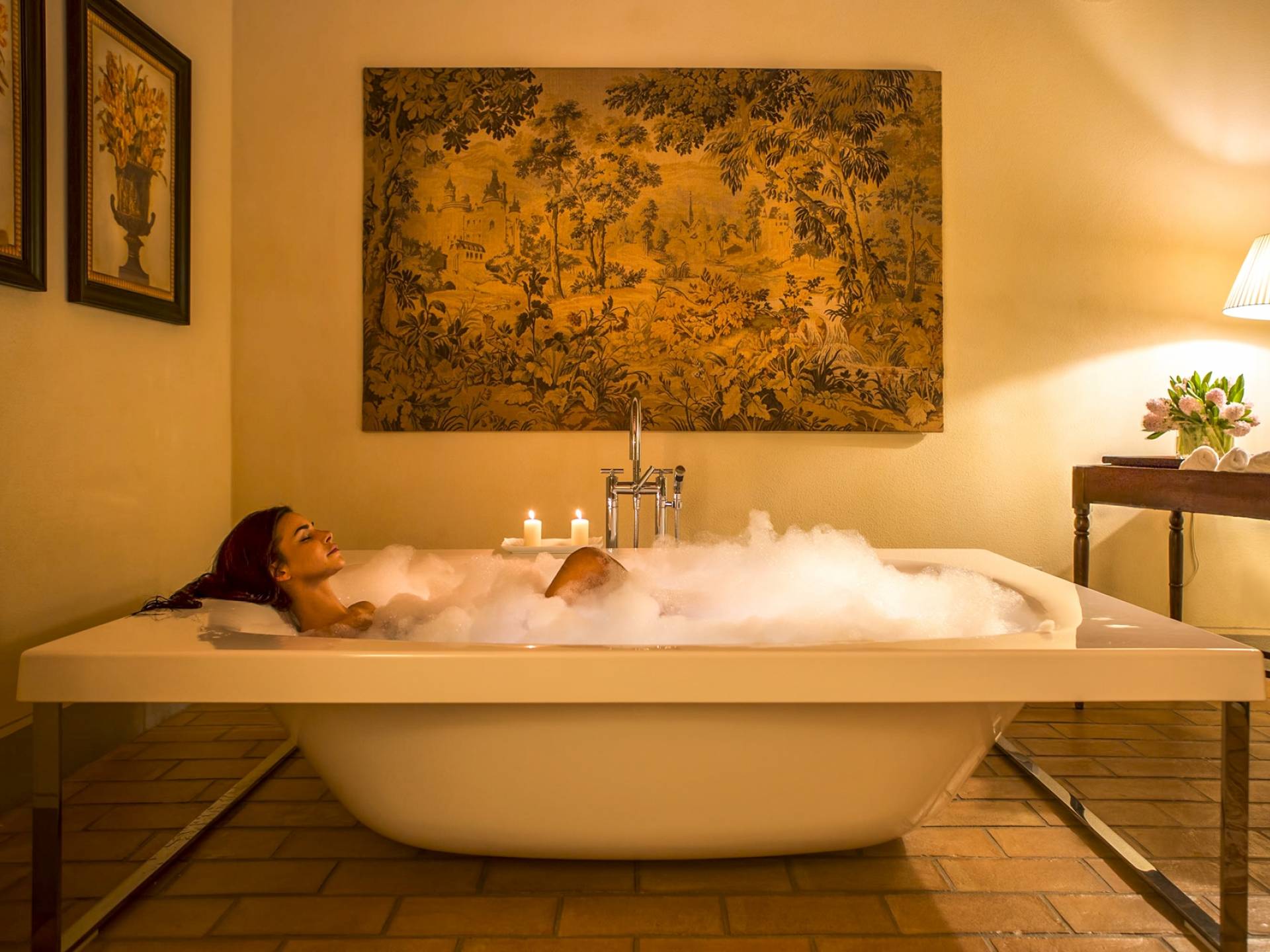 В люксах Il Falco старинная мебель и камни темно-красного цвета создают теплую и дружелюбную атмосферу. На двух уровнях расположена большая ванная комната с камином, тропическим душем из травертина и хрусталя, большой гидромассажной ванной с хромотерапией, из которой открывается вид на виноградники и пшеничные поля. Отличительными чертами люкса Le Civette являются пастельно-зеленый цвет и старинный письменный стол, создающие уютную и дружелюбную атмосферу. Особенно очаровательна ванная комната с чашеобразной гидромассажной ванной с хромотерапией, которая напоминает образ древних родников; большая душевая кабина изготовлена из травертина и хрусталя.