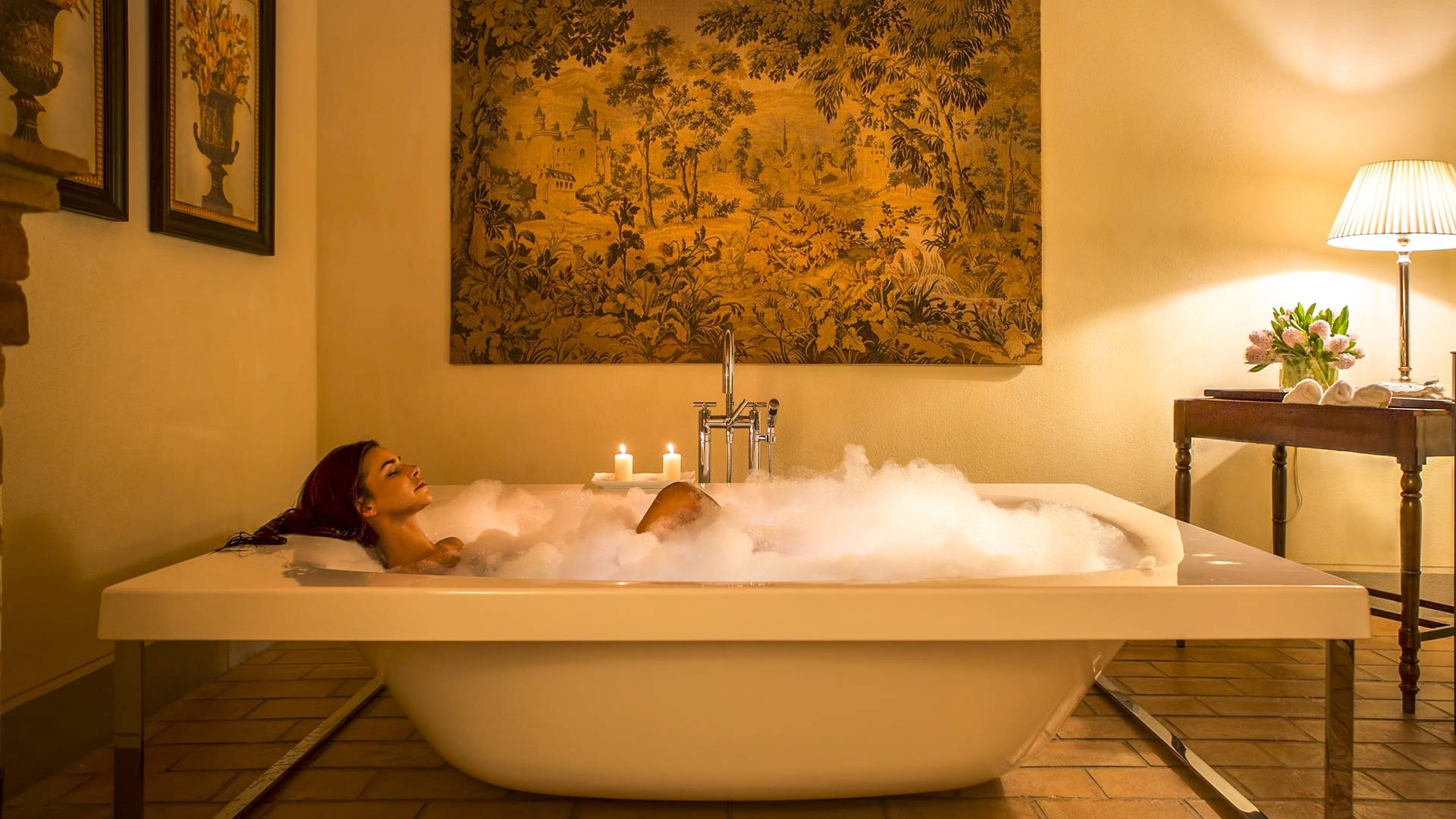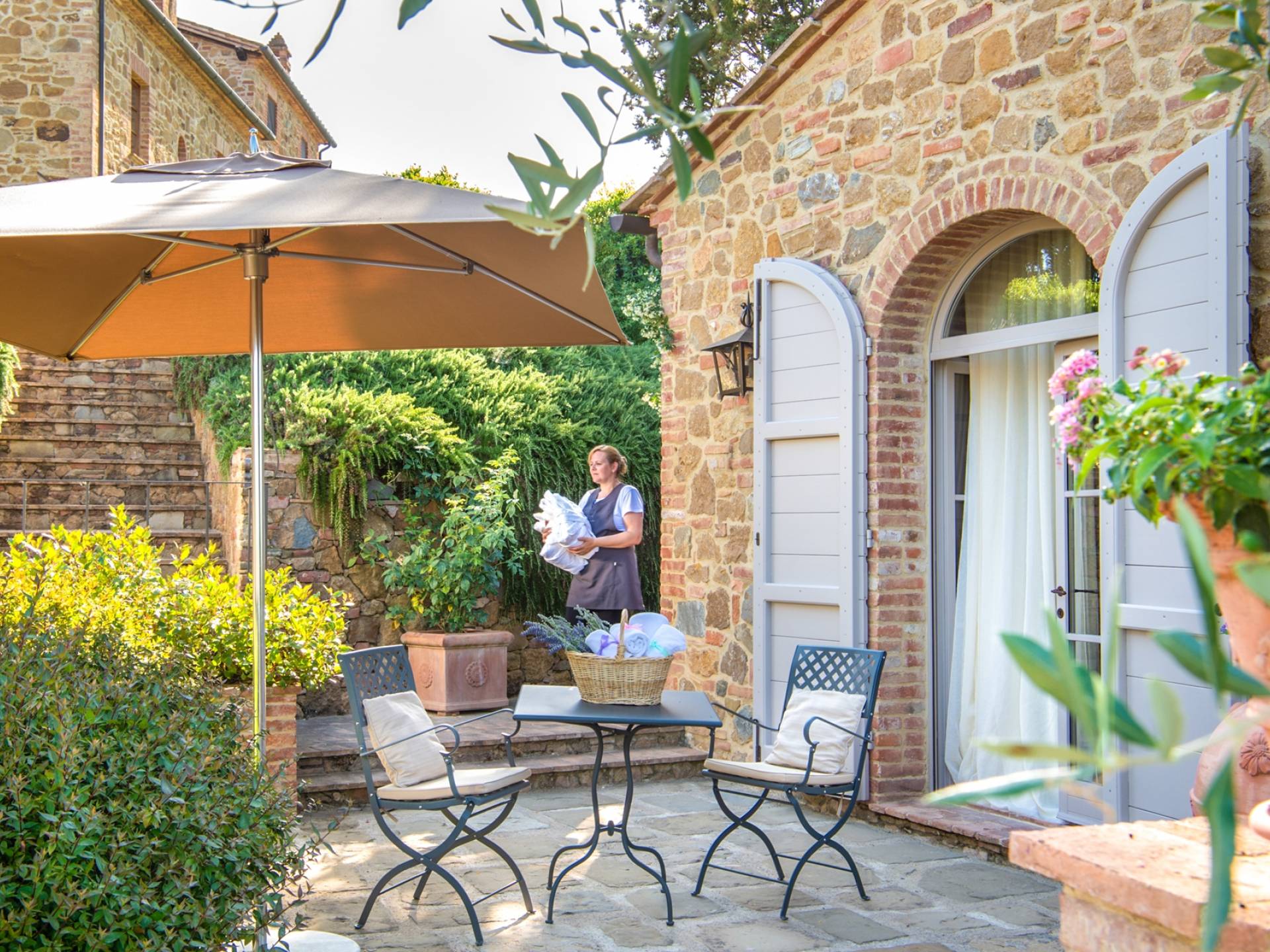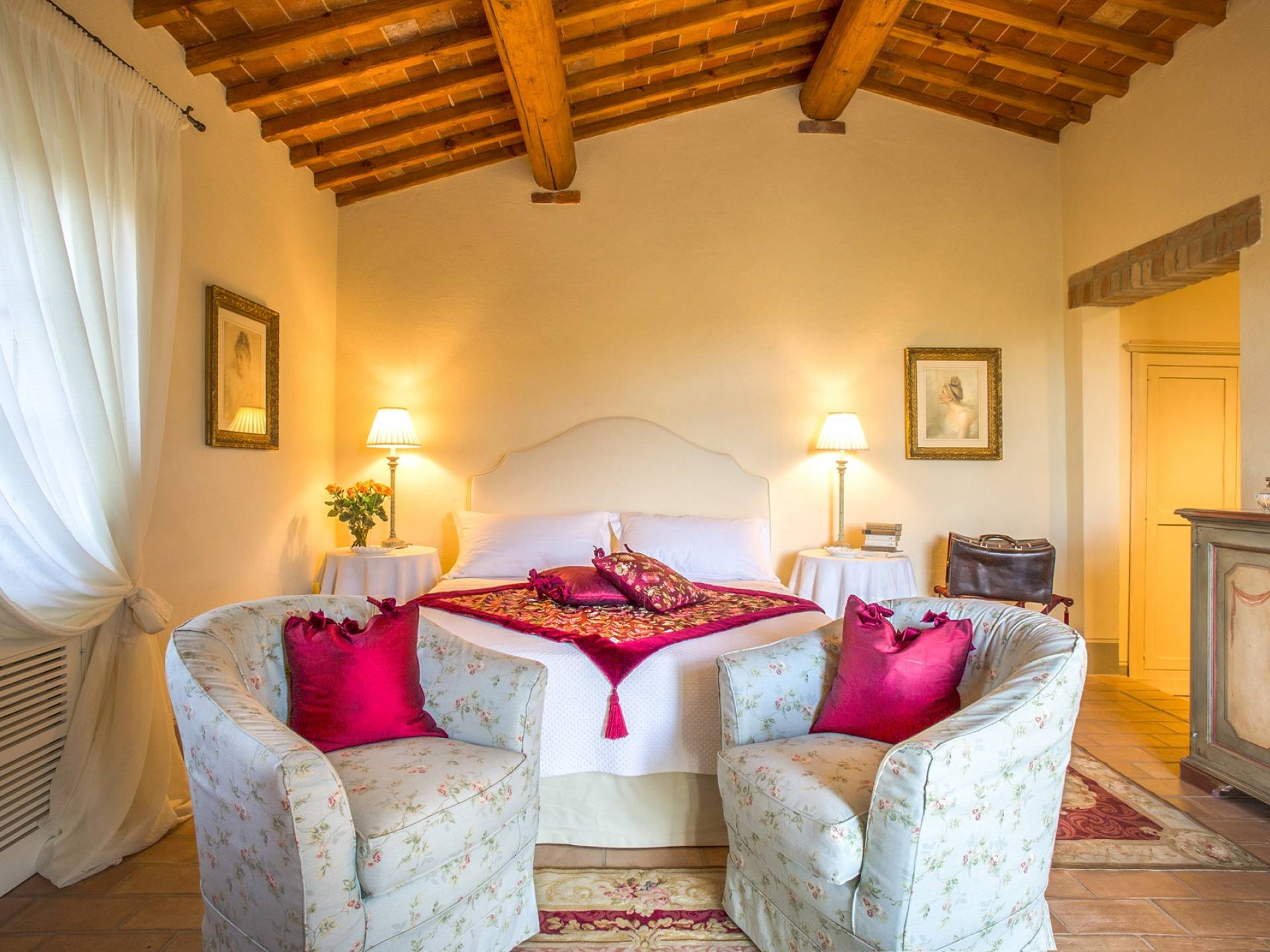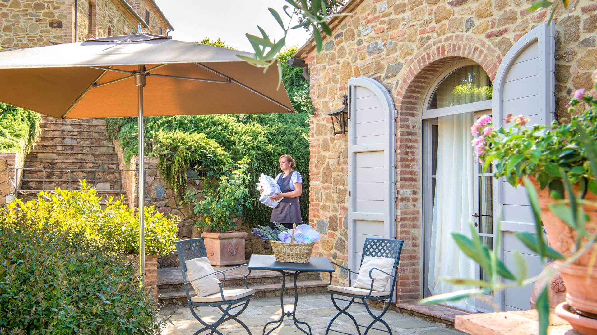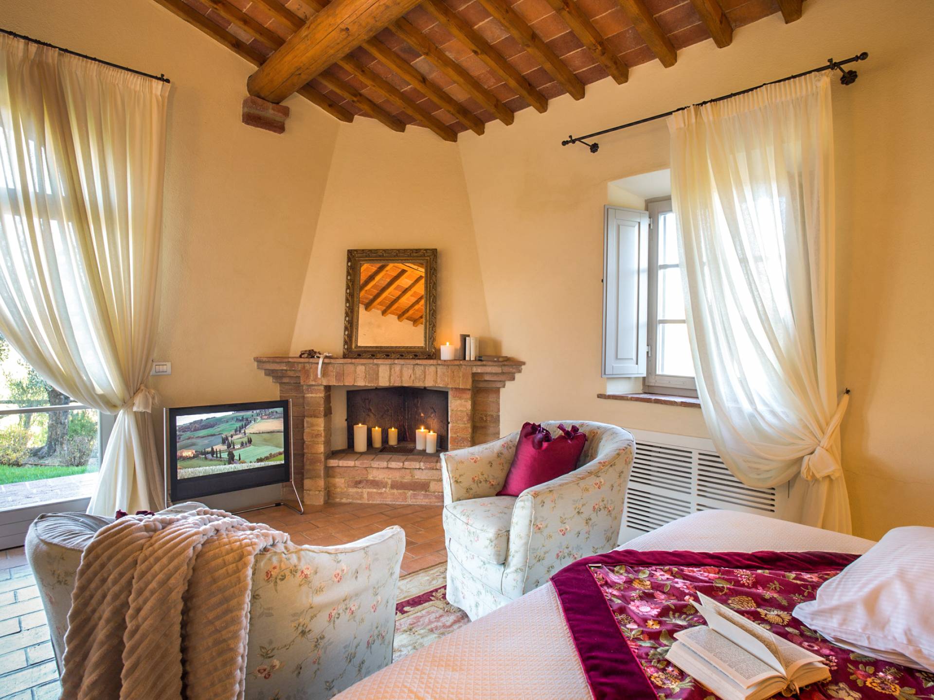 В люксах Il Falco старинная мебель и камни темно-красного цвета создают теплую и дружелюбную атмосферу. На двух уровнях расположена большая ванная комната с камином, тропическим душем из травертина и хрусталя, большой гидромассажной ванной с хромотерапией, из которой открывается вид на виноградники и пшеничные поля. Отличительными чертами люкса Le Civette являются пастельно-зеленый цвет и старинный письменный стол, создающие уютную и дружелюбную атмосферу. Особенно очаровательна ванная комната с чашеобразной гидромассажной ванной с хромотерапией, которая напоминает образ древних родников; большая душевая кабина изготовлена из травертина и хрусталя.