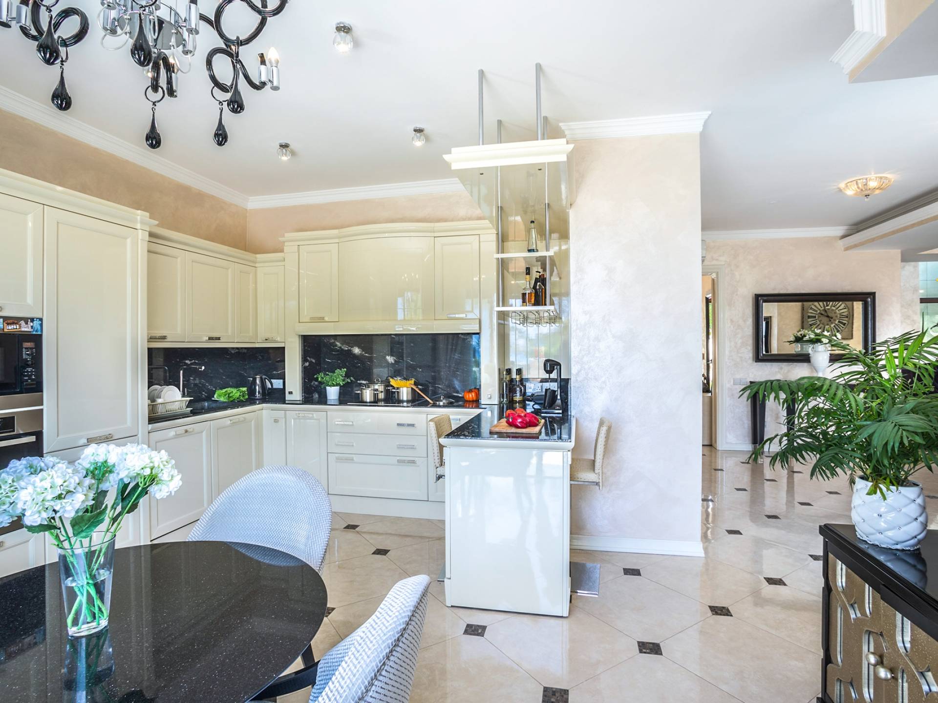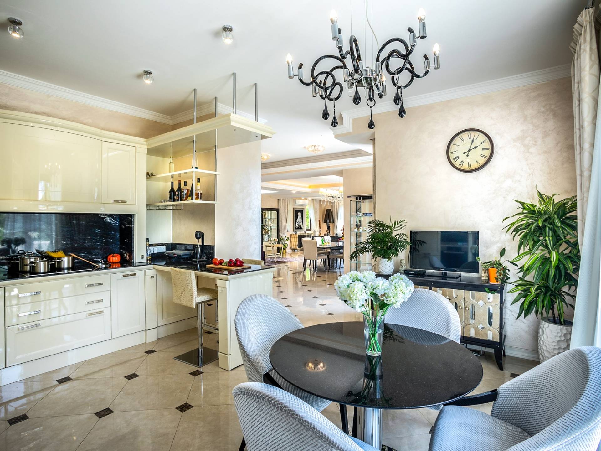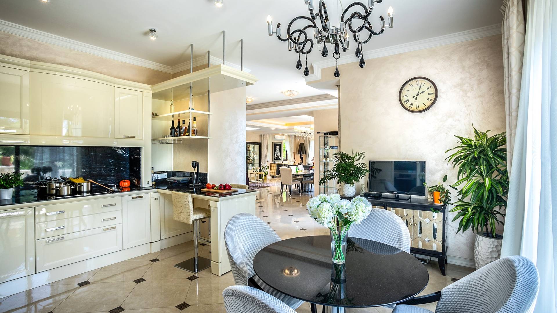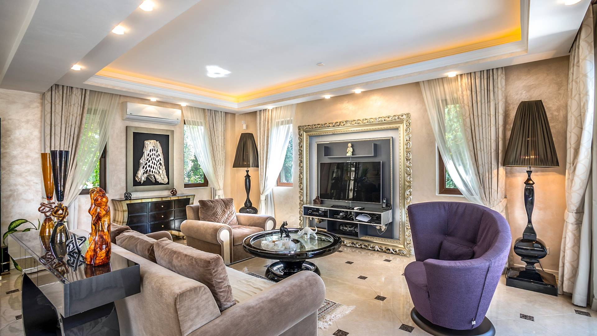 Итальянская кухня виллы оснащена высококлассной немецкой посудой, стаканами, столовыми приборами, различной кухонной утварью, винным холодильником, современной кухонной техникой. В спальнях и ванных комнатах виллы всегда новое свежее постельное белье и полотенца высочайшего качества, новейшая сантехника, кондиционеры и полы с подогревом, высокоскоростной WiFi, спутниковое и кабельное телевидение. Вилла оборудована итальянской мебелью марки «Fendi», коллекционными скульптурными композициями KPM (Германия), фарфором и бронзой.