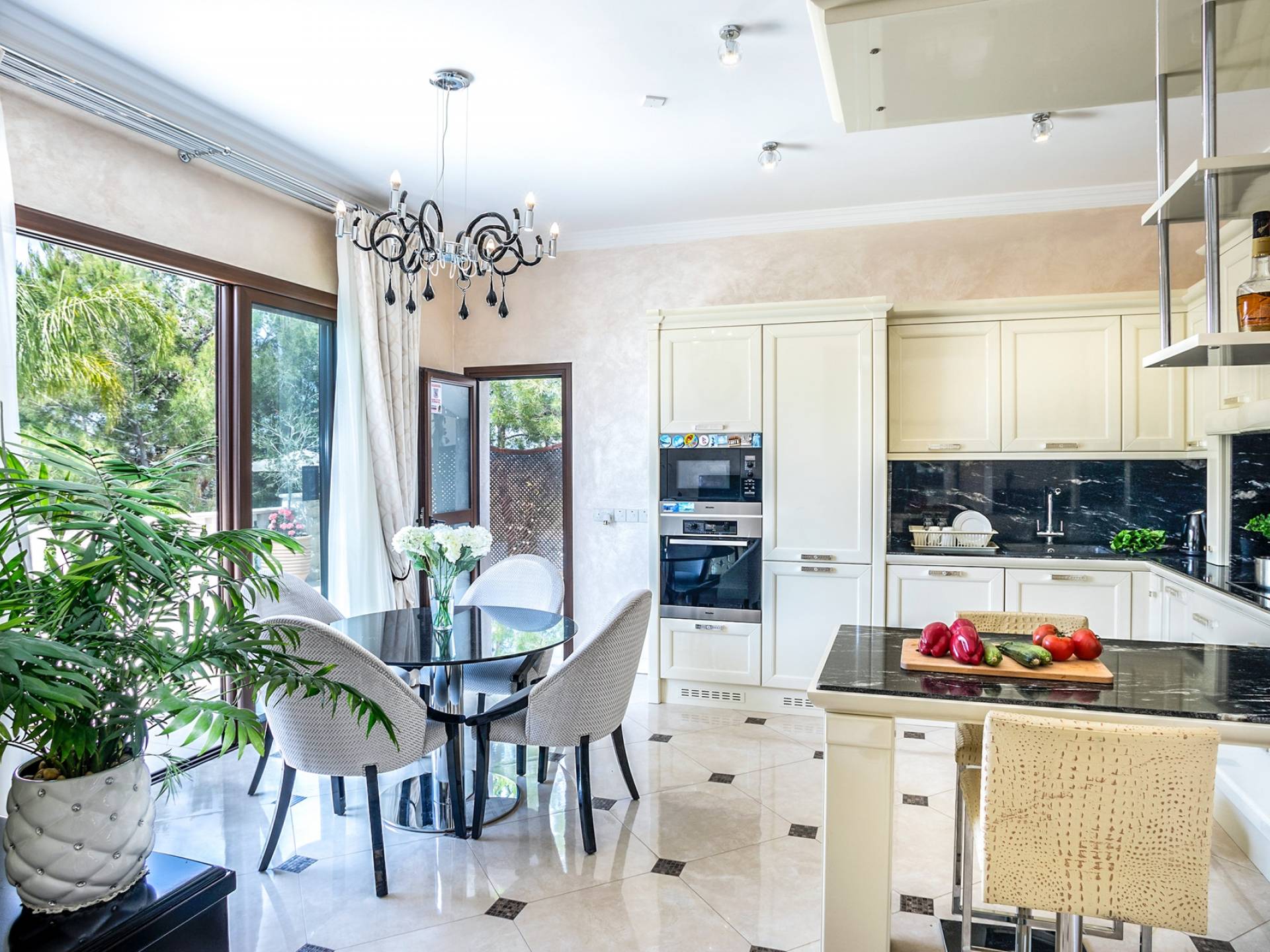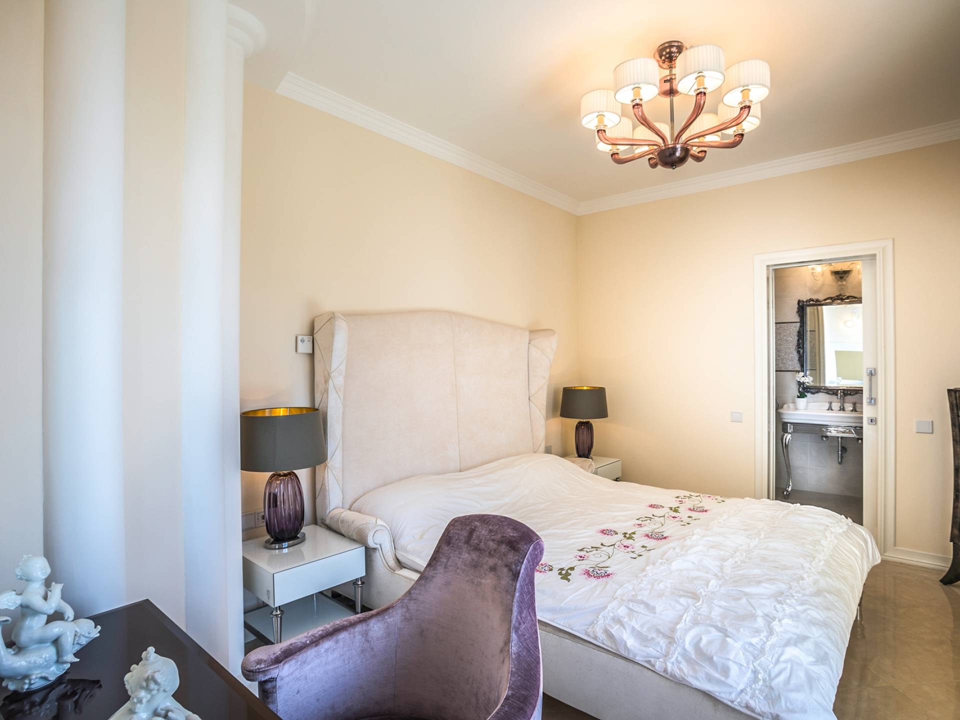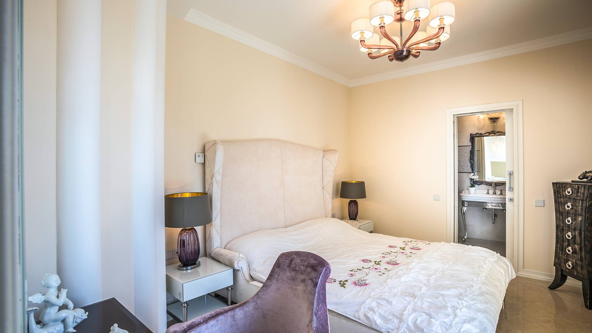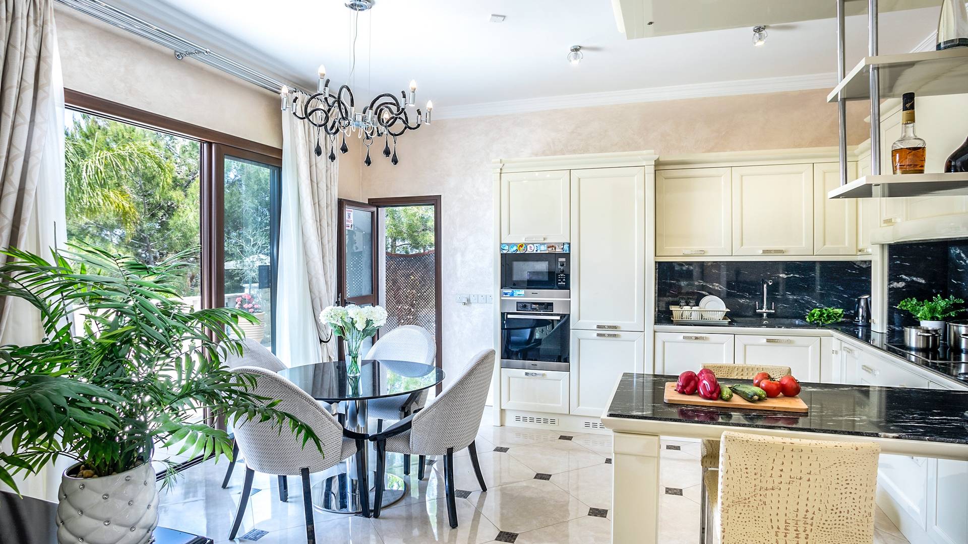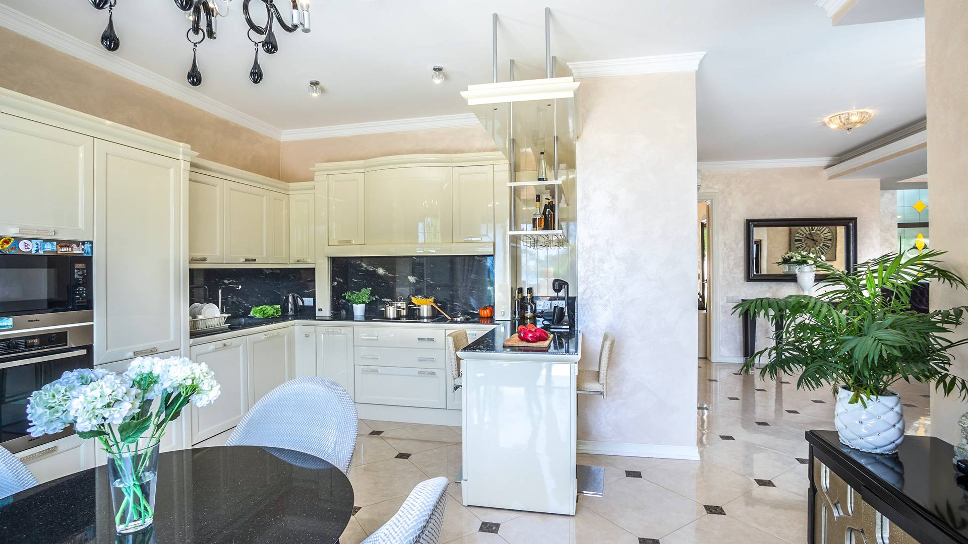Итальянская кухня виллы оснащена высококлассной немецкой посудой, стаканами, столовыми приборами, различной кухонной утварью, винным холодильником, современной кухонной техникой. В спальнях и ванных комнатах виллы всегда новое свежее постельное белье и полотенца высочайшего качества, новейшая сантехника, кондиционеры и полы с подогревом, высокоскоростной WiFi, спутниковое и кабельное телевидение. Вилла оборудована итальянской мебелью марки «Fendi», коллекционными скульптурными композициями KPM (Германия), фарфором и бронзой.