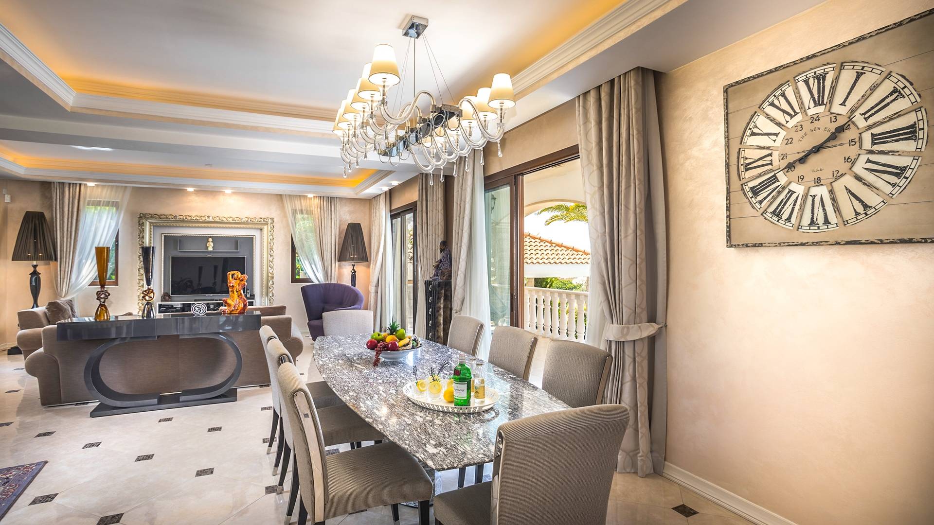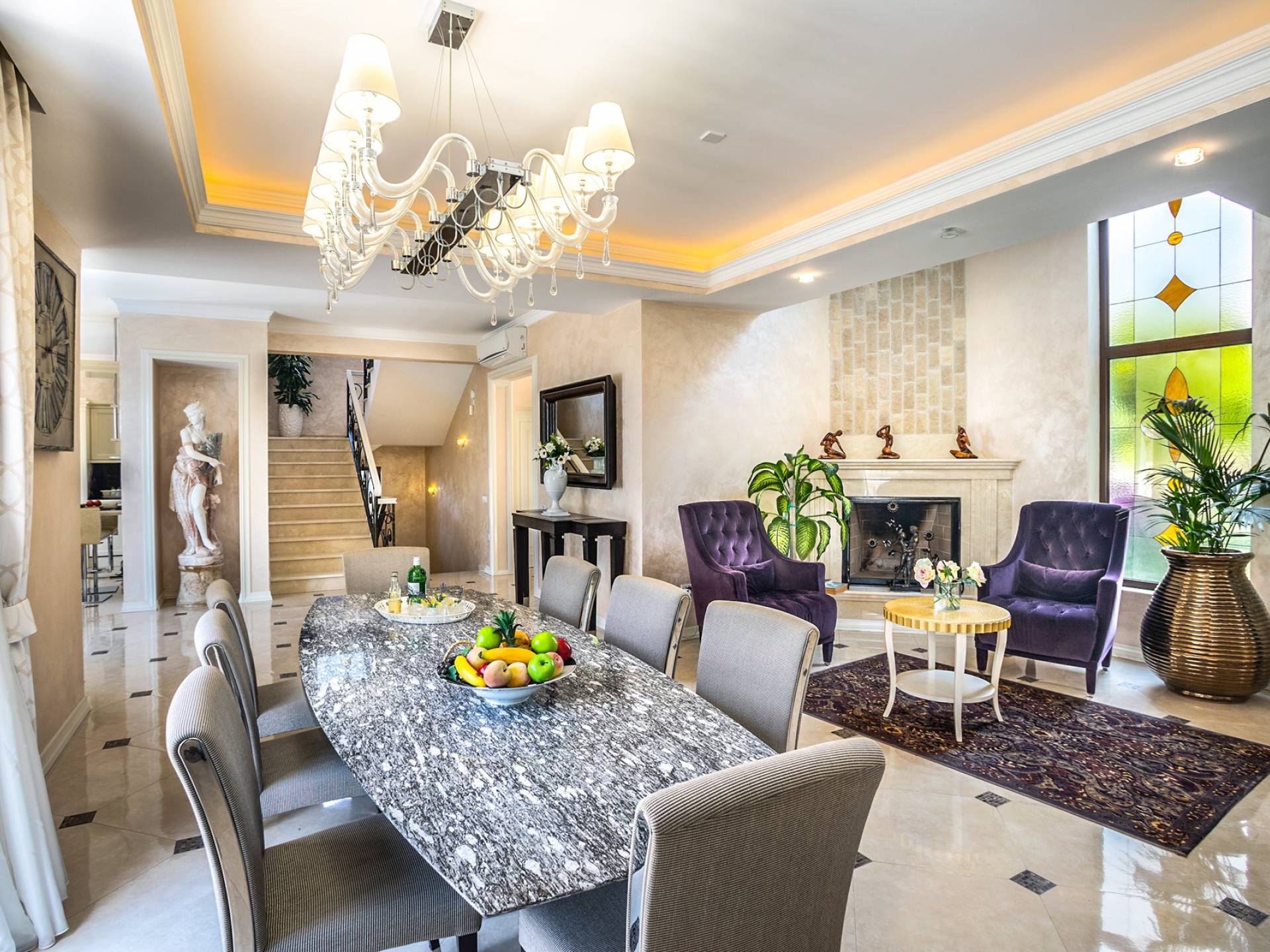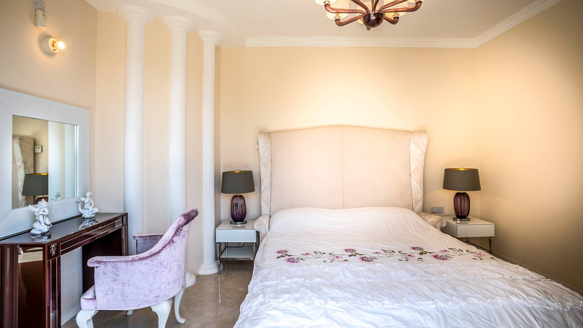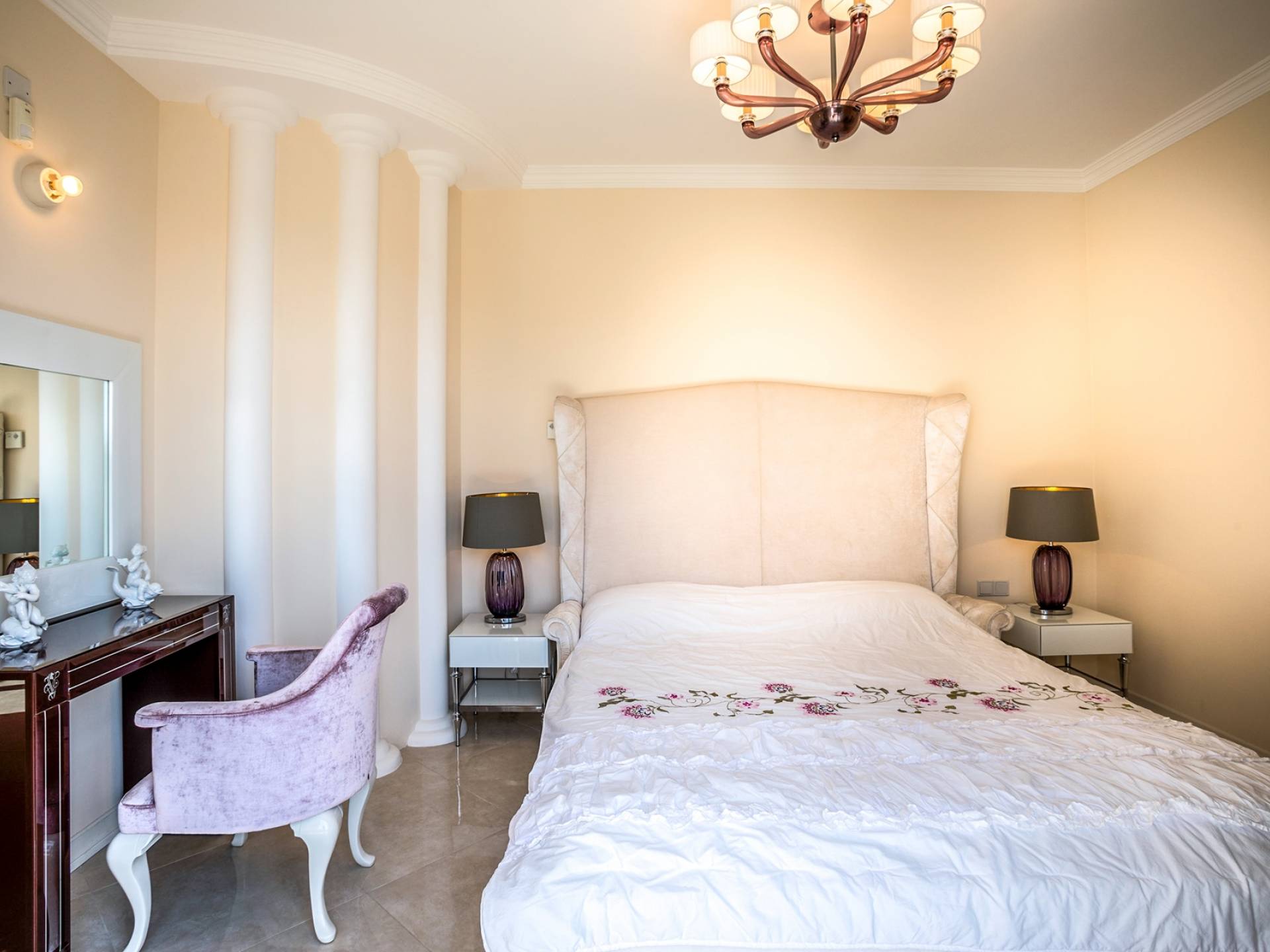 Итальянская кухня виллы оснащена высококлассной немецкой посудой, стаканами, столовыми приборами, различной кухонной утварью, винным холодильником, современной кухонной техникой. В спальнях и ванных комнатах виллы всегда новое свежее постельное белье и полотенца высочайшего качества, новейшая сантехника, кондиционеры и полы с подогревом, высокоскоростной WiFi, спутниковое и кабельное телевидение. Вилла оборудована итальянской мебелью марки «Fendi», коллекционными скульптурными композициями KPM (Германия), фарфором и бронзой.