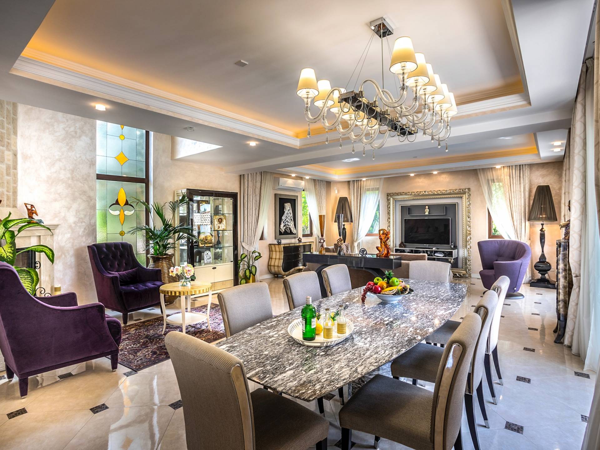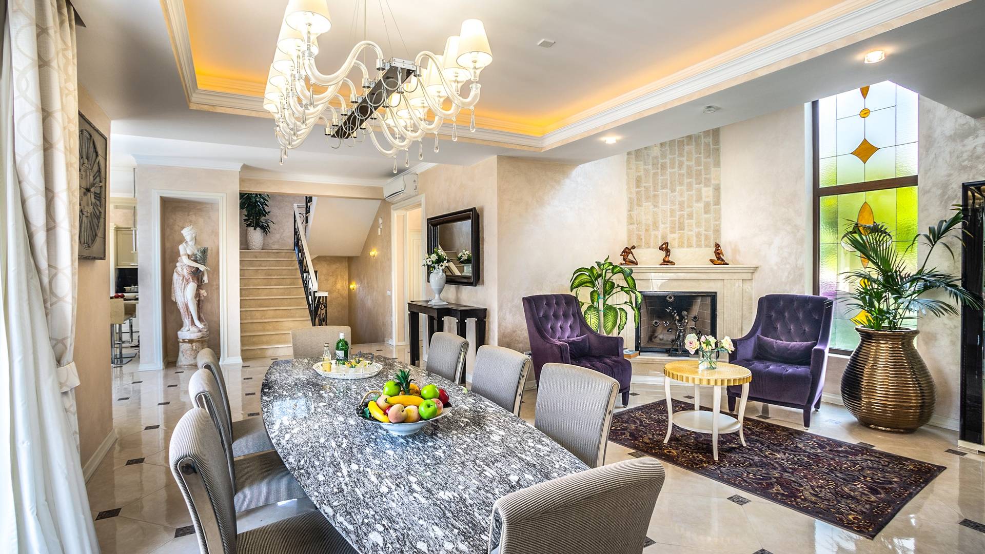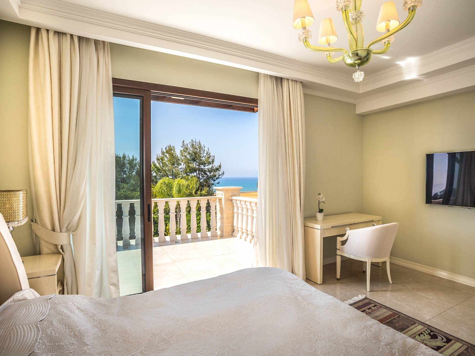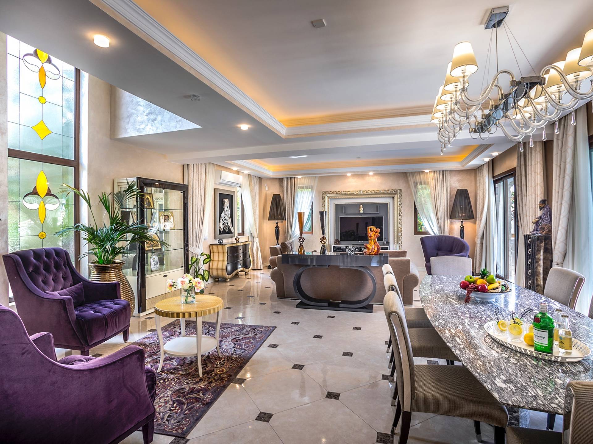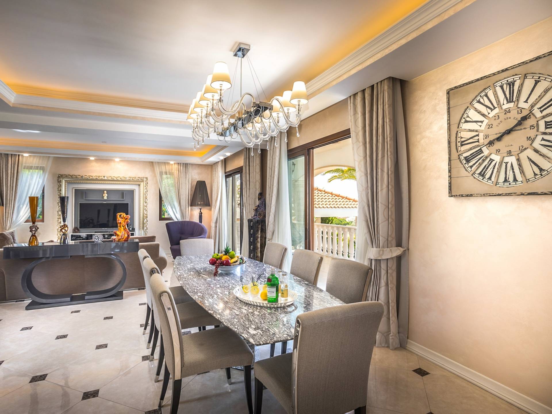 Итальянская кухня виллы оснащена высококлассной немецкой посудой, стаканами, столовыми приборами, различной кухонной утварью, винным холодильником, современной кухонной техникой. В спальнях и ванных комнатах виллы всегда новое свежее постельное белье и полотенца высочайшего качества, новейшая сантехника, кондиционеры и полы с подогревом, высокоскоростной WiFi, спутниковое и кабельное телевидение. Вилла оборудована итальянской мебелью марки «Fendi», коллекционными скульптурными композициями KPM (Германия), фарфором и бронзой.