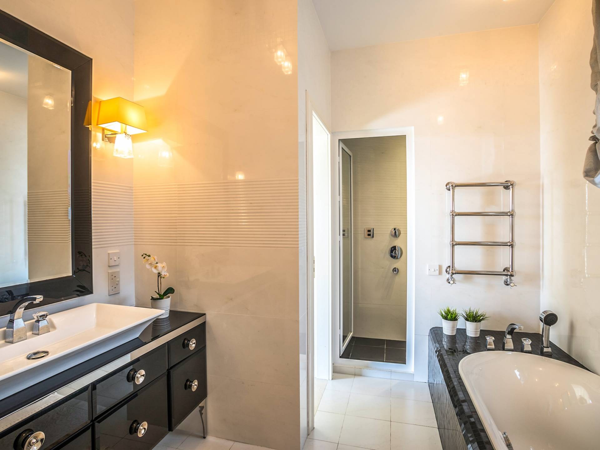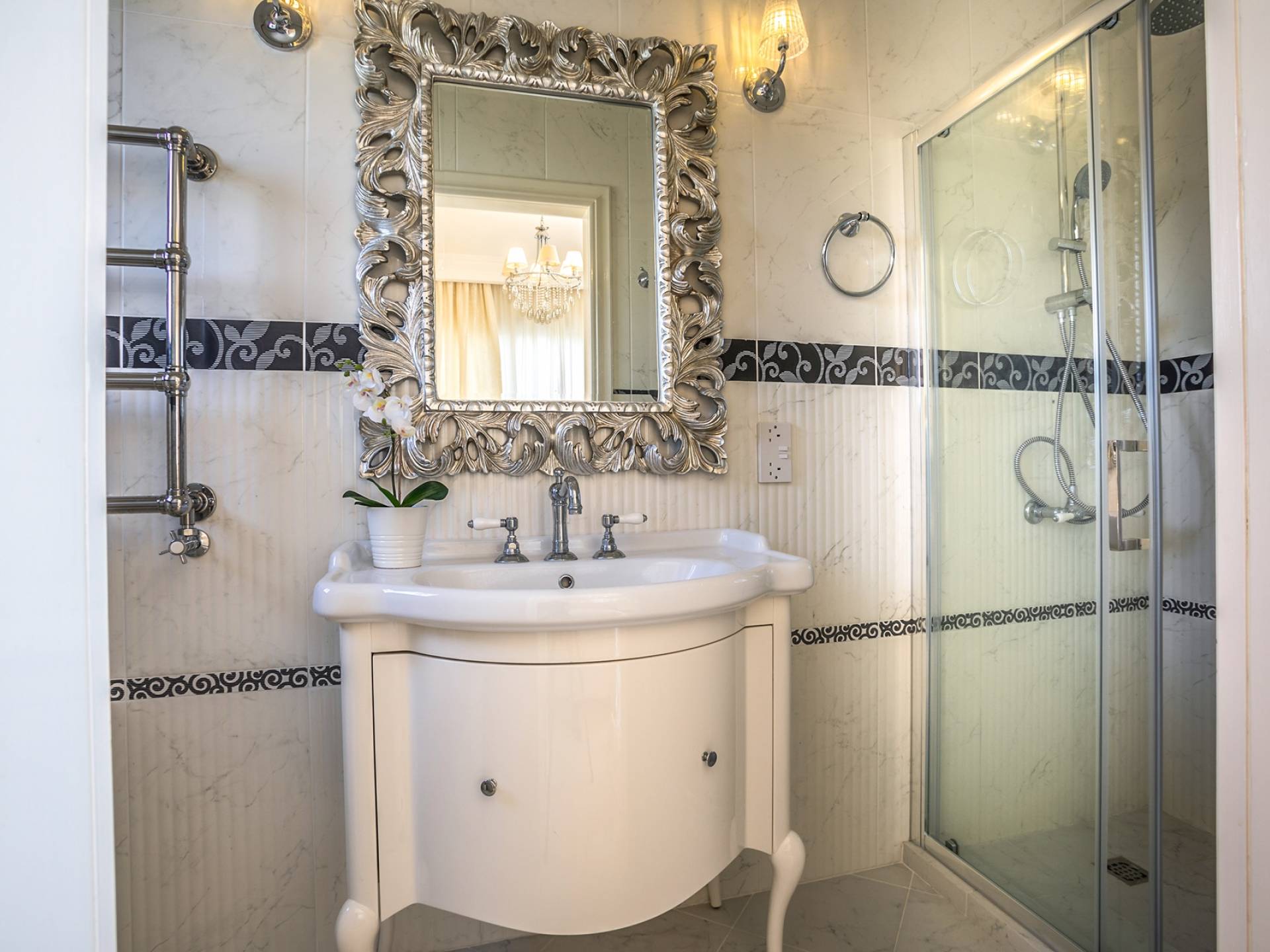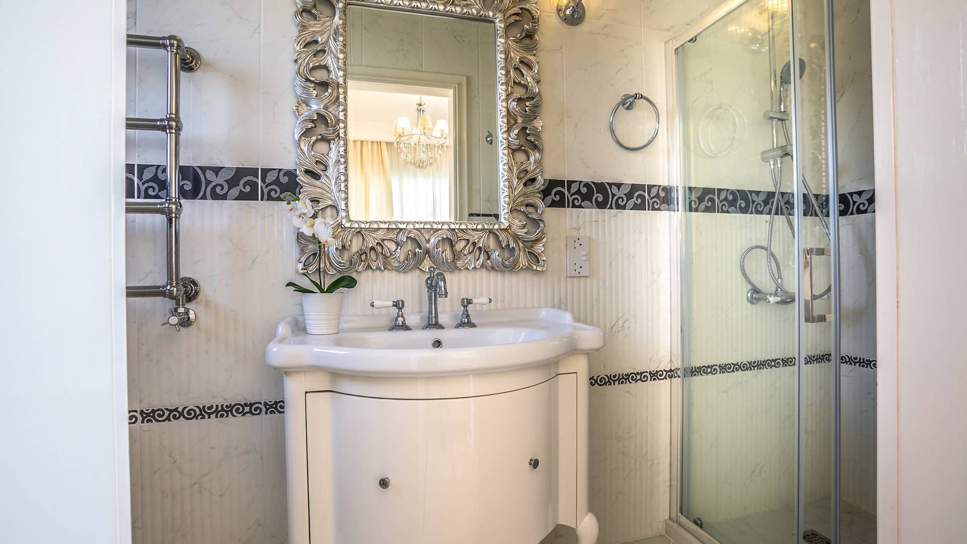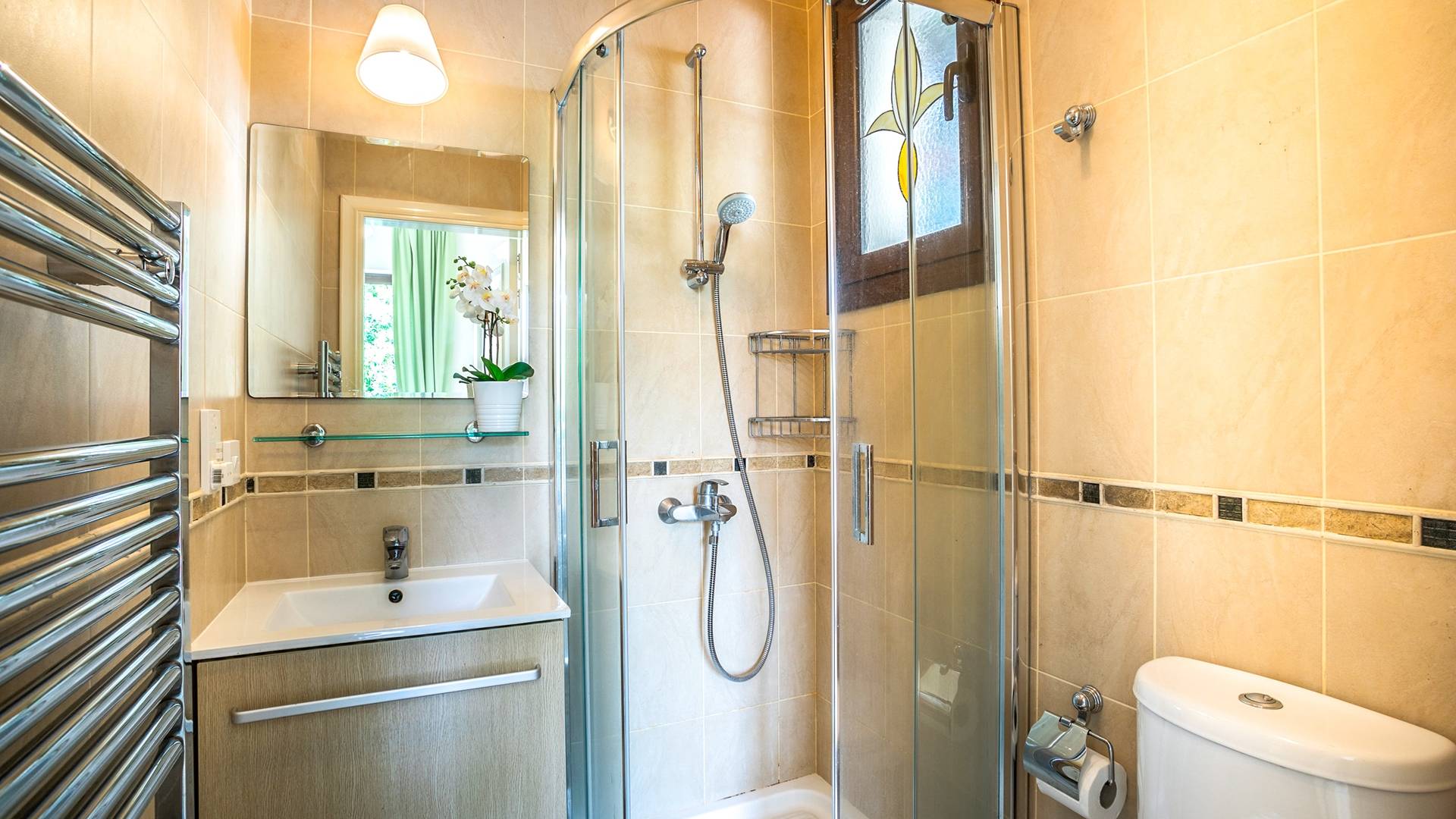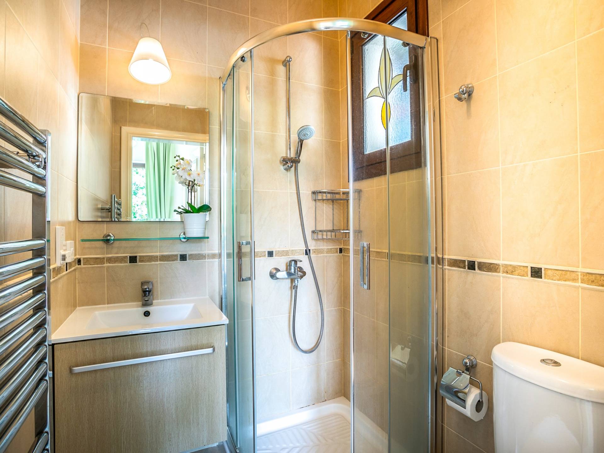 На вилле есть бассейн с подогревом и водяным душем, зонтики и новые удобные шезлонги, окруженные садами.