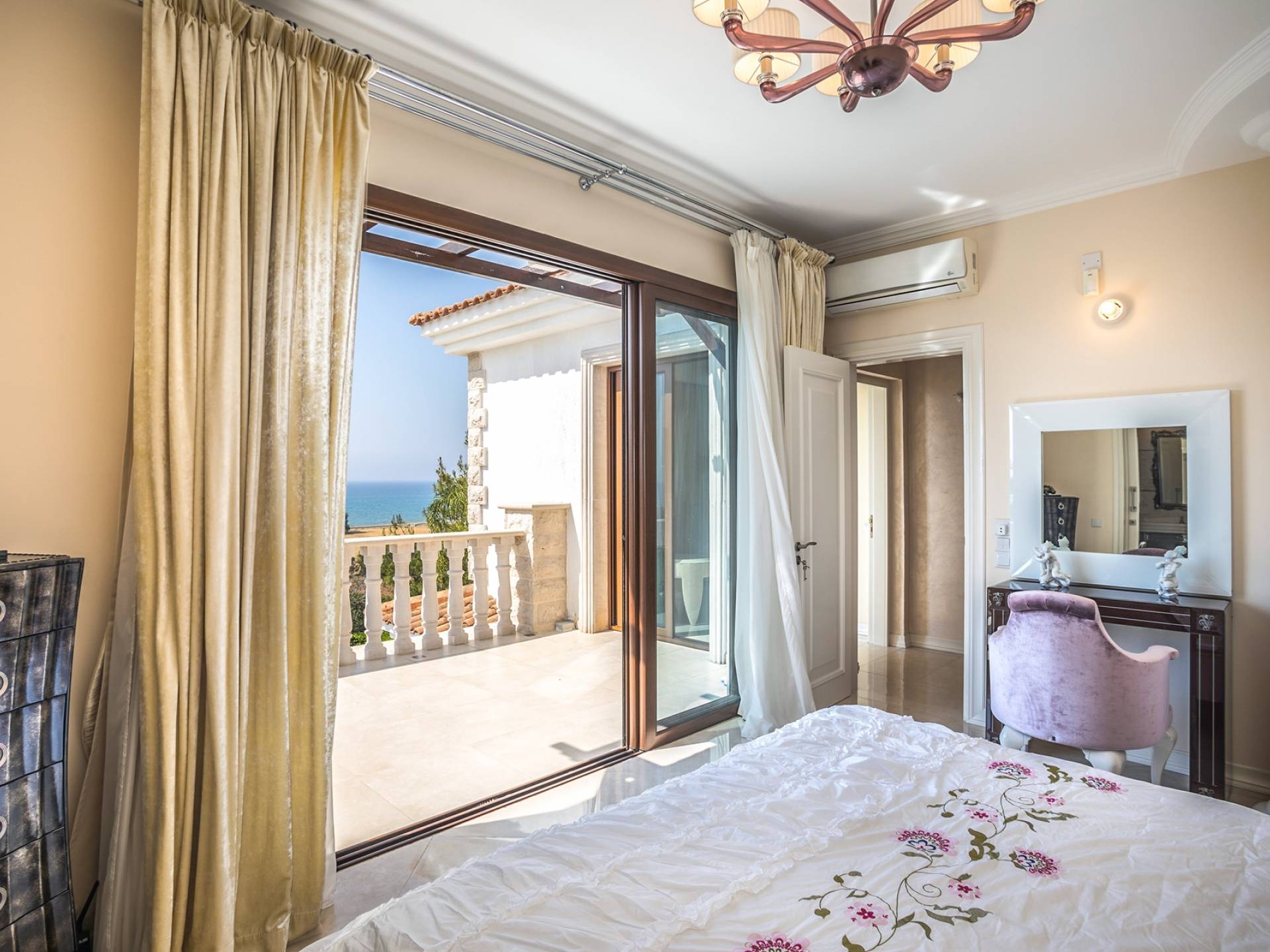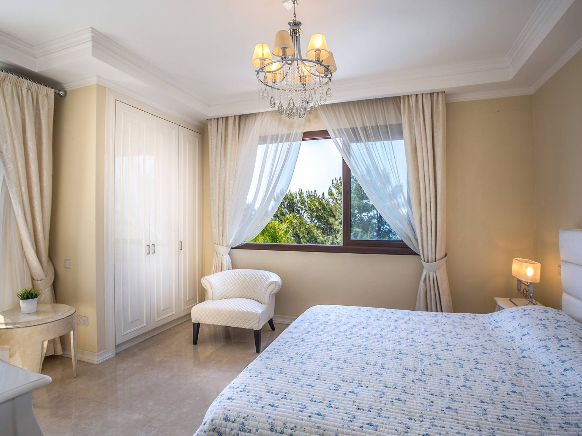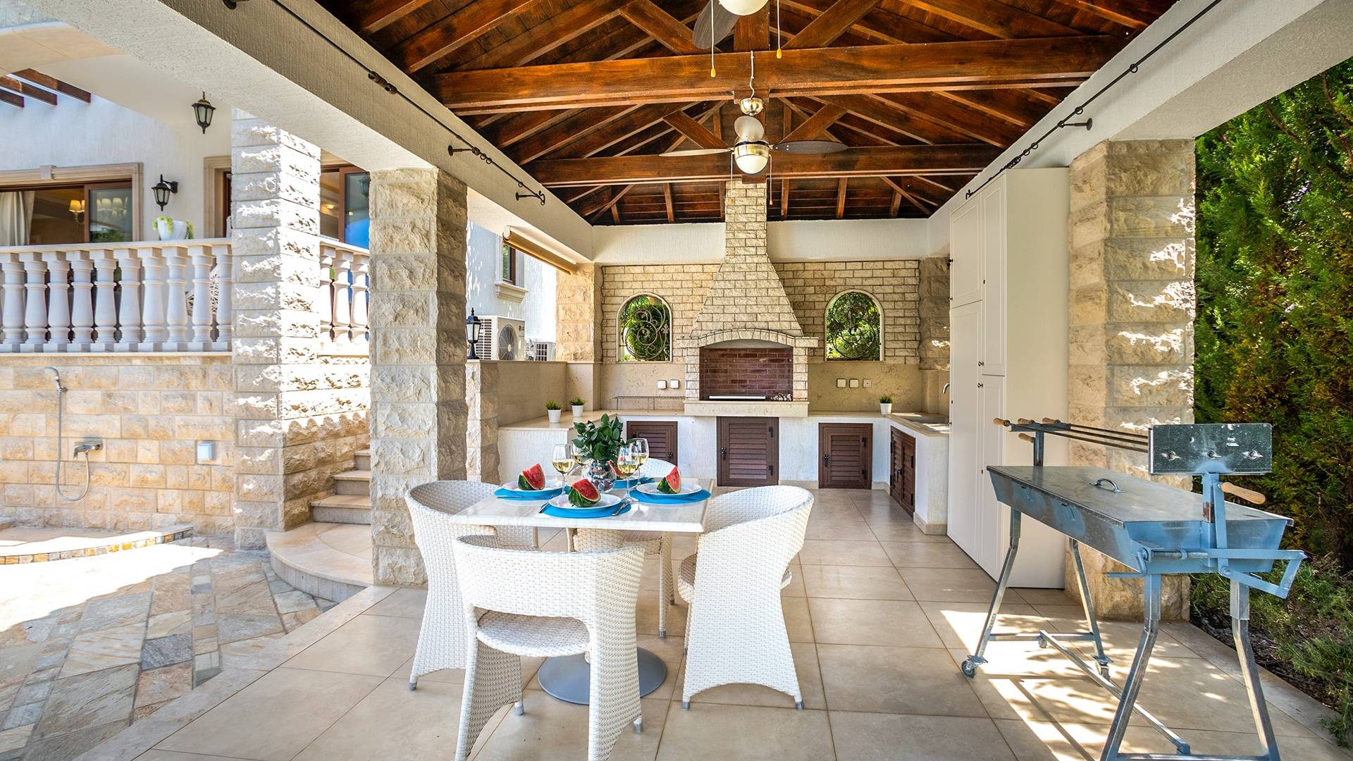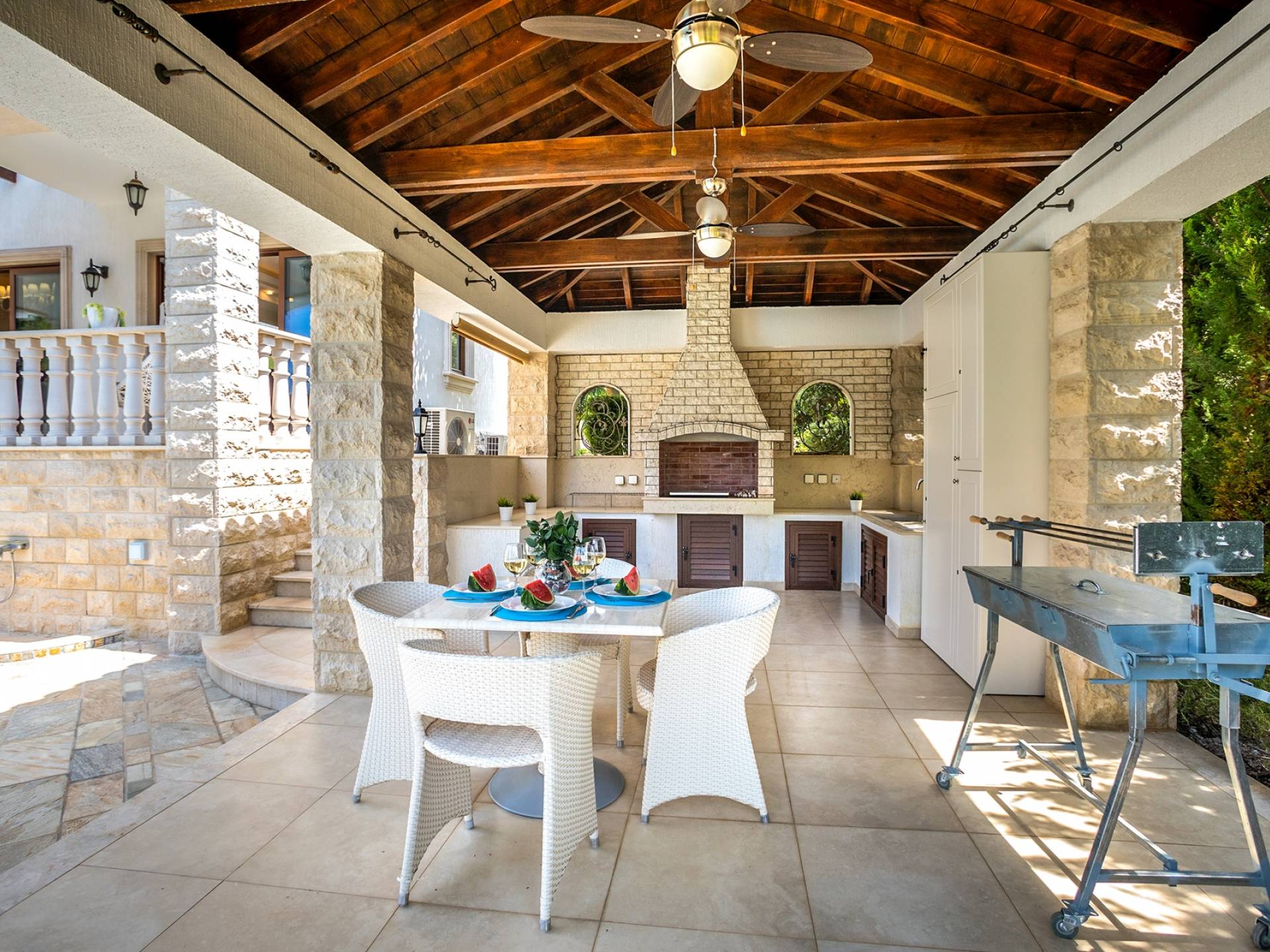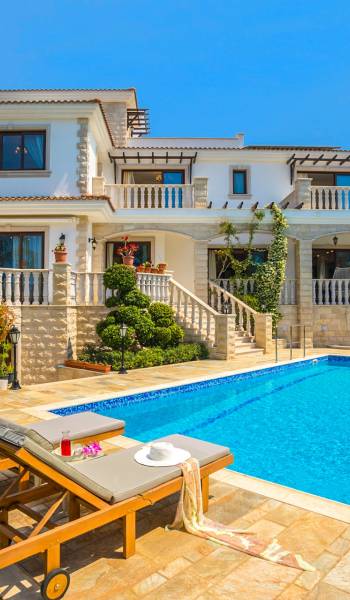 Вилла Evangelia Argaka включает в себя 5 спален, две кухни, 6 санузлов, санузел, биде, душевые, сауну, смотровую площадку на 3 этаже - расположена на территории 2500 м2 с крытой открытой верандой «для барбекю» на 14 мест со своей кухней, холодильником и мангалом. На нижнем уровне виллы расположена нижняя палуба с уютными укромными уголками рядом с водопадом, мостиком, прудом с золотыми рыбками и собственным выходом к морю.