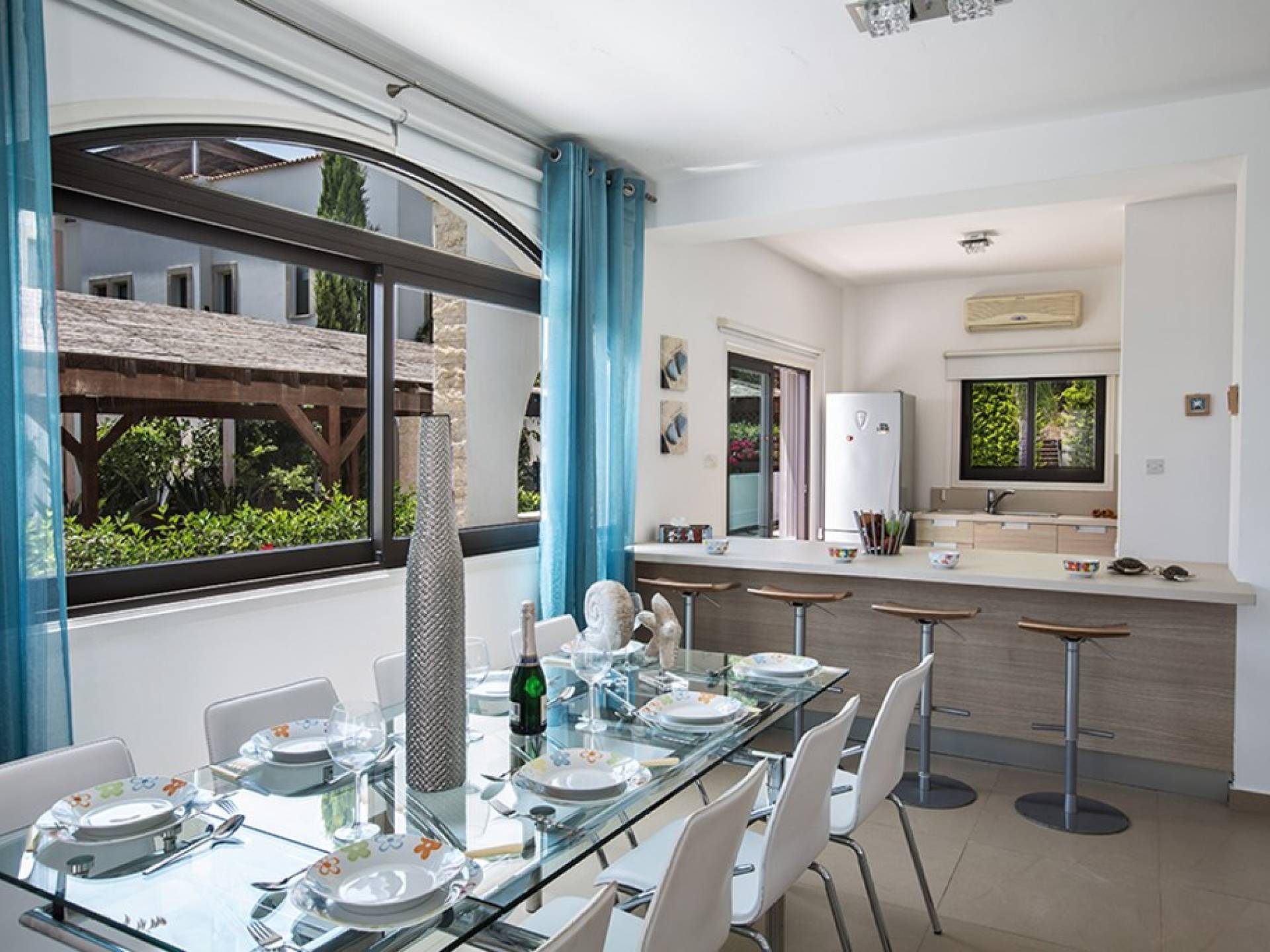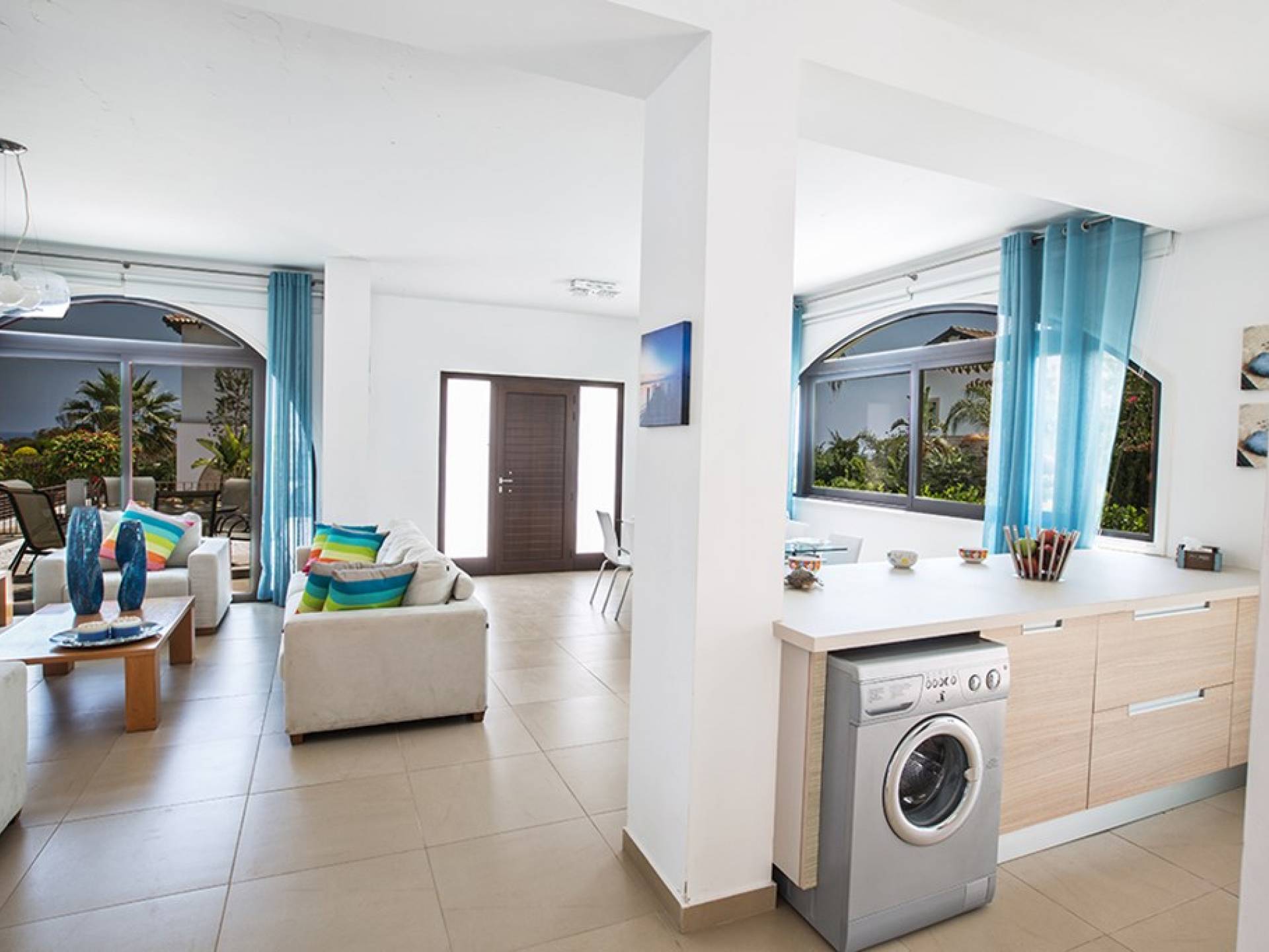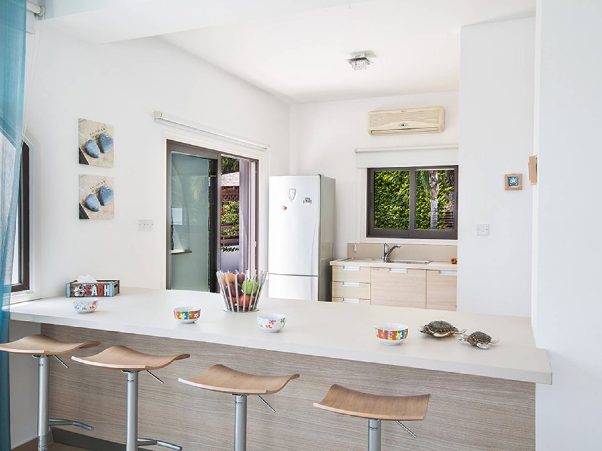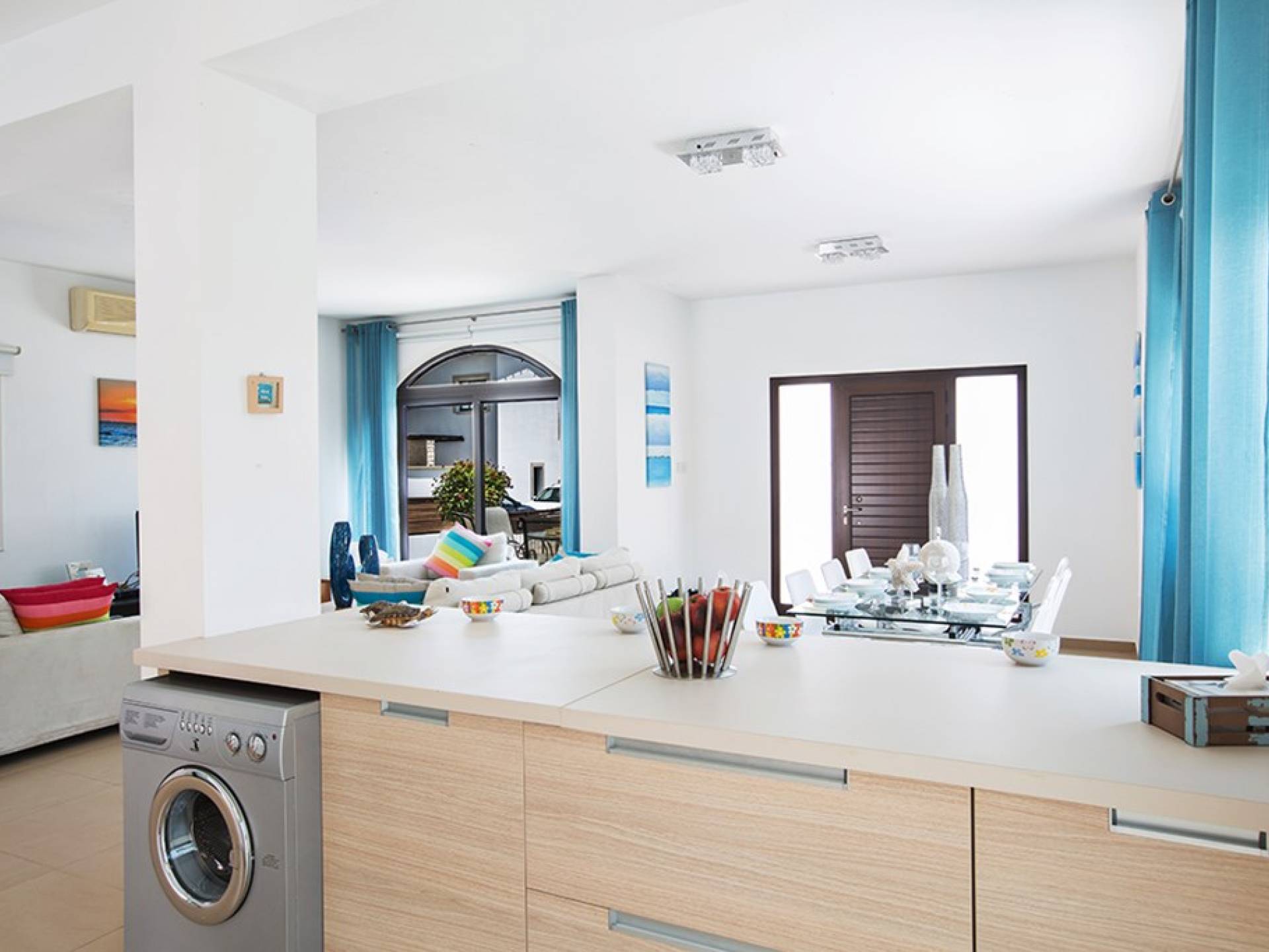 На нижнем этаже виллы есть гостиная и кухня открытой планировки с креслами для 8 человек. На кухне есть все необходимое для комфортного самостоятельного проживания. Дверь из кухни ведет к бассейну и в сад. На этом же этаже есть туалет.