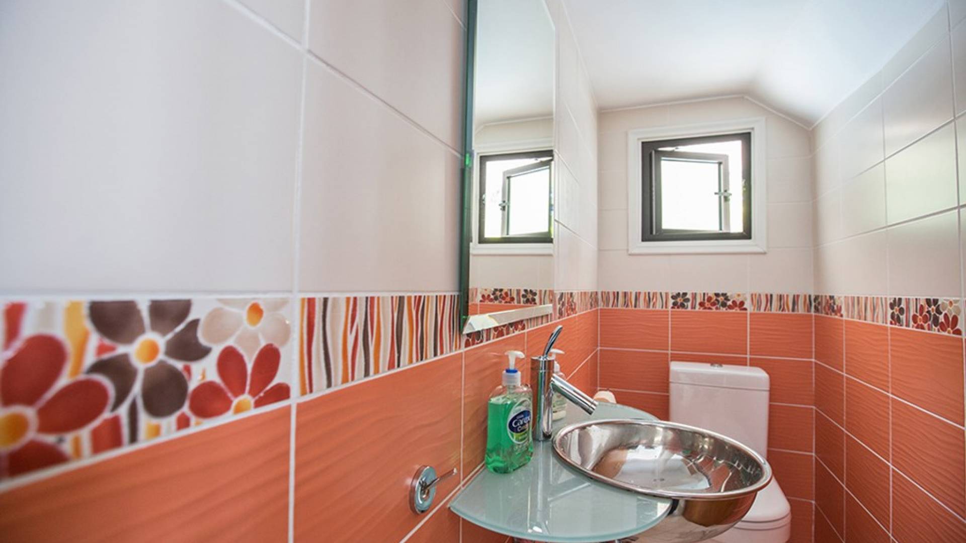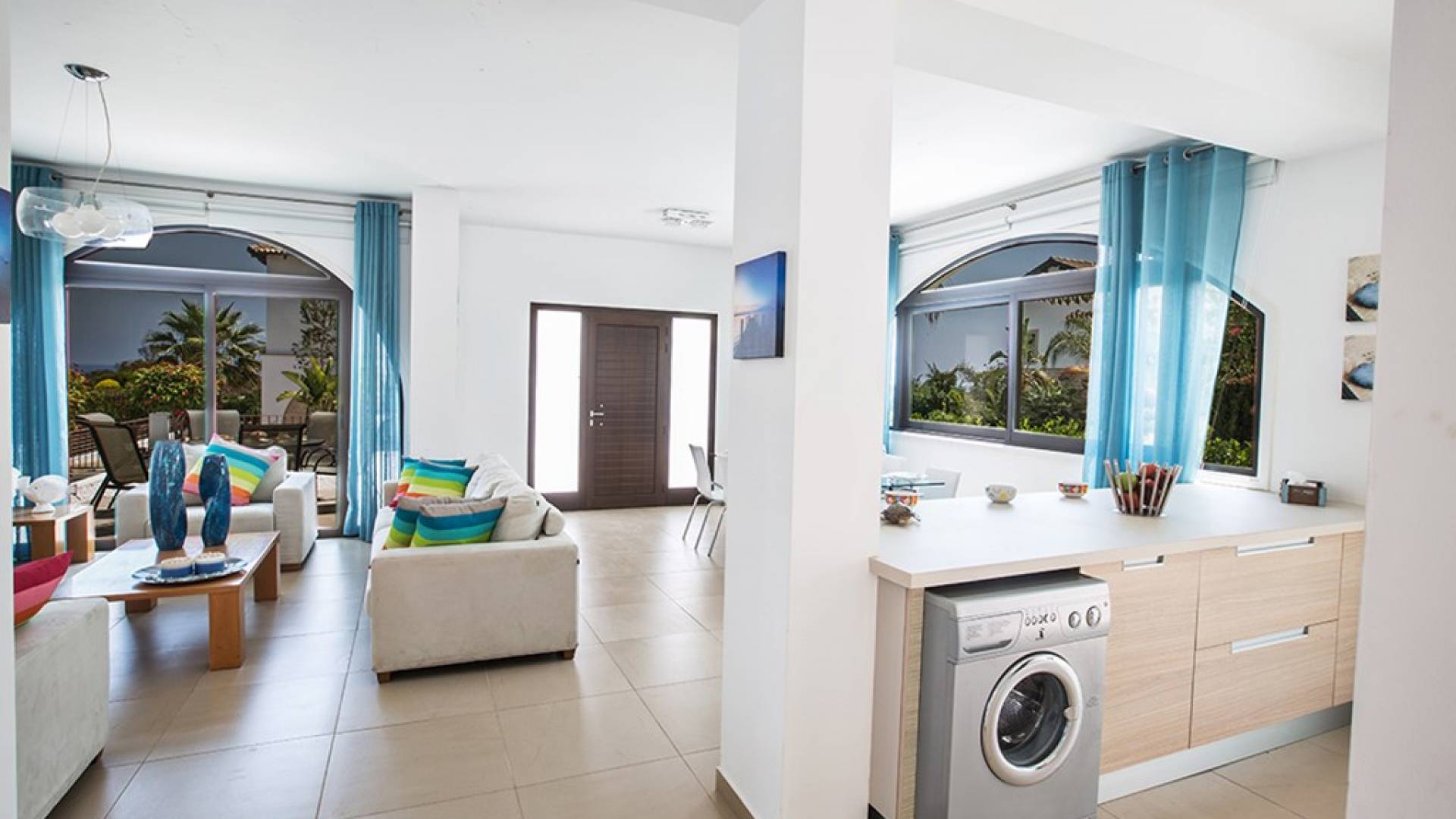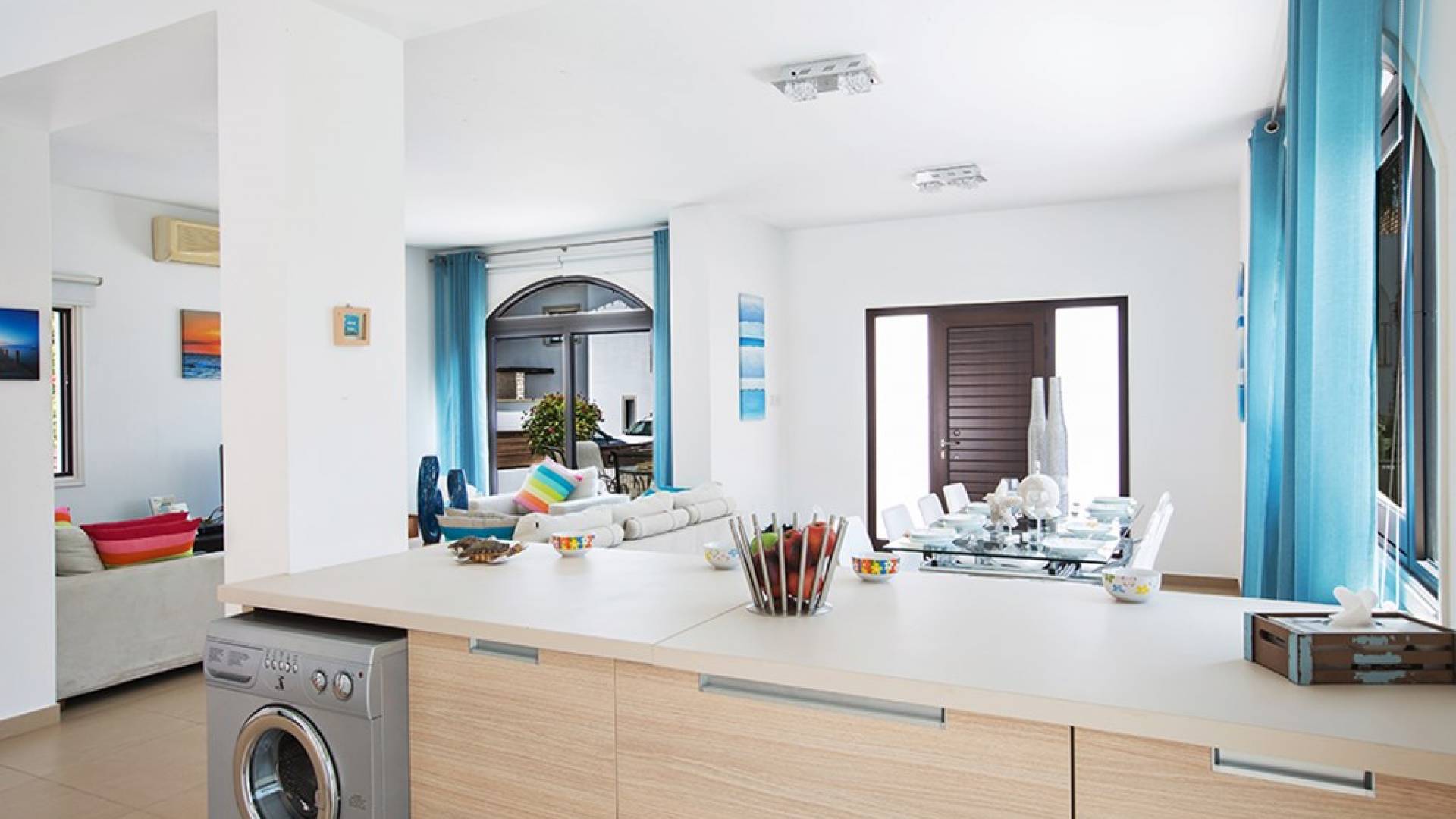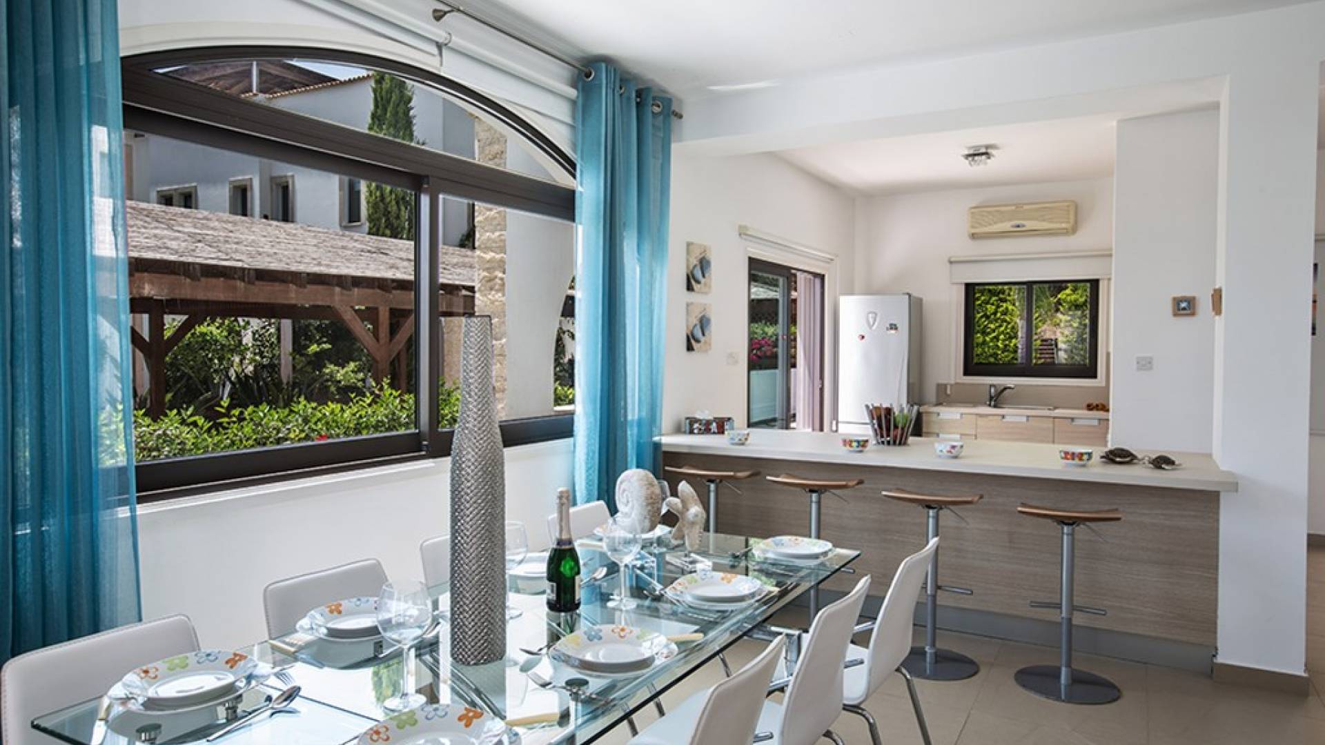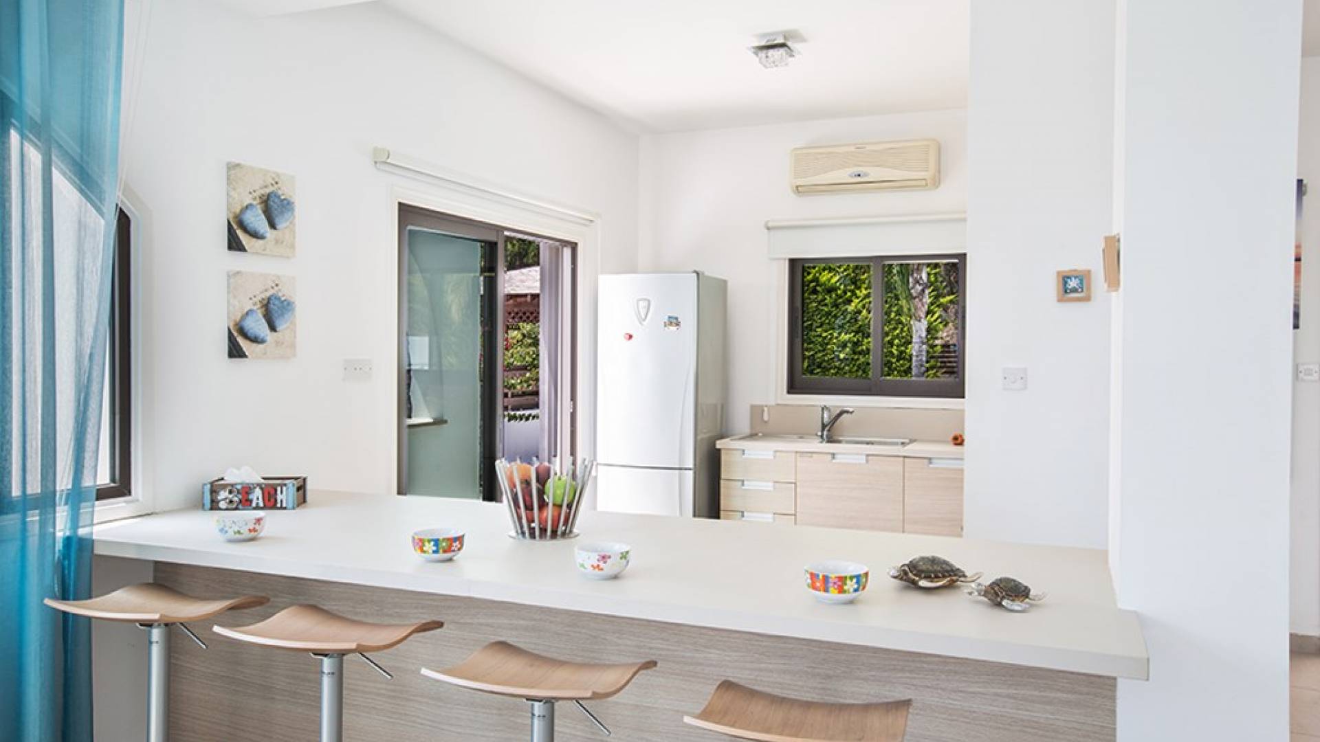 На нижнем этаже виллы есть гостиная и кухня открытой планировки с креслами для 8 человек. На кухне есть все необходимое для комфортного самостоятельного проживания. Дверь из кухни ведет к бассейну и в сад. На этом же этаже есть туалет.