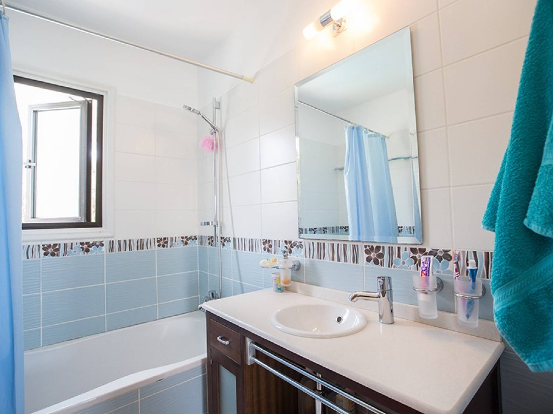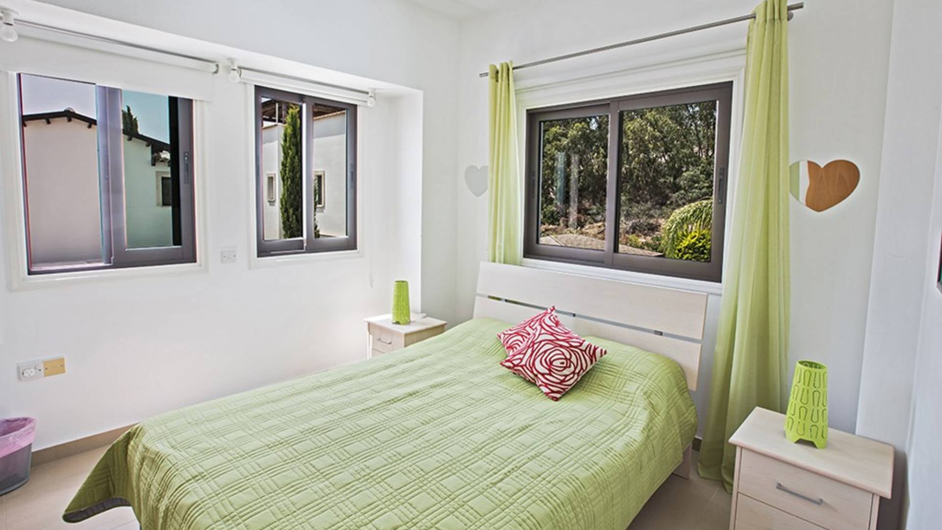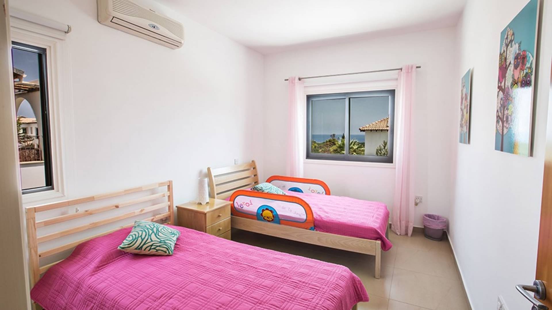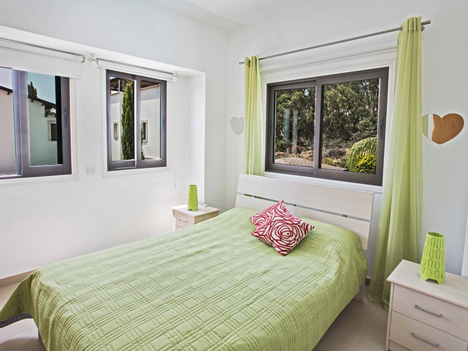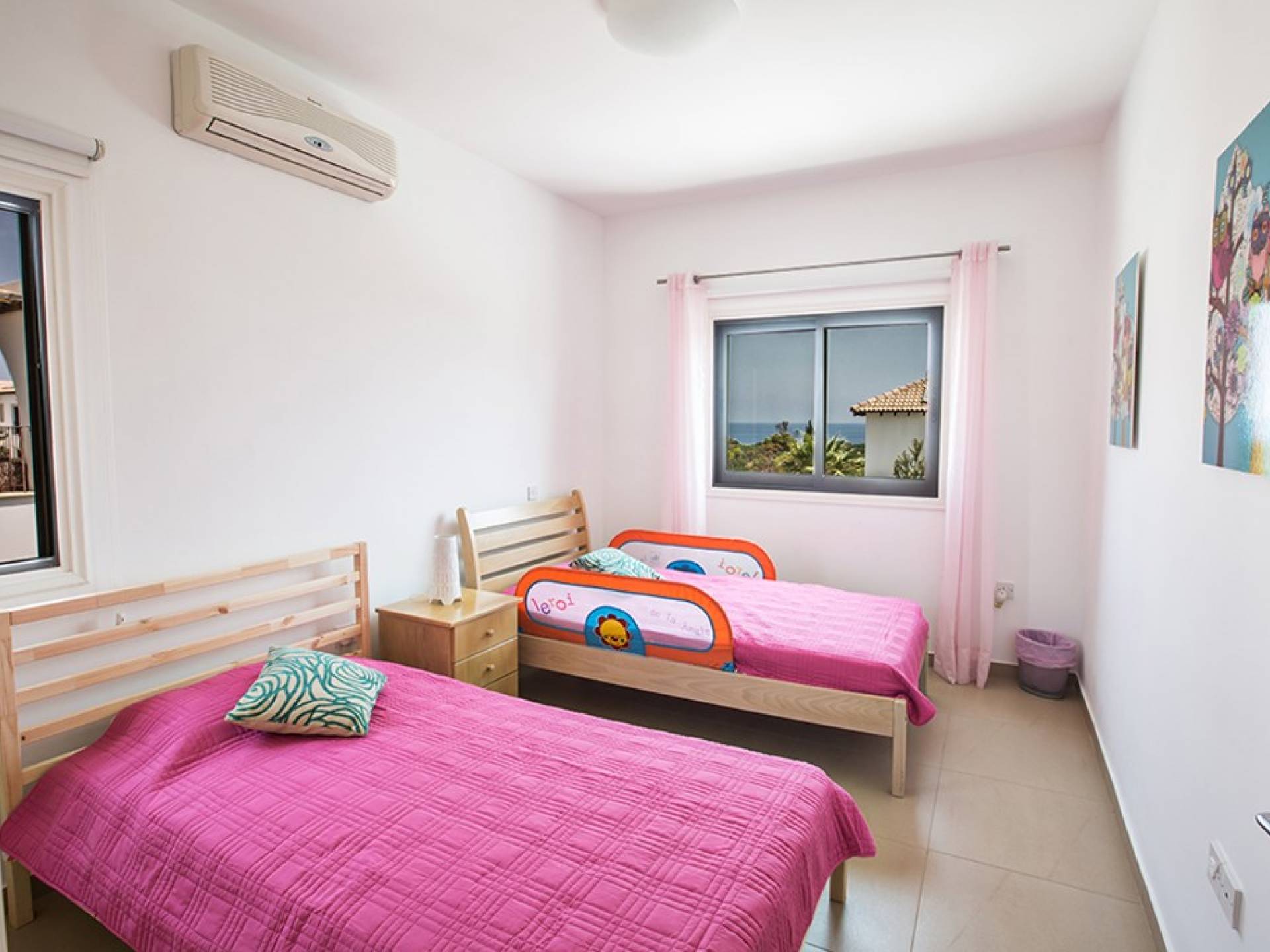 На втором этаже виллы расположены 2 спальни с двуспальными кроватями и спальня с 2 односпальными кроватями. В семейной ванной комнате установлена ванна с верхним душем.