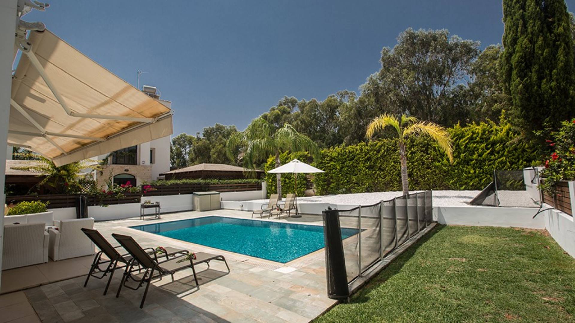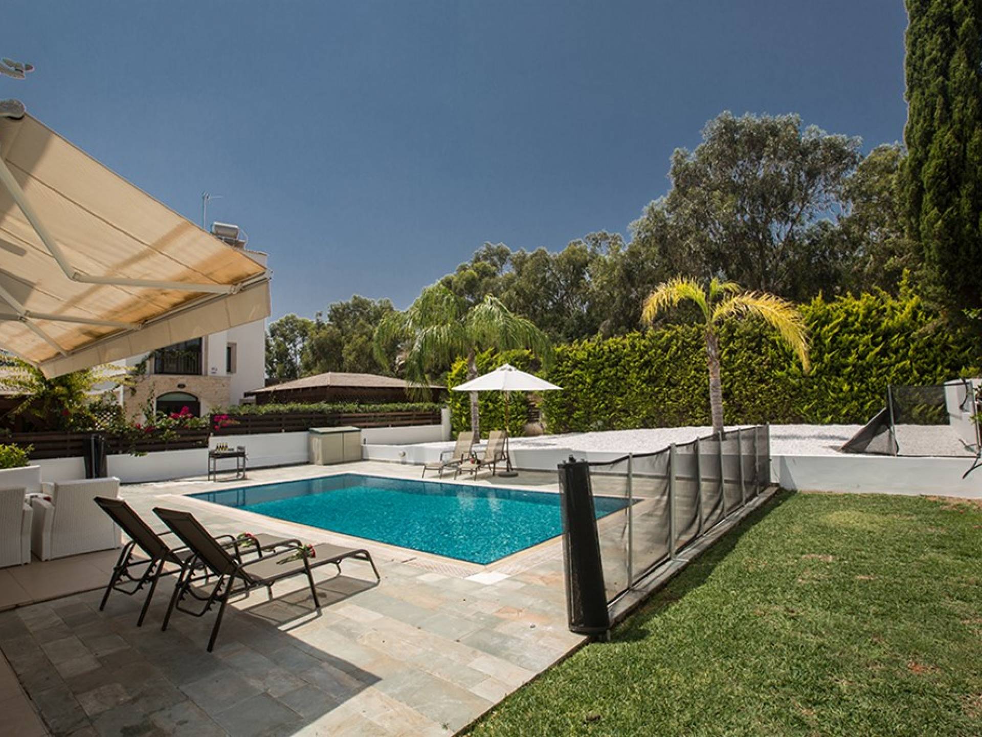 Снаружи на вилле есть большой частный бассейн и просторный сад с шезлонгами и садовой мебелью, который идеально подходит для обедов на открытом воздухе летом. На вилле имеется защитная сетка для бассейна.