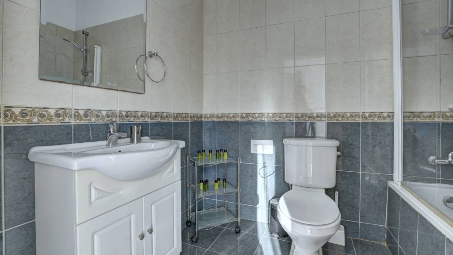 Наверху на вилле есть 3 спальни, одна спальня с двуспальной кроватью и 2 спальни с двумя односпальными кроватями, все со встроенными шкафами и тумбочками. Также имеется семейная ванная комната с ванной и душем.