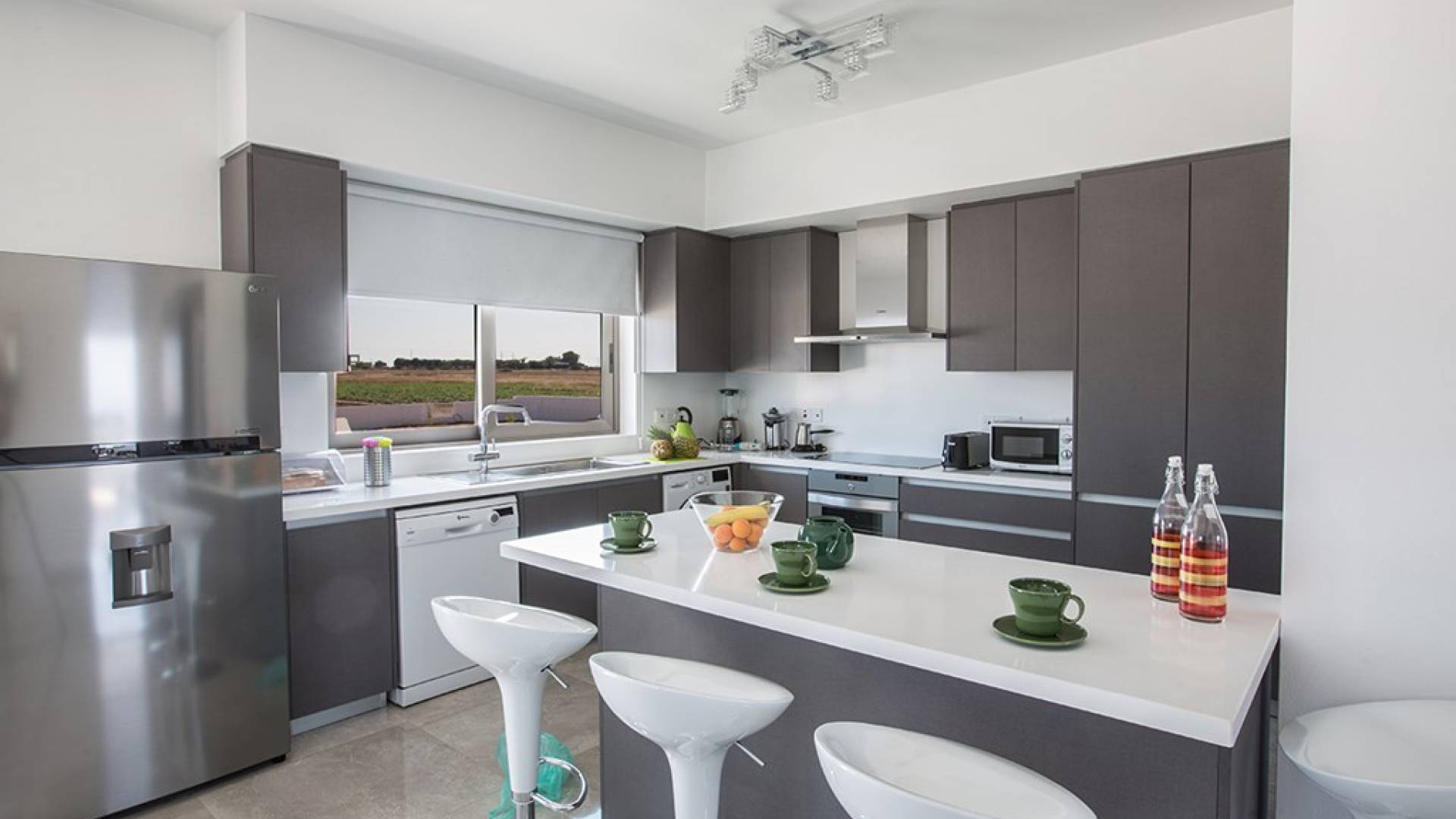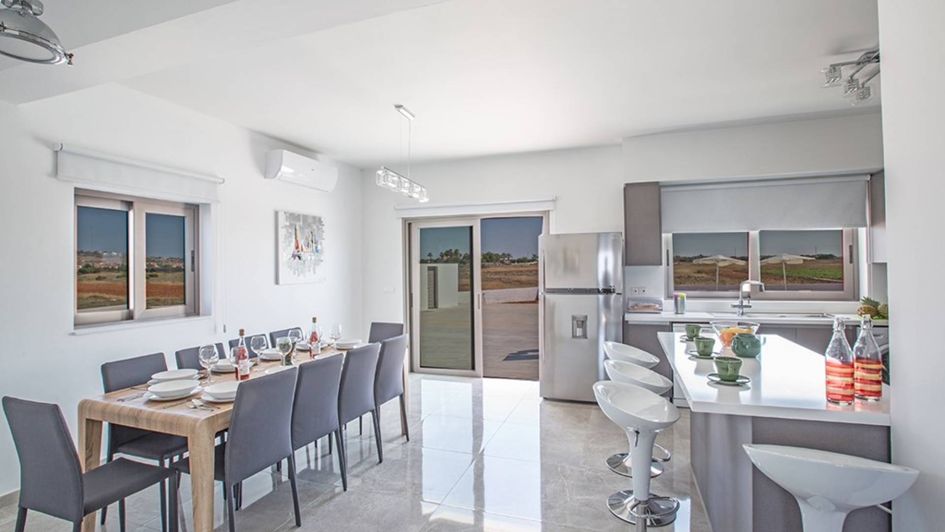 Когда вы войдете на виллу, вы увидите кухню и столовую. Современная кухня полностью оборудована всем необходимым для комфортного проживания с самообслуживанием, а также островом с дополнительными креслами для 4 гостей. Обеденная зона рассчитана на 8 человек.