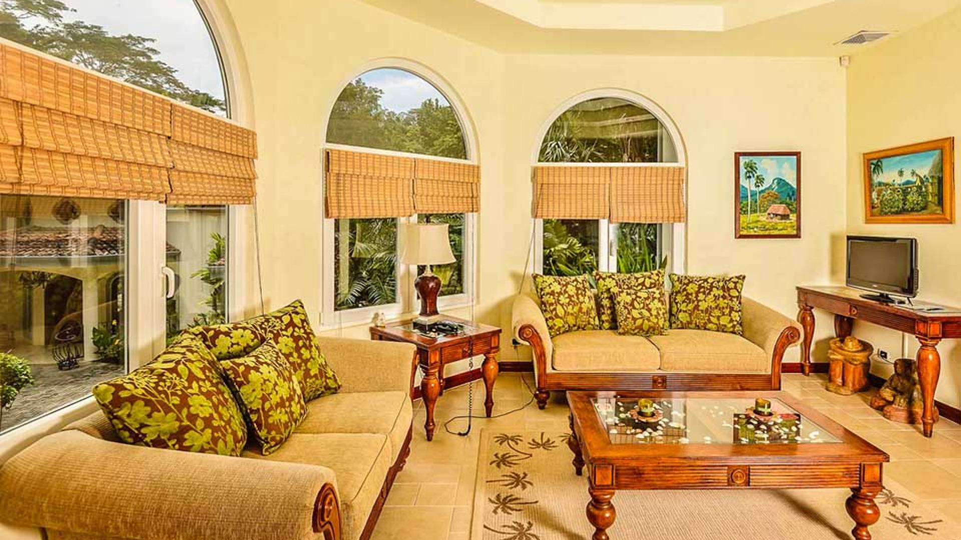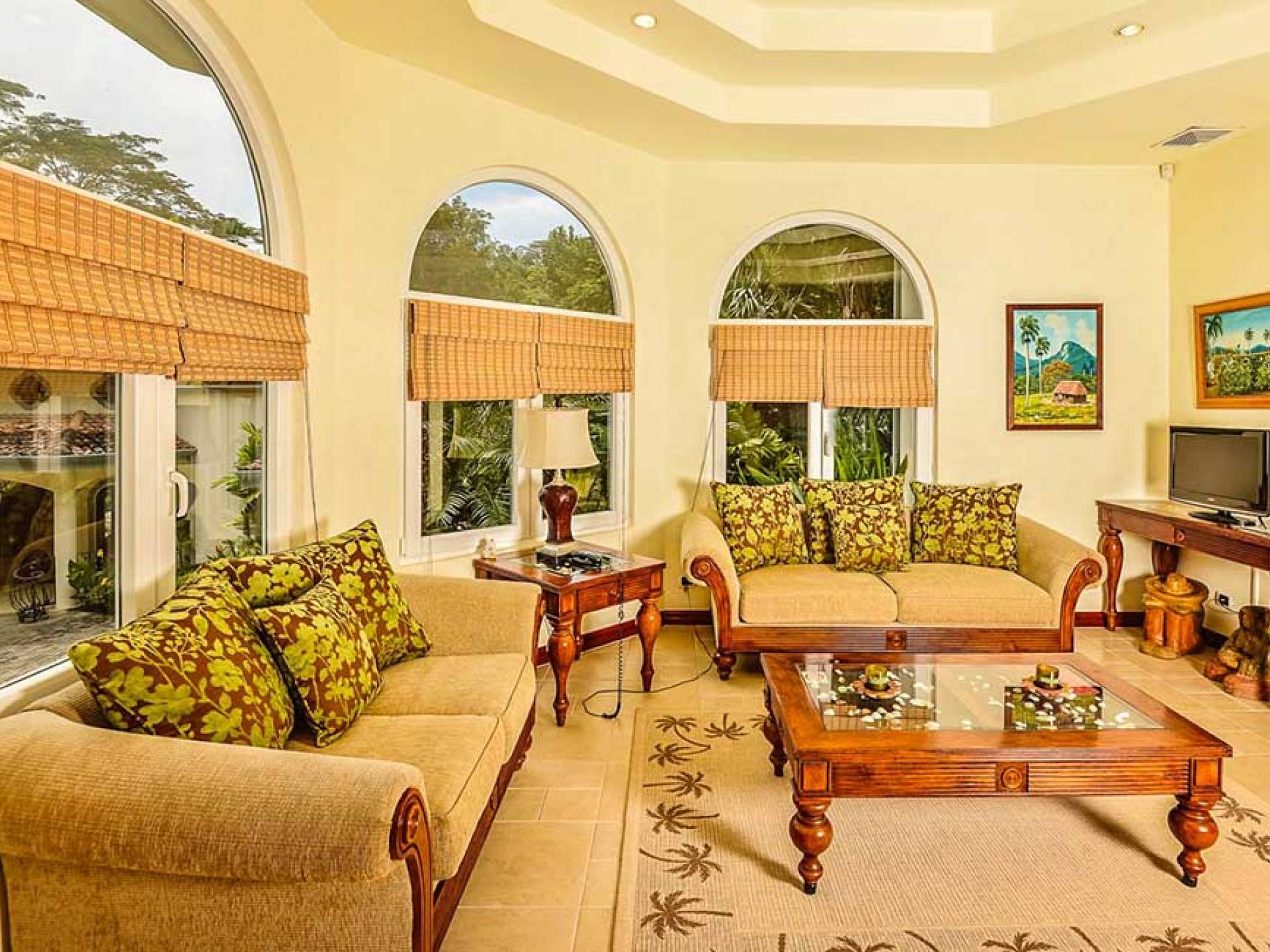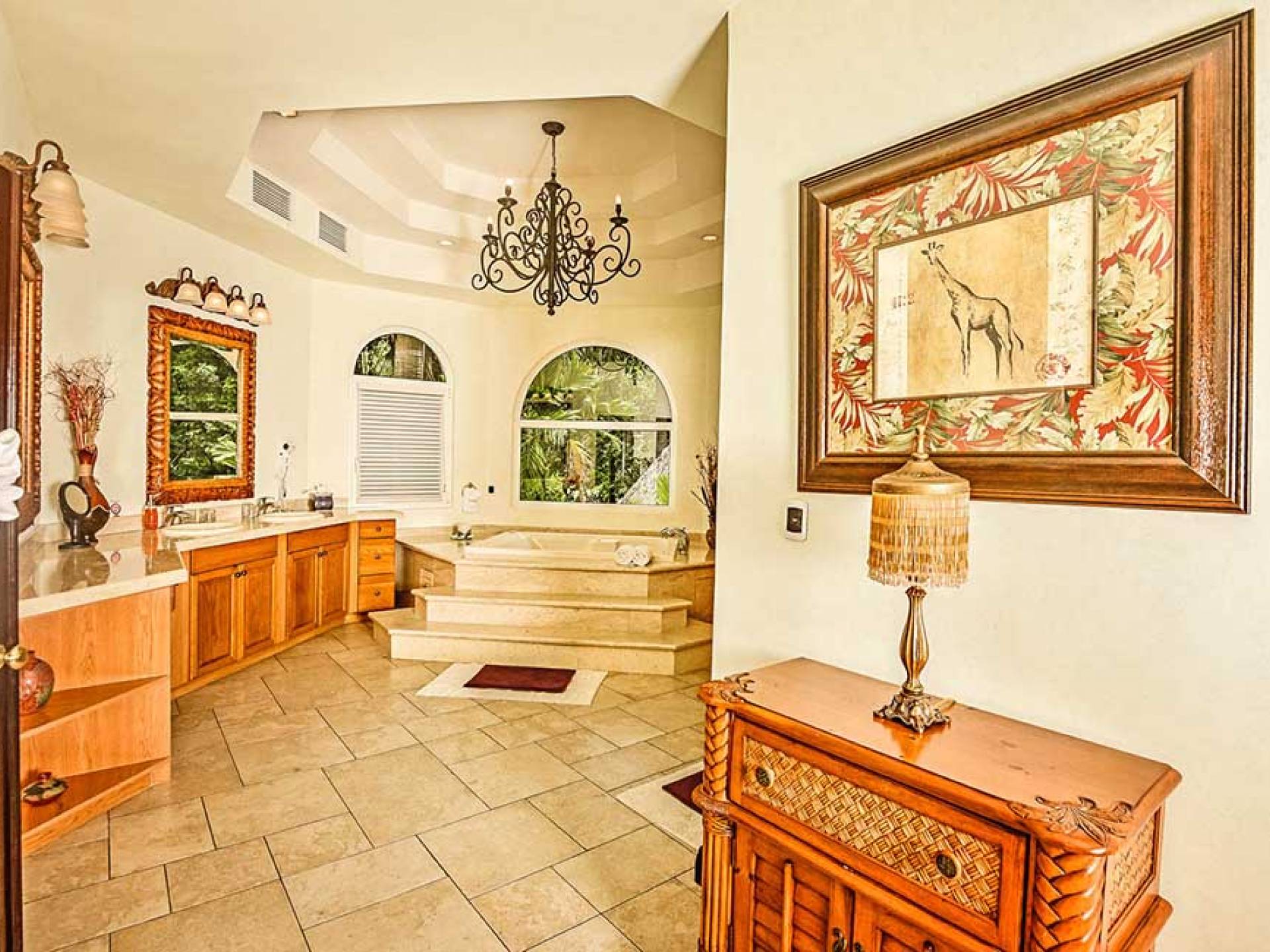 Harmon Estate был разработан для семей и корпоративных клиентов, которым нужен тихий, элегантный дом с безмятежной обстановкой. Это 5000 кв. Футов. усадьба заполнена импортным мрамором, гранитом и плиткой ручной работы, а также деревом резчика. Шесть спален. Главная спальня занимает весь верхний этаж и включает в себя гардеробную, кабинет, джакузи и биде. Две дополнительные спальни люкс с отдельными ванными комнатами и телевизорами. Небольшой квартал с полноценной кроватью, личным санузлом и телевизором. Плюс два гостевых домика площадью 800 кв. Футов с кухней и гостиной.