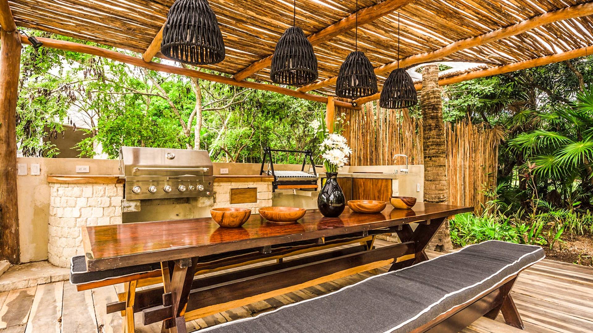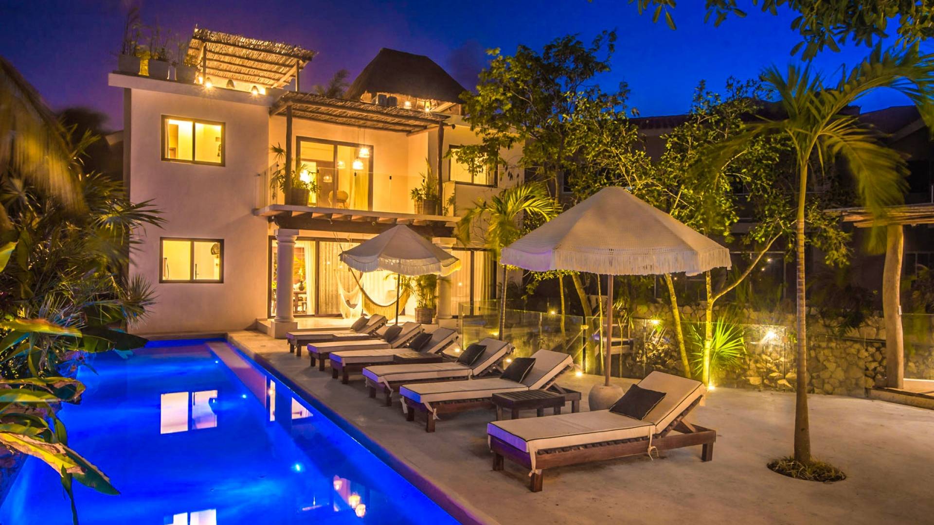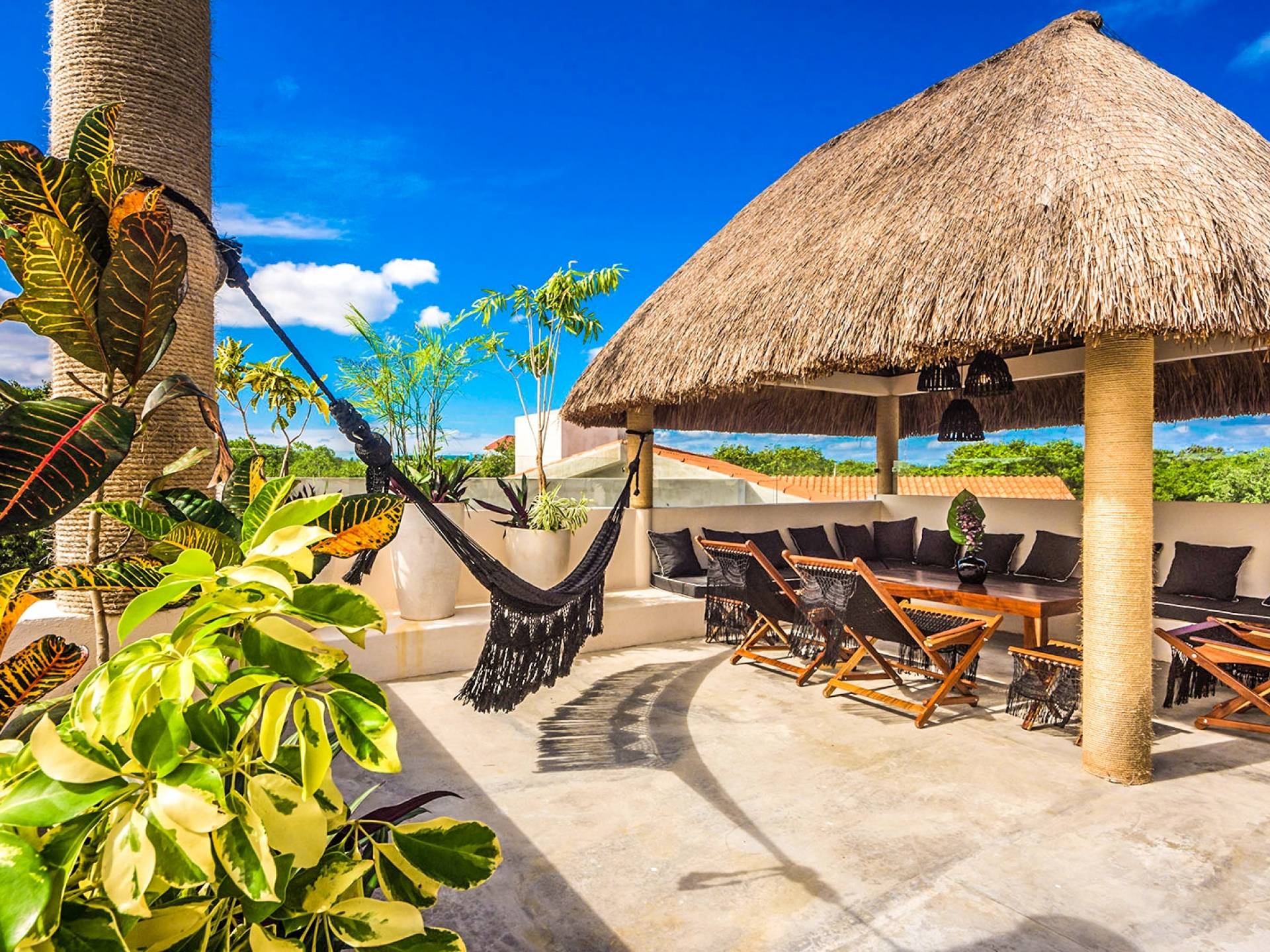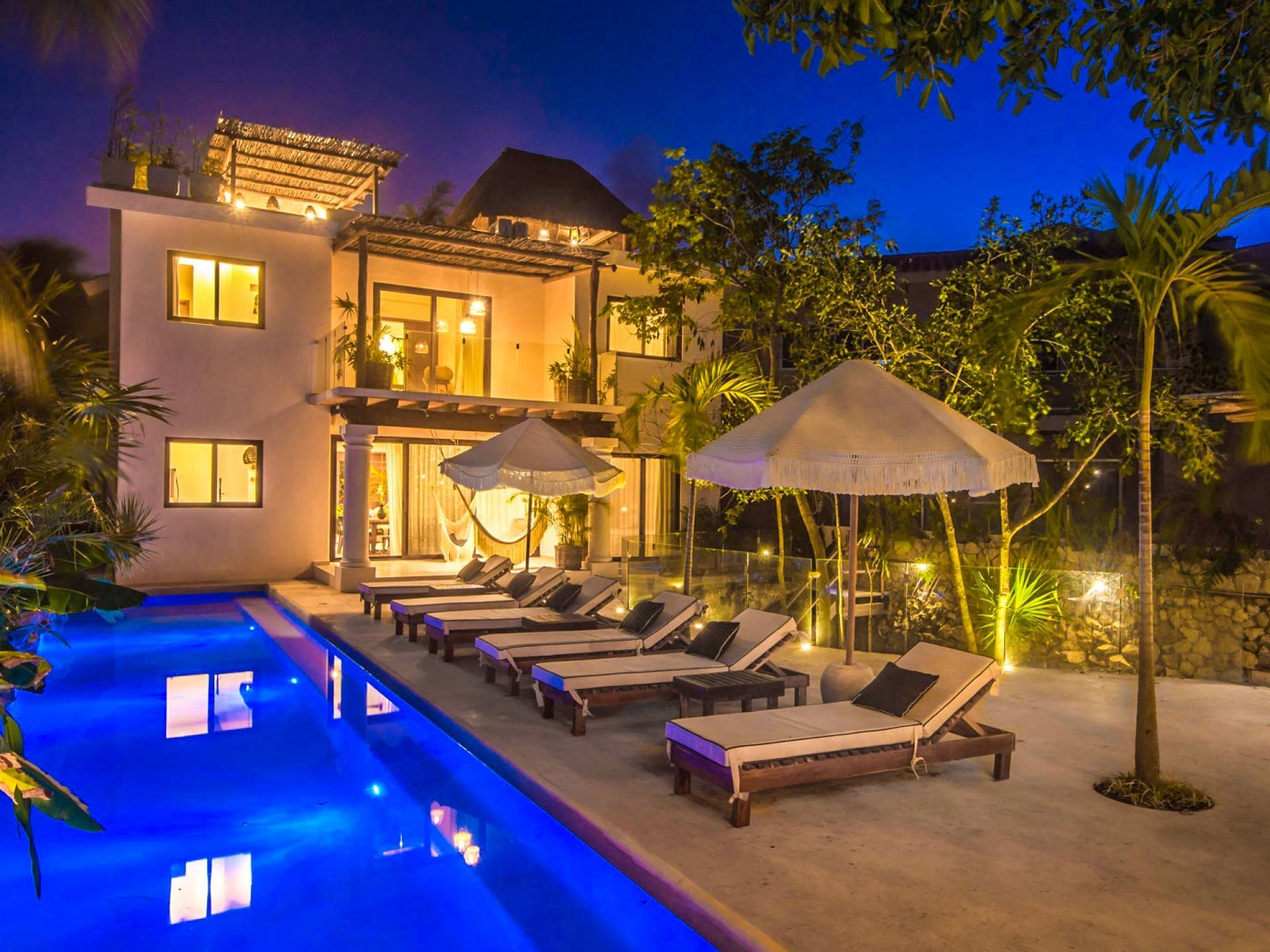 Вилла гордится внешними зонами общего пользования, которые включают просторную террасу на крыше с баром с видом на пристань для яхт и джунгли, а также палапу для более расслабляющего отдыха или более коллективных групповых мероприятий, таких как йога и медитация или спа-услуги. На первом этаже у бассейна вы также сможете насладиться солнечными лучами днем или устроить барбекю вечером и посидеть у костра.