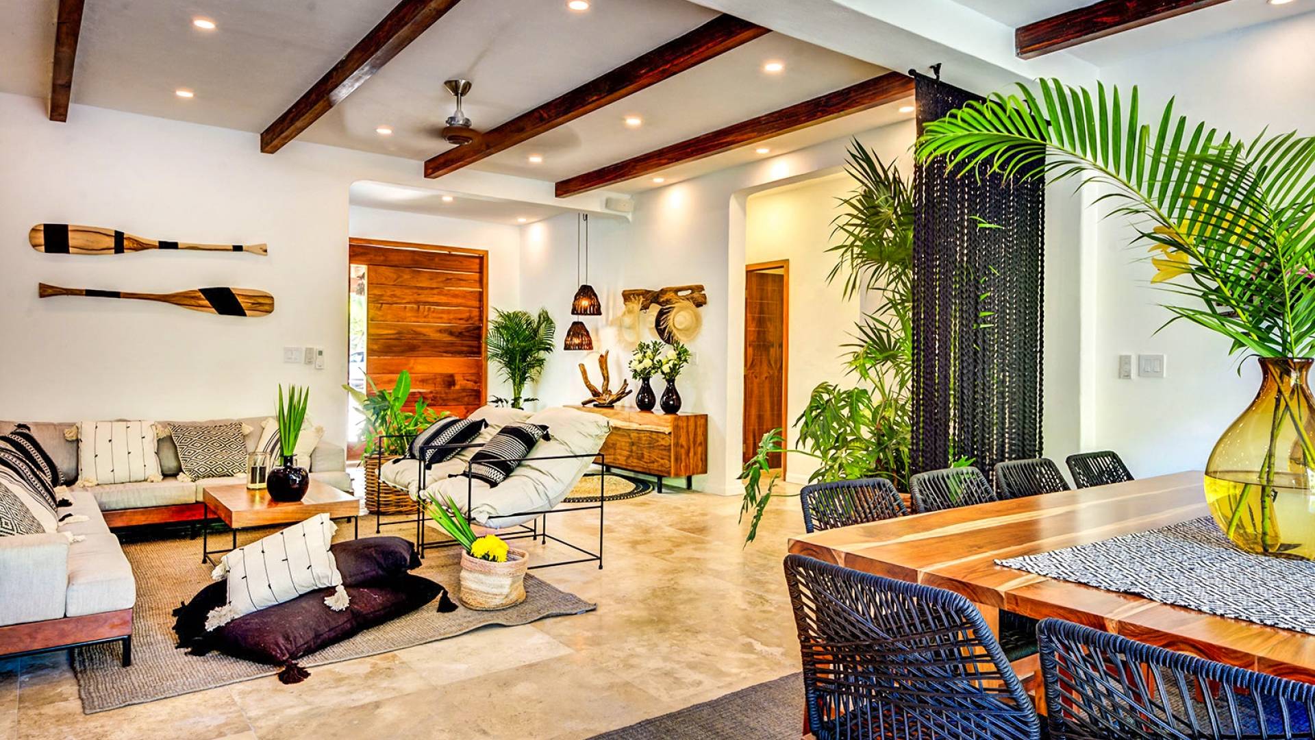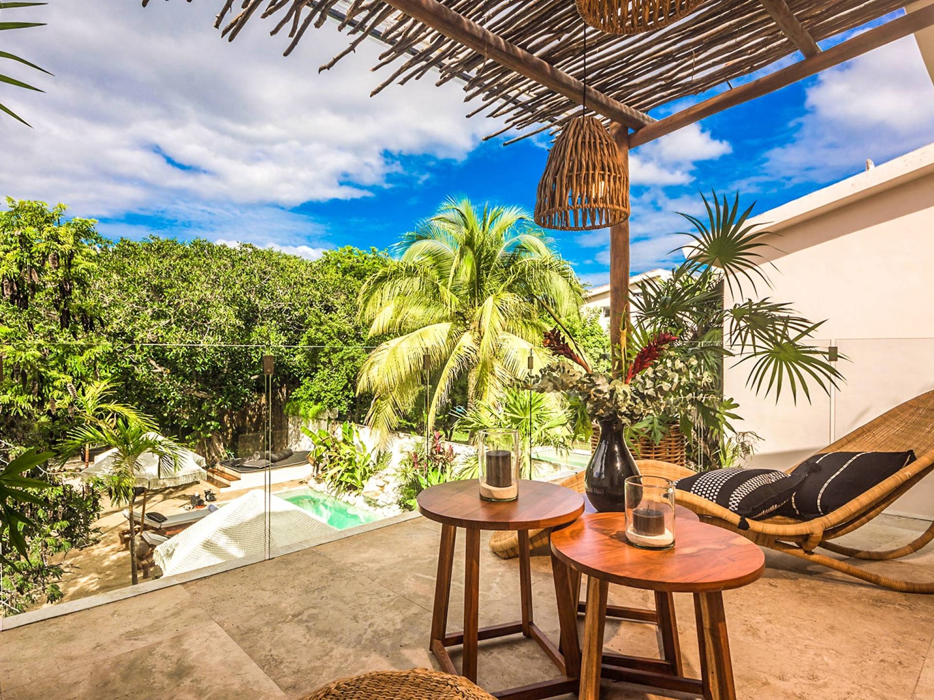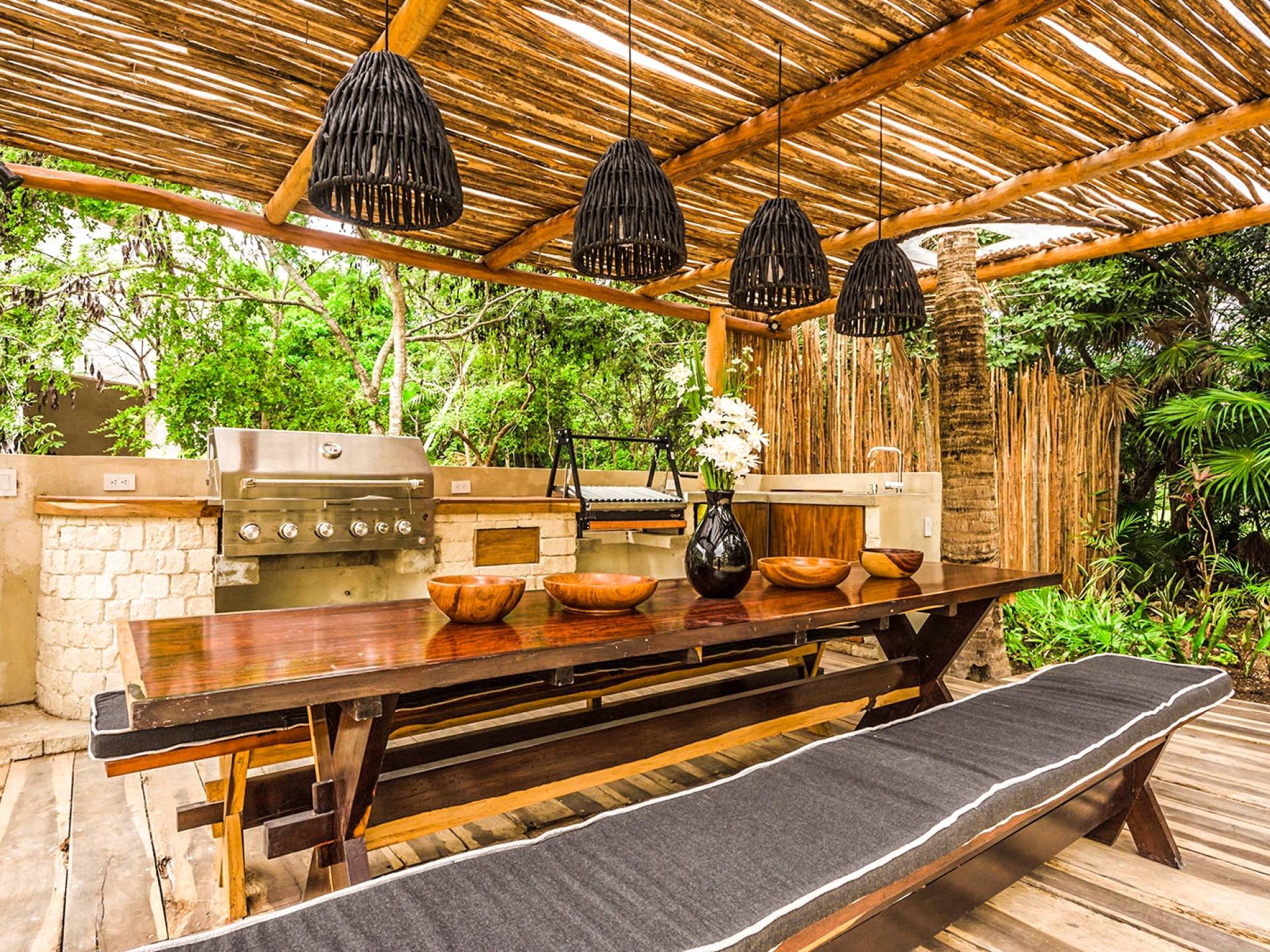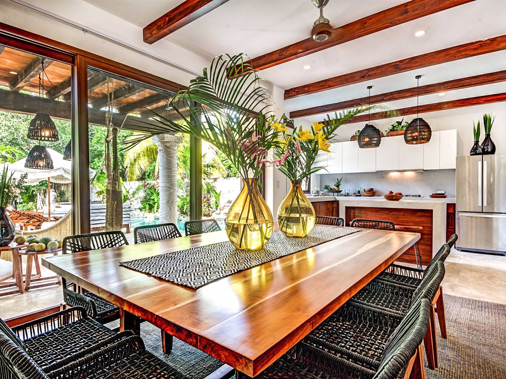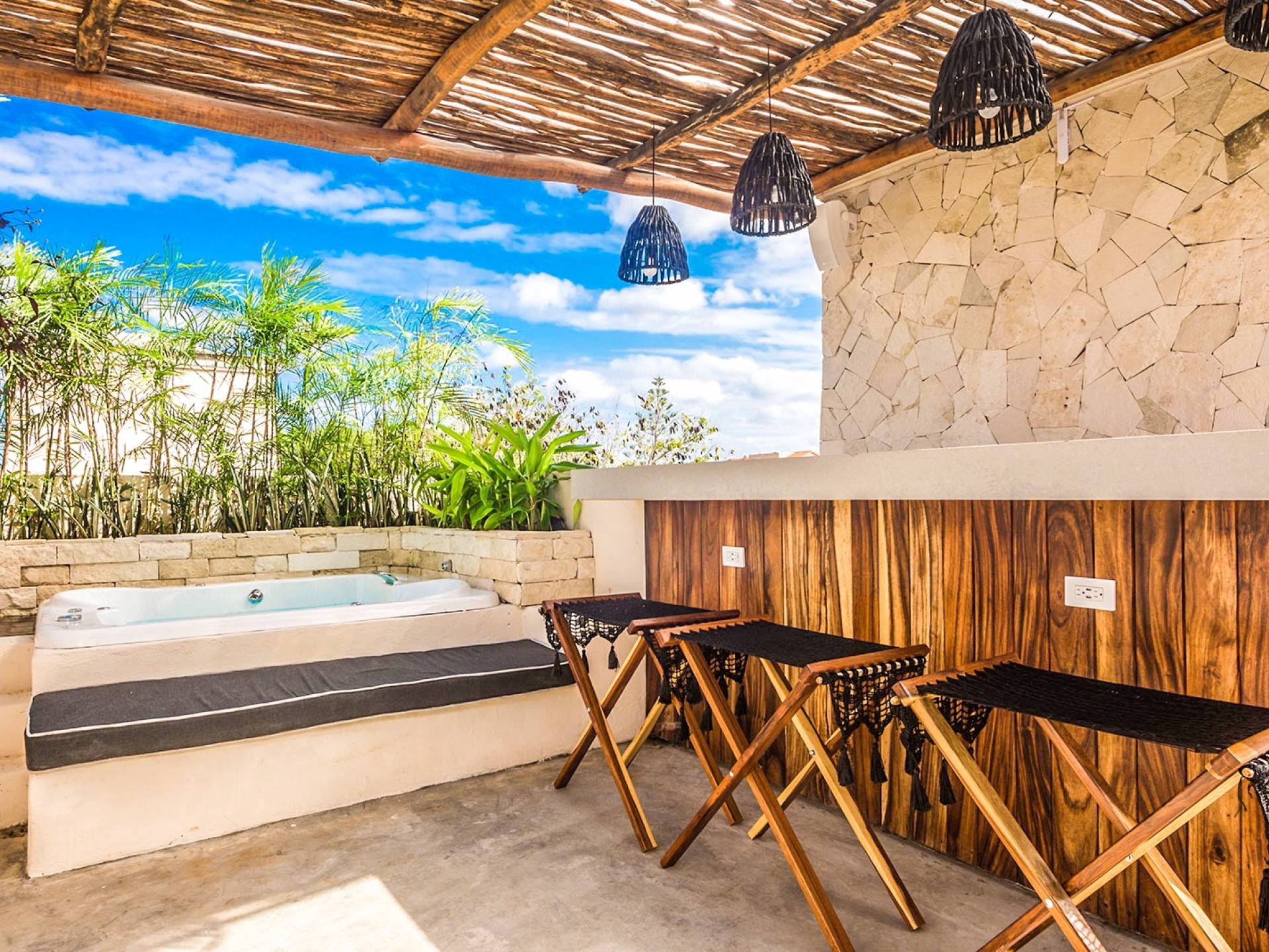 Вилла гордится внешними зонами общего пользования, которые включают просторную террасу на крыше с баром с видом на пристань для яхт и джунгли, а также палапу для более расслабляющего отдыха или более коллективных групповых мероприятий, таких как йога и медитация или спа-услуги. На первом этаже у бассейна вы также сможете насладиться солнечными лучами днем или устроить барбекю вечером и посидеть у костра.
