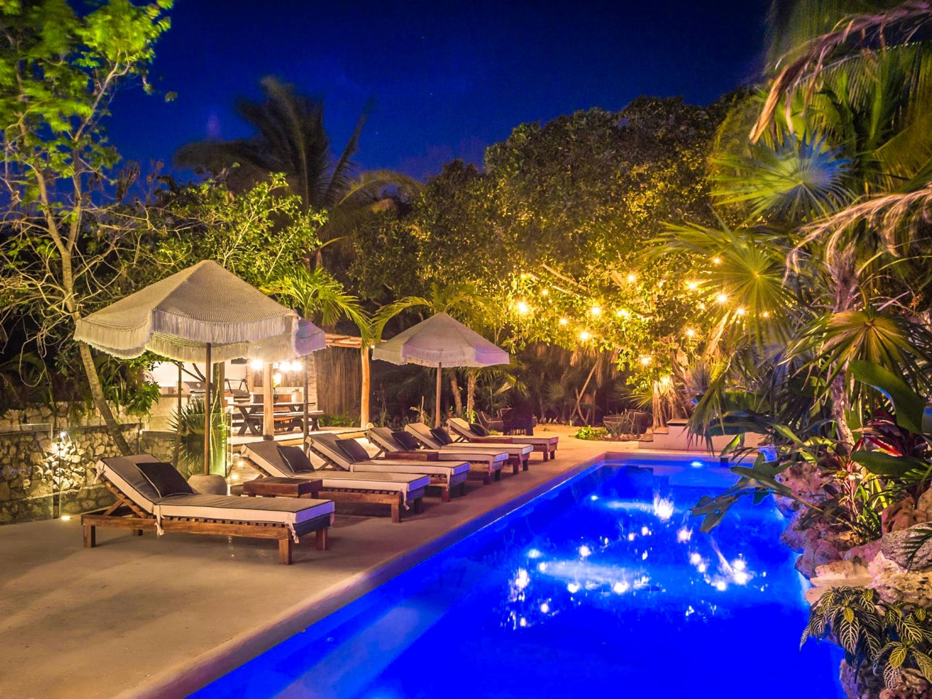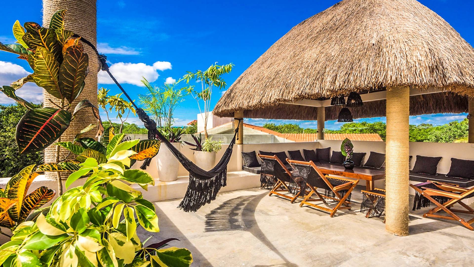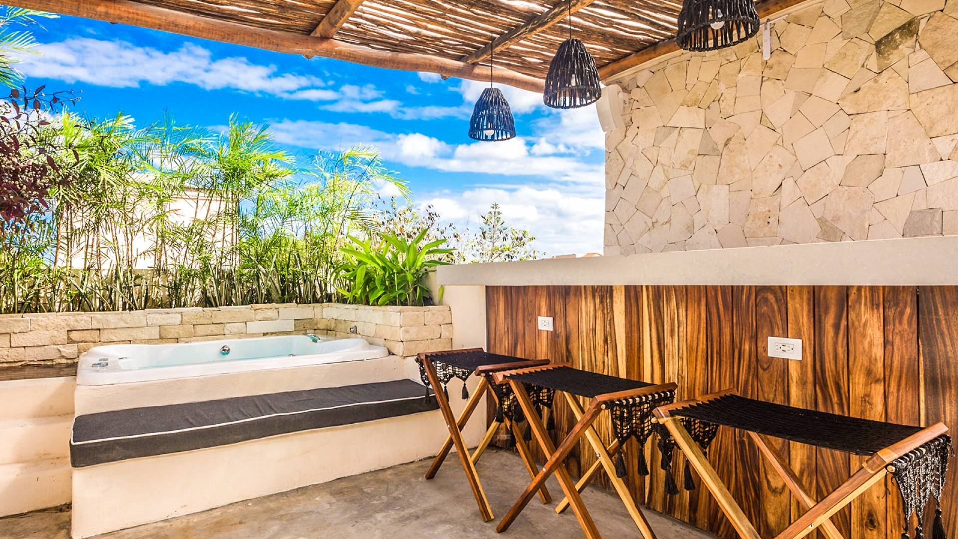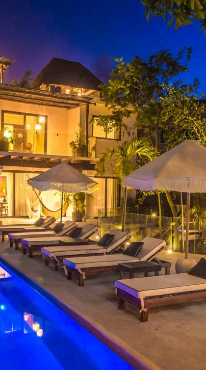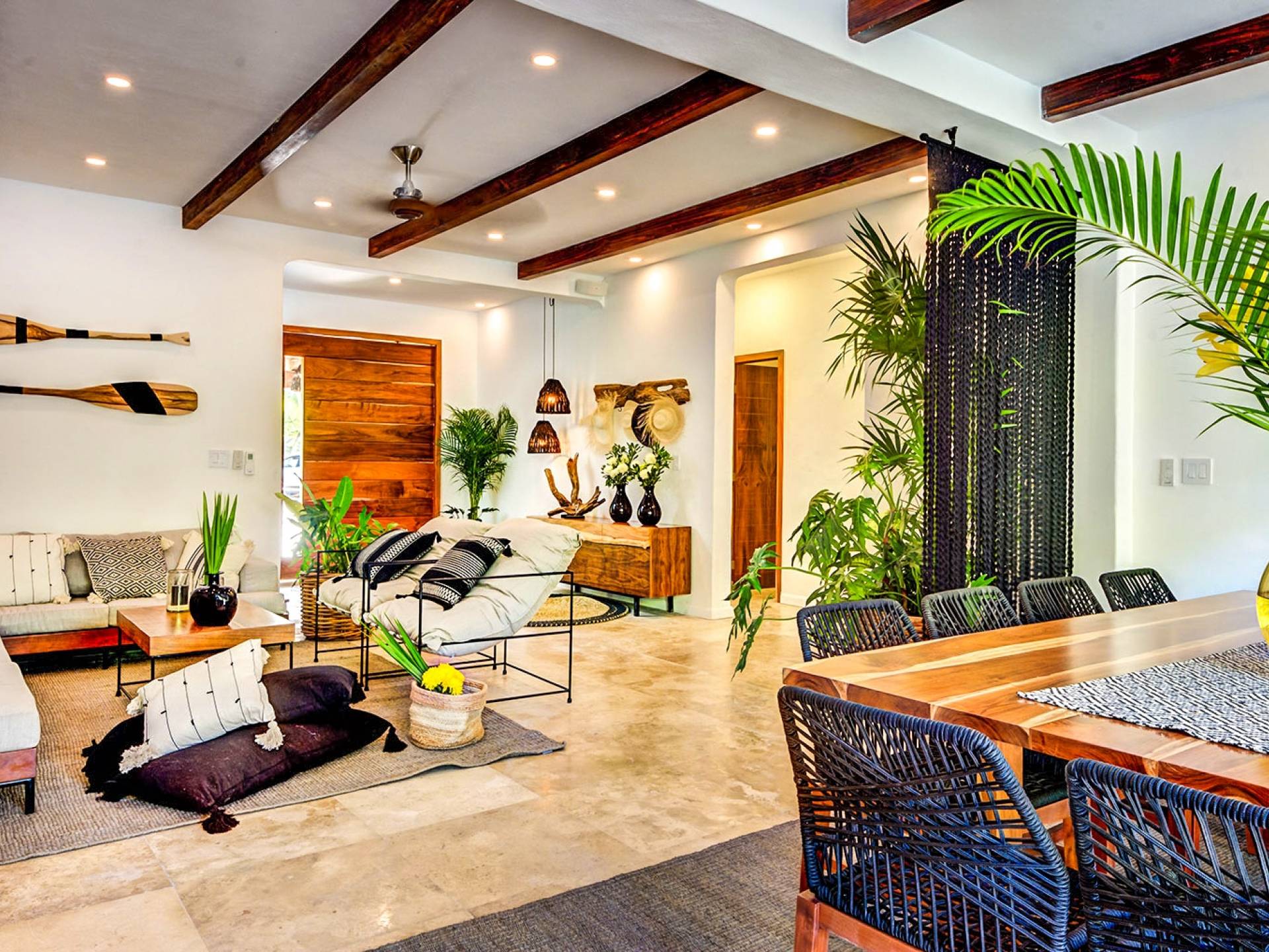 Вилла гордится внешними зонами общего пользования, которые включают просторную террасу на крыше с баром с видом на пристань для яхт и джунгли, а также палапу для более расслабляющего отдыха или более коллективных групповых мероприятий, таких как йога и медитация или спа-услуги. На первом этаже у бассейна вы также сможете насладиться солнечными лучами днем или устроить барбекю вечером и посидеть у костра.