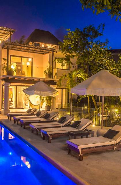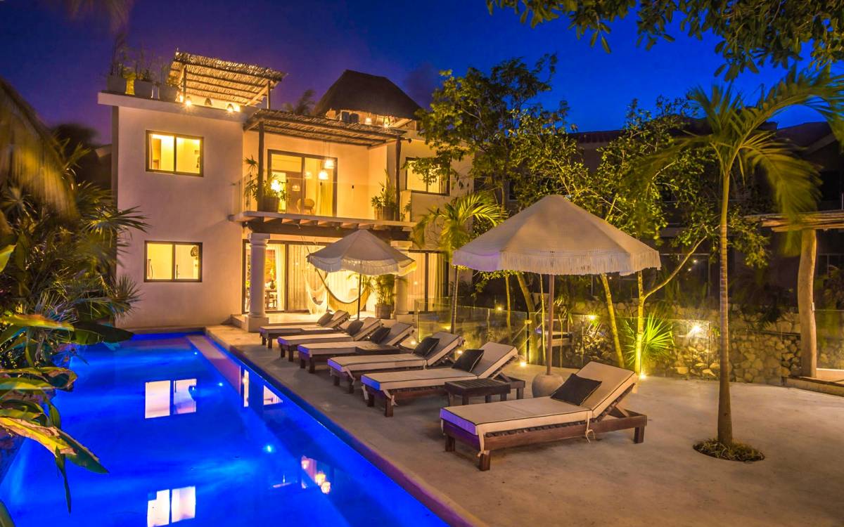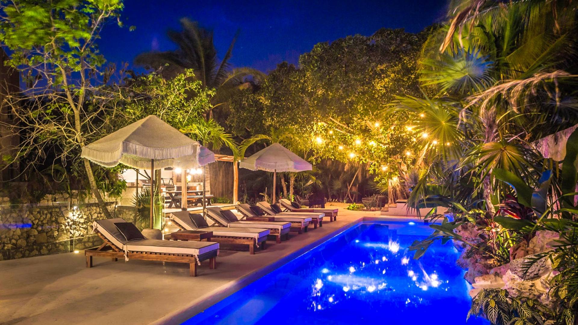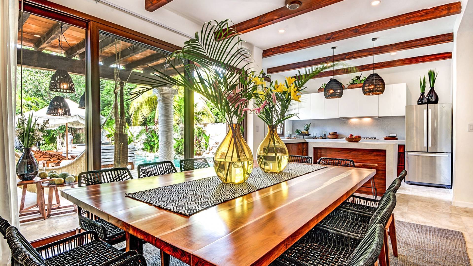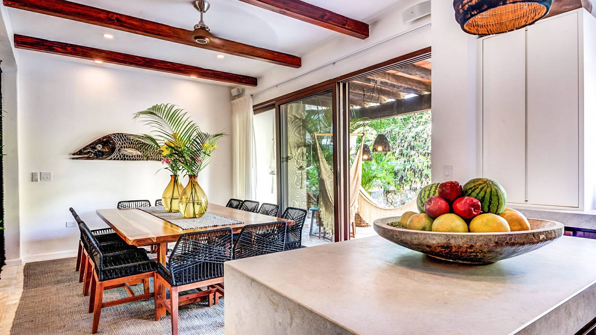 Вилла гордится внешними зонами общего пользования, которые включают просторную террасу на крыше с баром с видом на пристань для яхт и джунгли, а также палапу для более расслабляющего отдыха или более коллективных групповых мероприятий, таких как йога и медитация или спа-услуги. На первом этаже у бассейна вы также сможете насладиться солнечными лучами днем или устроить барбекю вечером и посидеть у костра.