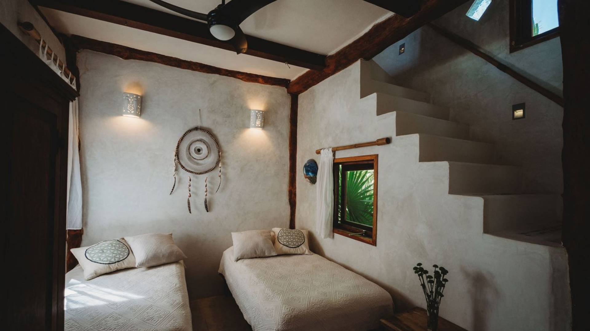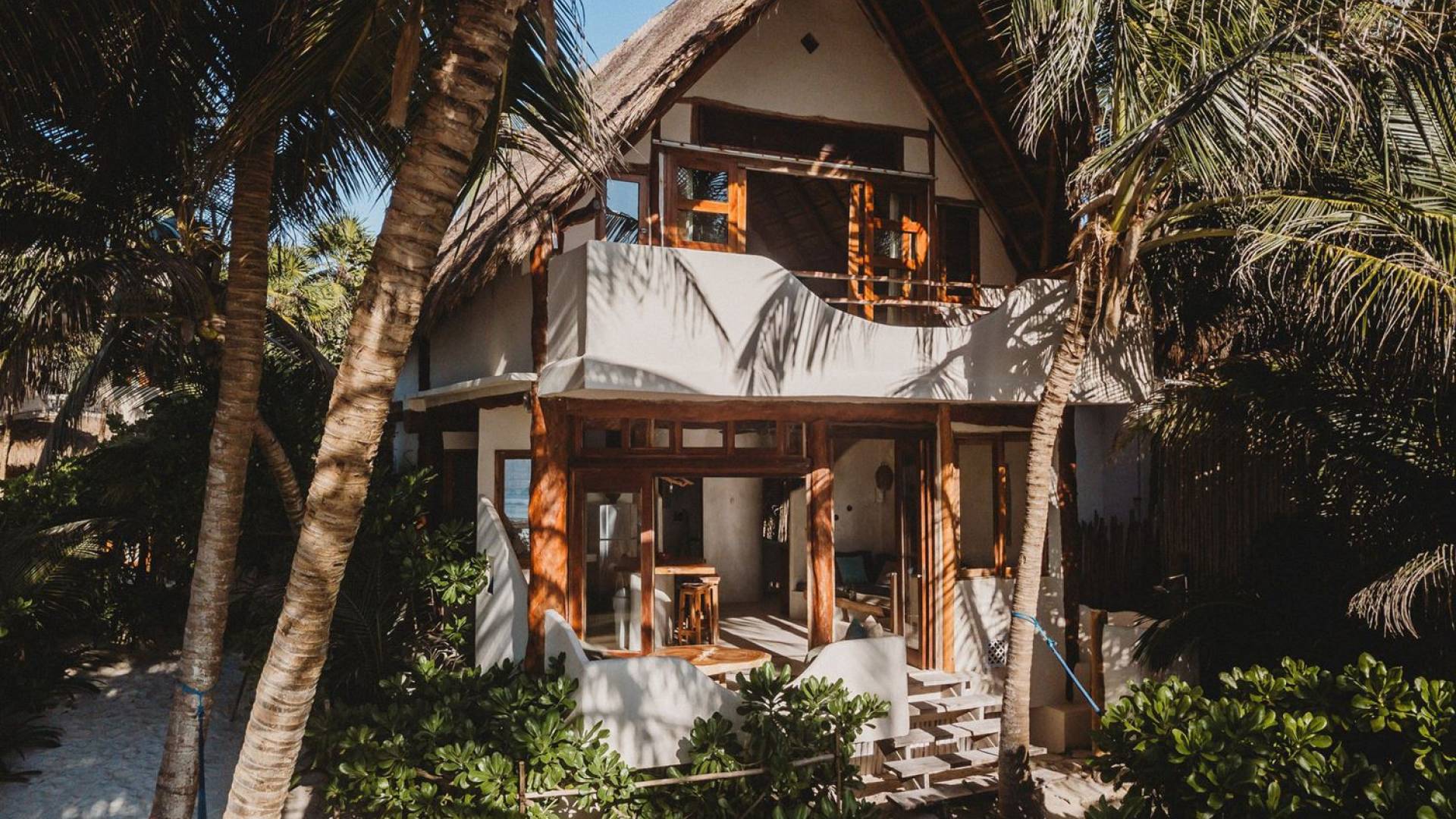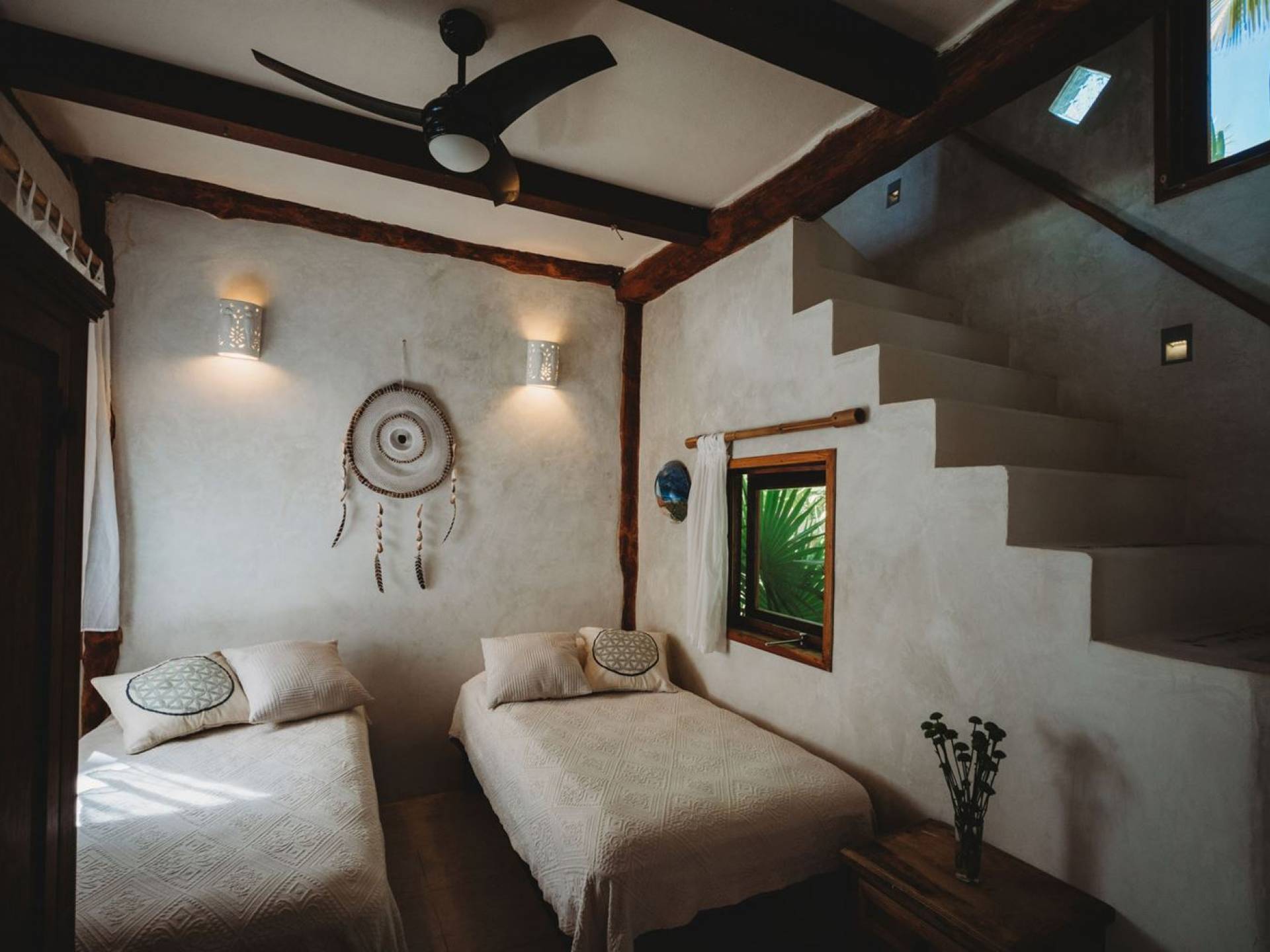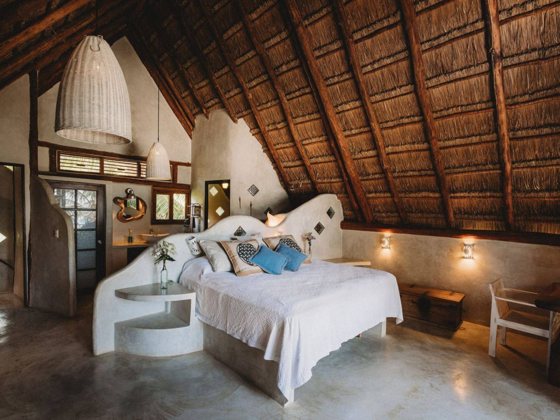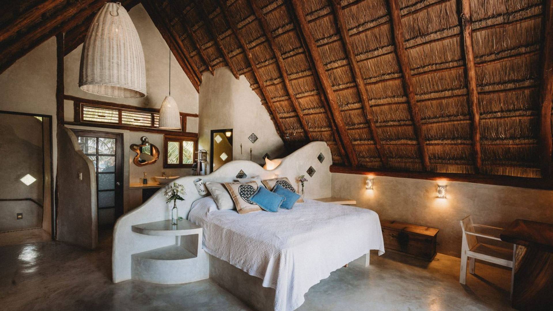 Жилое пространство открытой планировки создает неразрывную связь с окружающей средой. На веранде есть зона отдыха с подушками и душ на открытом воздухе среди пышной зелени. Художественные элементы и детали внутри придают дому неповторимую атмосферу пляжа Тулума. Весь верхний этаж представляет собой главную спальню с красивой крышей из палапа, кроватью размера «king-size» и балконом с видом на море. Спальня улавливает морской бриз и остается комфортной даже в жару. Имеется санузел и душевая кабина. Комната светлая и просторная.