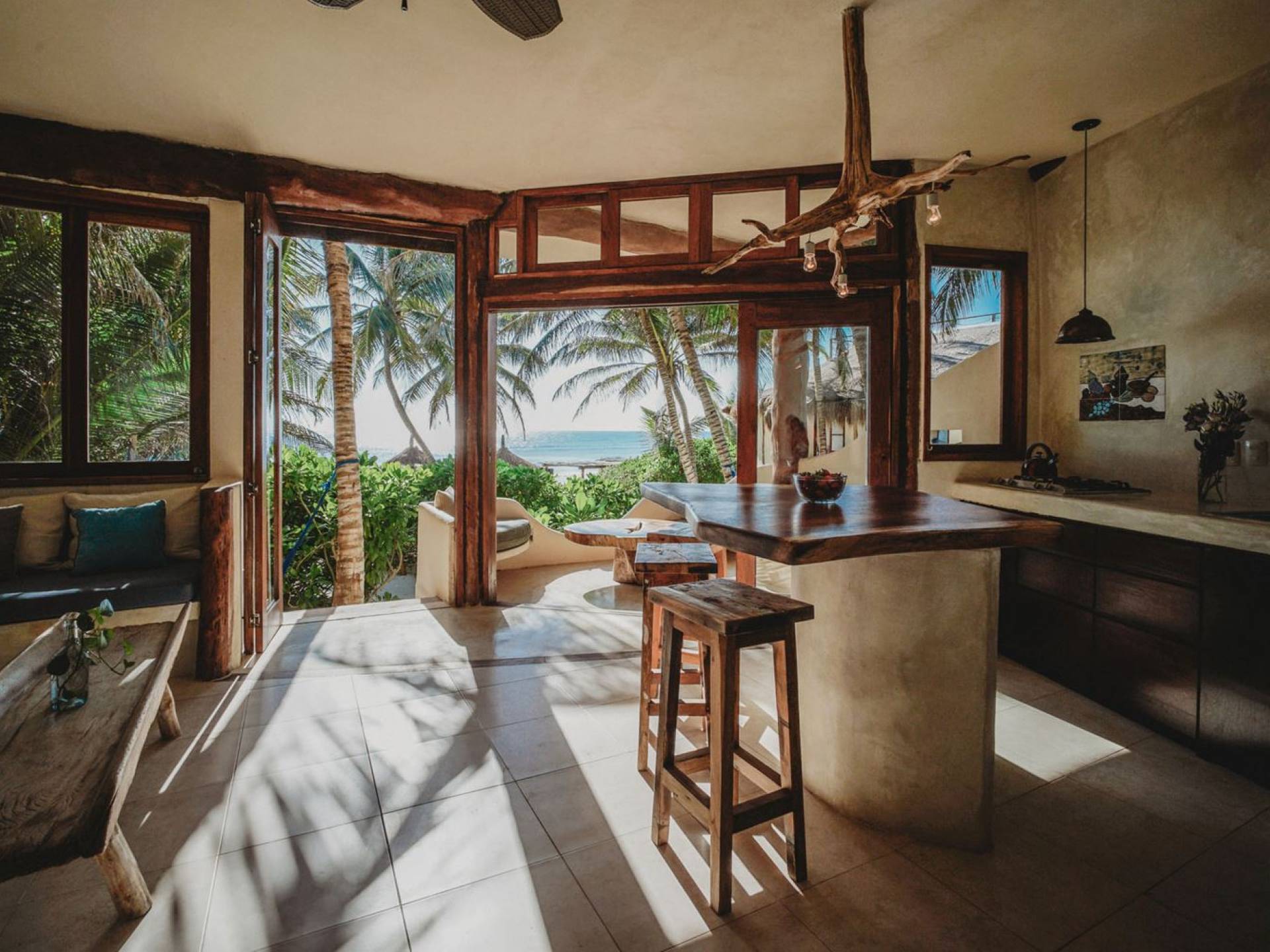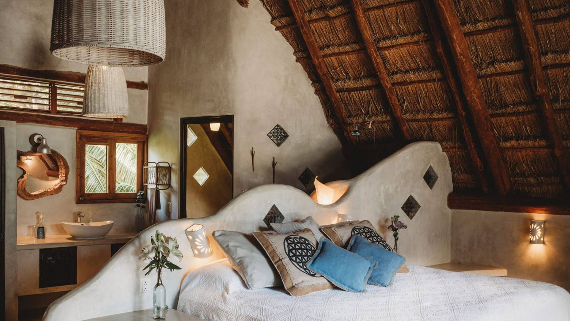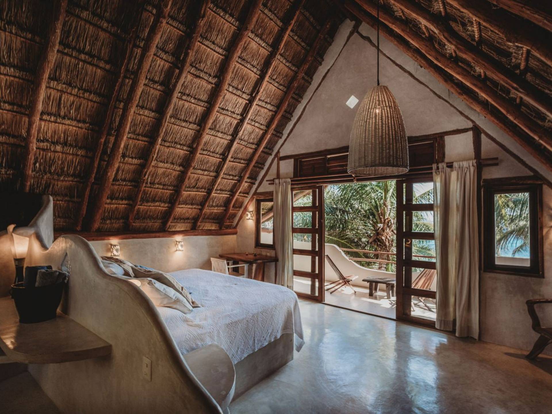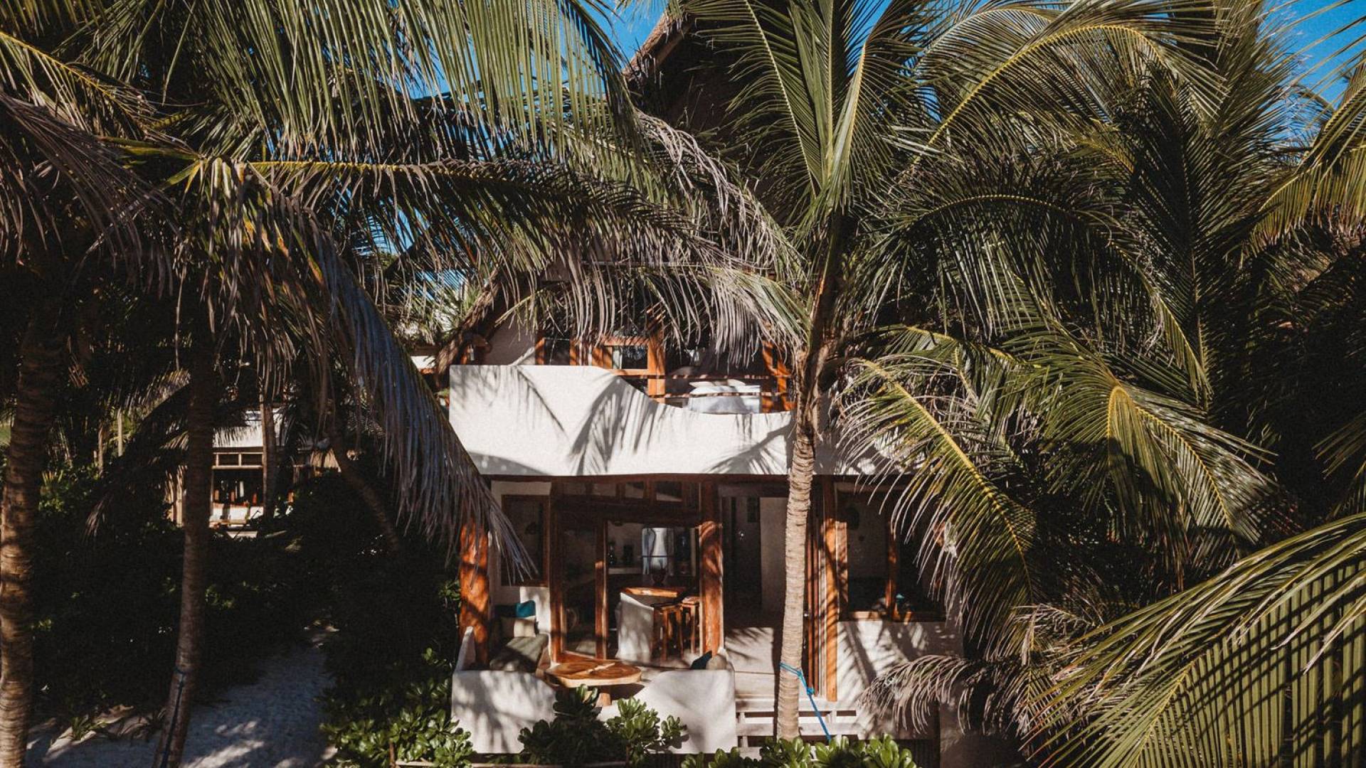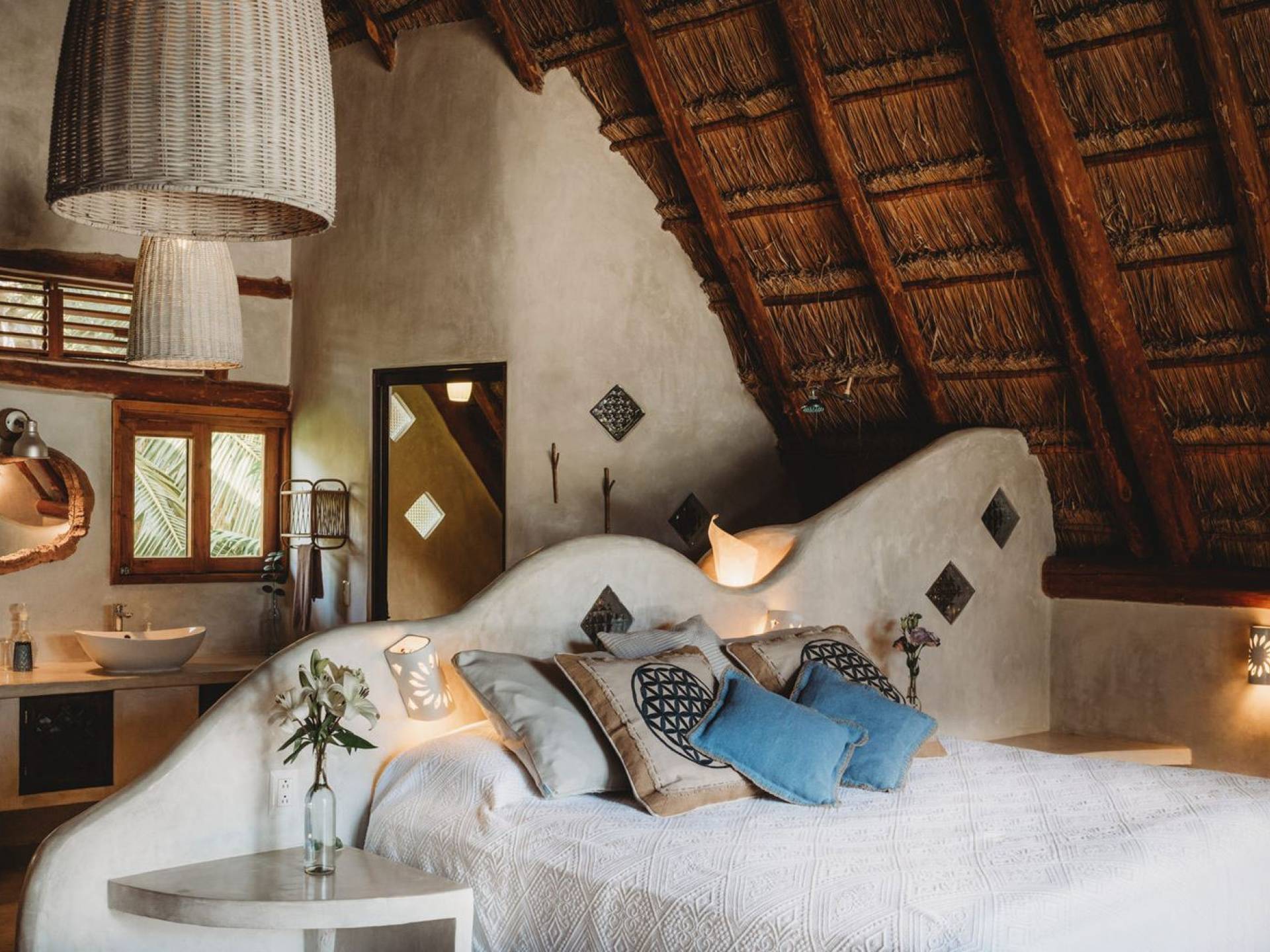 Жилое пространство открытой планировки создает неразрывную связь с окружающей средой. На веранде есть зона отдыха с подушками и душ на открытом воздухе среди пышной зелени. Художественные элементы и детали внутри придают дому неповторимую атмосферу пляжа Тулума. Весь верхний этаж представляет собой главную спальню с красивой крышей из палапа, кроватью размера «king-size» и балконом с видом на море. Спальня улавливает морской бриз и остается комфортной даже в жару. Имеется санузел и душевая кабина. Комната светлая и просторная.