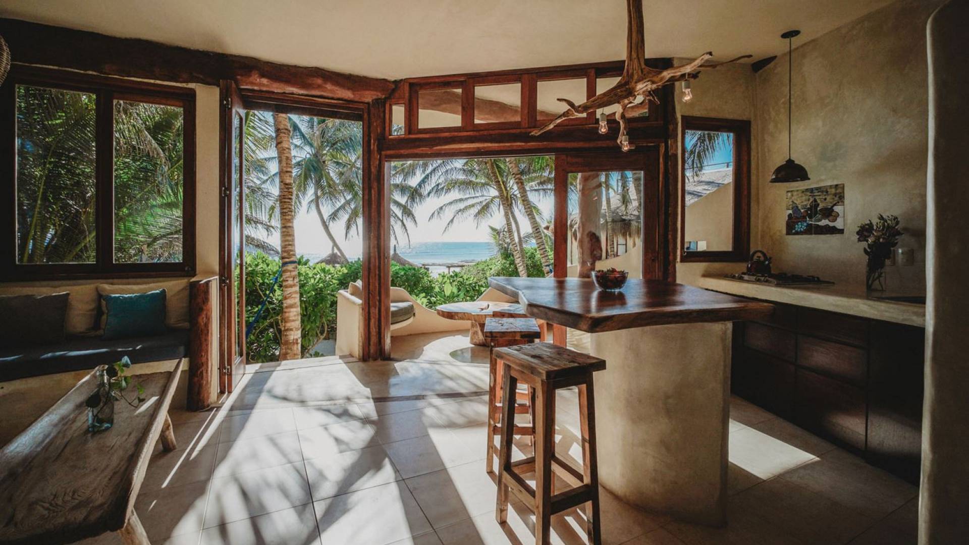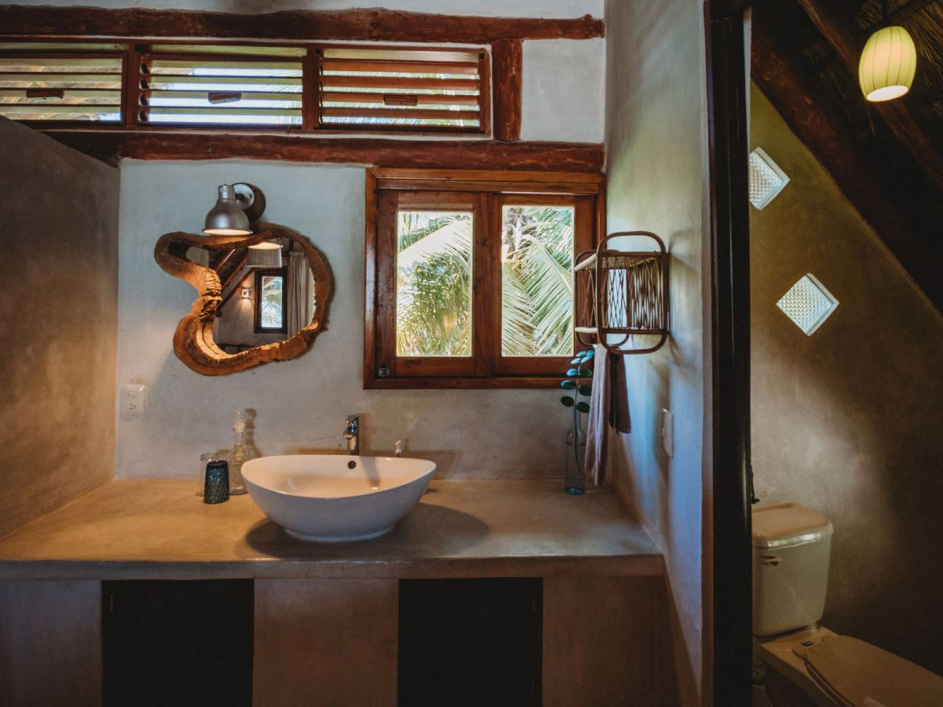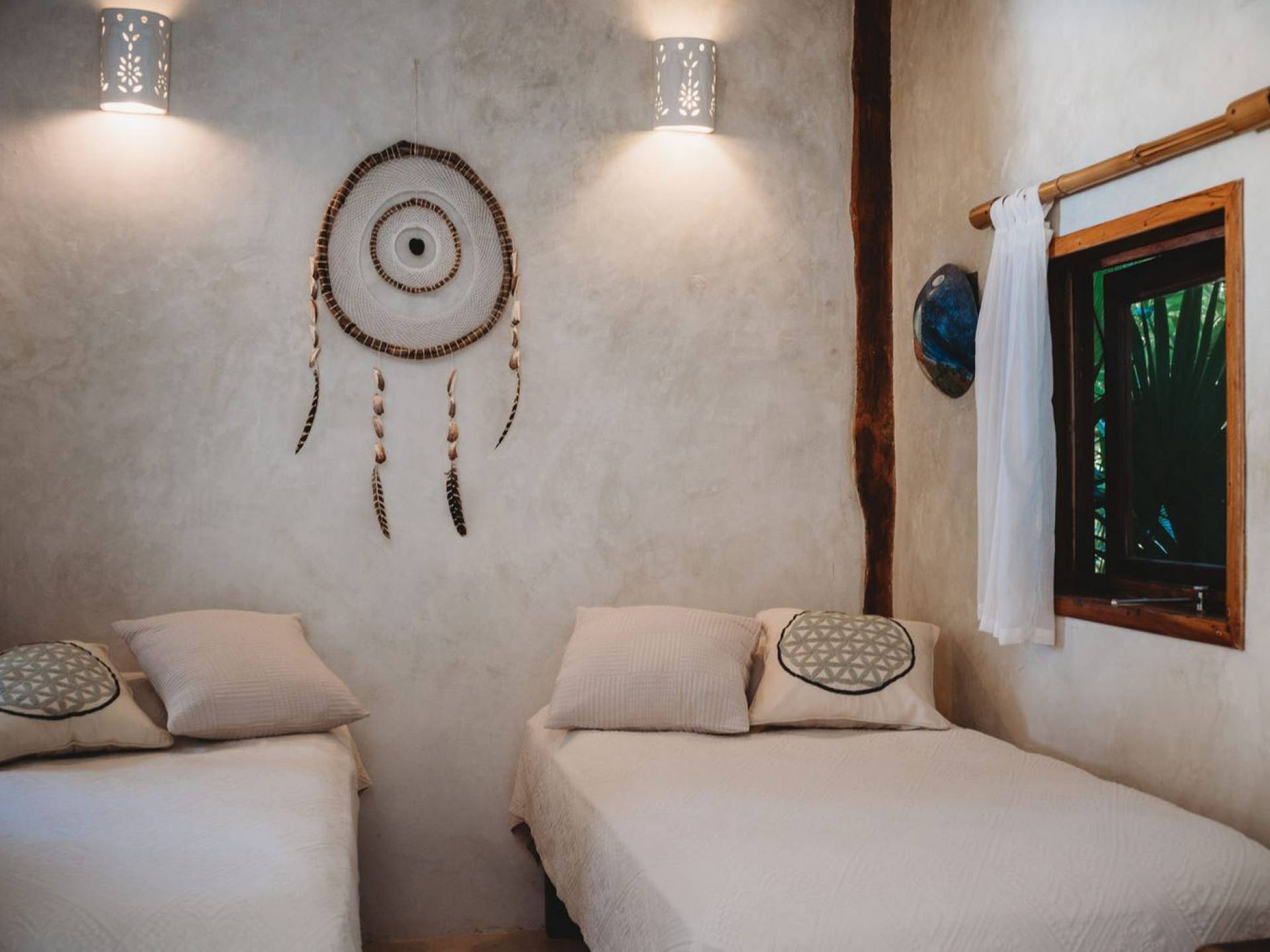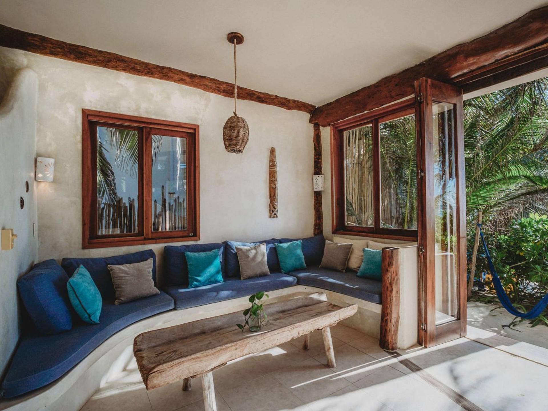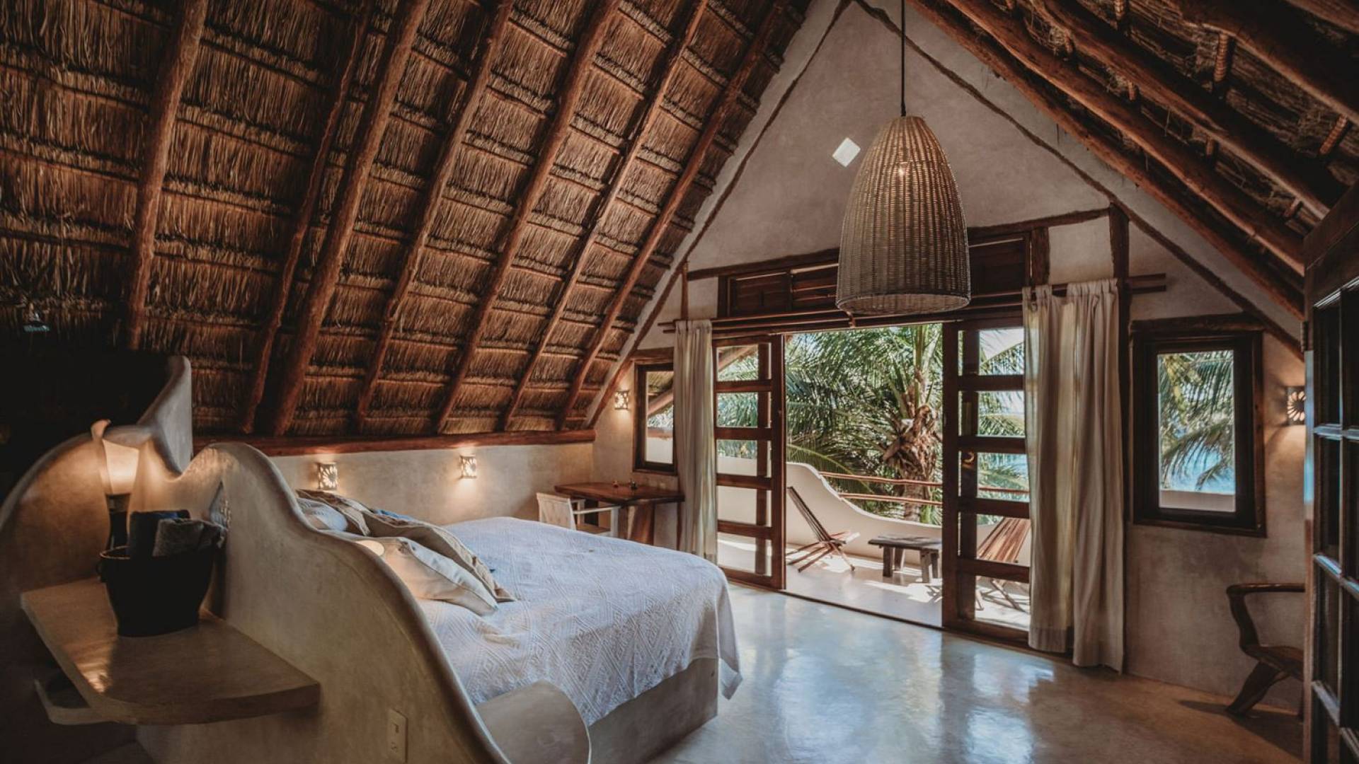 Жилое пространство открытой планировки создает неразрывную связь с окружающей средой. На веранде есть зона отдыха с подушками и душ на открытом воздухе среди пышной зелени. Художественные элементы и детали внутри придают дому неповторимую атмосферу пляжа Тулума. Весь верхний этаж представляет собой главную спальню с красивой крышей из палапа, кроватью размера «king-size» и балконом с видом на море. Спальня улавливает морской бриз и остается комфортной даже в жару. Имеется санузел и душевая кабина. Комната светлая и просторная.
