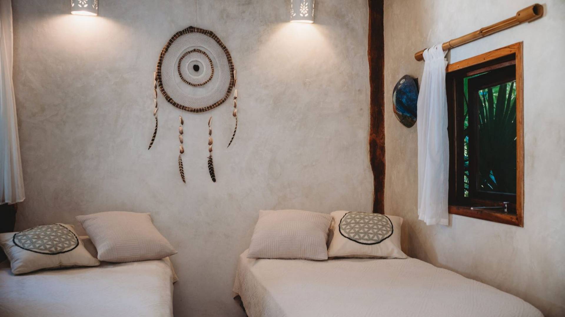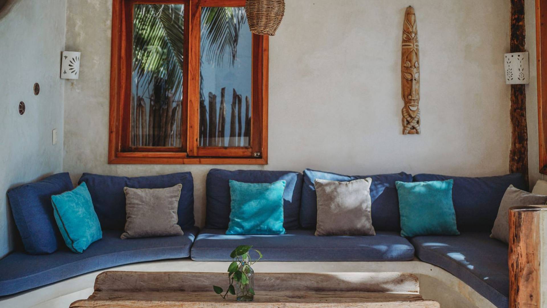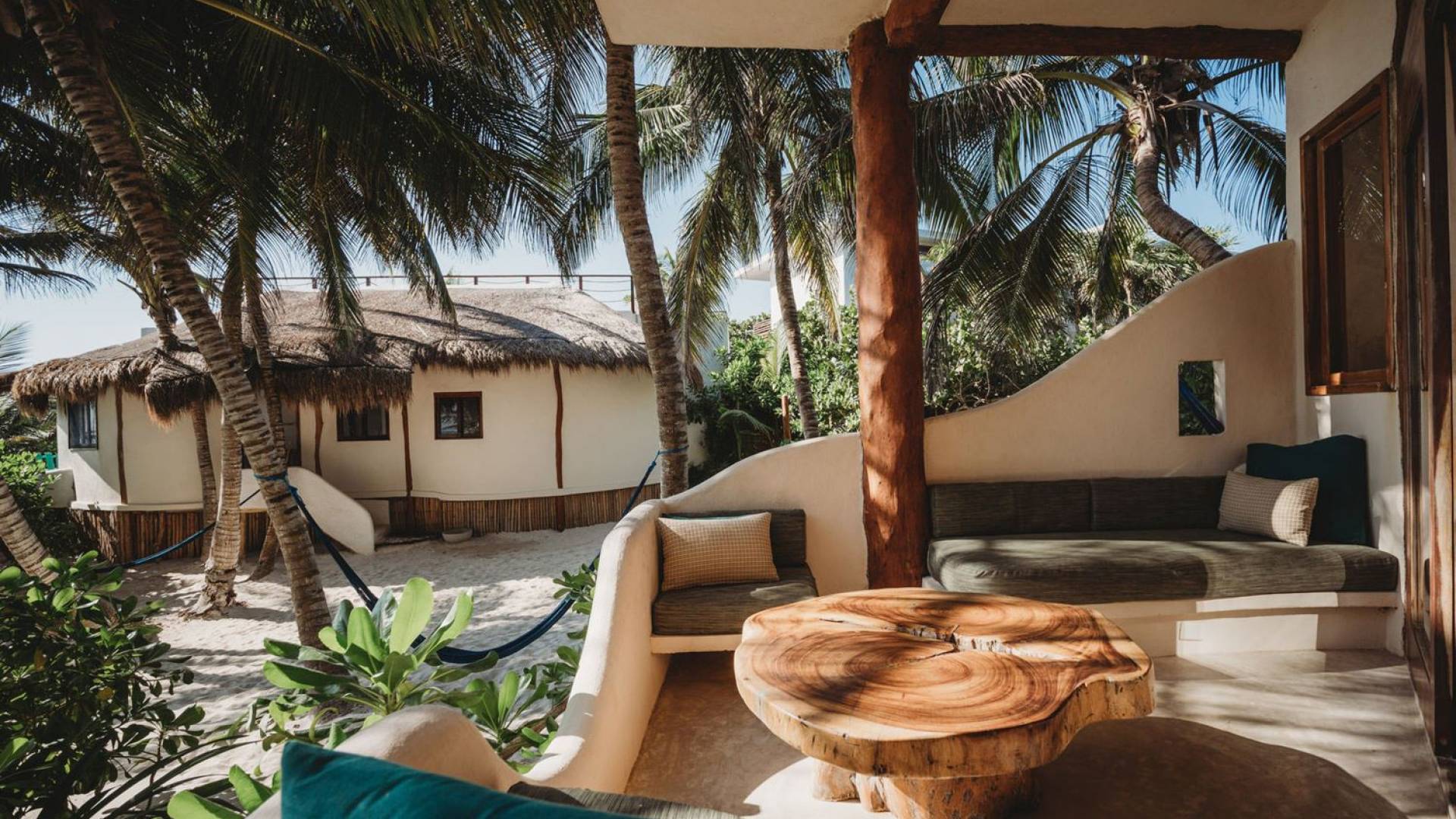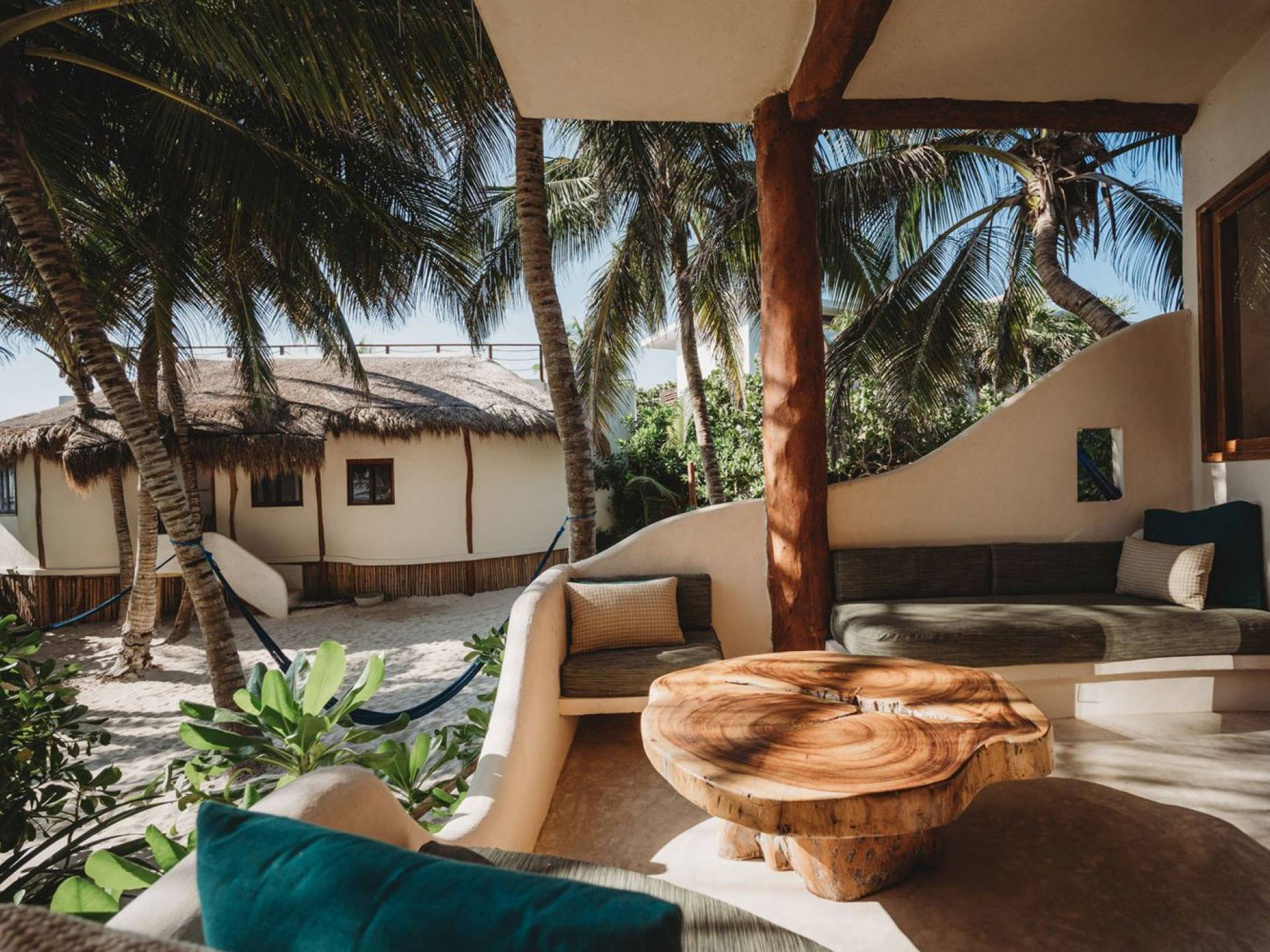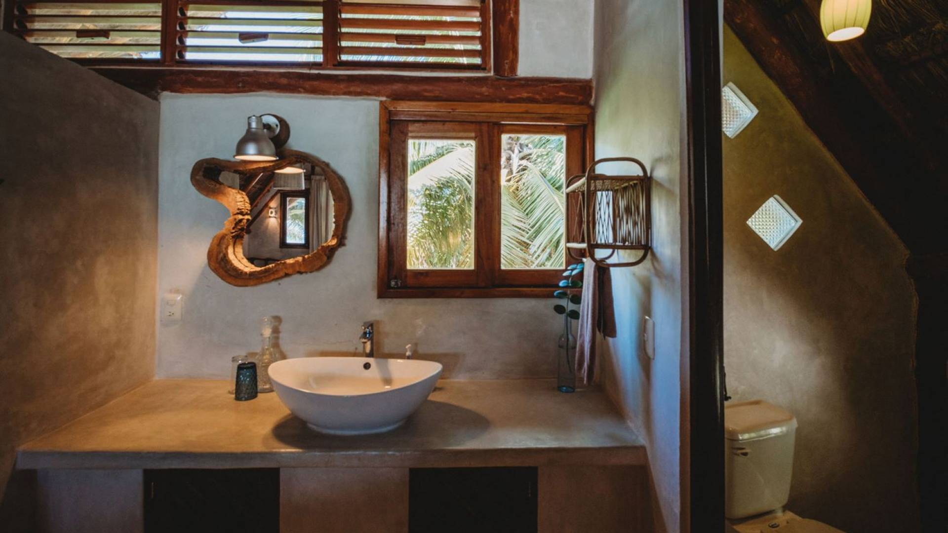 Жилое пространство открытой планировки создает неразрывную связь с окружающей средой. На веранде есть зона отдыха с подушками и душ на открытом воздухе среди пышной зелени. Художественные элементы и детали внутри придают дому неповторимую атмосферу пляжа Тулума. Весь верхний этаж представляет собой главную спальню с красивой крышей из палапа, кроватью размера «king-size» и балконом с видом на море. Спальня улавливает морской бриз и остается комфортной даже в жару. Имеется санузел и душевая кабина. Комната светлая и просторная.