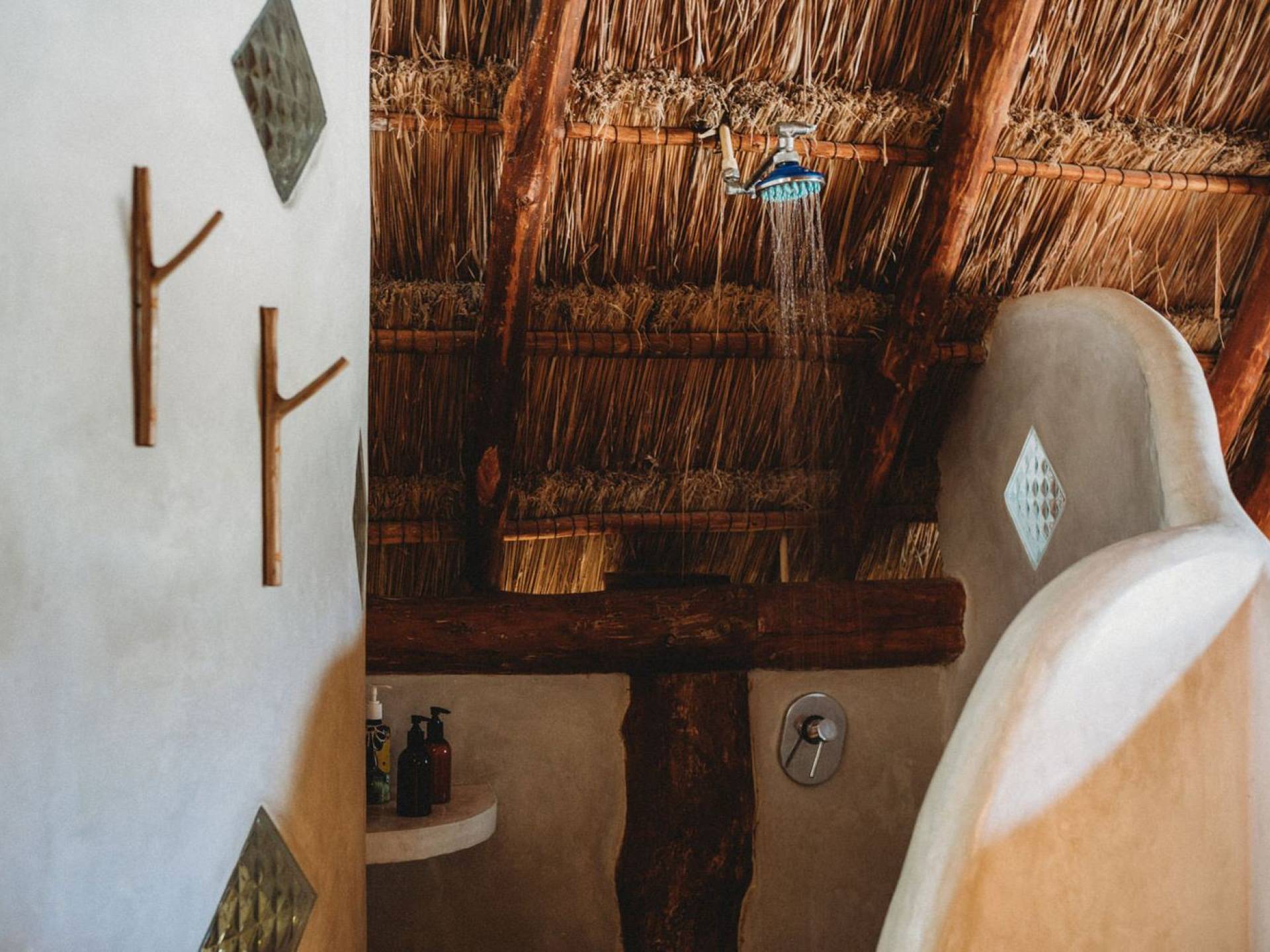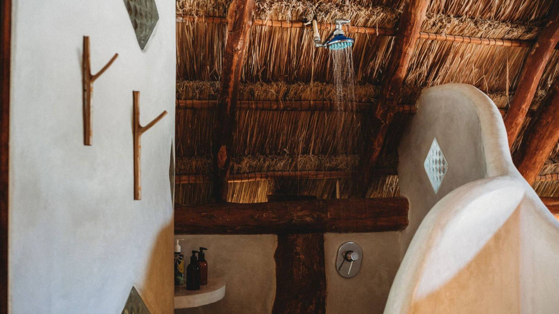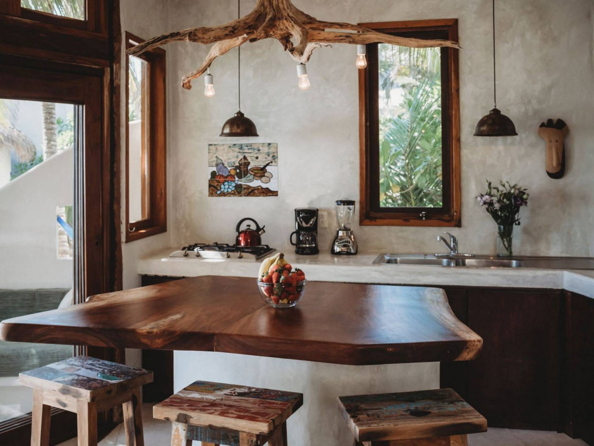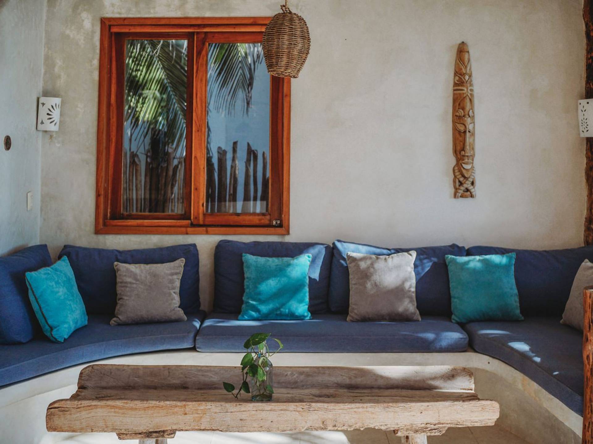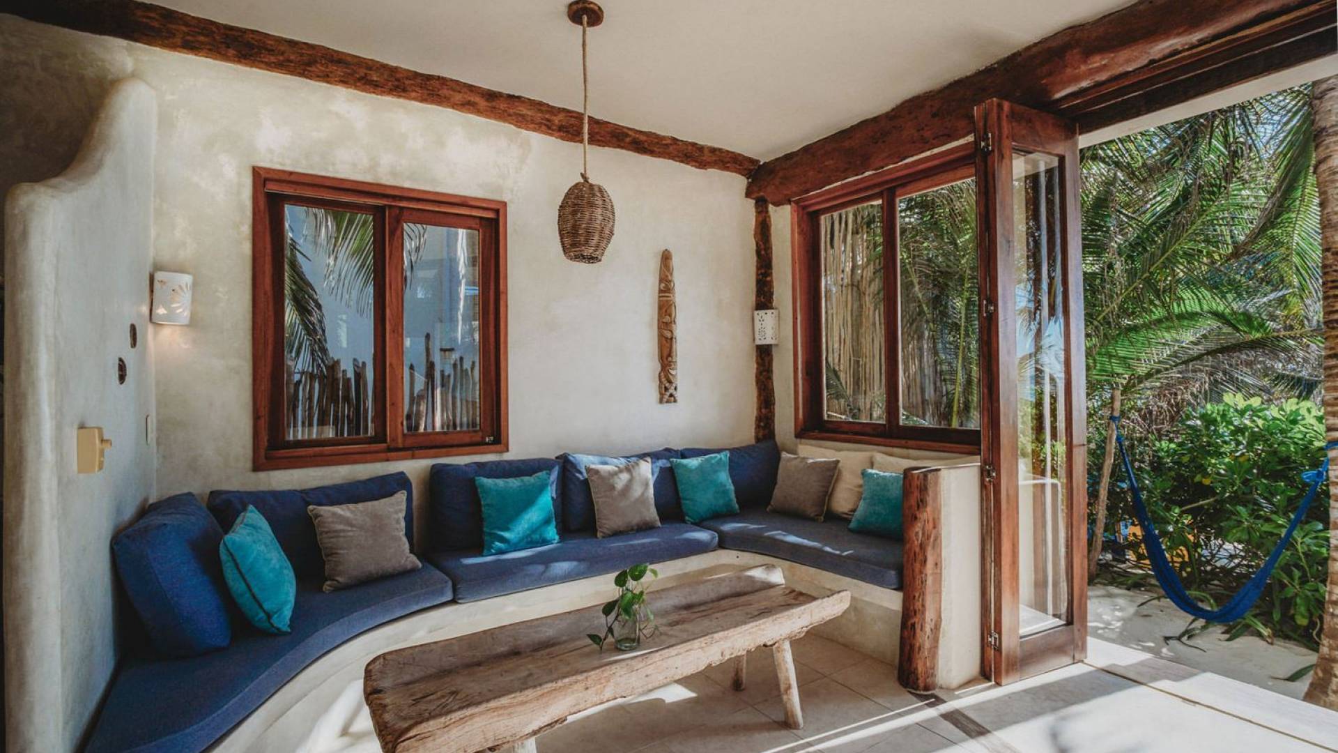 Жилое пространство открытой планировки создает неразрывную связь с окружающей средой. На веранде есть зона отдыха с подушками и душ на открытом воздухе среди пышной зелени. Художественные элементы и детали внутри придают дому неповторимую атмосферу пляжа Тулума. Весь верхний этаж представляет собой главную спальню с красивой крышей из палапа, кроватью размера «king-size» и балконом с видом на море. Спальня улавливает морской бриз и остается комфортной даже в жару. Имеется санузел и душевая кабина. Комната светлая и просторная.