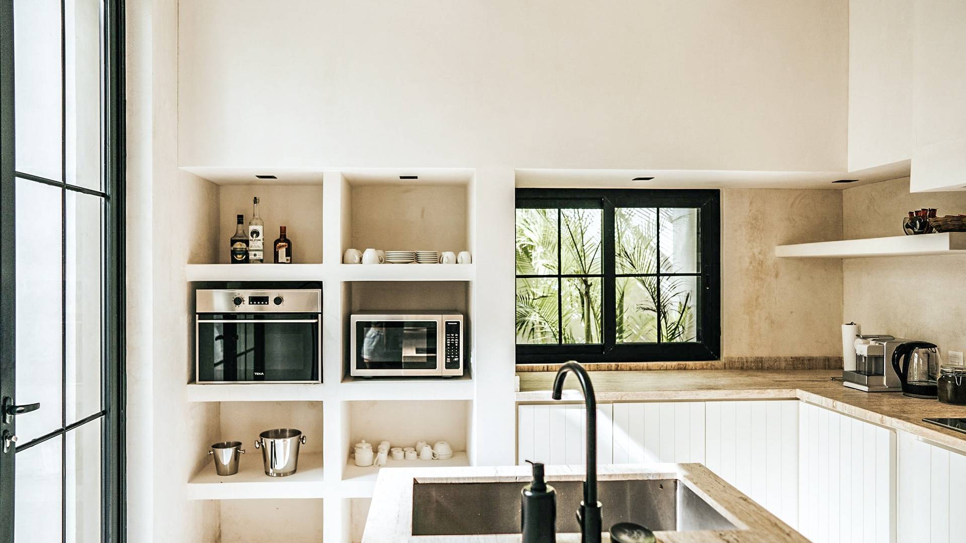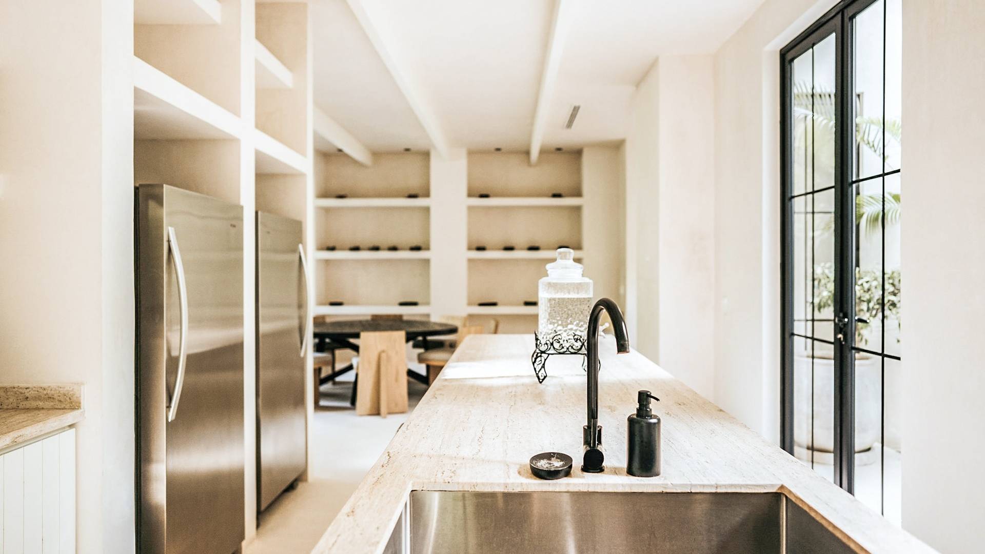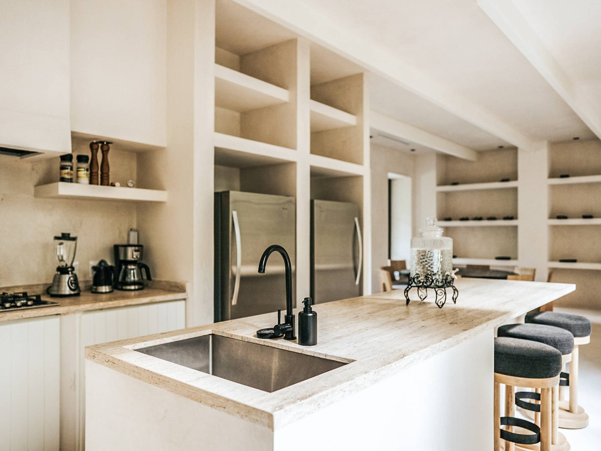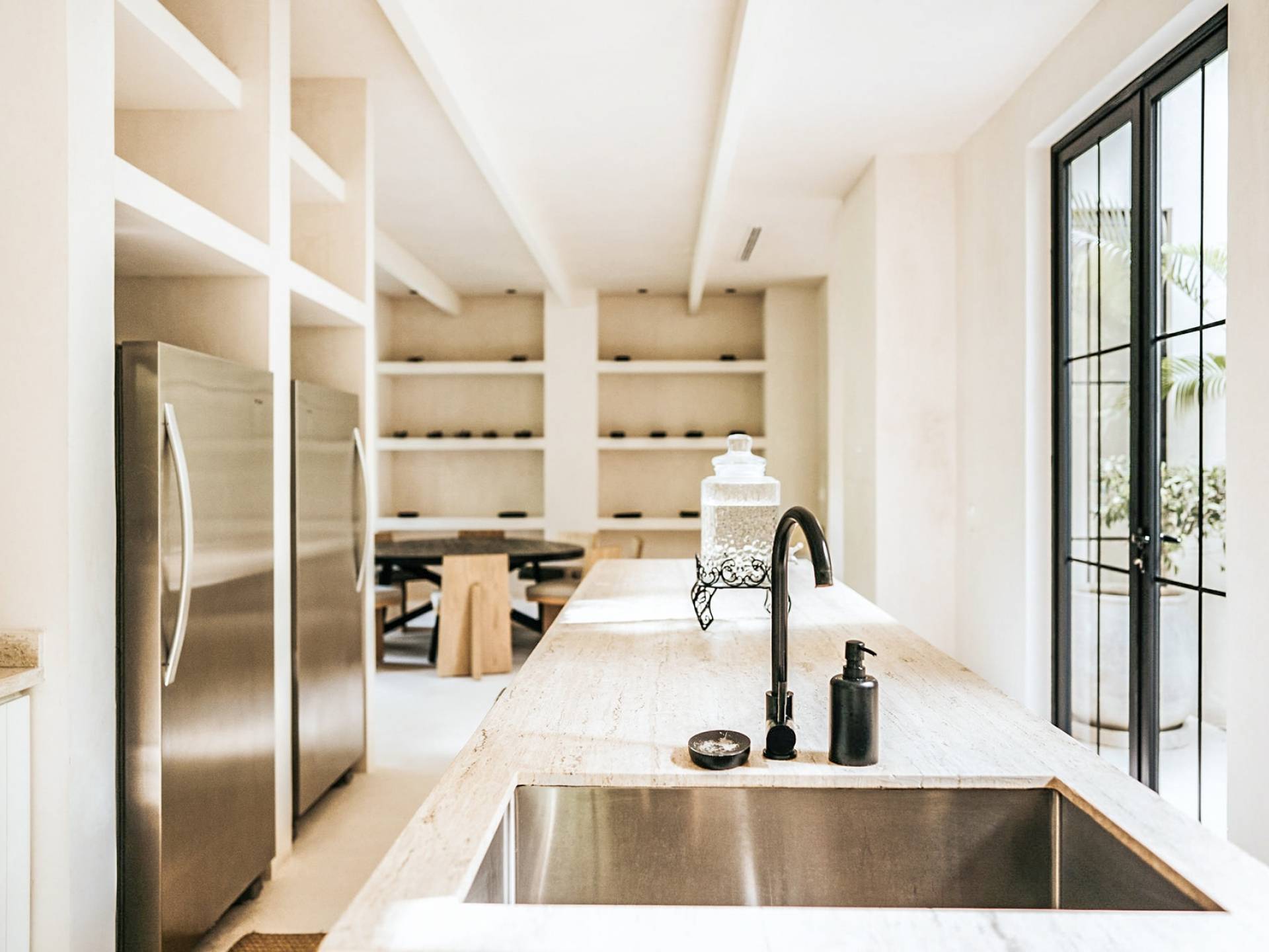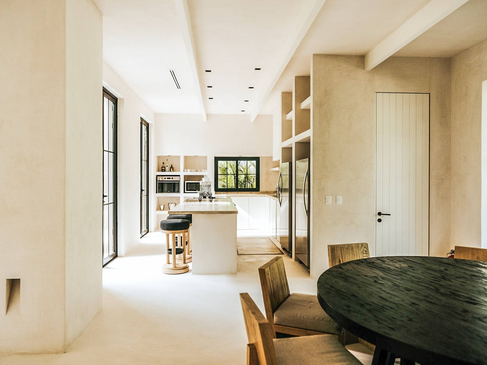 На полностью оборудованной кухне есть большой остров, обращенный к столовой, а умиротворяющая атмосфера гостиной сливается с внутренним двором в центре резиденции.