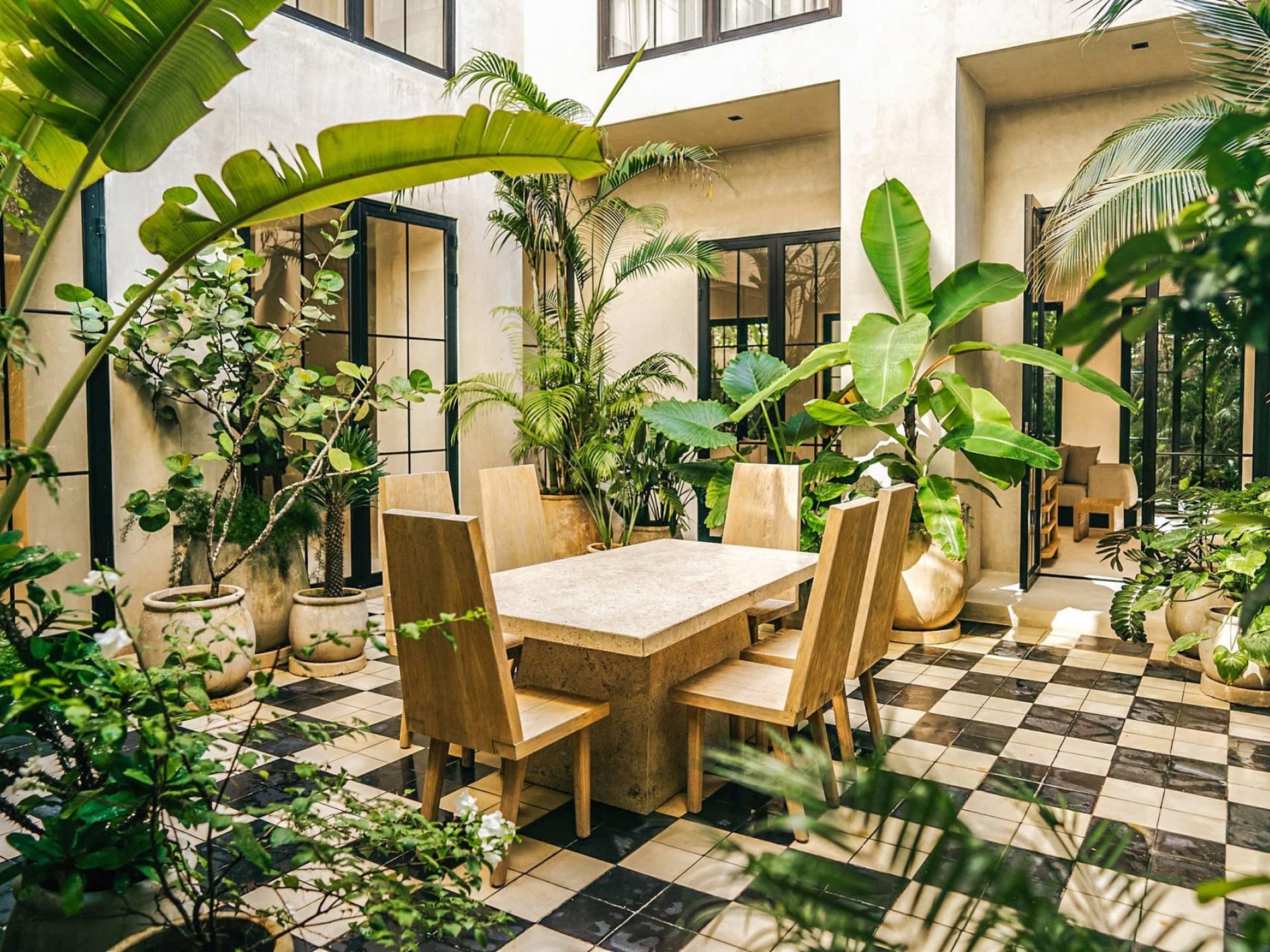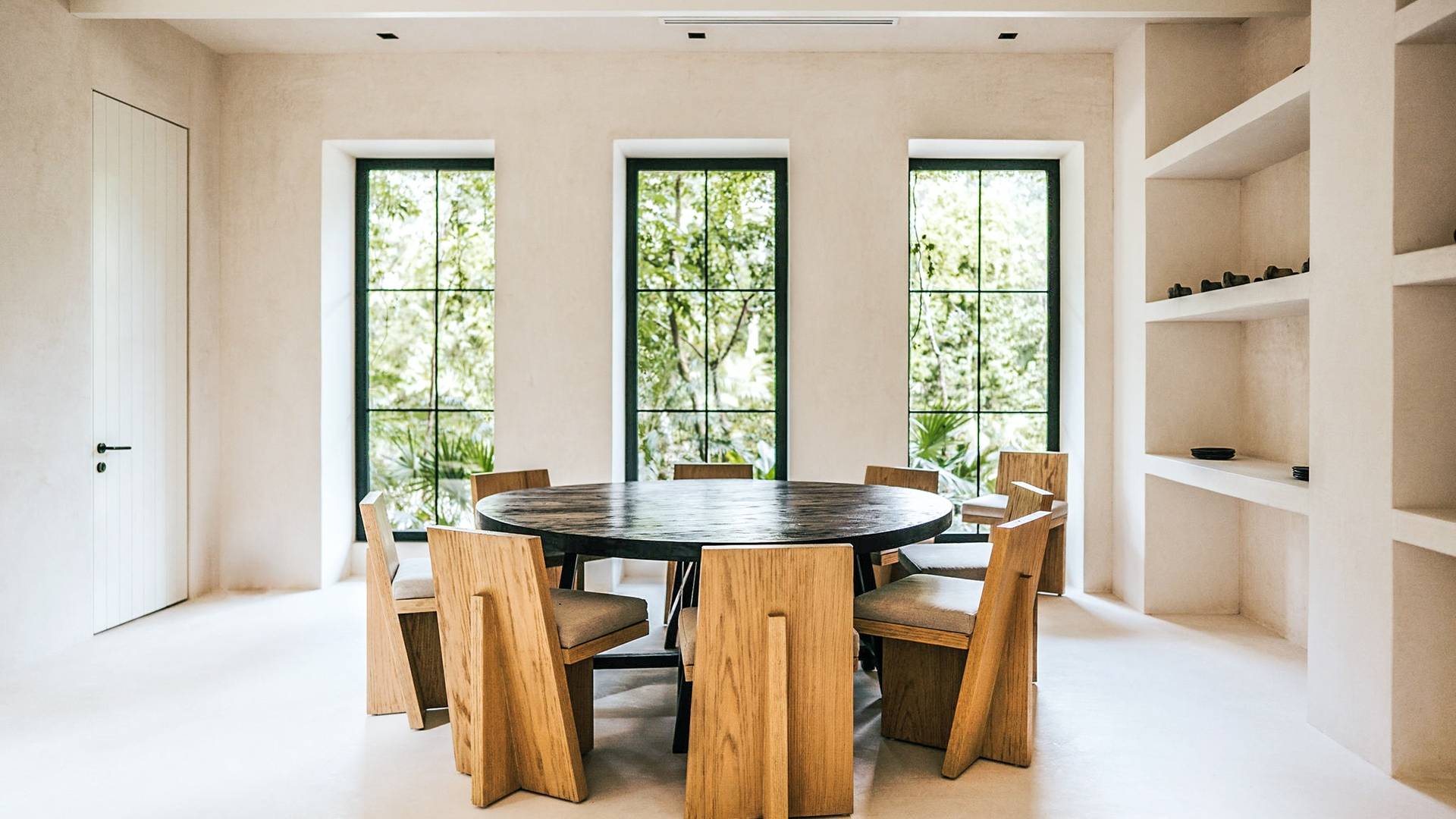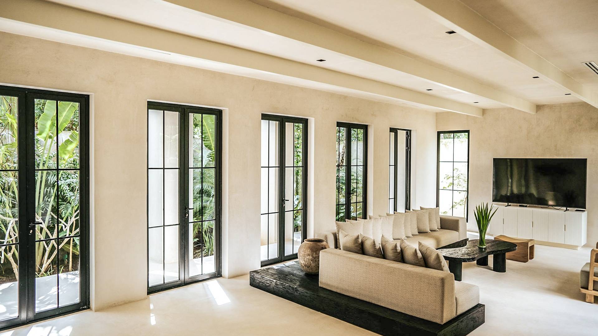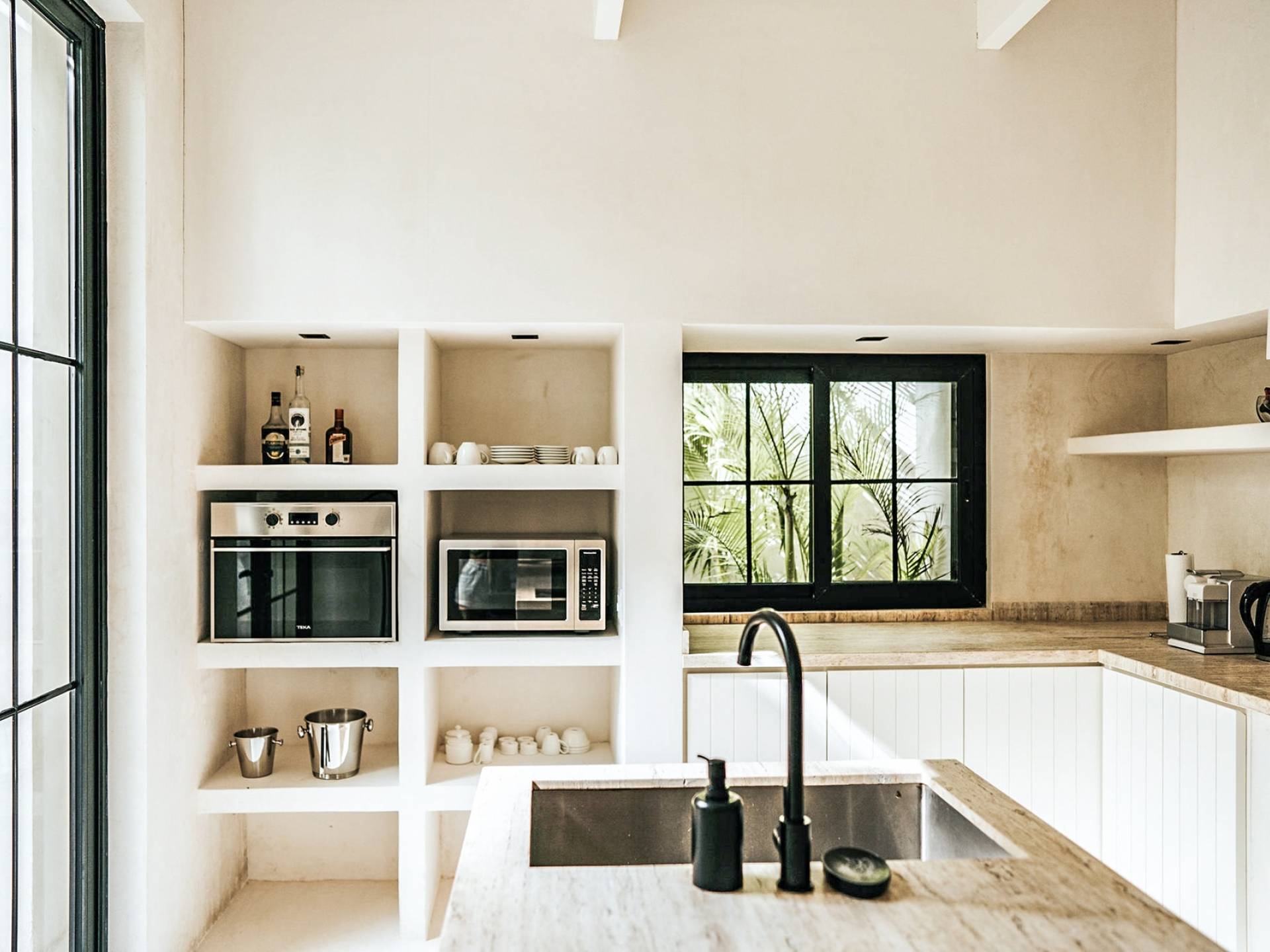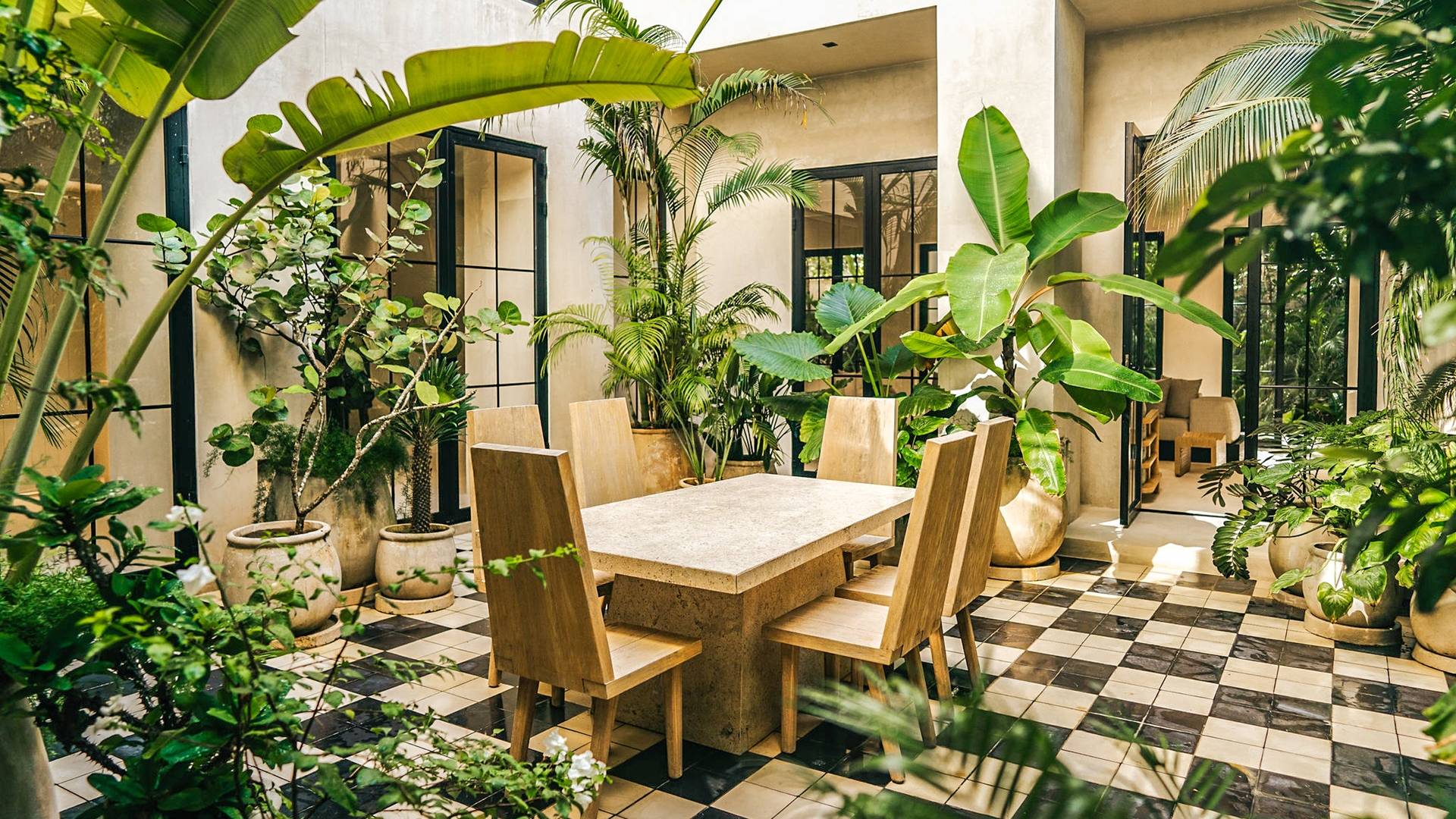 На полностью оборудованной кухне есть большой остров, обращенный к столовой, а умиротворяющая атмосфера гостиной сливается с внутренним двором в центре резиденции.