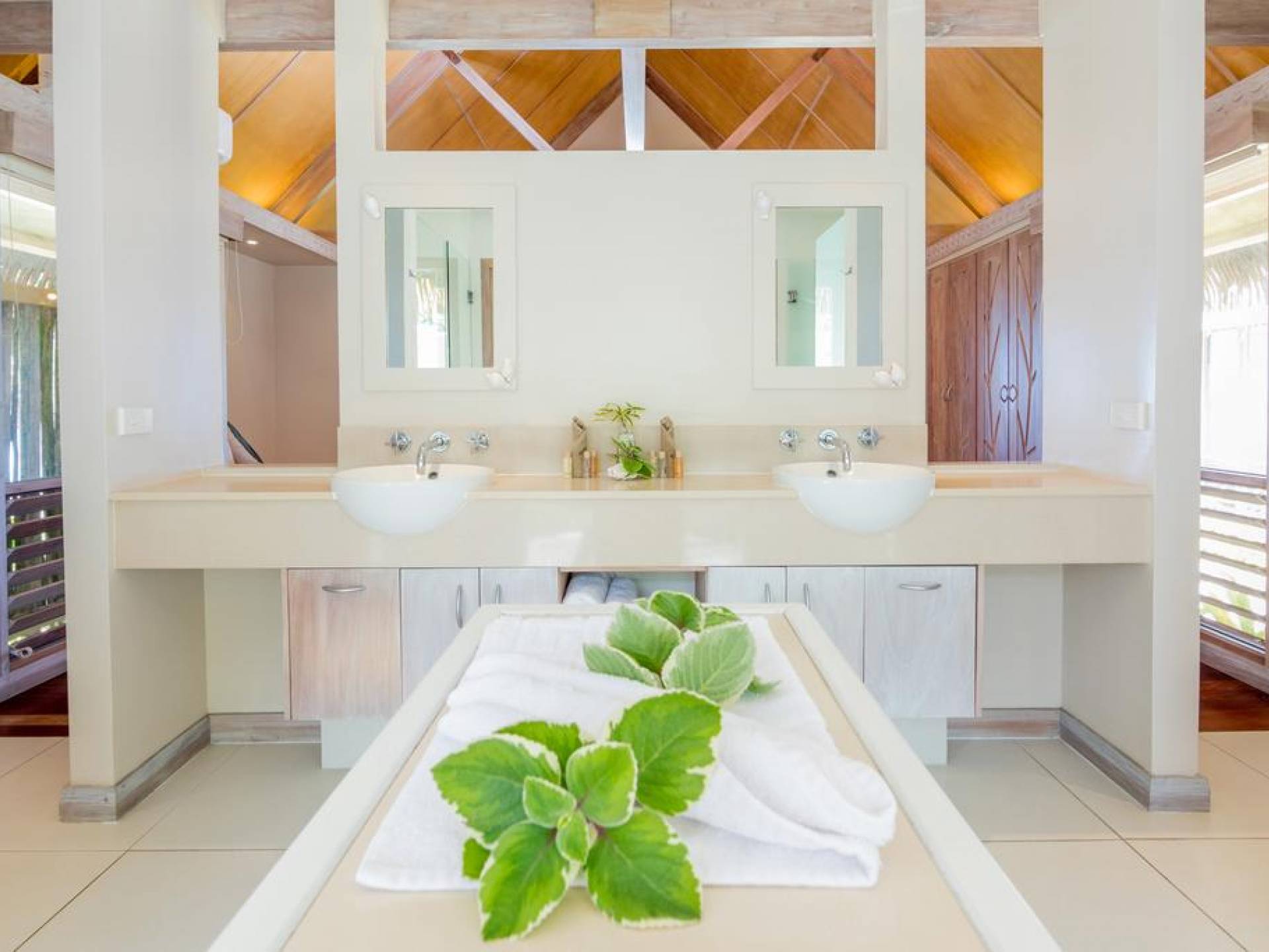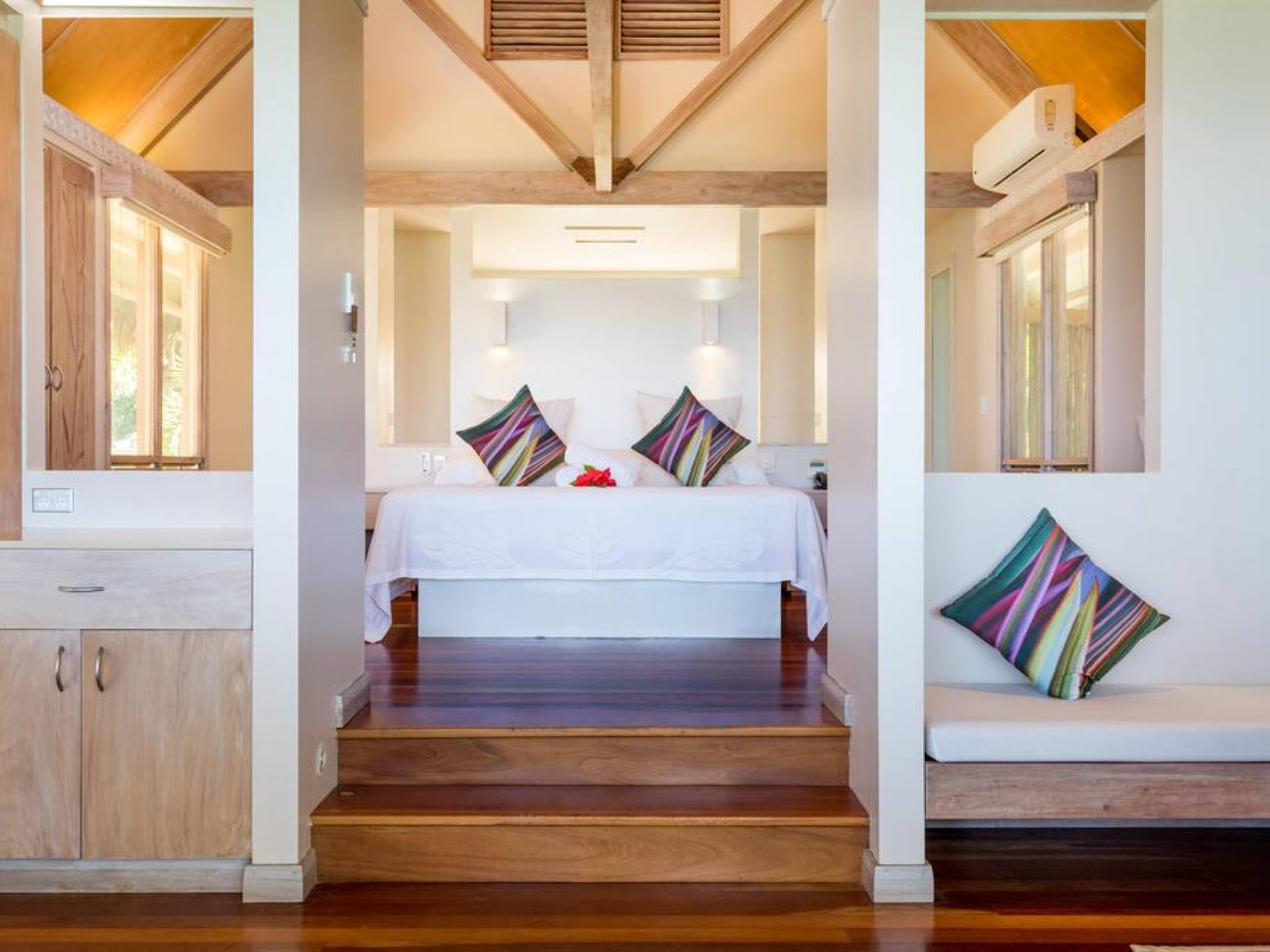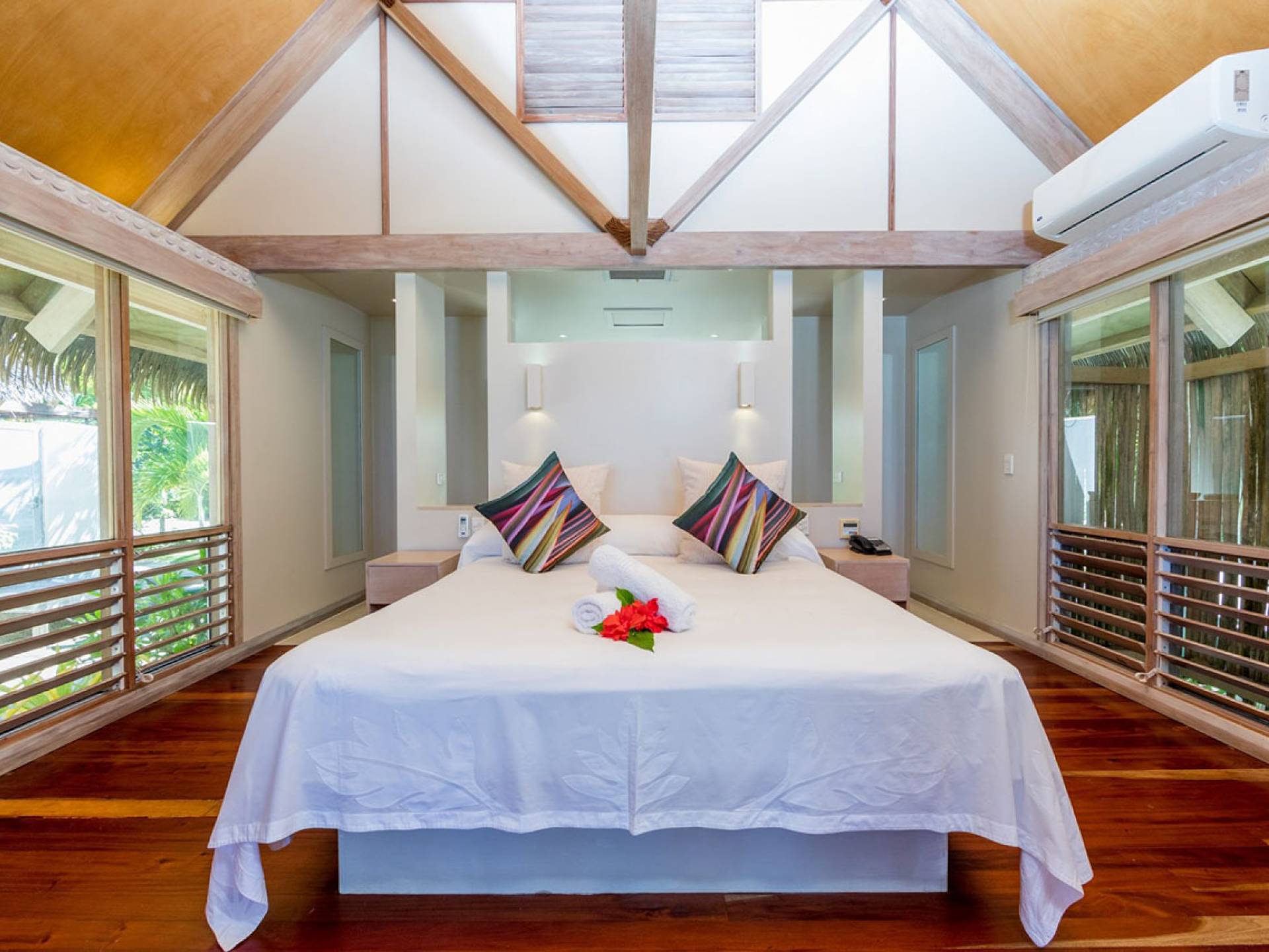 Кровать размера "king-size" идеально расположена, откуда открывается панорамный вид на бирюзовую лагуну, с лаунджами на нижнем уровне, каждая из которых оборудована кушеткой, развлекательной системой и небольшим диваном. Изысканная роскошная ванная комната с туалетным столиком для него и для нее с роскошным душем, который выходит в частный обнесенный стеной внутренний двор с дополнительным душем на открытом воздухе.