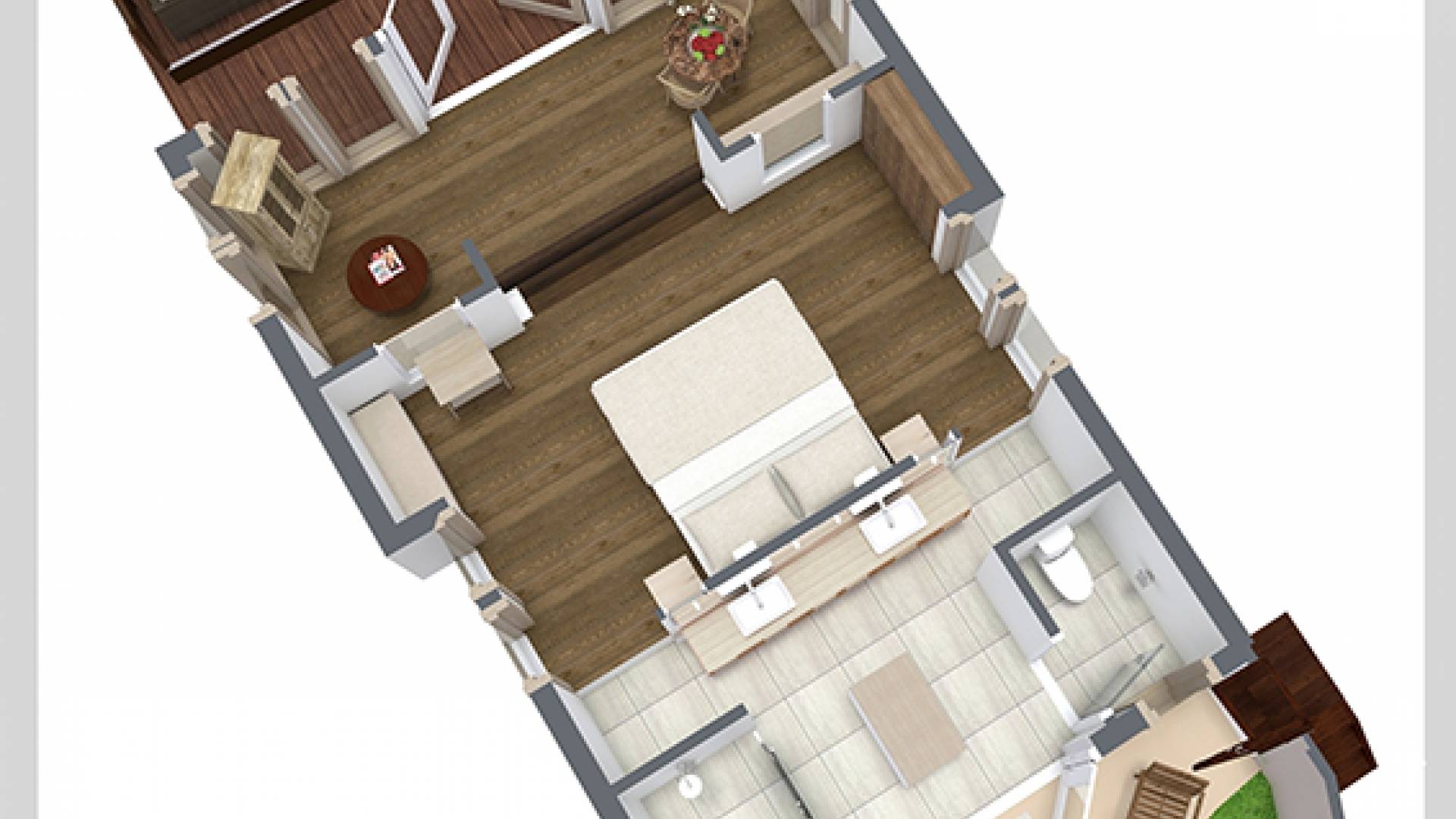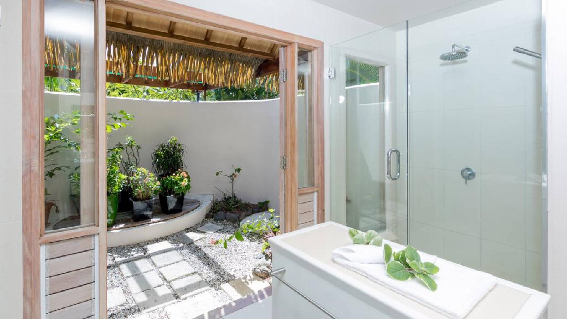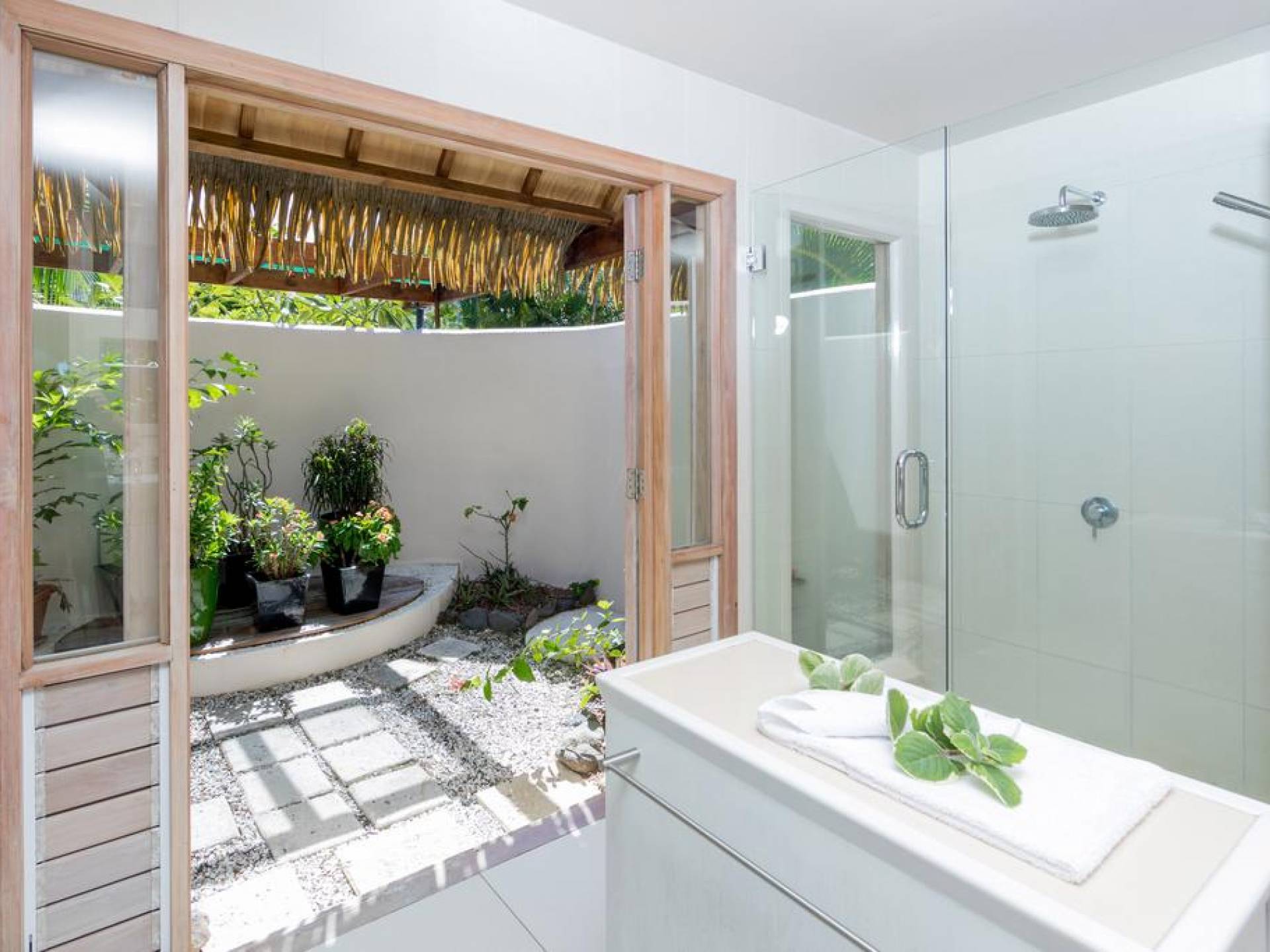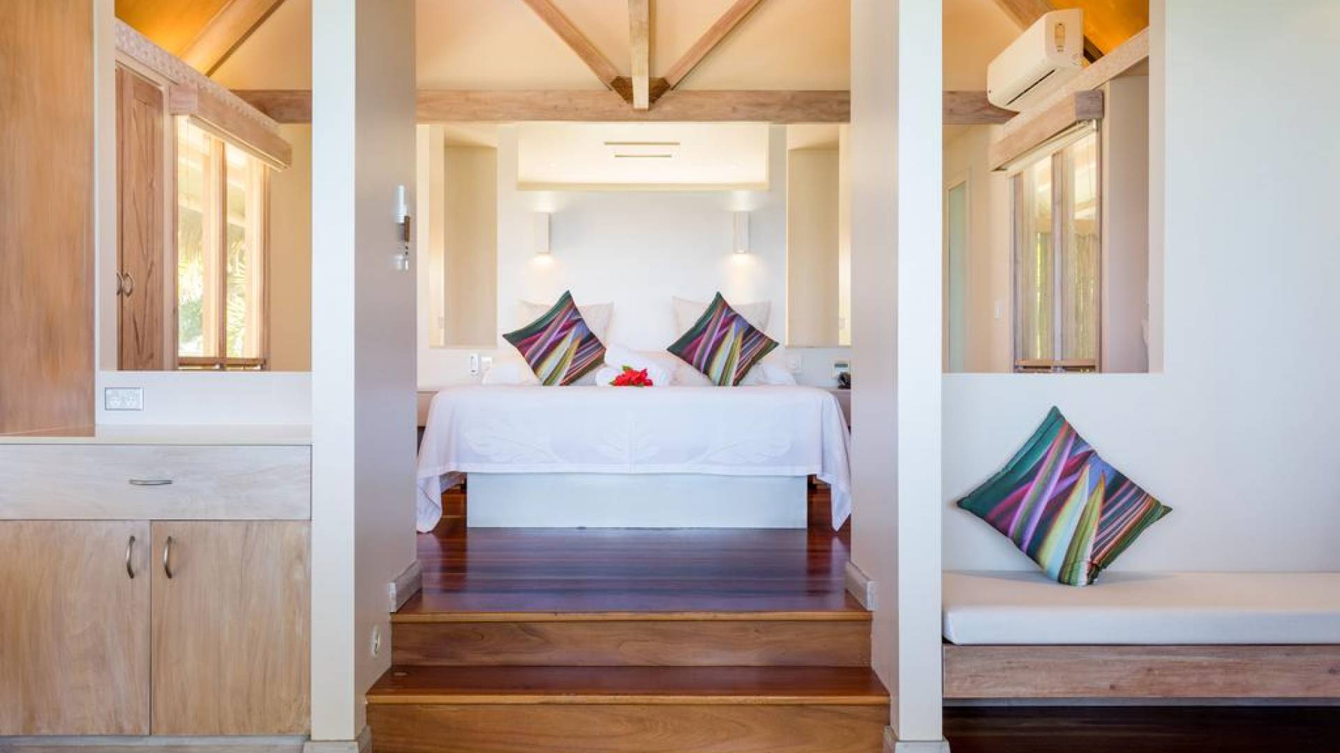 Кровать размера "king-size" идеально расположена, откуда открывается панорамный вид на бирюзовую лагуну, с лаунджами на нижнем уровне, каждая из которых оборудована кушеткой, развлекательной системой и небольшим диваном. Изысканная роскошная ванная комната с туалетным столиком для него и для нее с роскошным душем, который выходит в частный обнесенный стеной внутренний двор с дополнительным душем на открытом воздухе.