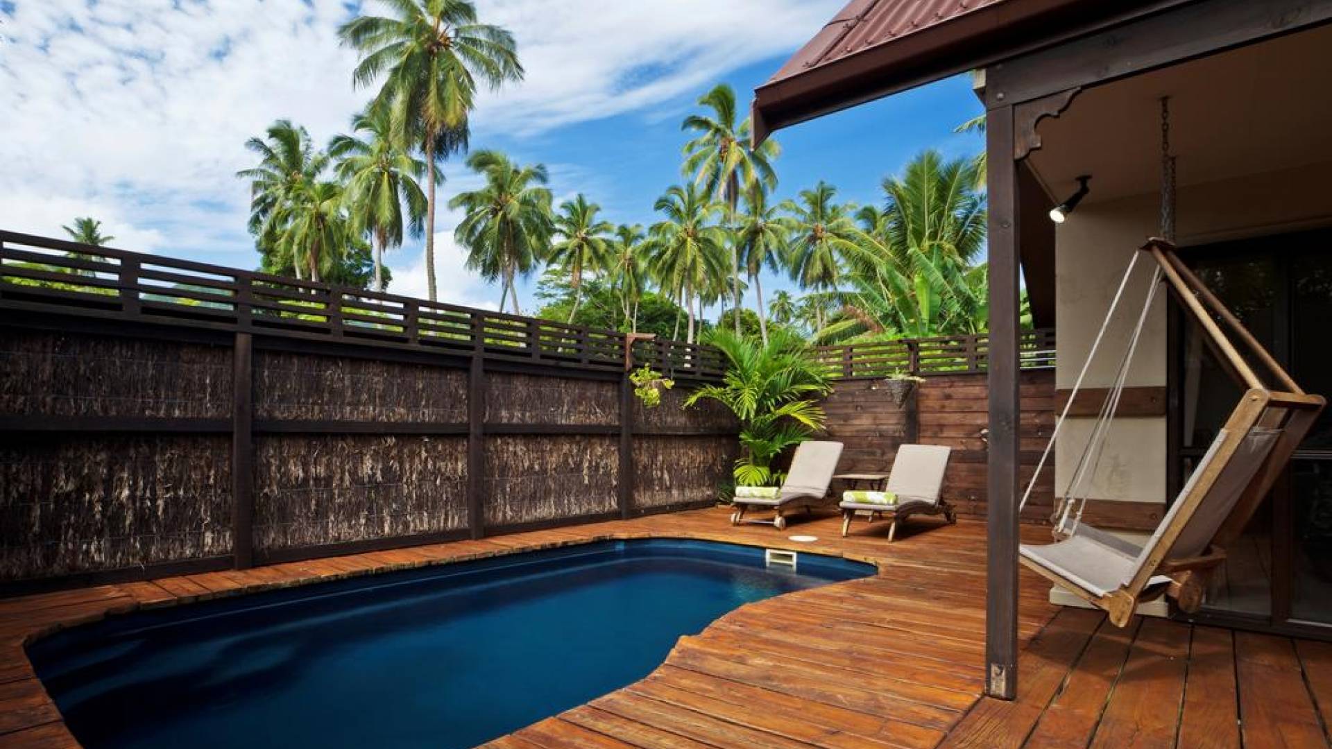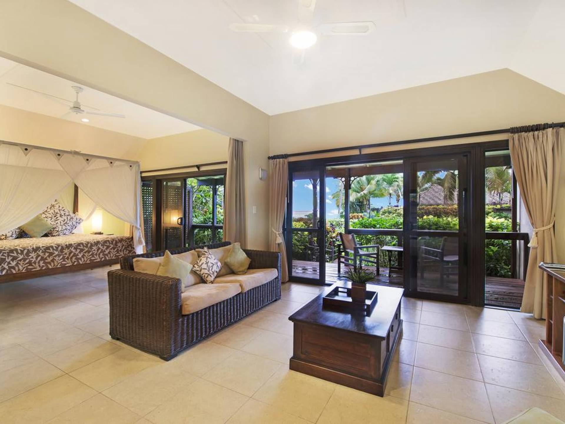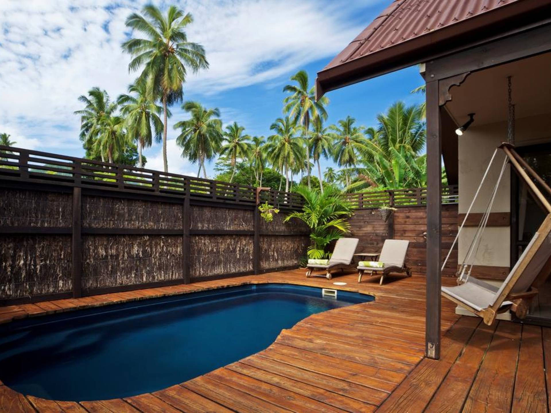 В спальнях установлены кровати размера "king-size" с балдахином, украшенные москитной сеткой. Просторные ванные комнаты с двухглавыми душевыми кабинами, выложенными фарфоровой плиткой, итальянскими туалетами и раковинами на пьедесталах. Ваш собственный бассейн с пресной водой спроектирован так, чтобы вы могли сидеть и наслаждаться освежающим прохладным напитком, купаясь и любуясь захватывающими видами на горы.