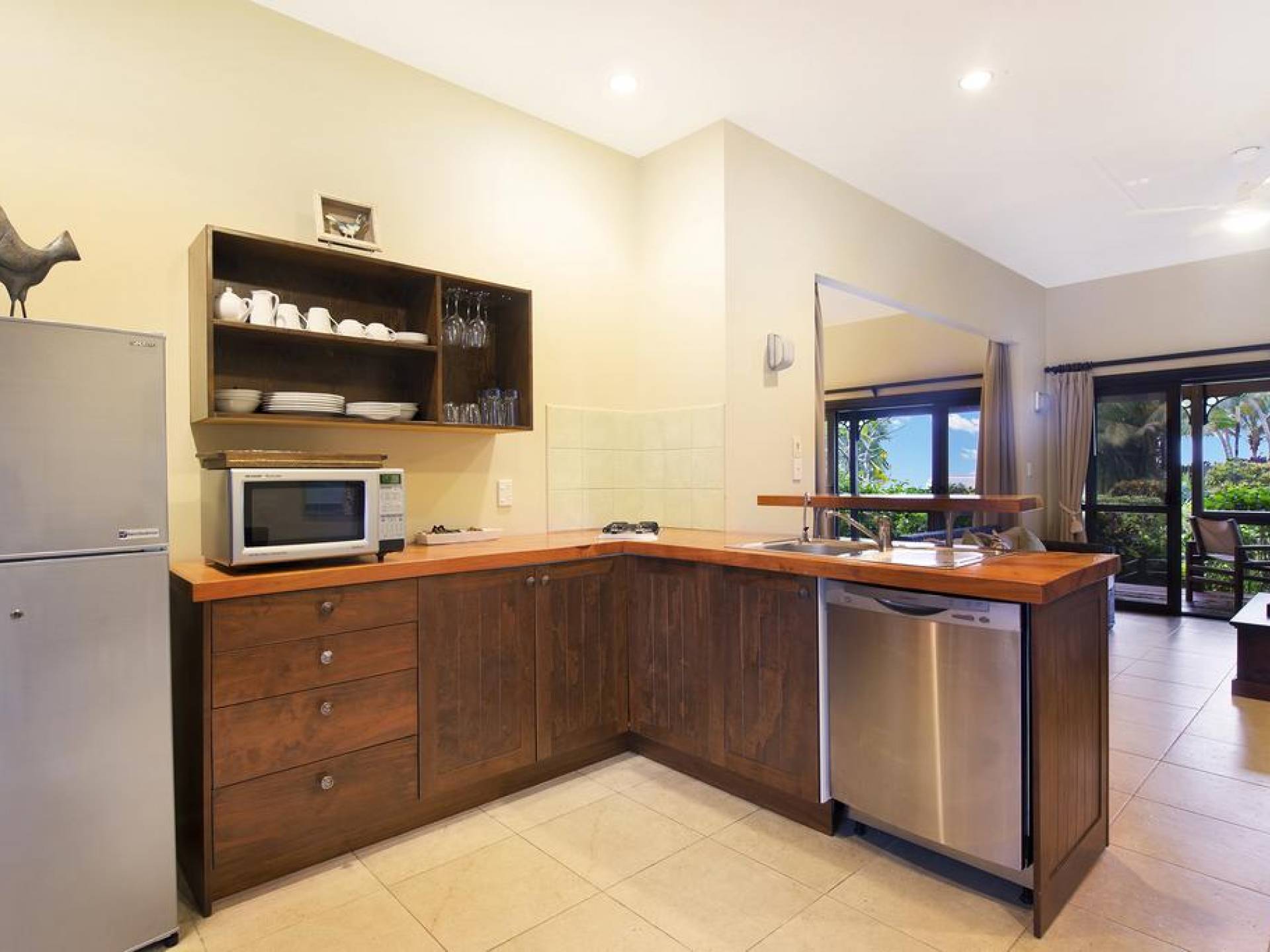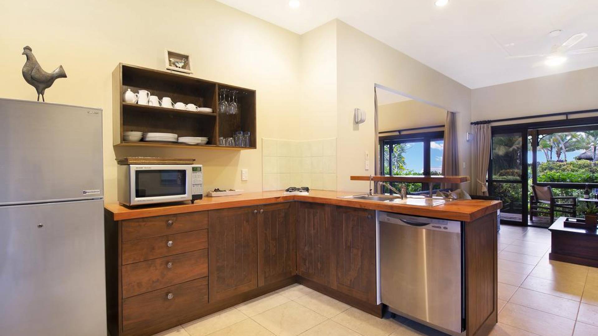На роскошных виллах есть полностью оборудованные дизайнерские кухни с посудомоечными машинами, холодильниками / морозильниками, конвекционными / микроволновыми печами и газовыми плитами. В гостиной есть домашний кинотеатр с бесплатными DVD и CD.
