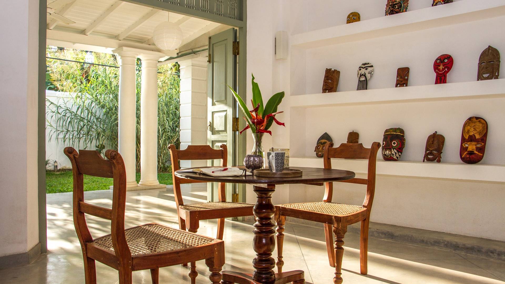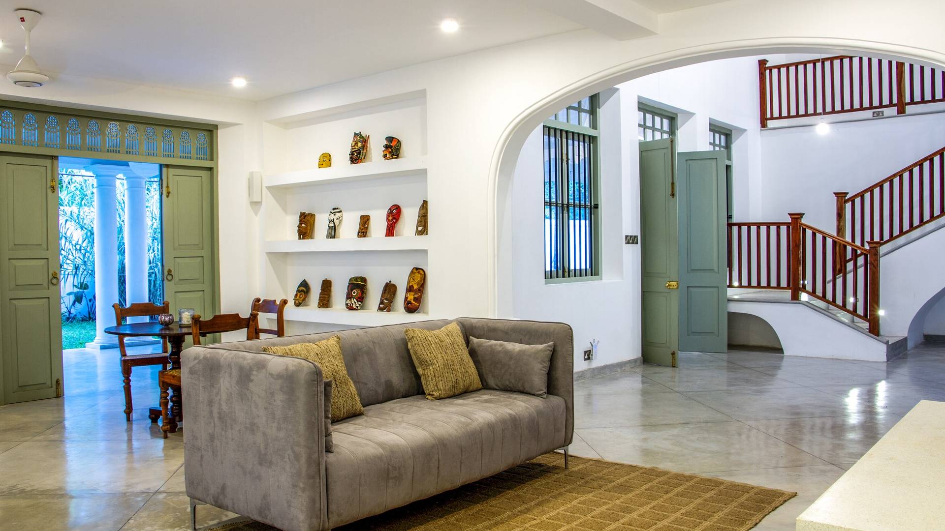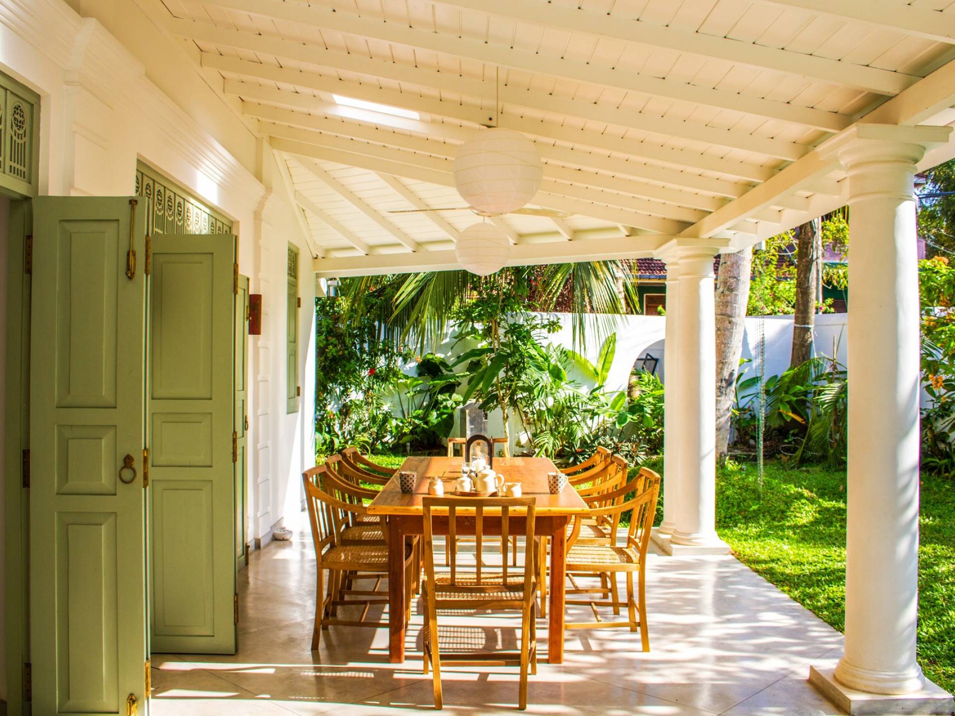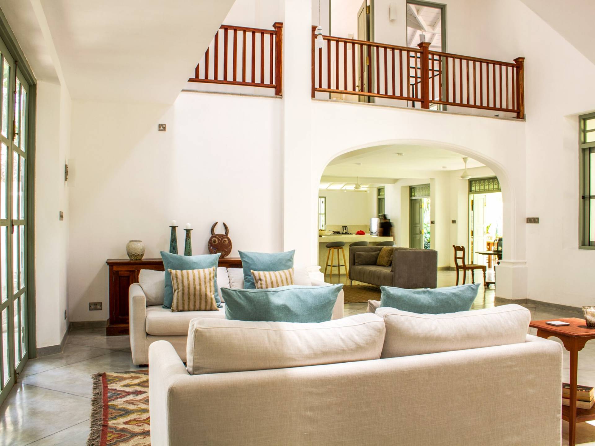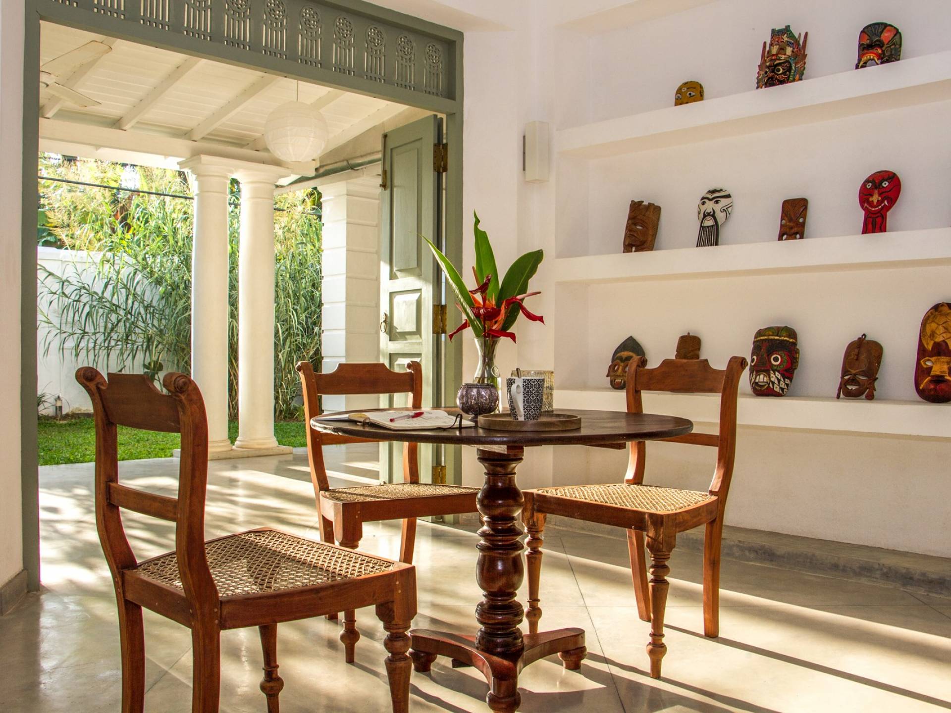 Главный дом является точным продолжением стиля, и его недавний ремонт проявляется в его современных удобствах и простых, но стильных интерьерах. Высокие потолки и перила из красного дерева создают ощущение элегантного колониализма. Войдя в главную гостиную, вы увидите два дивана и высокие французские окна, которые ведут на дорожку, ведущую к уединенной платформе для йоги или месту для медитации. Гостиная (с диваном и телевизором с плоским экраном) и жилая зона соединены с кухней открытой планировки и хорошо оборудованной. Отдельная прачечная и офис скрыты за высокими красивыми складскими дверями. Главная терраса проходит по всей длине виллы и обращена к ограниченному саду, обсаженному франжипани. Отличное место для трапезы и общего отдыха - это основное место приема пищи для всех гостей.