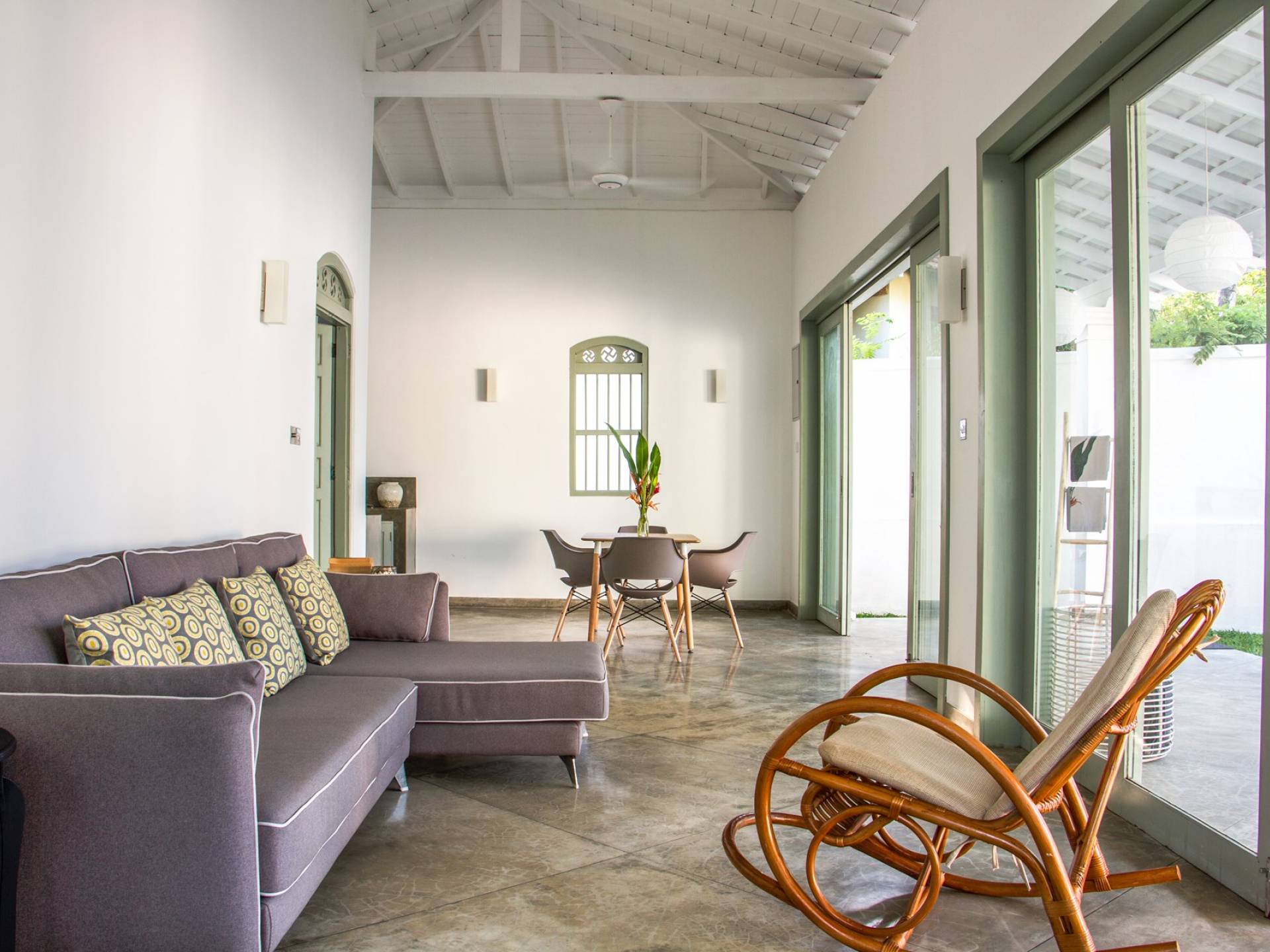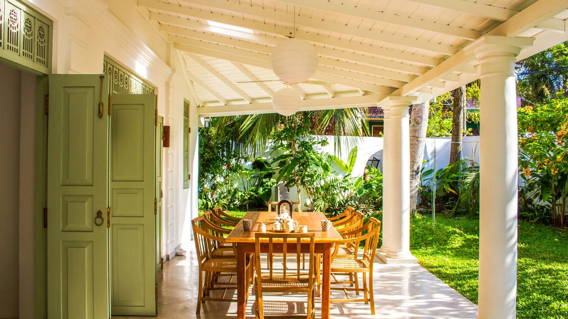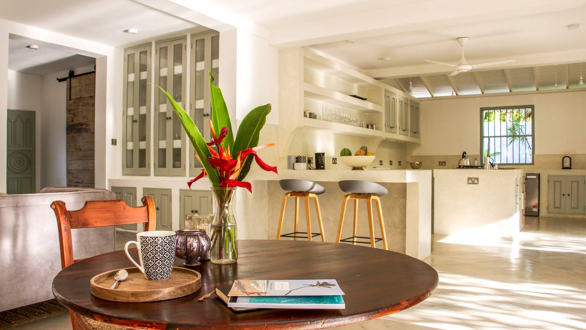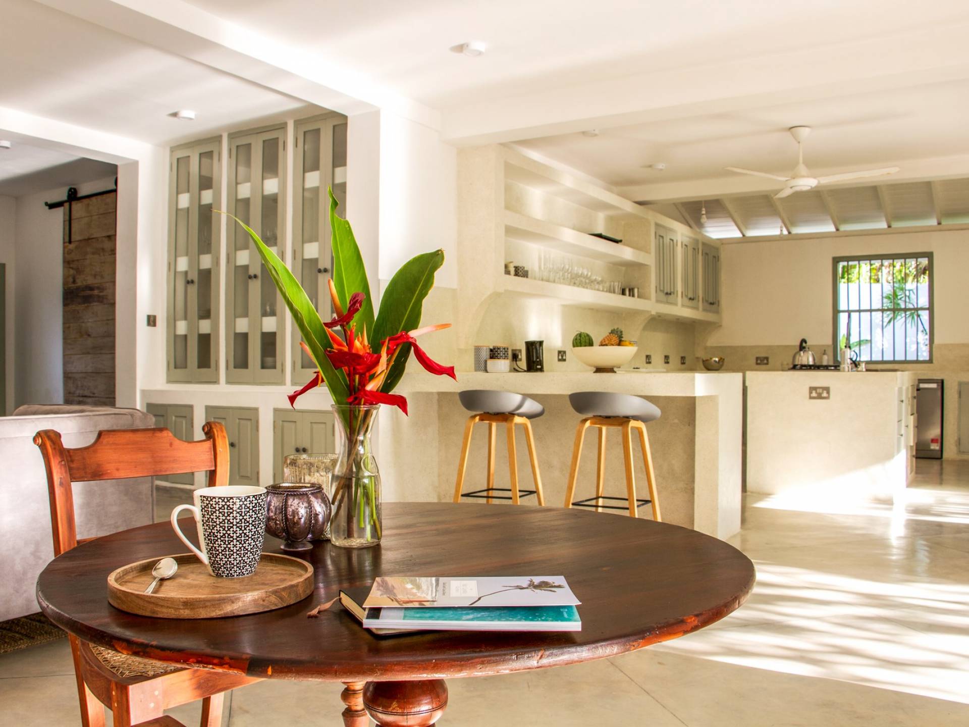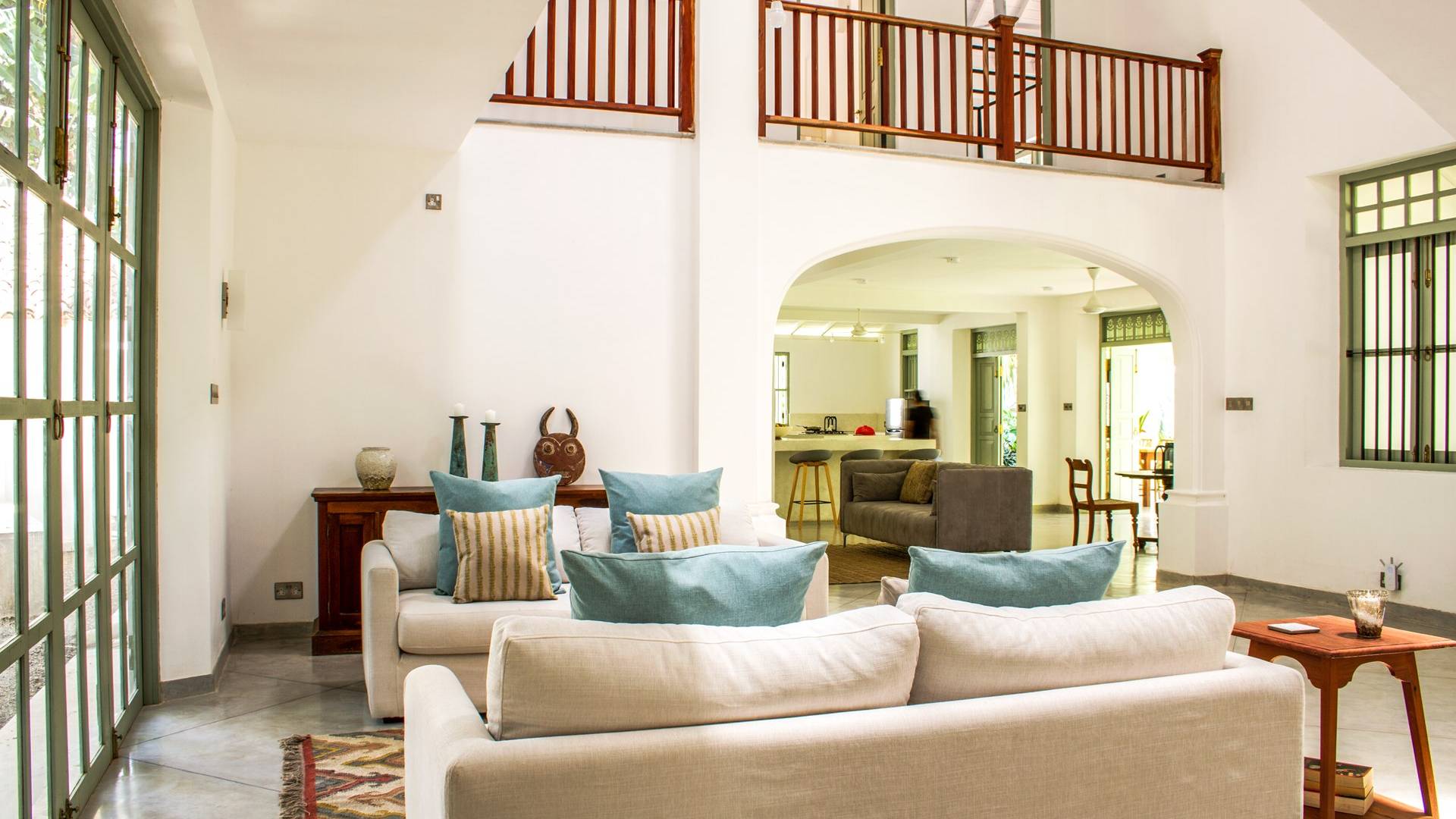 Главный дом является точным продолжением стиля, и его недавний ремонт проявляется в его современных удобствах и простых, но стильных интерьерах. Высокие потолки и перила из красного дерева создают ощущение элегантного колониализма. Войдя в главную гостиную, вы увидите два дивана и высокие французские окна, которые ведут на дорожку, ведущую к уединенной платформе для йоги или месту для медитации. Гостиная (с диваном и телевизором с плоским экраном) и жилая зона соединены с кухней открытой планировки и хорошо оборудованной. Отдельная прачечная и офис скрыты за высокими красивыми складскими дверями. Главная терраса проходит по всей длине виллы и обращена к ограниченному саду, обсаженному франжипани. Отличное место для трапезы и общего отдыха - это основное место приема пищи для всех гостей.