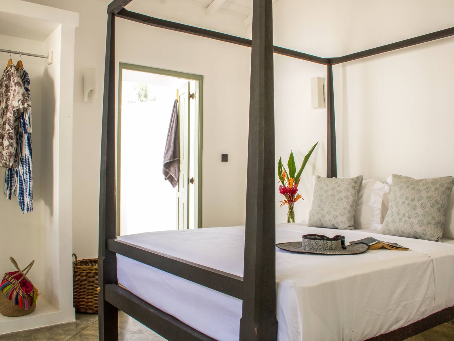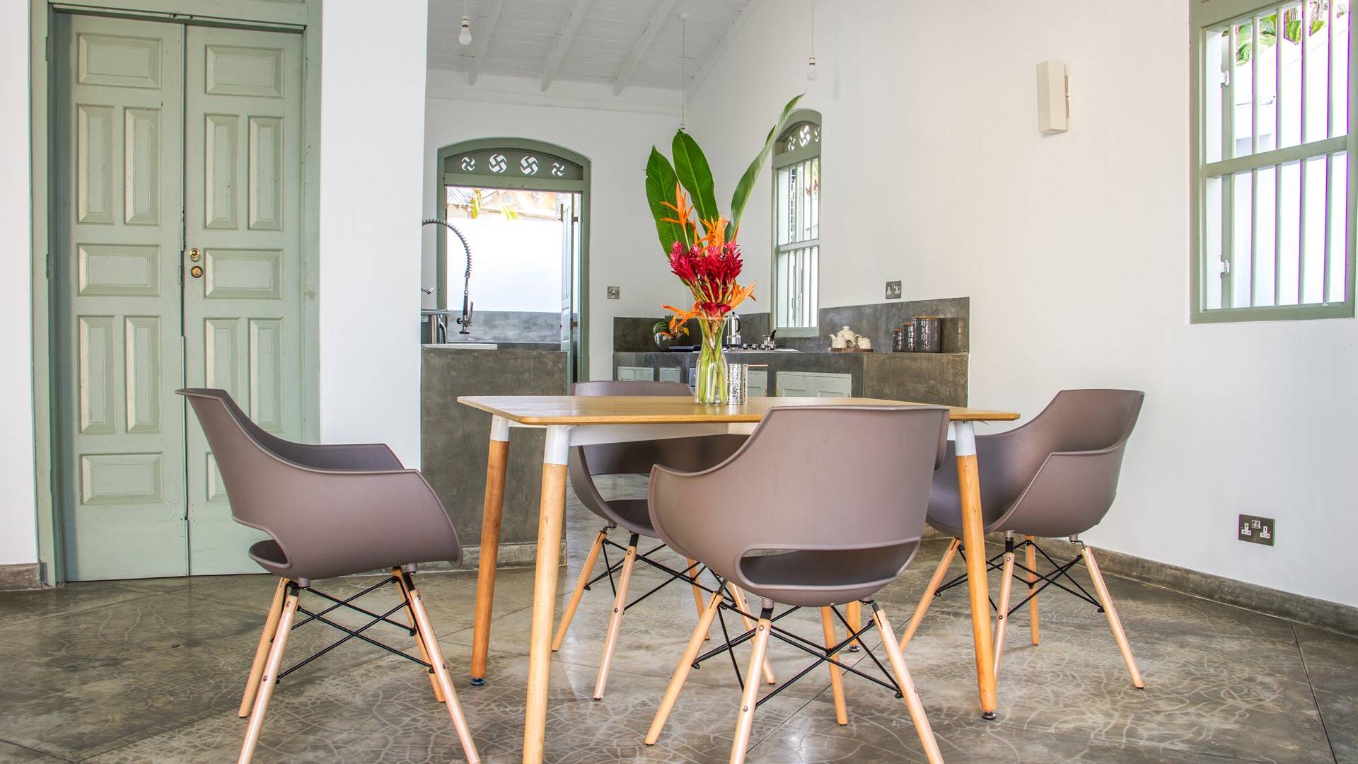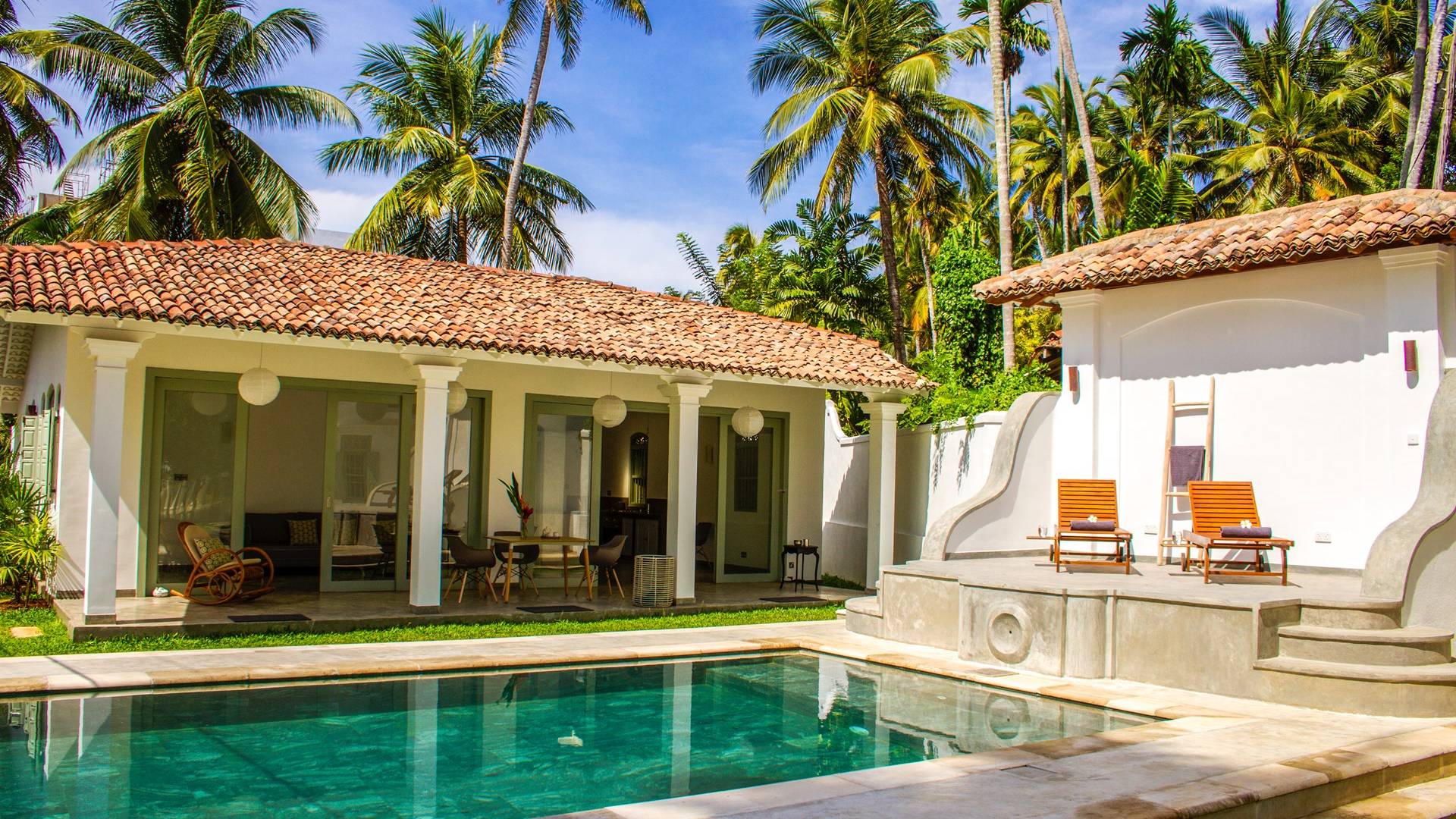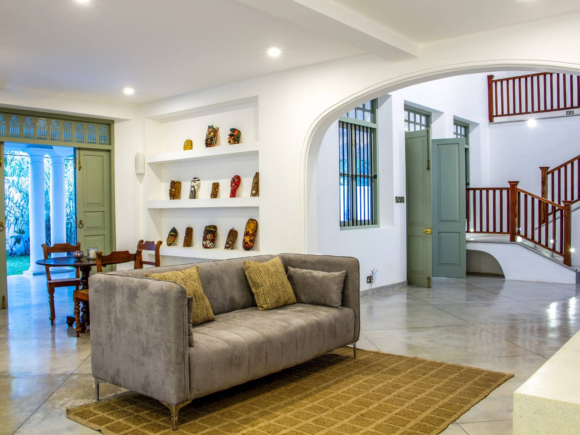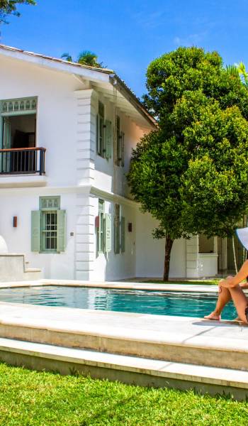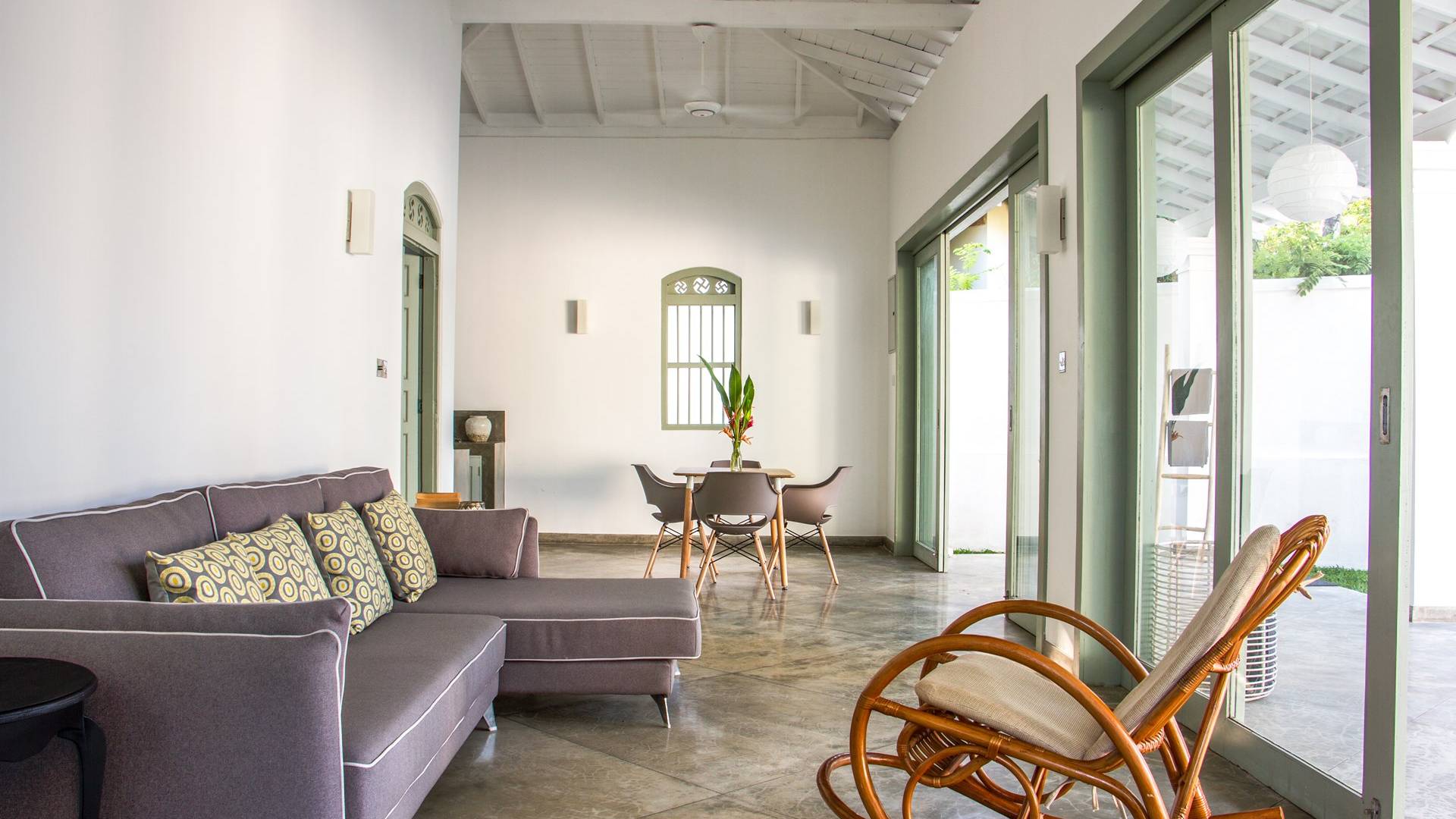 Главный дом является точным продолжением стиля, и его недавний ремонт проявляется в его современных удобствах и простых, но стильных интерьерах. Высокие потолки и перила из красного дерева создают ощущение элегантного колониализма. Войдя в главную гостиную, вы увидите два дивана и высокие французские окна, которые ведут на дорожку, ведущую к уединенной платформе для йоги или месту для медитации. Гостиная (с диваном и телевизором с плоским экраном) и жилая зона соединены с кухней открытой планировки и хорошо оборудованной. Отдельная прачечная и офис скрыты за высокими красивыми складскими дверями. Главная терраса проходит по всей длине виллы и обращена к ограниченному саду, обсаженному франжипани. Отличное место для трапезы и общего отдыха - это основное место приема пищи для всех гостей.
