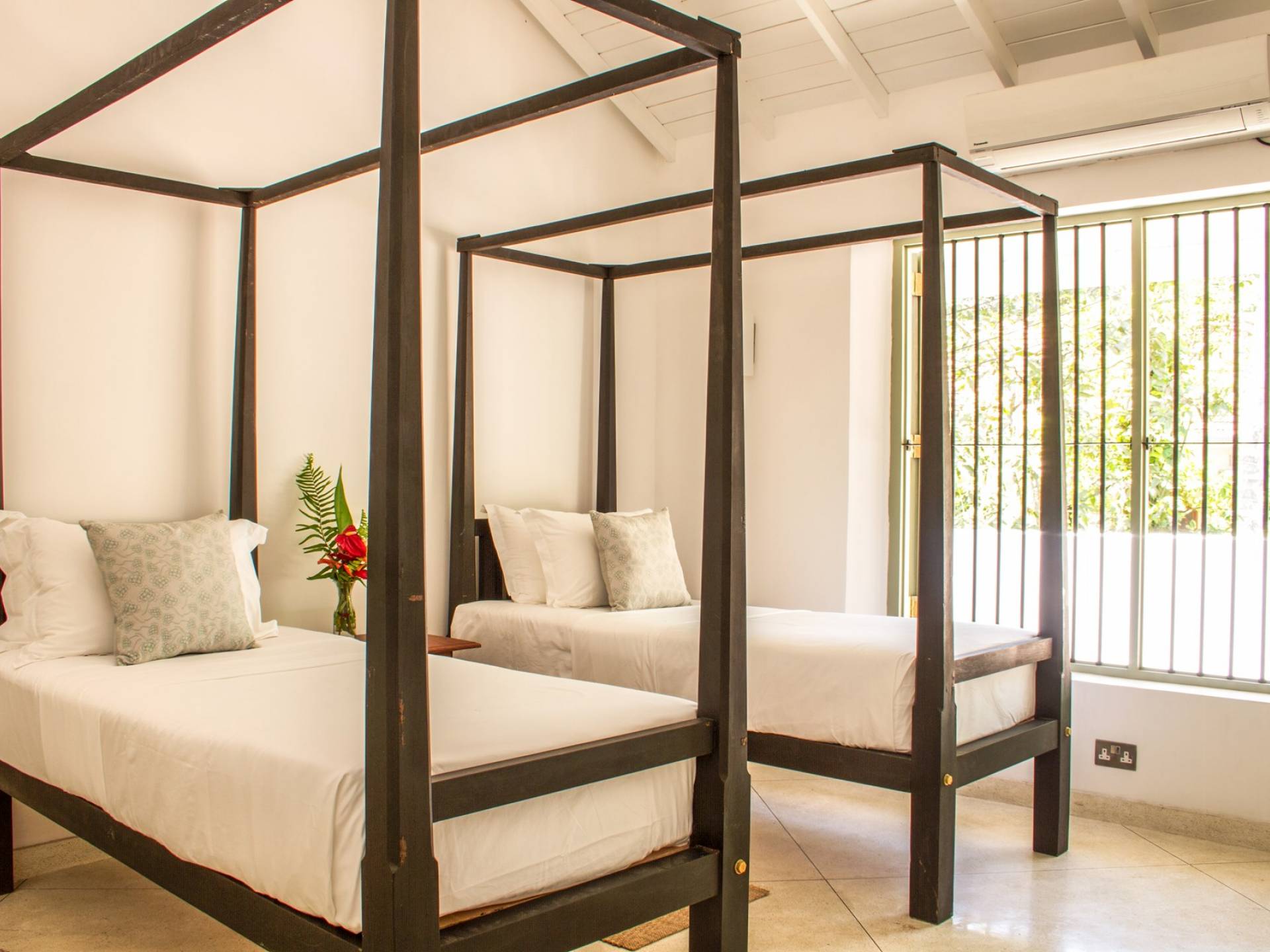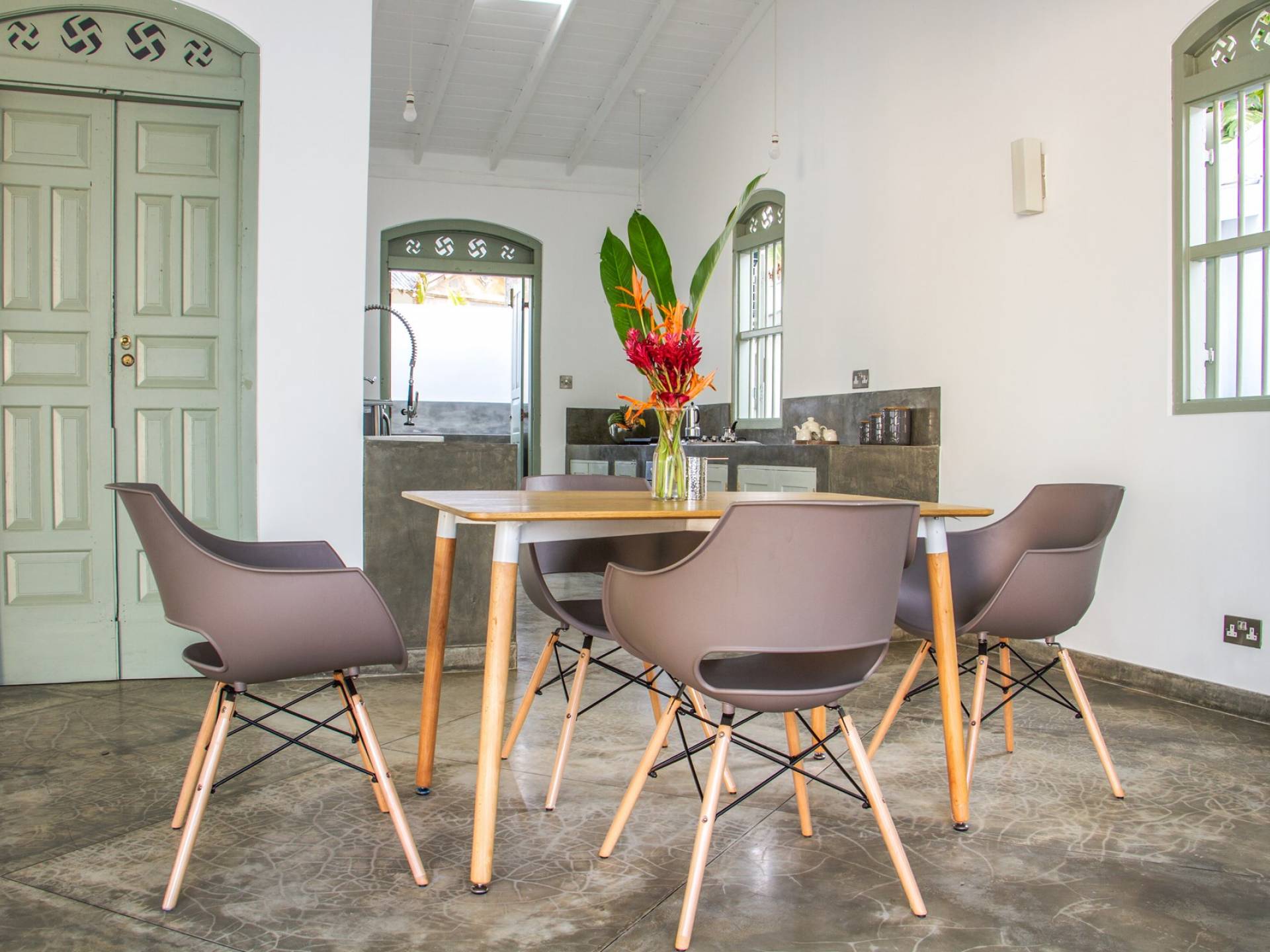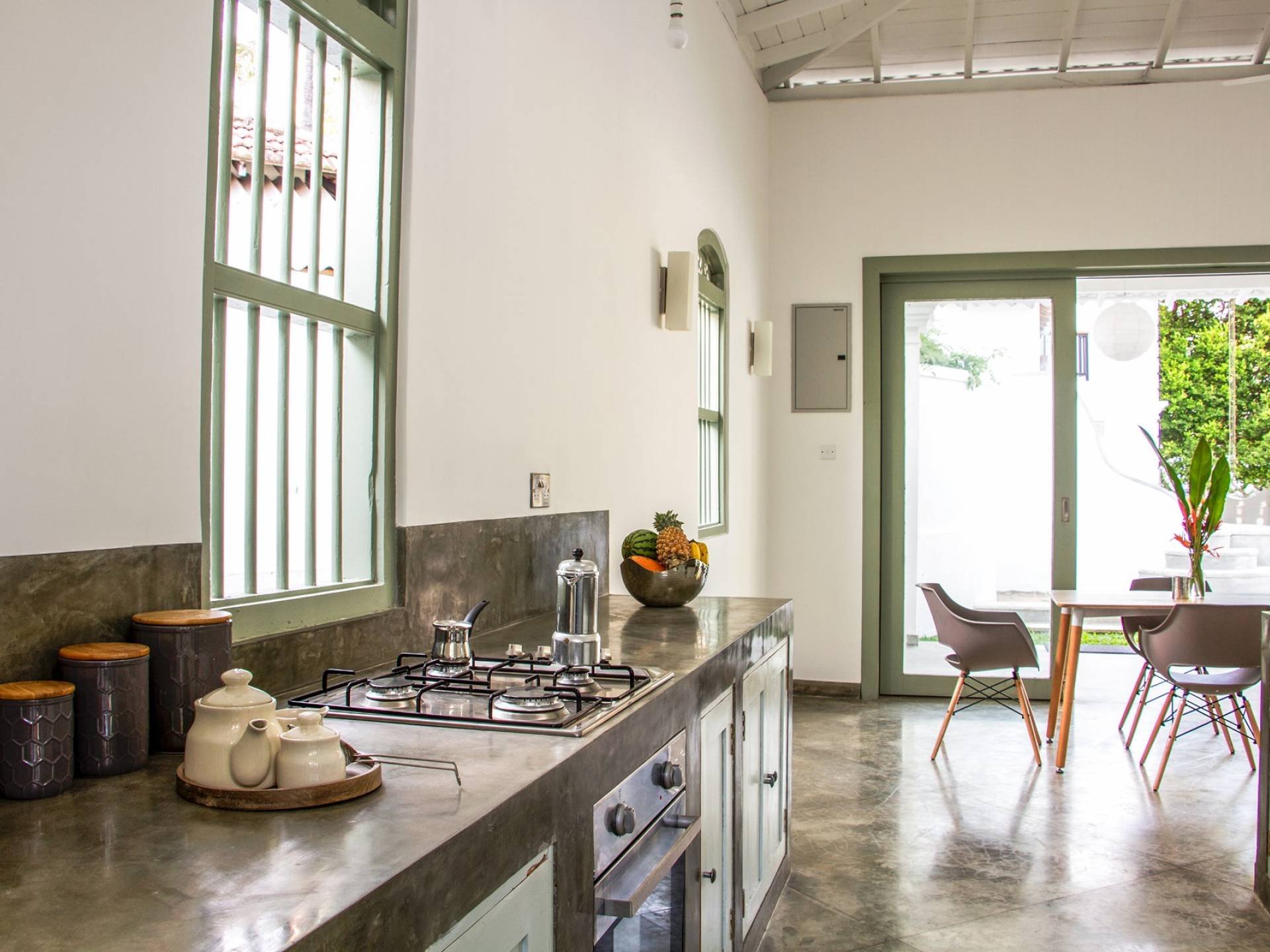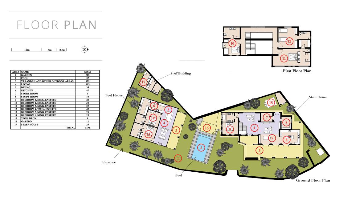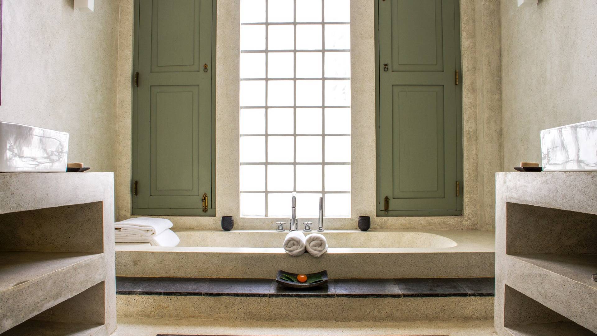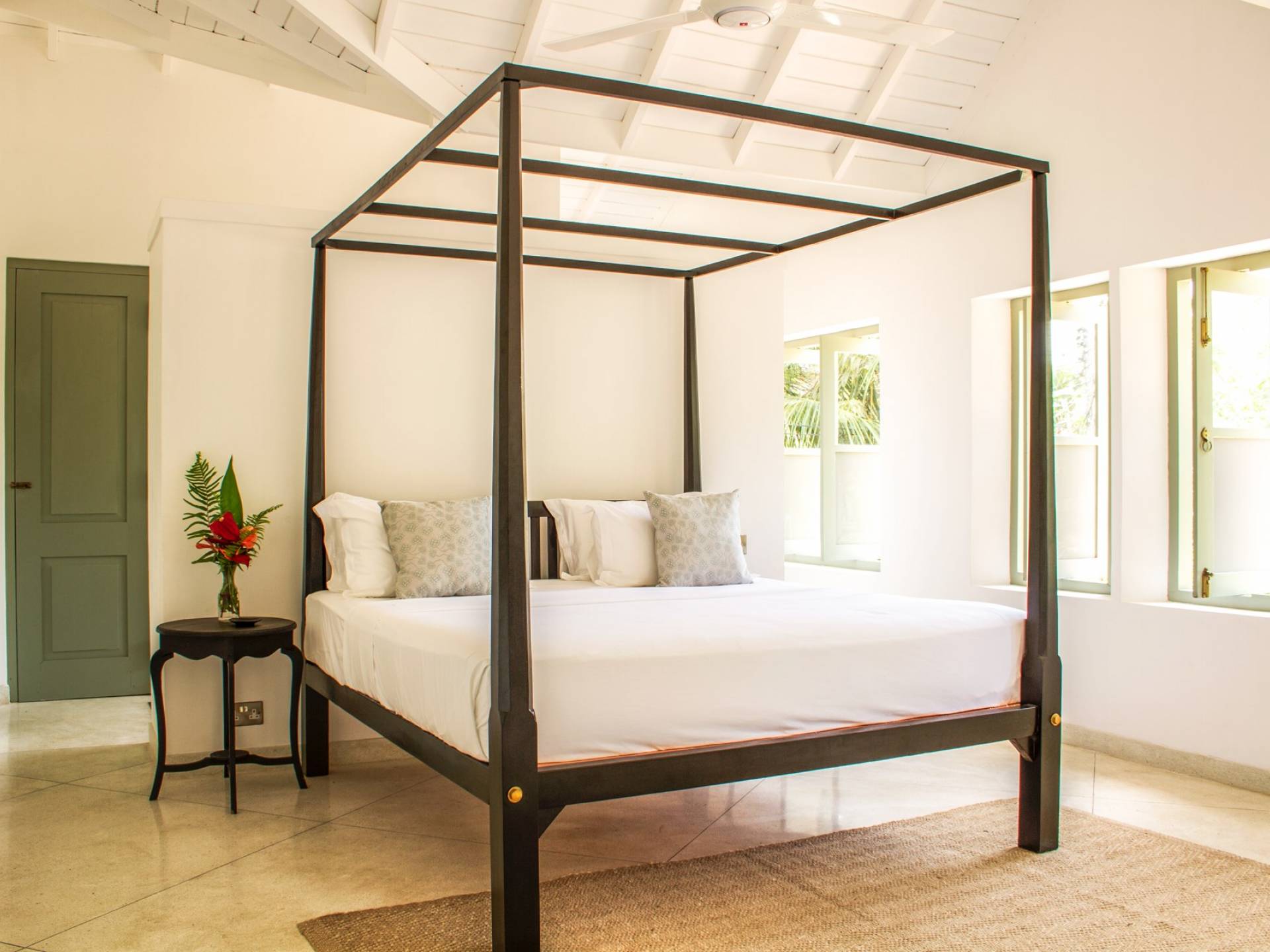 Главный дом является точным продолжением стиля, и его недавний ремонт проявляется в его современных удобствах и простых, но стильных интерьерах. Высокие потолки и перила из красного дерева создают ощущение элегантного колониализма. Войдя в главную гостиную, вы увидите два дивана и высокие французские окна, которые ведут на дорожку, ведущую к уединенной платформе для йоги или месту для медитации. Гостиная (с диваном и телевизором с плоским экраном) и жилая зона соединены с кухней открытой планировки и хорошо оборудованной. Отдельная прачечная и офис скрыты за высокими красивыми складскими дверями. Главная терраса проходит по всей длине виллы и обращена к ограниченному саду, обсаженному франжипани. Отличное место для трапезы и общего отдыха - это основное место приема пищи для всех гостей.