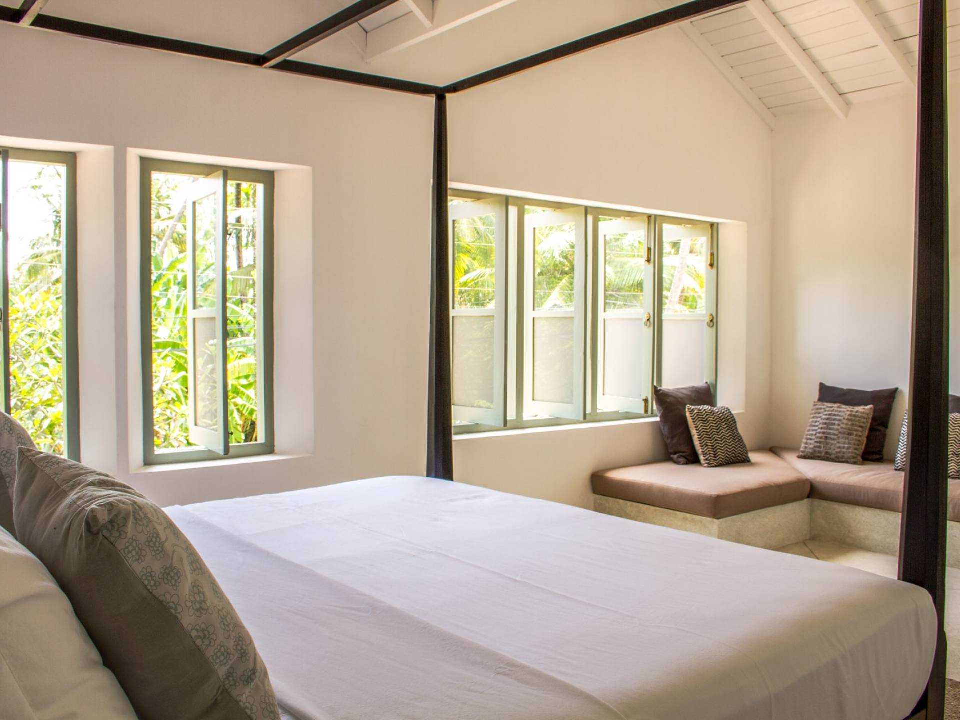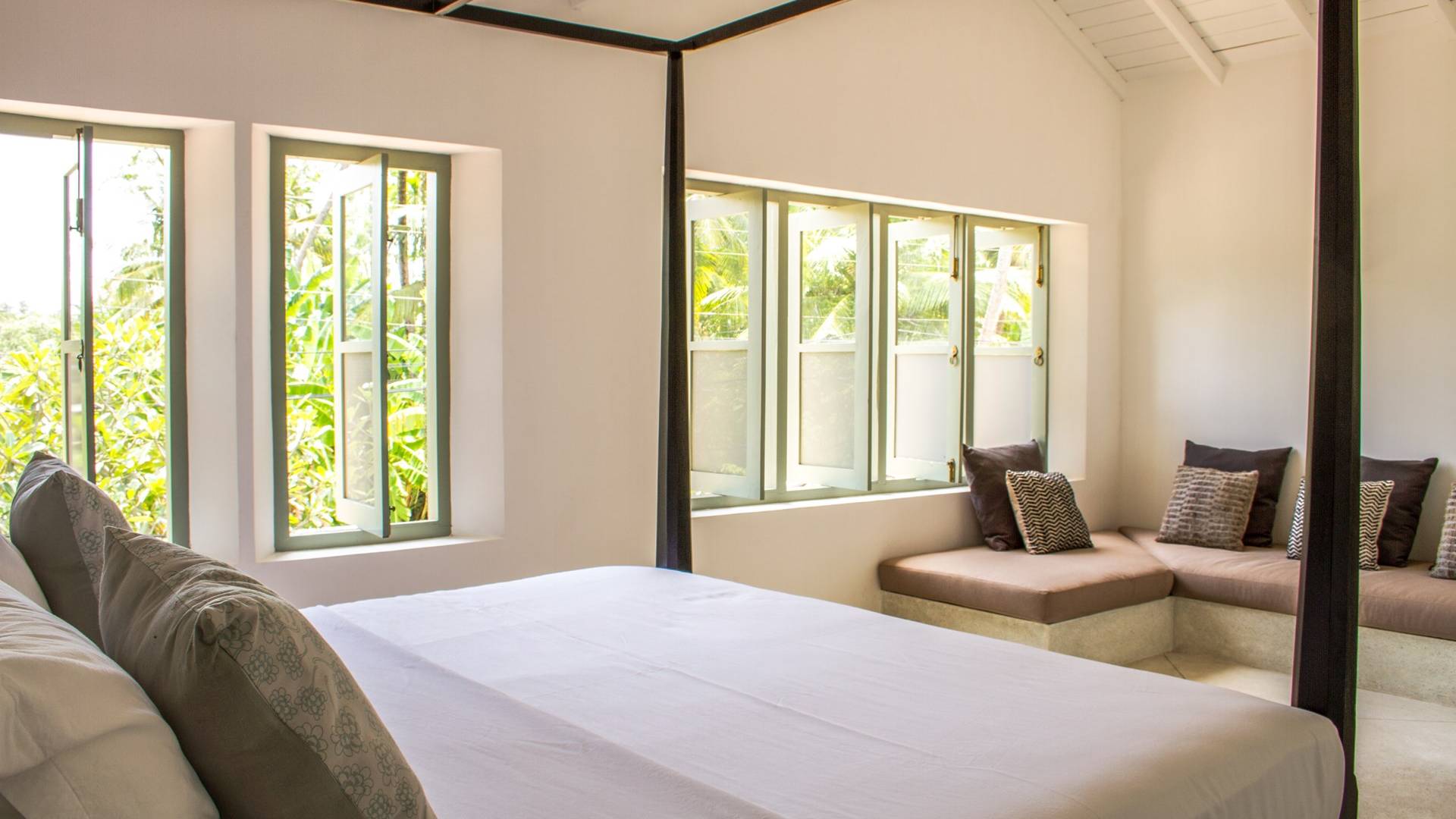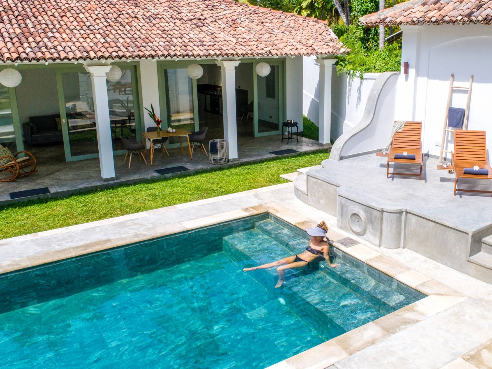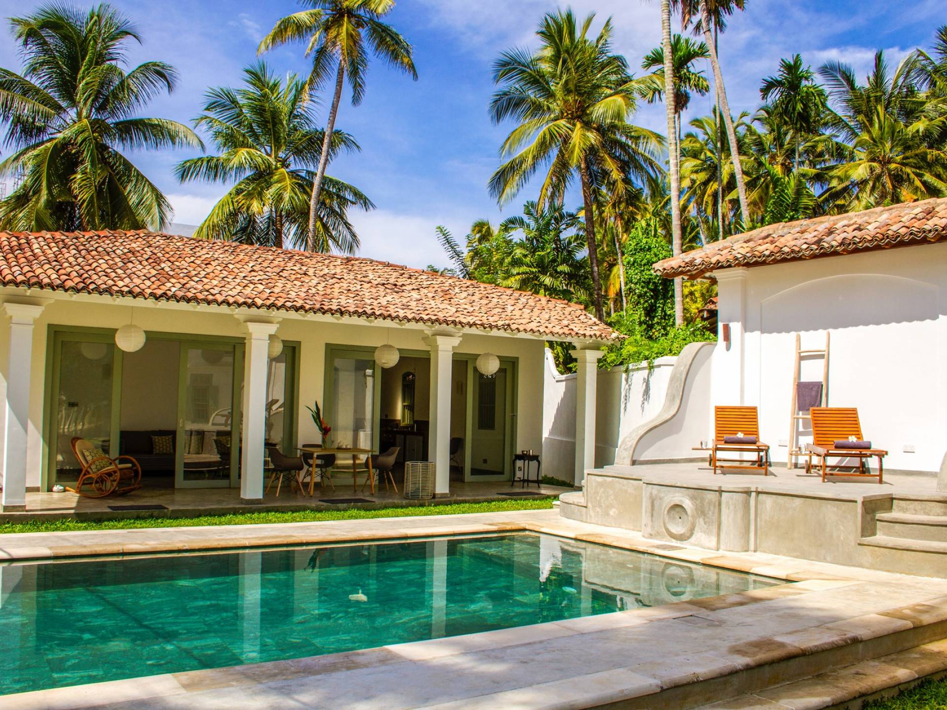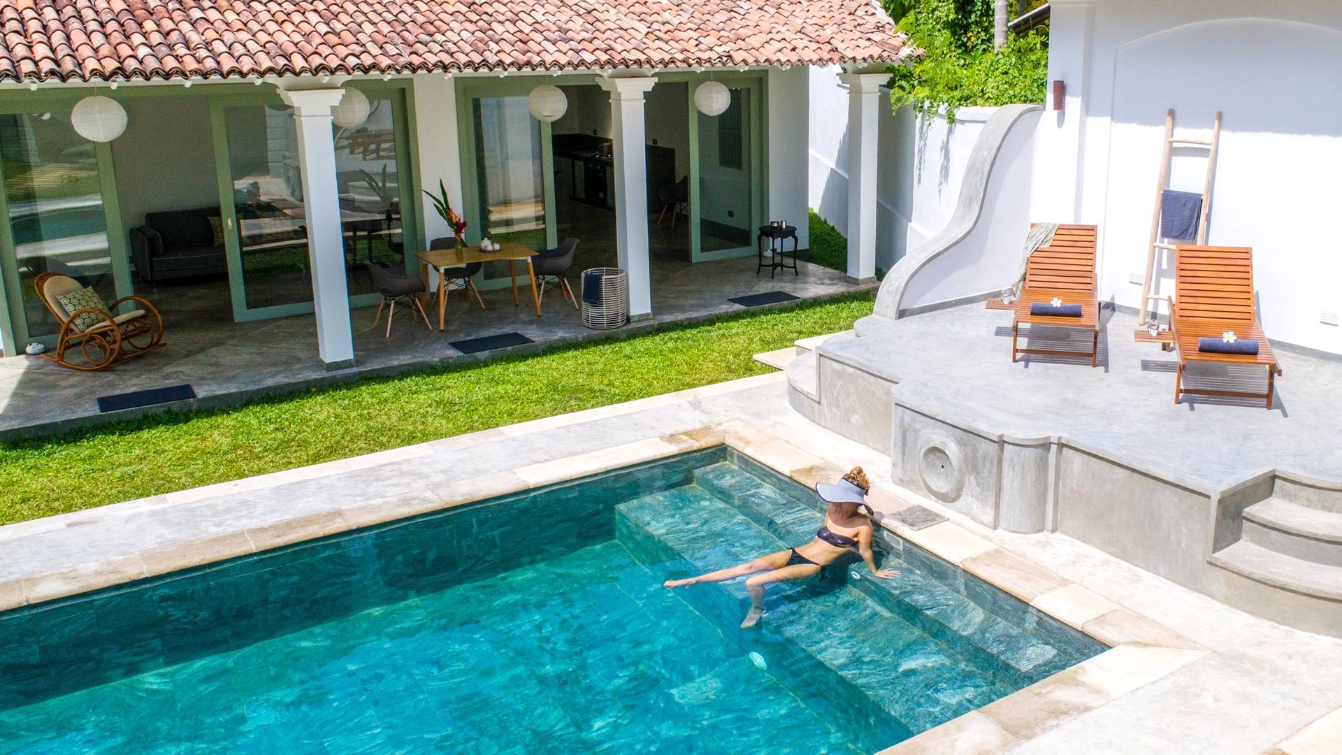 По прибытии в Wijaya Giri вы сначала попадаете в дом у бассейна, который включает в себя две спальни с двуспальными кроватями, гостиную открытой планировки и кухню-камбуз. В спальнях есть собственные крытые/открытые ванные комнаты с душевыми кабинами. Интерьер везде одинаковый, с чистыми свежими белыми стенами и прекрасным пастельно-зеленым цветом дверных и оконных рам. Большой L-образный диван в общей гостиной смотрит через высокие французские окна на бассейн, который расположен между этим домом и главной виллой, и имеет платформу для загара или экран проектора, чтобы скоротать день. смотрю крикет!