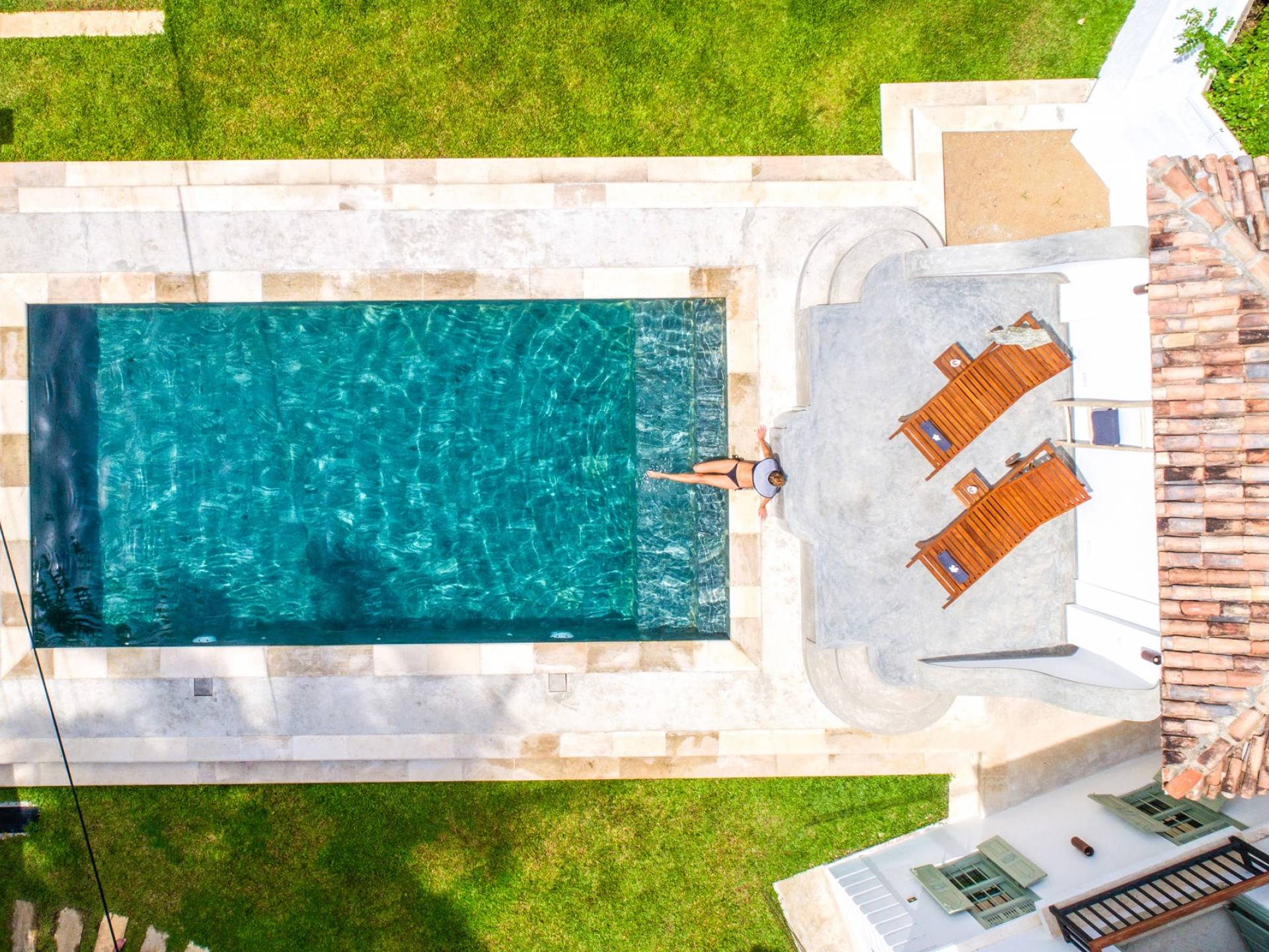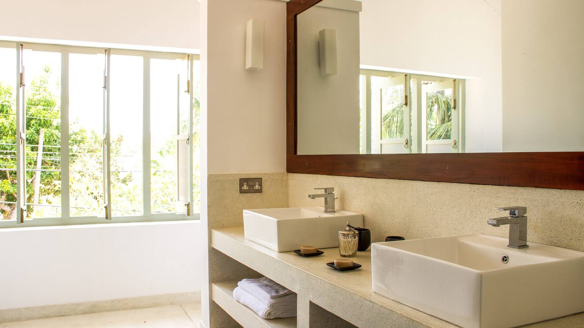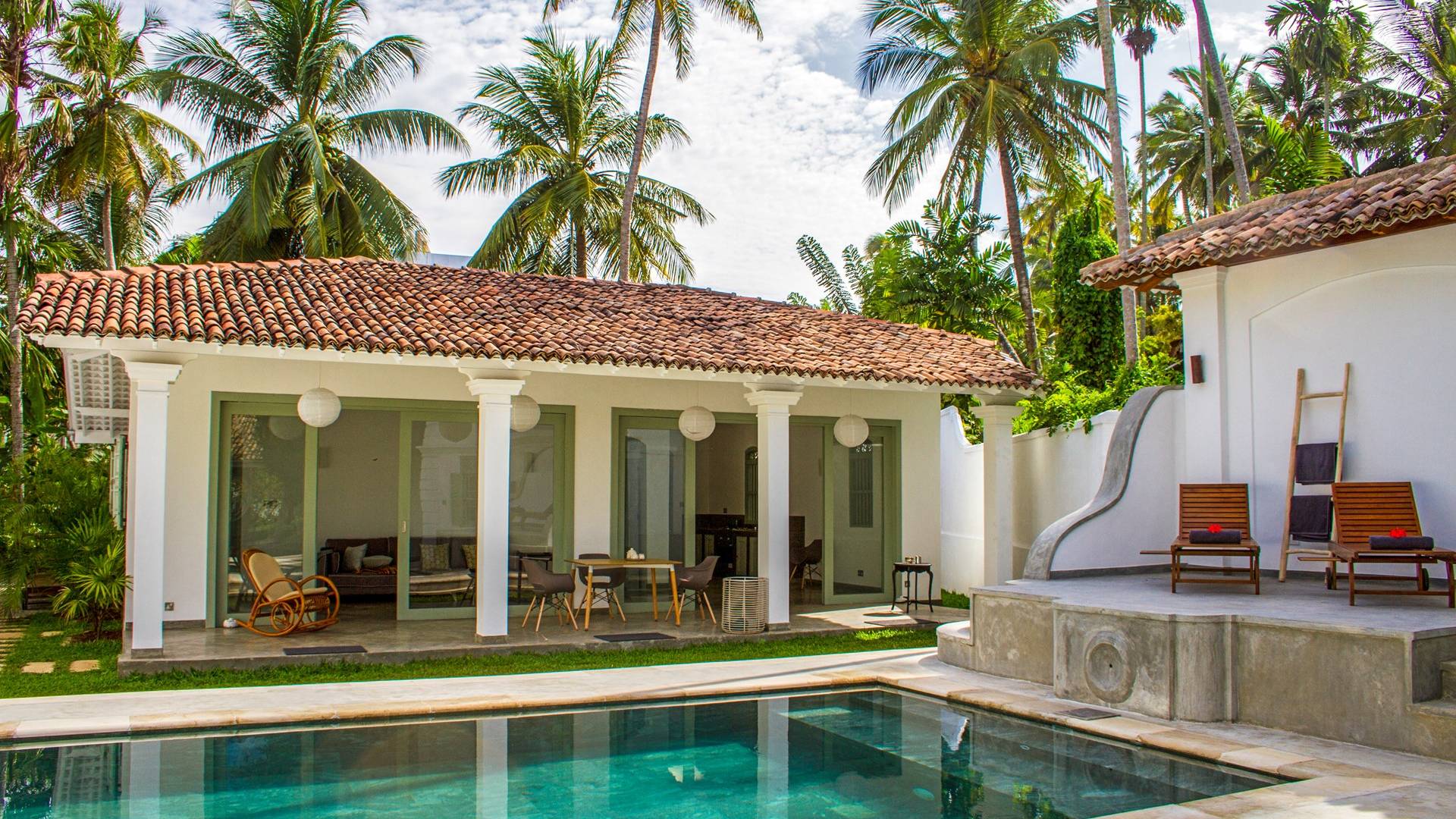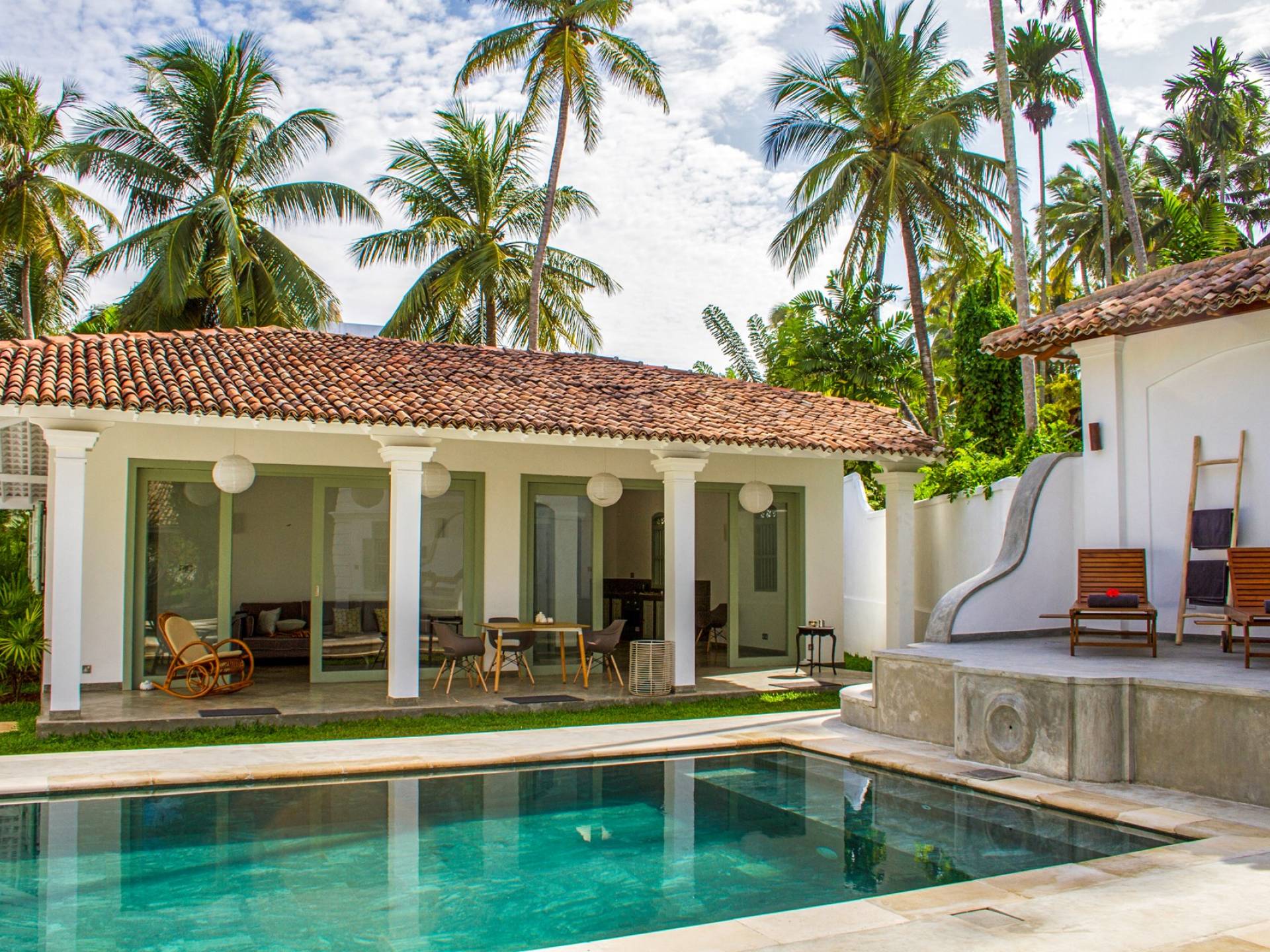 По прибытии в Wijaya Giri вы сначала попадаете в дом у бассейна, который включает в себя две спальни с двуспальными кроватями, гостиную открытой планировки и кухню-камбуз. В спальнях есть собственные крытые/открытые ванные комнаты с душевыми кабинами. Интерьер везде одинаковый, с чистыми свежими белыми стенами и прекрасным пастельно-зеленым цветом дверных и оконных рам. Большой L-образный диван в общей гостиной смотрит через высокие французские окна на бассейн, который расположен между этим домом и главной виллой, и имеет платформу для загара или экран проектора, чтобы скоротать день. смотрю крикет!