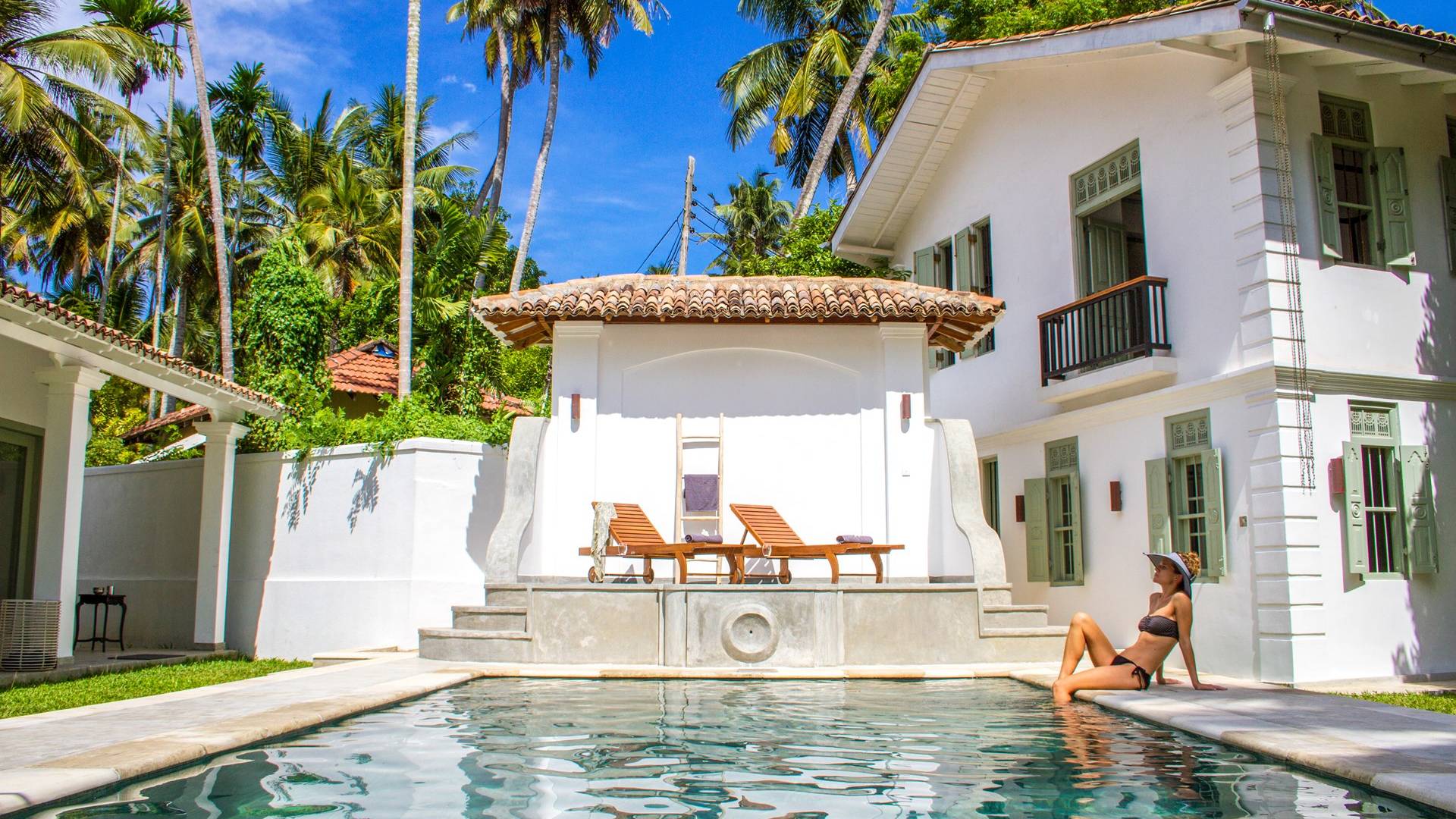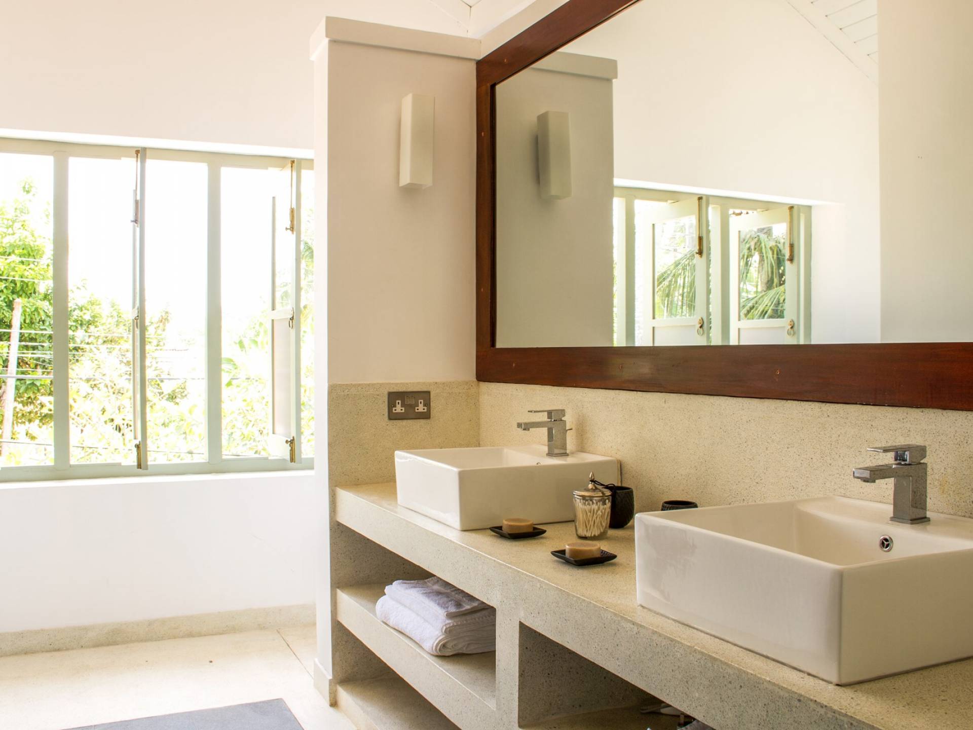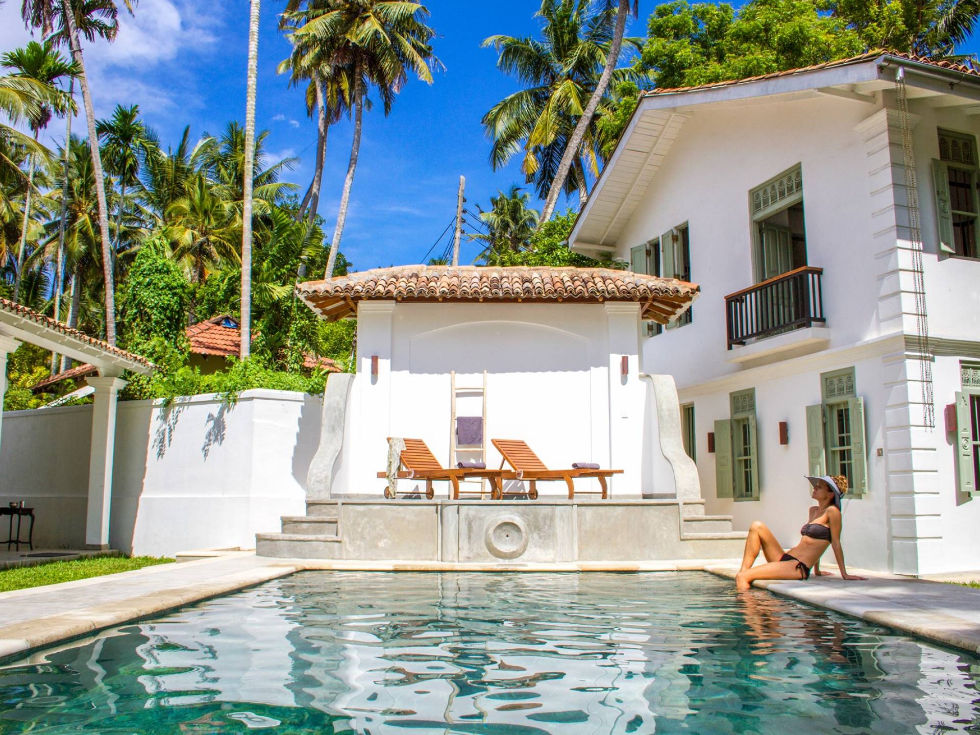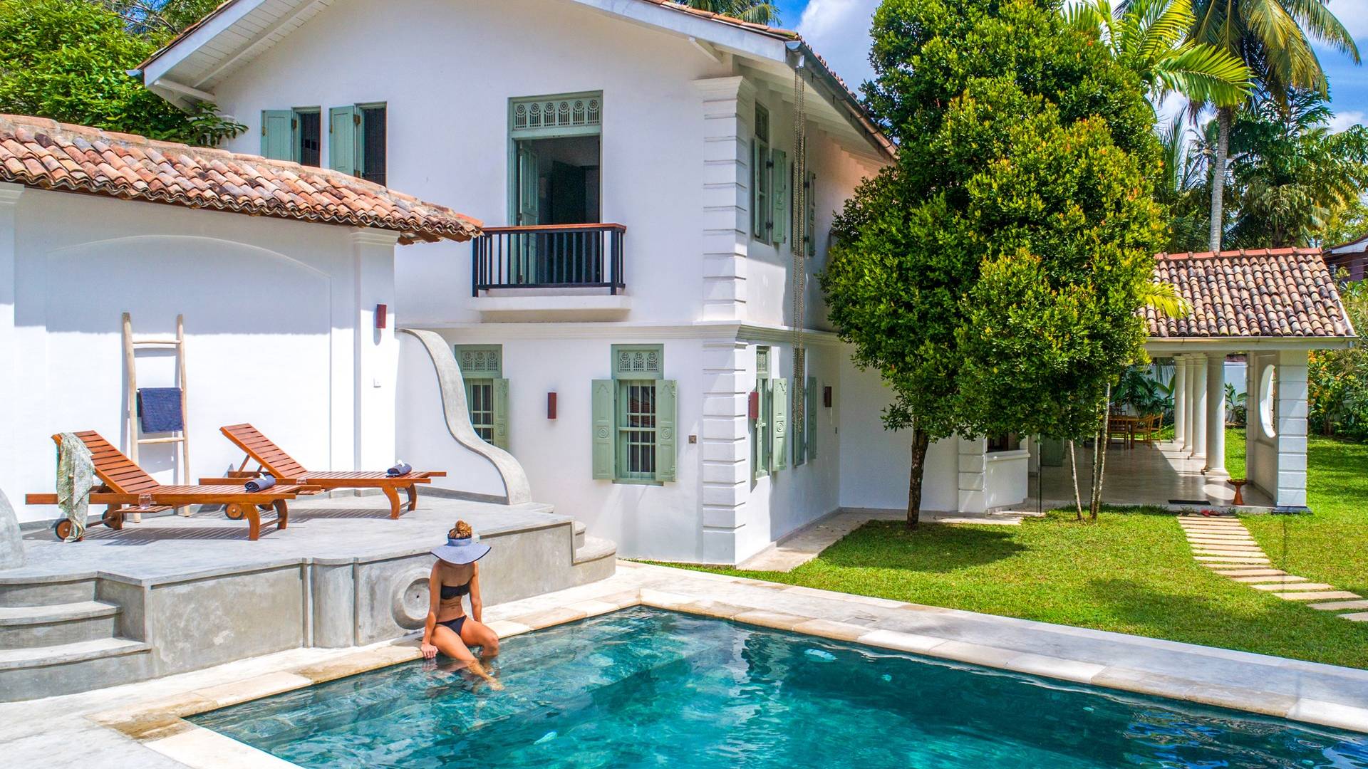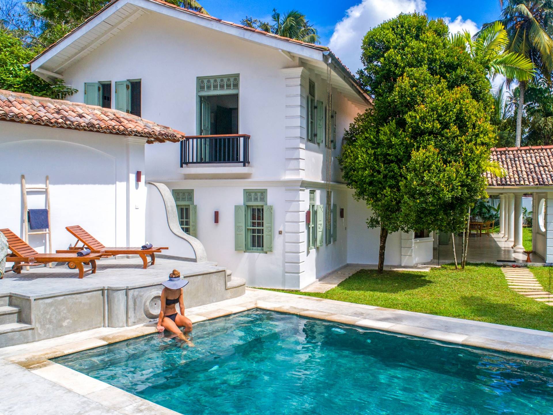 По прибытии в Wijaya Giri вы сначала попадаете в дом у бассейна, который включает в себя две спальни с двуспальными кроватями, гостиную открытой планировки и кухню-камбуз. В спальнях есть собственные крытые/открытые ванные комнаты с душевыми кабинами. Интерьер везде одинаковый, с чистыми свежими белыми стенами и прекрасным пастельно-зеленым цветом дверных и оконных рам. Большой L-образный диван в общей гостиной смотрит через высокие французские окна на бассейн, который расположен между этим домом и главной виллой, и имеет платформу для загара или экран проектора, чтобы скоротать день. смотрю крикет!