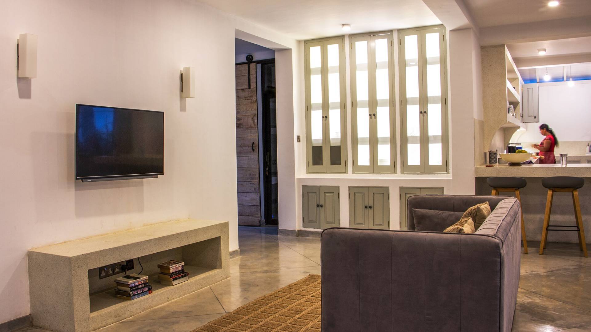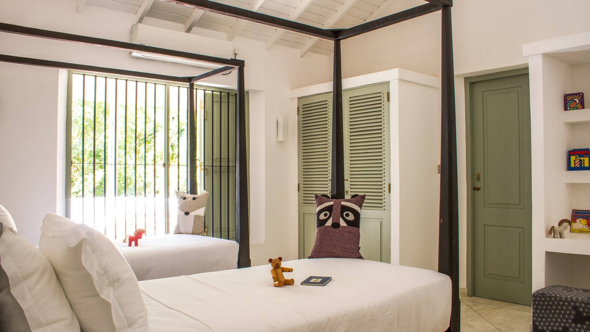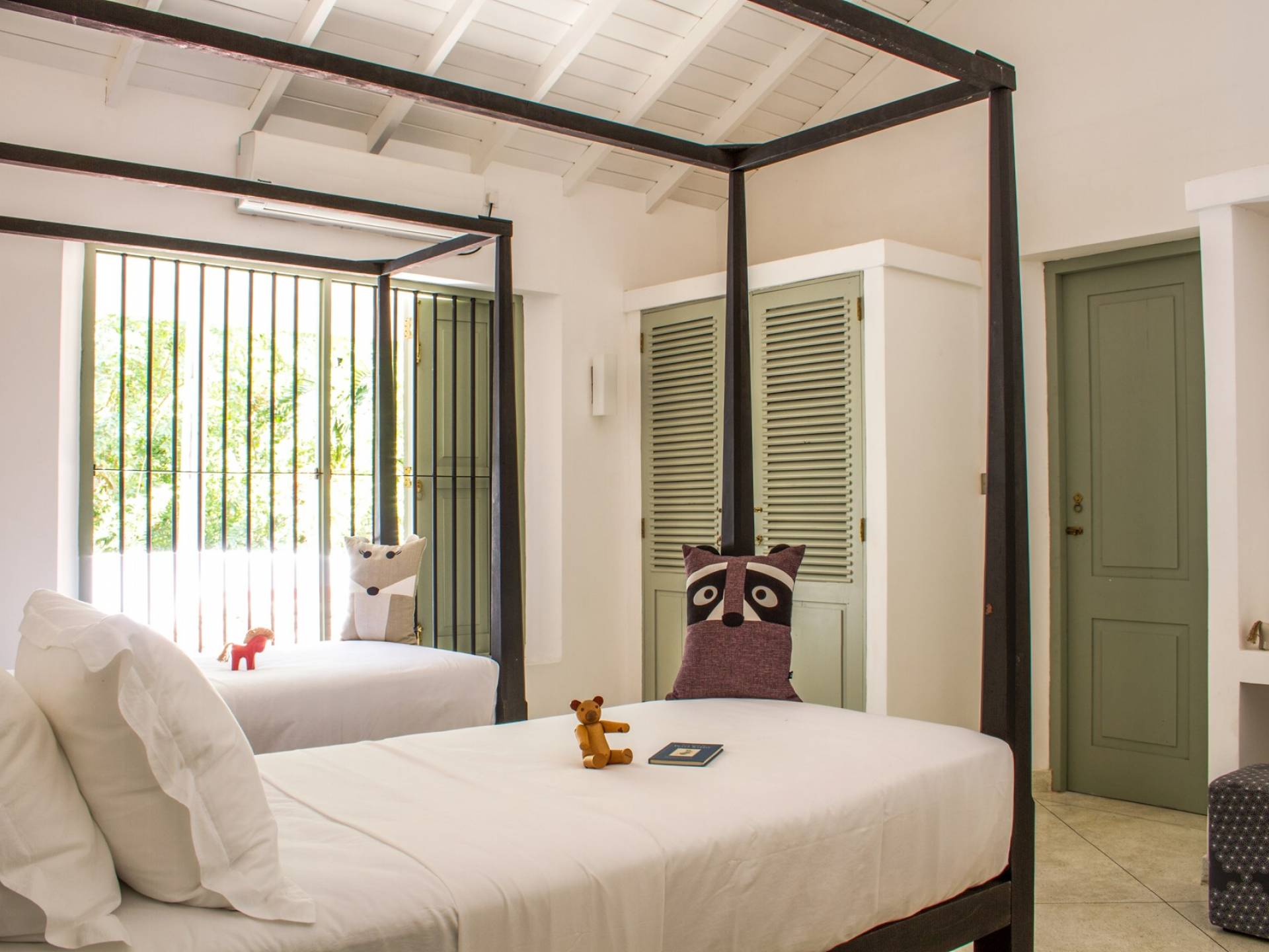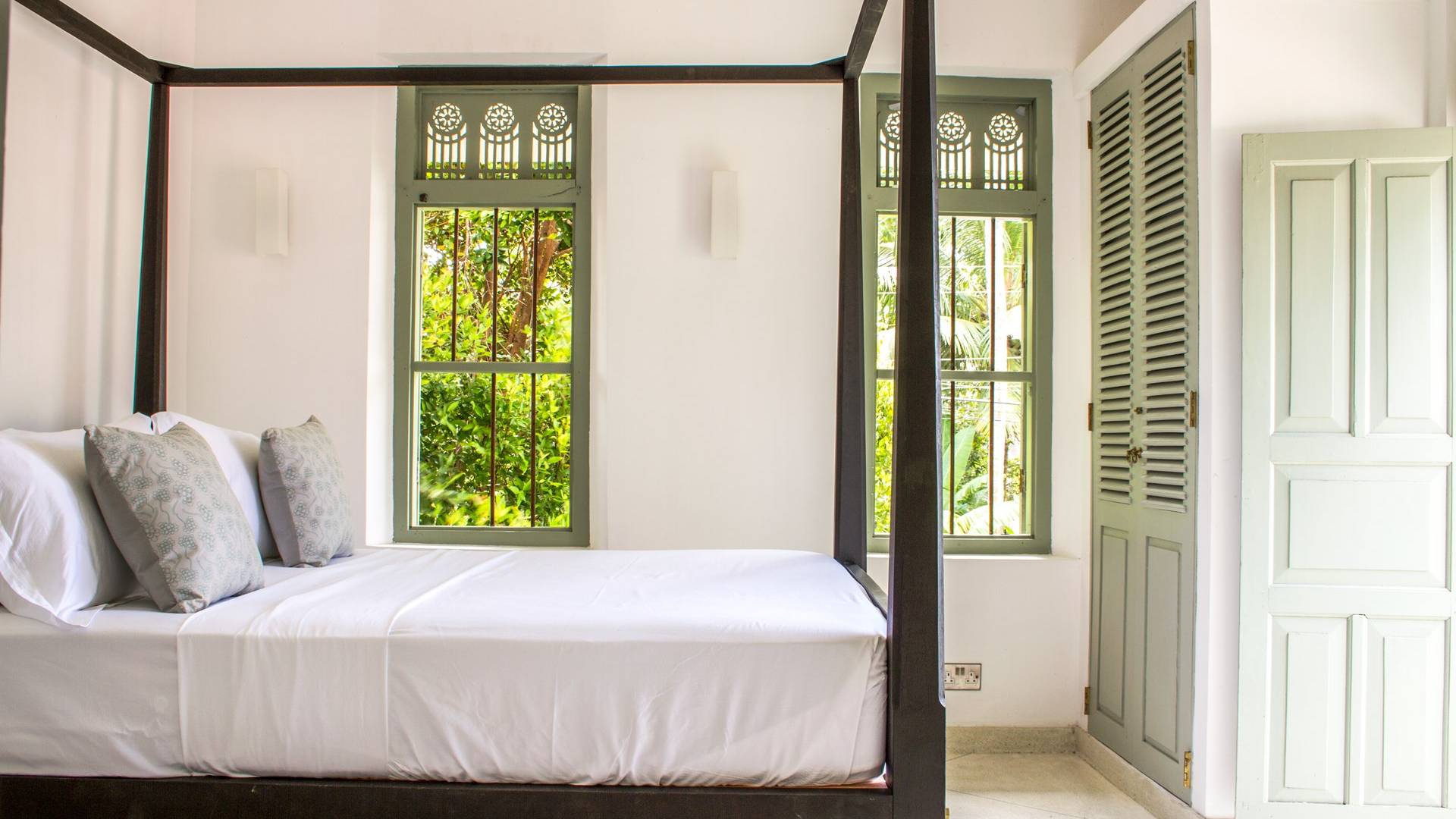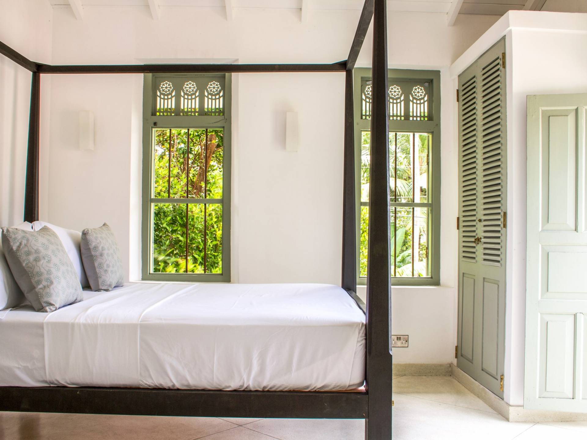 По прибытии в Wijaya Giri вы сначала попадаете в дом у бассейна, который включает в себя две спальни с двуспальными кроватями, гостиную открытой планировки и кухню-камбуз. В спальнях есть собственные крытые/открытые ванные комнаты с душевыми кабинами. Интерьер везде одинаковый, с чистыми свежими белыми стенами и прекрасным пастельно-зеленым цветом дверных и оконных рам. Большой L-образный диван в общей гостиной смотрит через высокие французские окна на бассейн, который расположен между этим домом и главной виллой, и имеет платформу для загара или экран проектора, чтобы скоротать день. смотрю крикет!