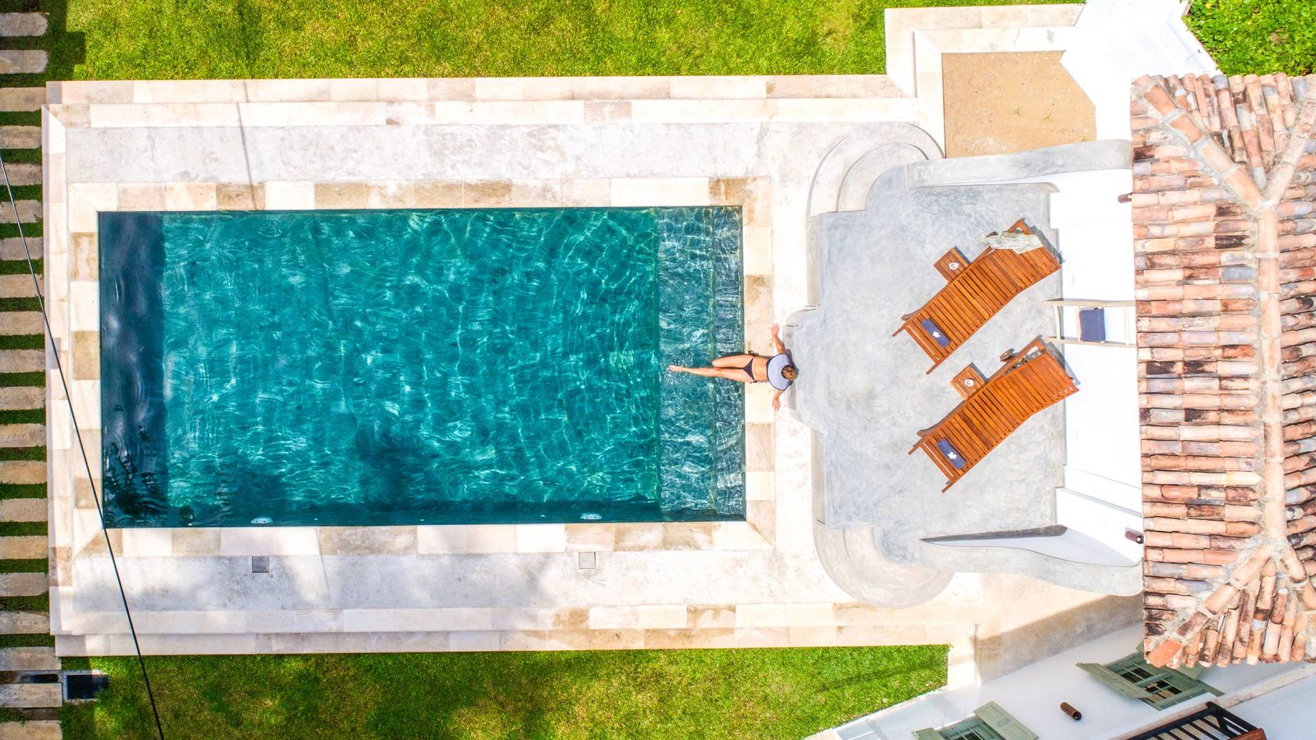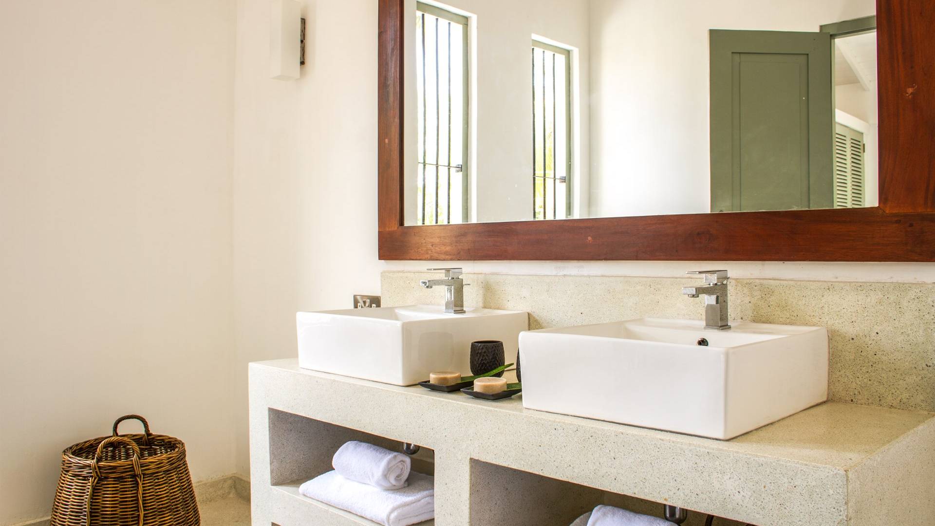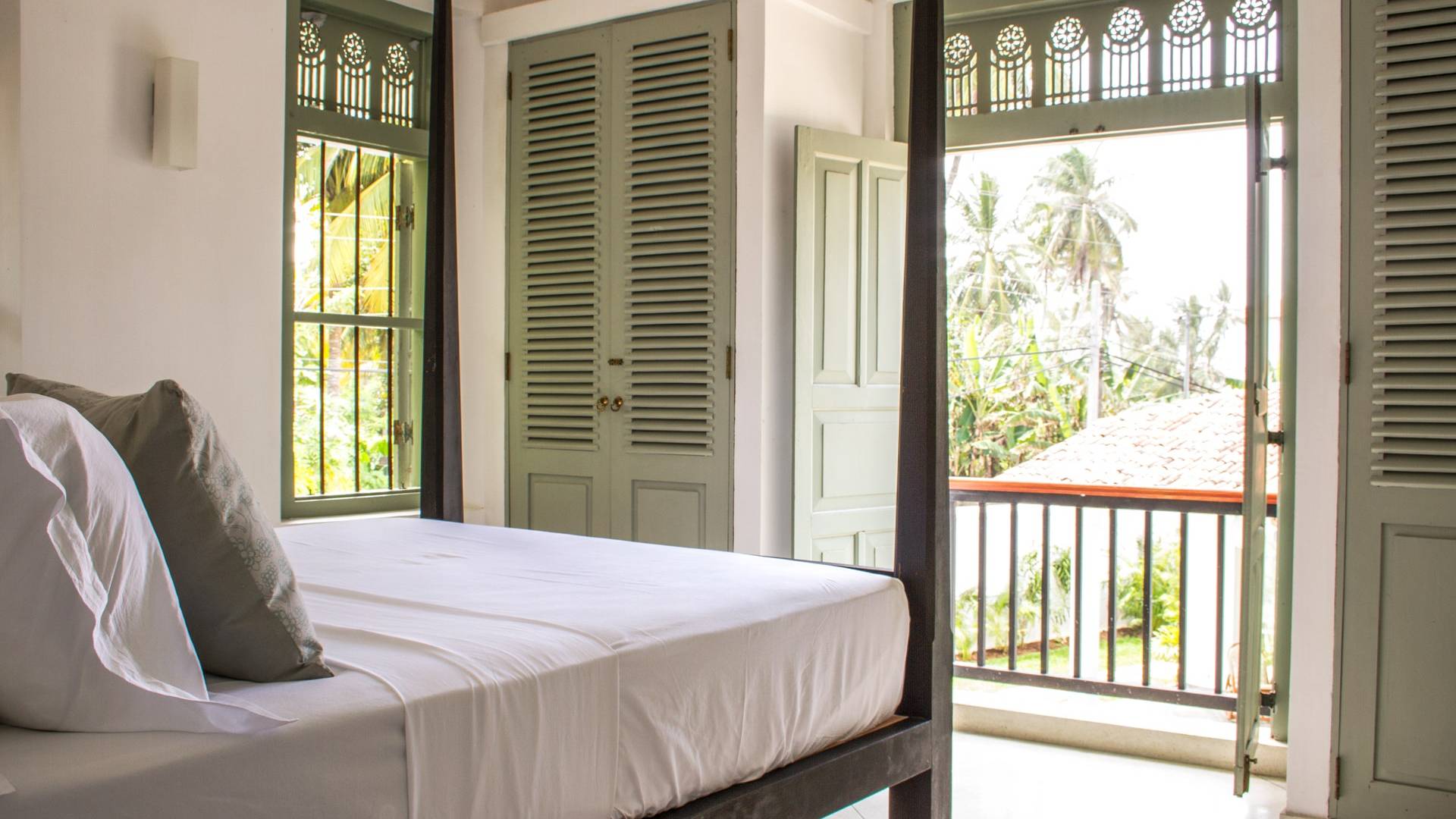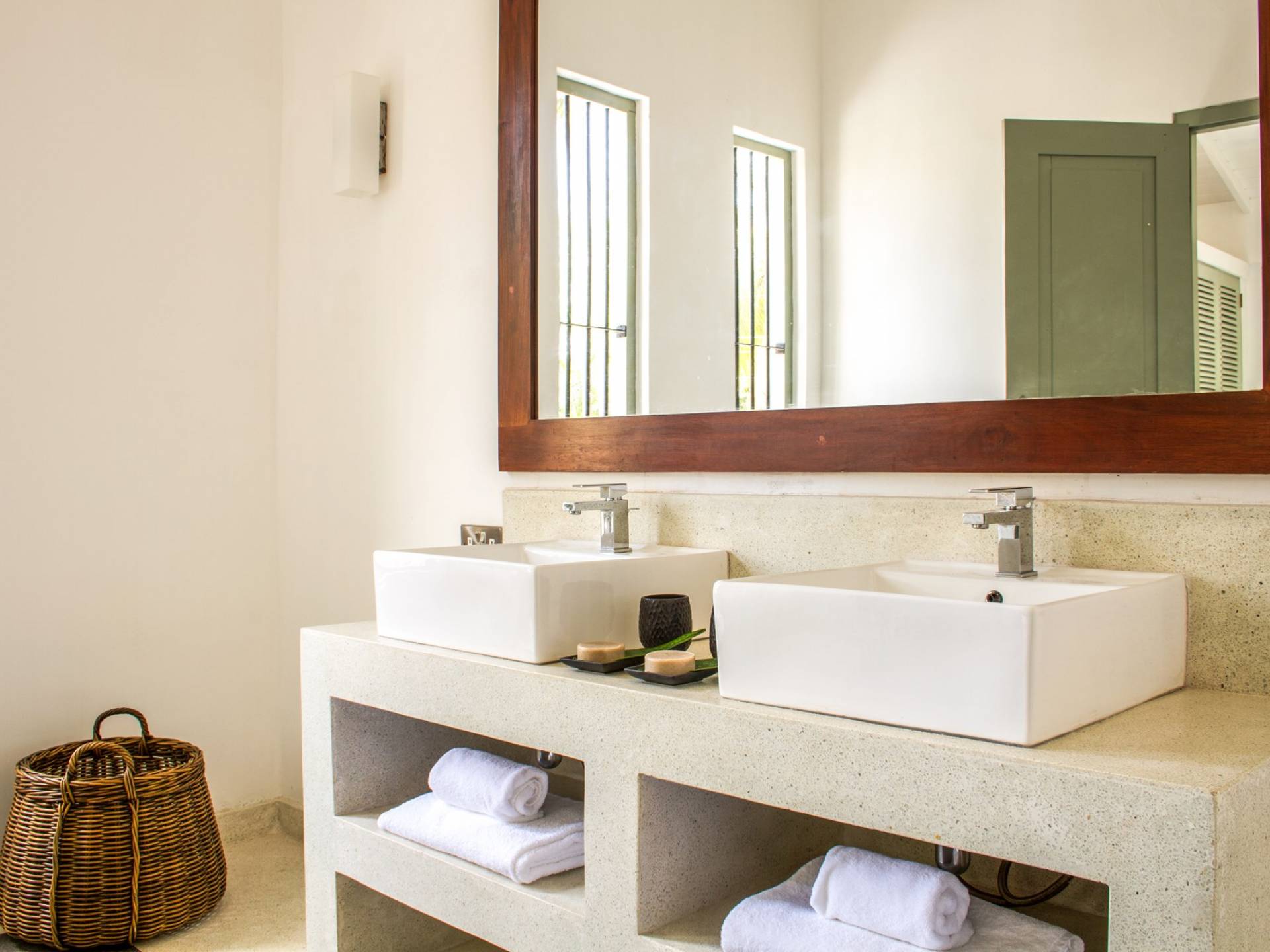 По прибытии в Wijaya Giri вы сначала попадаете в дом у бассейна, который включает в себя две спальни с двуспальными кроватями, гостиную открытой планировки и кухню-камбуз. В спальнях есть собственные крытые/открытые ванные комнаты с душевыми кабинами. Интерьер везде одинаковый, с чистыми свежими белыми стенами и прекрасным пастельно-зеленым цветом дверных и оконных рам. Большой L-образный диван в общей гостиной смотрит через высокие французские окна на бассейн, который расположен между этим домом и главной виллой, и имеет платформу для загара или экран проектора, чтобы скоротать день. смотрю крикет!