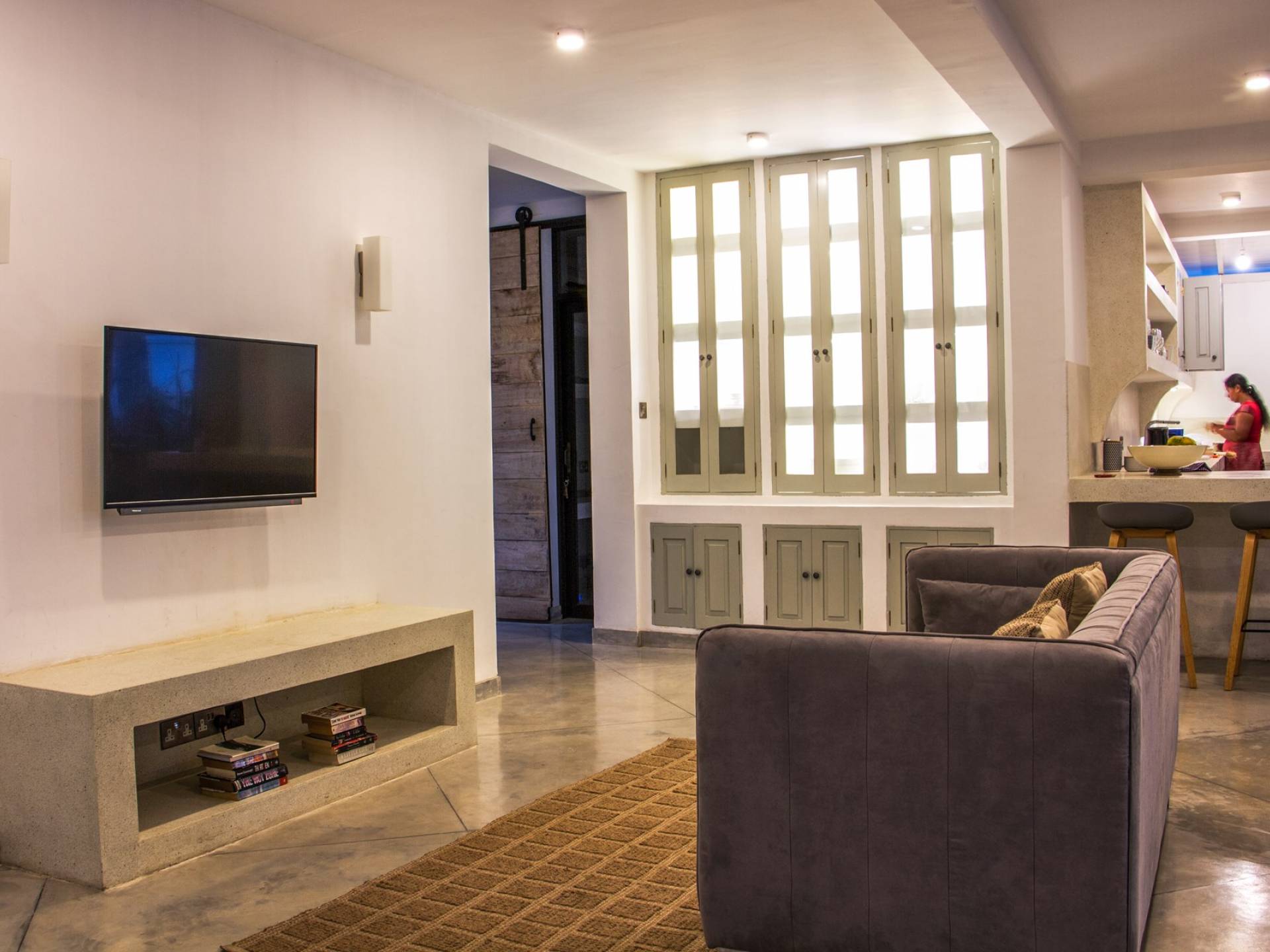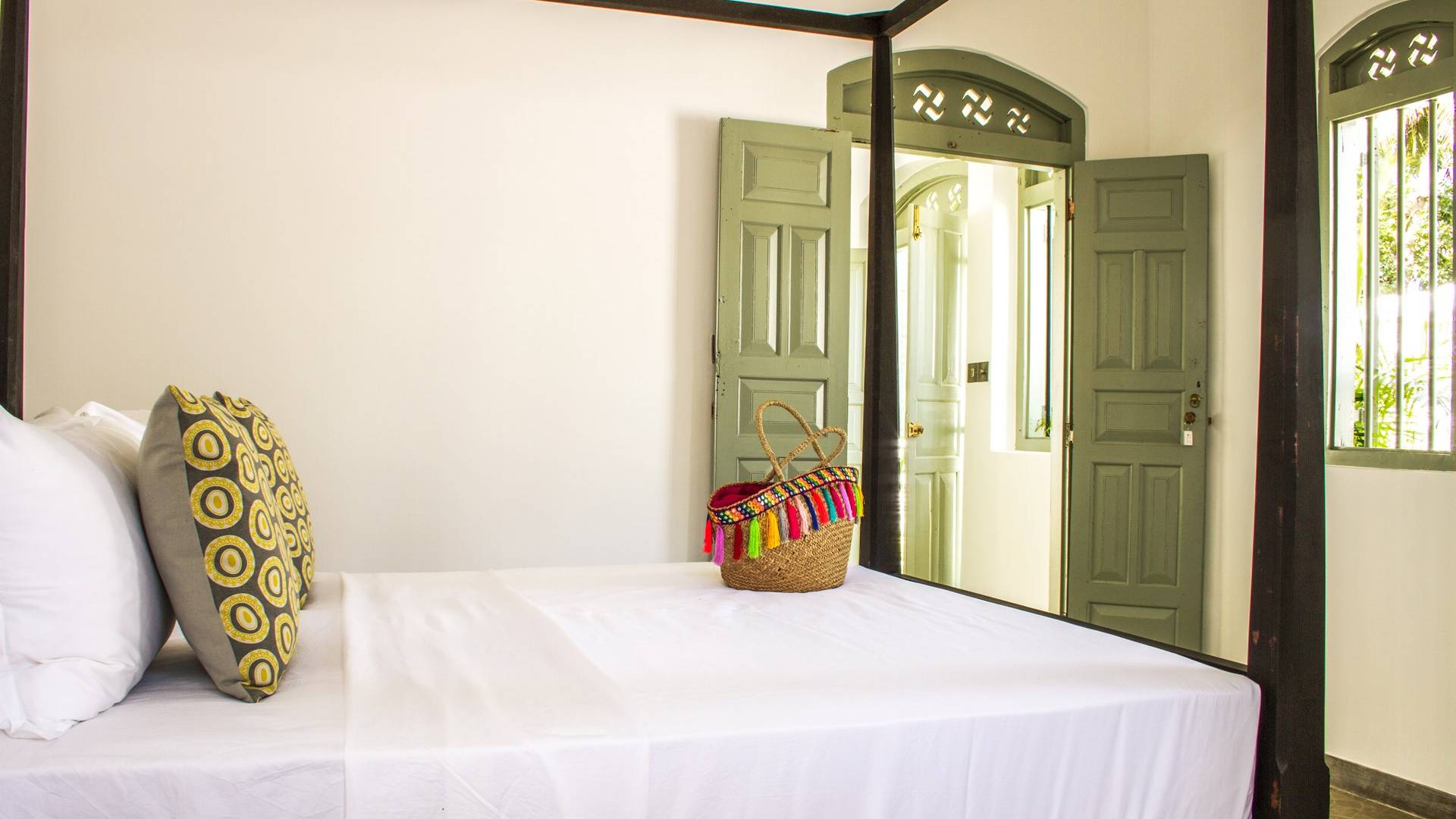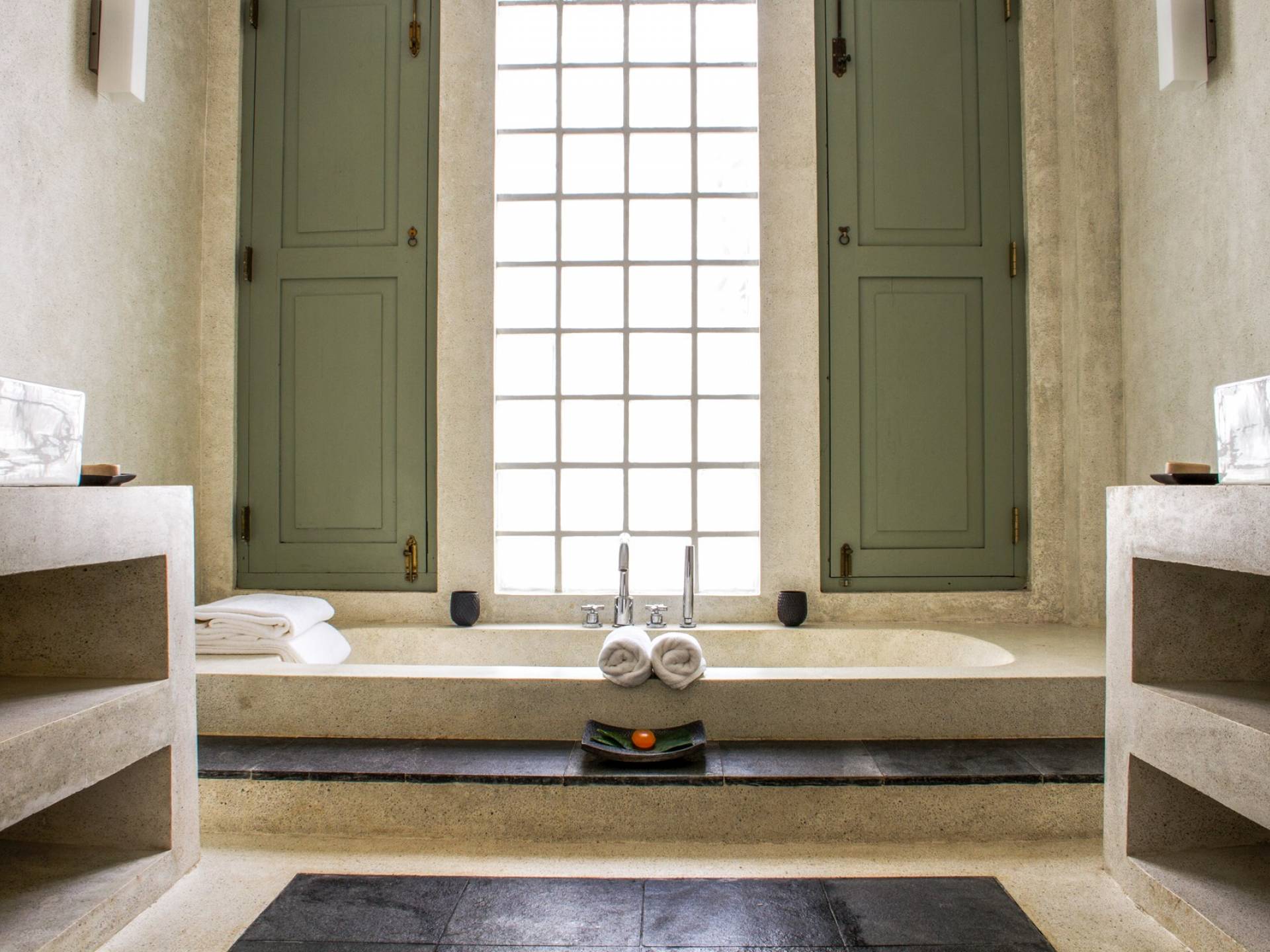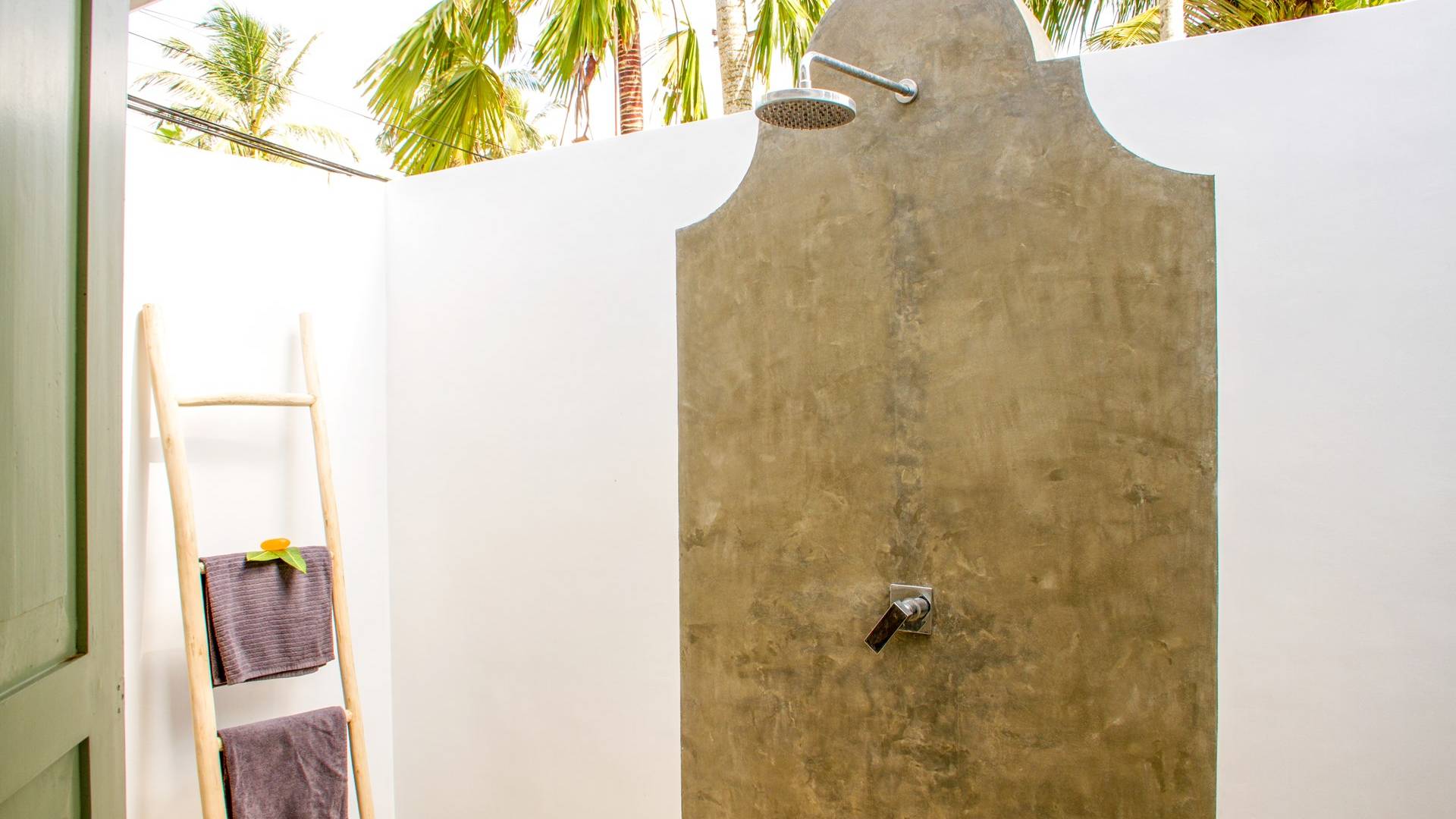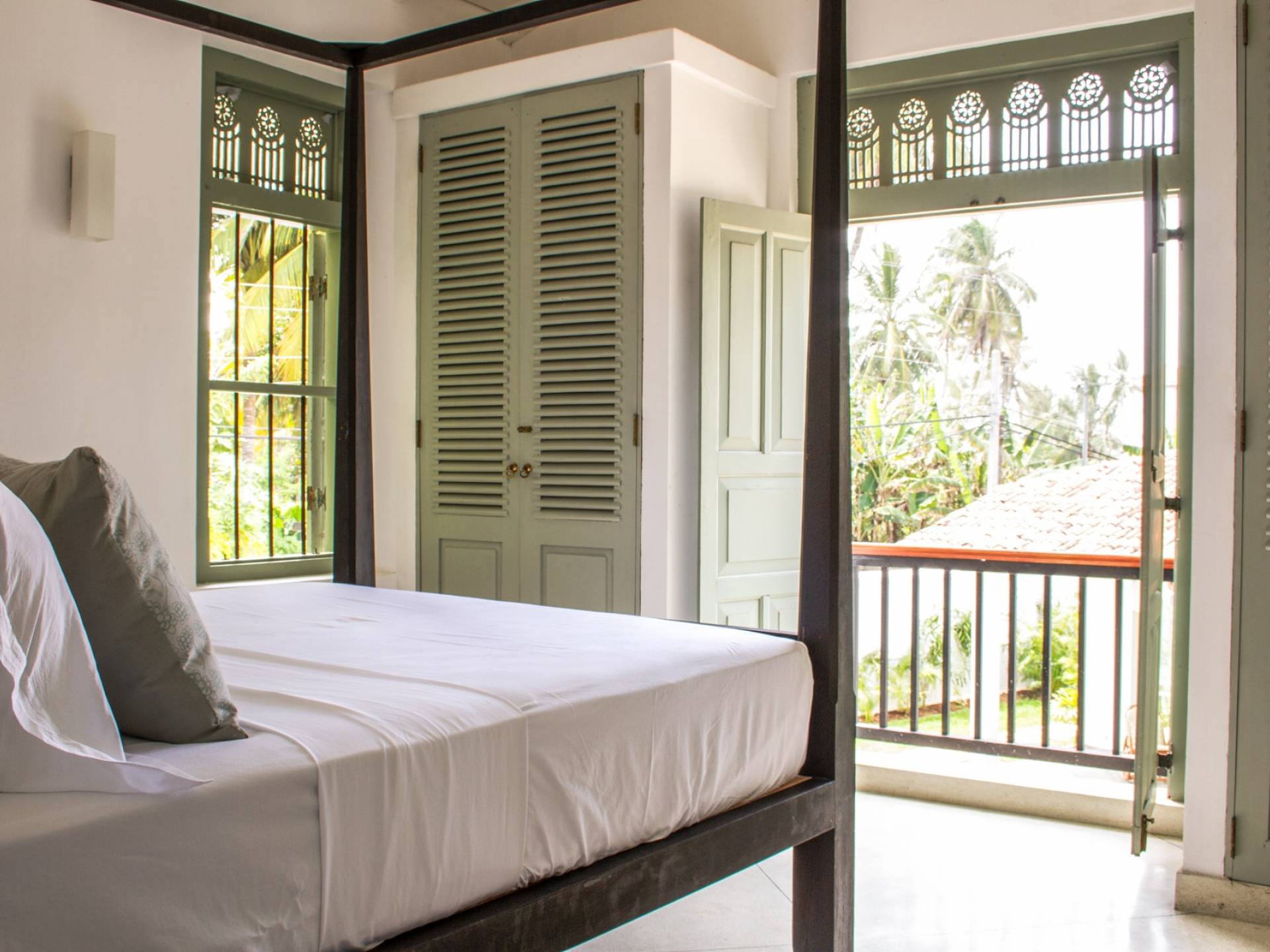 По прибытии в Wijaya Giri вы сначала попадаете в дом у бассейна, который включает в себя две спальни с двуспальными кроватями, гостиную открытой планировки и кухню-камбуз. В спальнях есть собственные крытые/открытые ванные комнаты с душевыми кабинами. Интерьер везде одинаковый, с чистыми свежими белыми стенами и прекрасным пастельно-зеленым цветом дверных и оконных рам. Большой L-образный диван в общей гостиной смотрит через высокие французские окна на бассейн, который расположен между этим домом и главной виллой, и имеет платформу для загара или экран проектора, чтобы скоротать день. смотрю крикет!