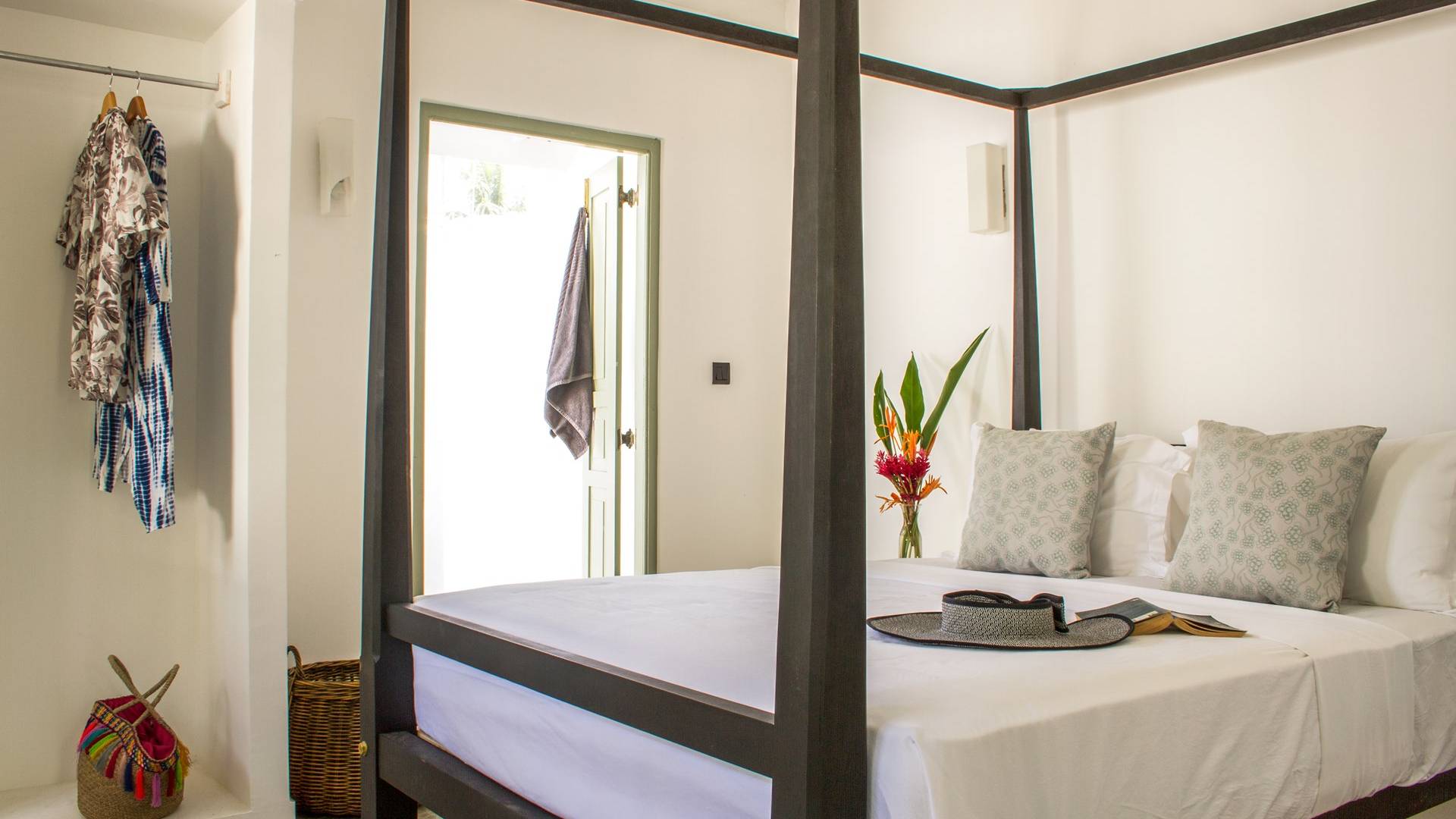 Первая спальня, двуспальная кровать с балдахином, находится на первом этаже, слева от прихожей/гостиной, с видом на сад и бассейн. Он имеет впечатляющую ванную комнату с утопленной ванной из полированного цемента, душевой кабиной, ванной и двумя раковинами. Вторая спальня с двуспальной кроватью находится наверху лестницы, которая, по сути, такая же, как и комната внизу, хотя и немного больше и без ванны. Через коридор находится фантастическая спальня с двумя односпальными кроватями с балдахином, большой детской кроваткой и большим пространством, где можно переодеть ребенка или разложить все его комплекты. Примыкает небольшая ванная комната с душевой кабиной. Последняя спальня представляет собой просторную главную спальню с кроватью размера «king-size» с балдахином, большим L-образным диваном, гардеробной и отгороженной ванной комнатой с двойной душевой кабиной, двумя туалетными столиками и отдельной туалет