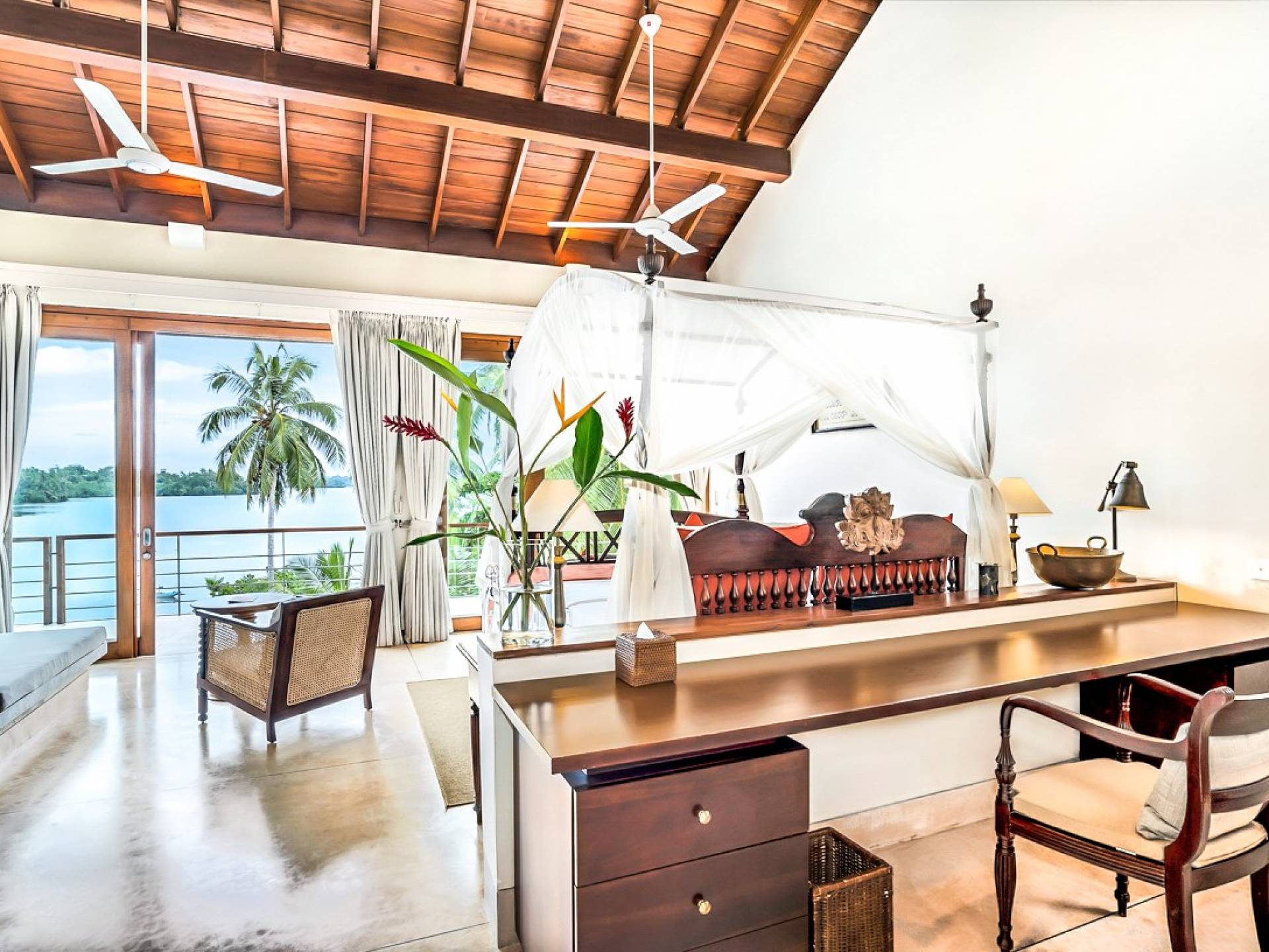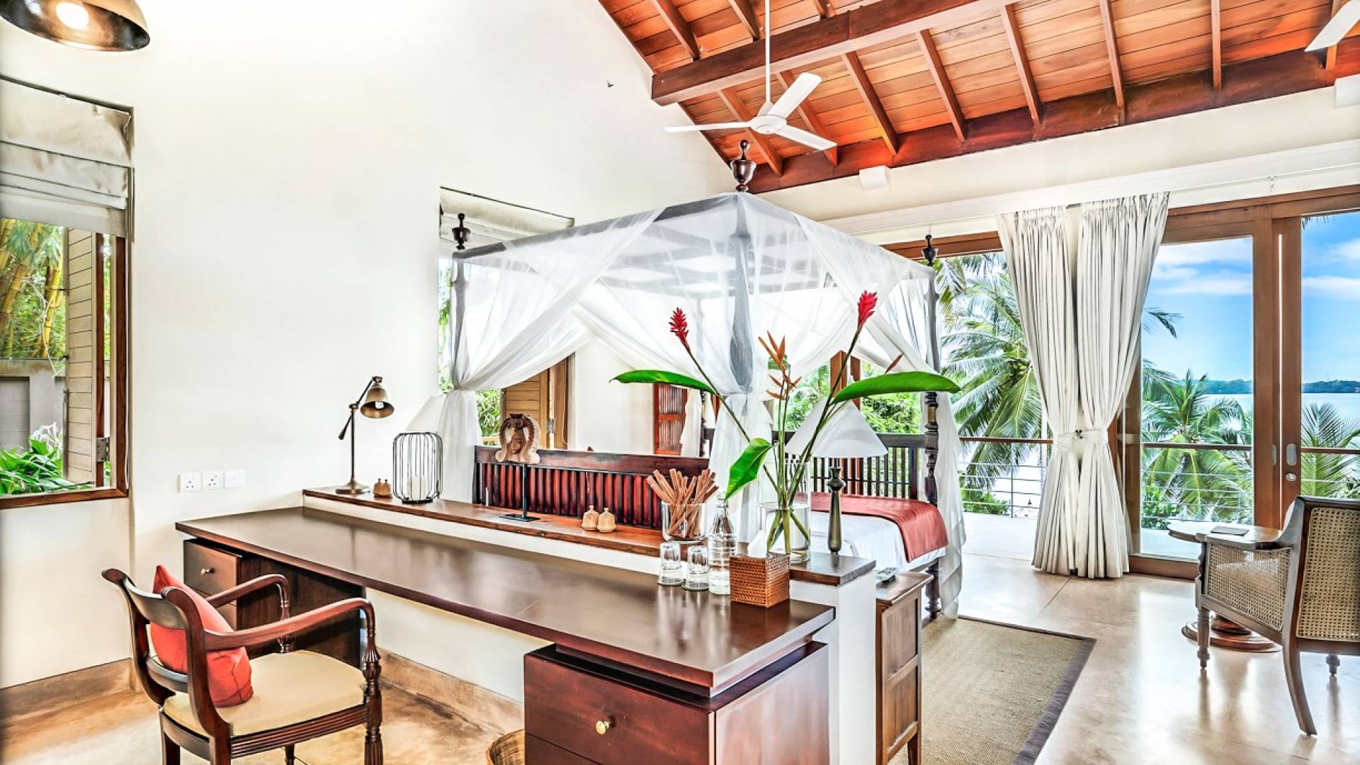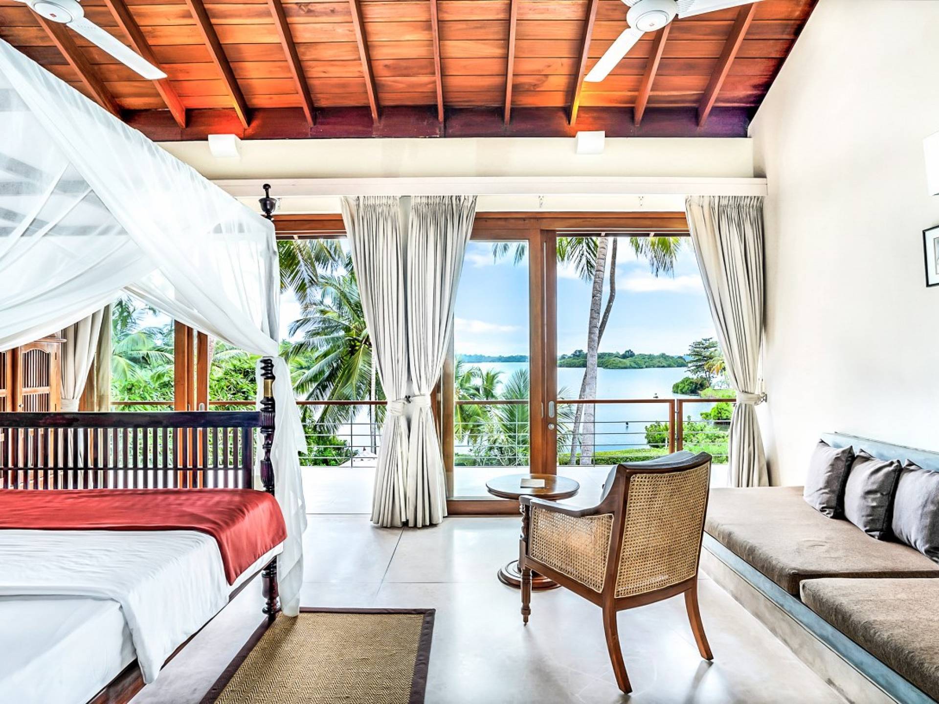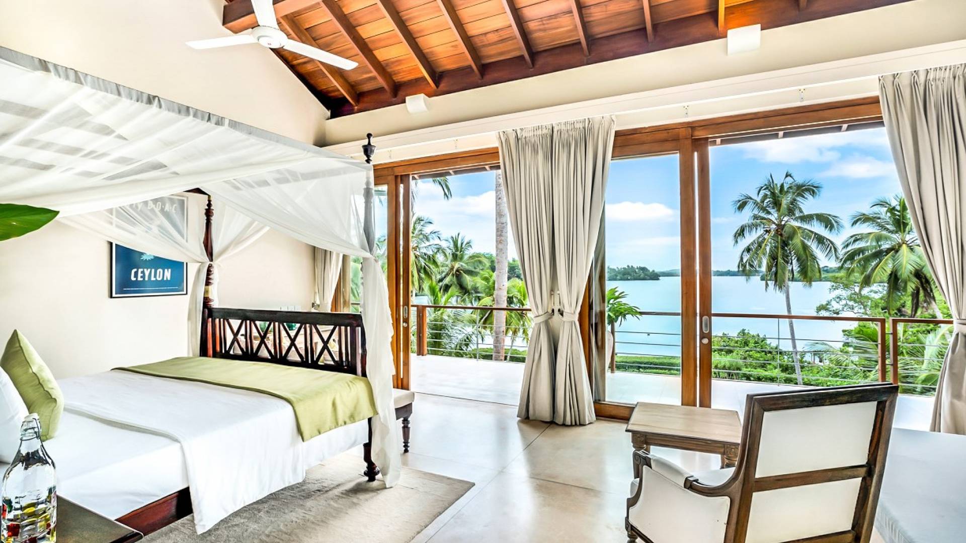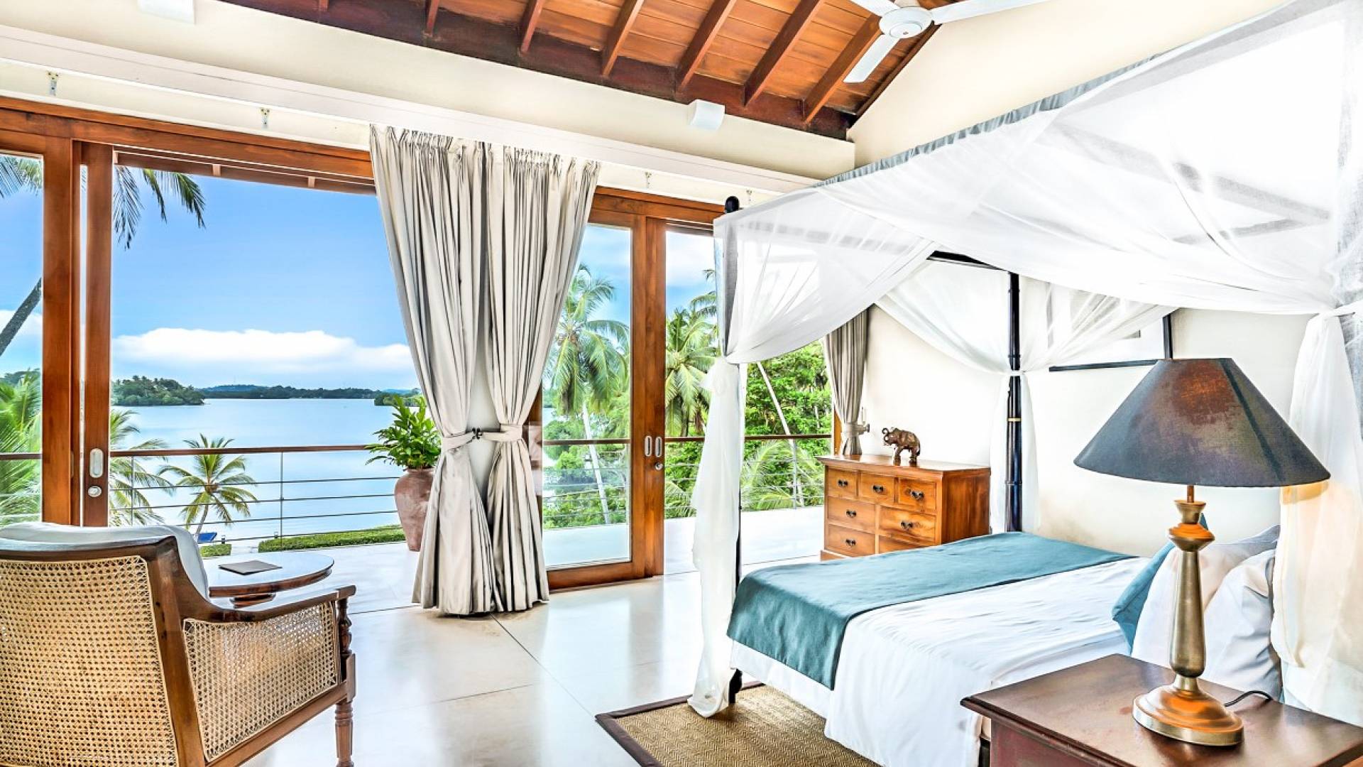 Главная вилла состоит из четырех красивых, просторных и, казалось бы, идентичных спален с отдельными ванными комнатами, оформленных в тематике храма, чая, слона и корицы, и все с видом на очаровательное озеро. В каждом номере есть кондиционер с потолочным вентилятором, кровать размера "king-size" с балдахином, противомоскитная сетка, просторный гардероб, кушетка и письменный стол. Две центральные комнаты соединены между собой, что делает их идеальными для семей с детьми. Все четыре впечатляющие ванные комнаты могут похвастаться крытым душем на открытом воздухе, ванной в помещении и двумя раковинами, а также собственным тропическим садом. Вдоль спален проходит общая открытая смотровая терраса, украшенная плетеными креслами, чтобы вы могли наслаждаться и восхищаться феноменальным озерным мысом с другого уровня.